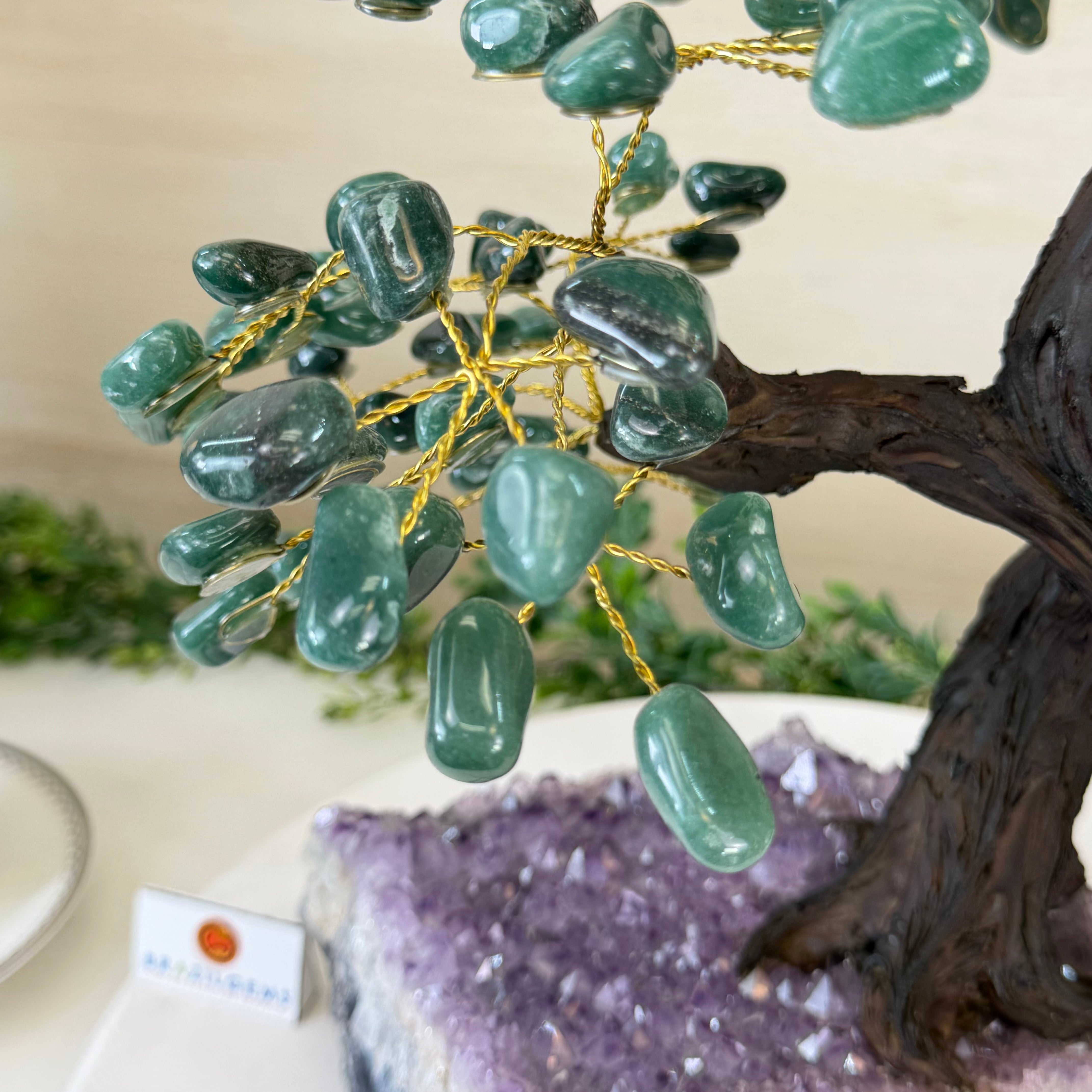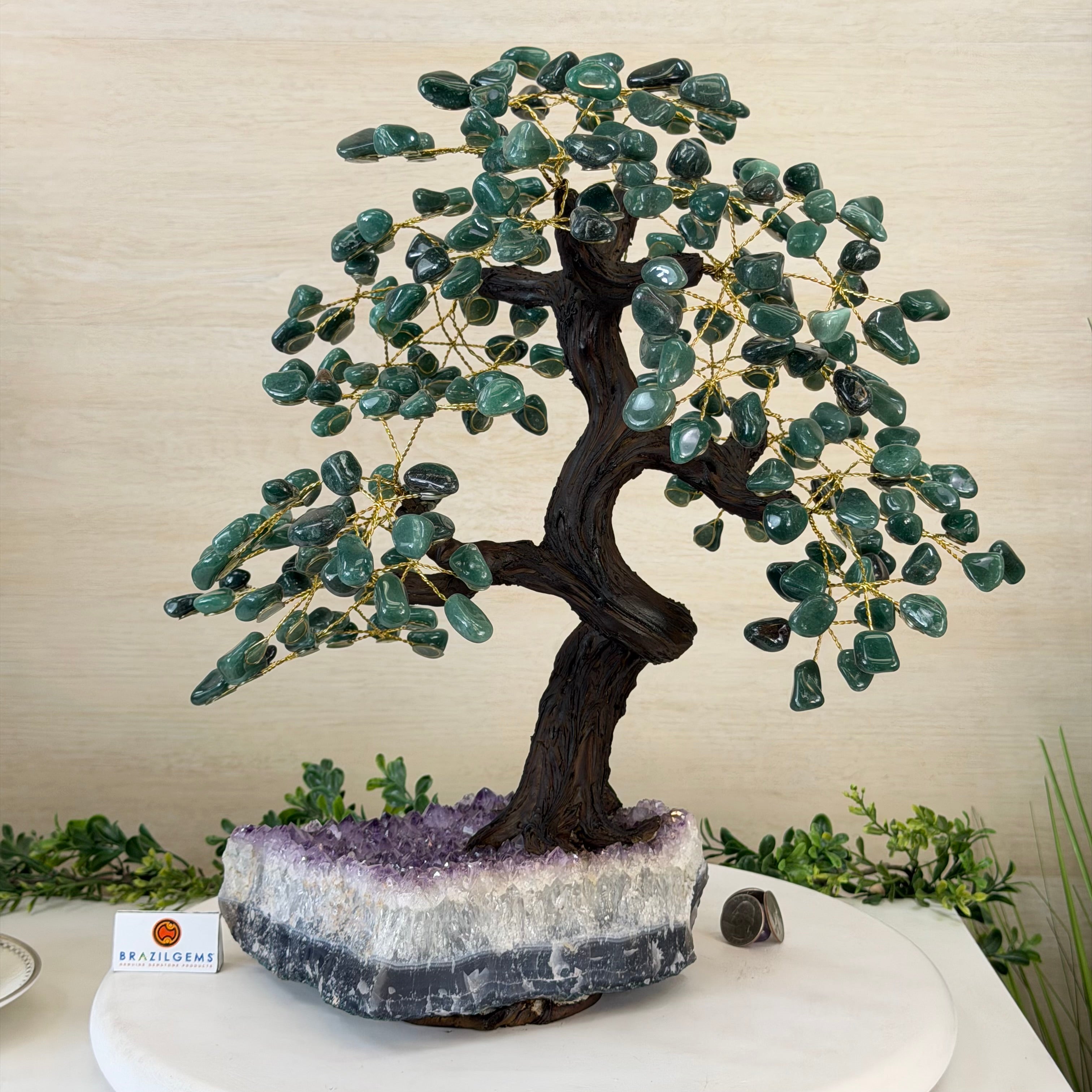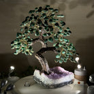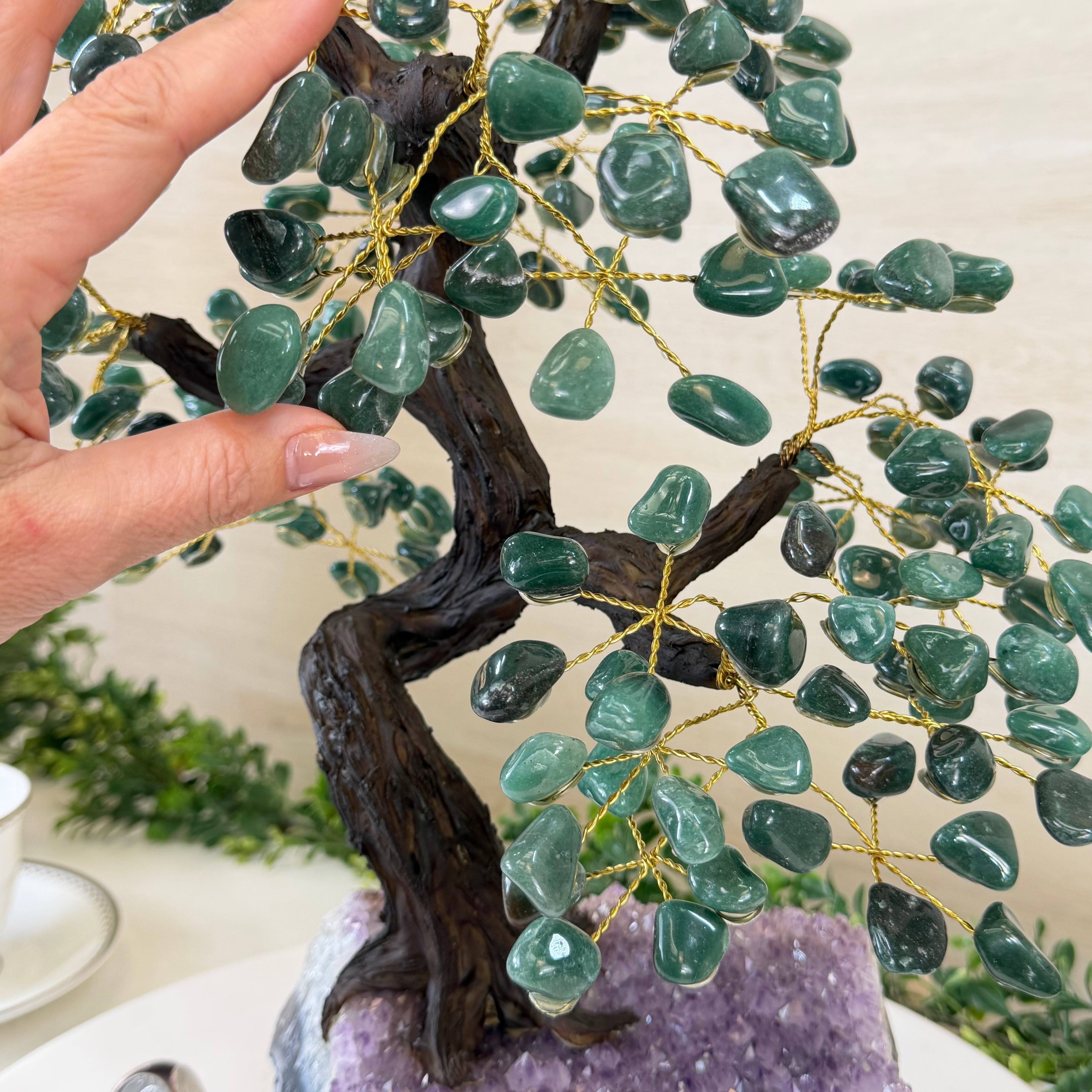 Green Quartz Bonsai Gemstone Tree on an Amethyst Cluster Base Handcrafted in Brazil, this striking gemstone tree stands approximately 17" tall and features a sturdy bonsai-style trunk and branches adorned with 240 tumbled Green Quartz gemstones as its leaves.