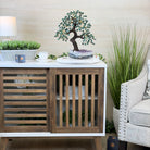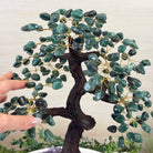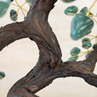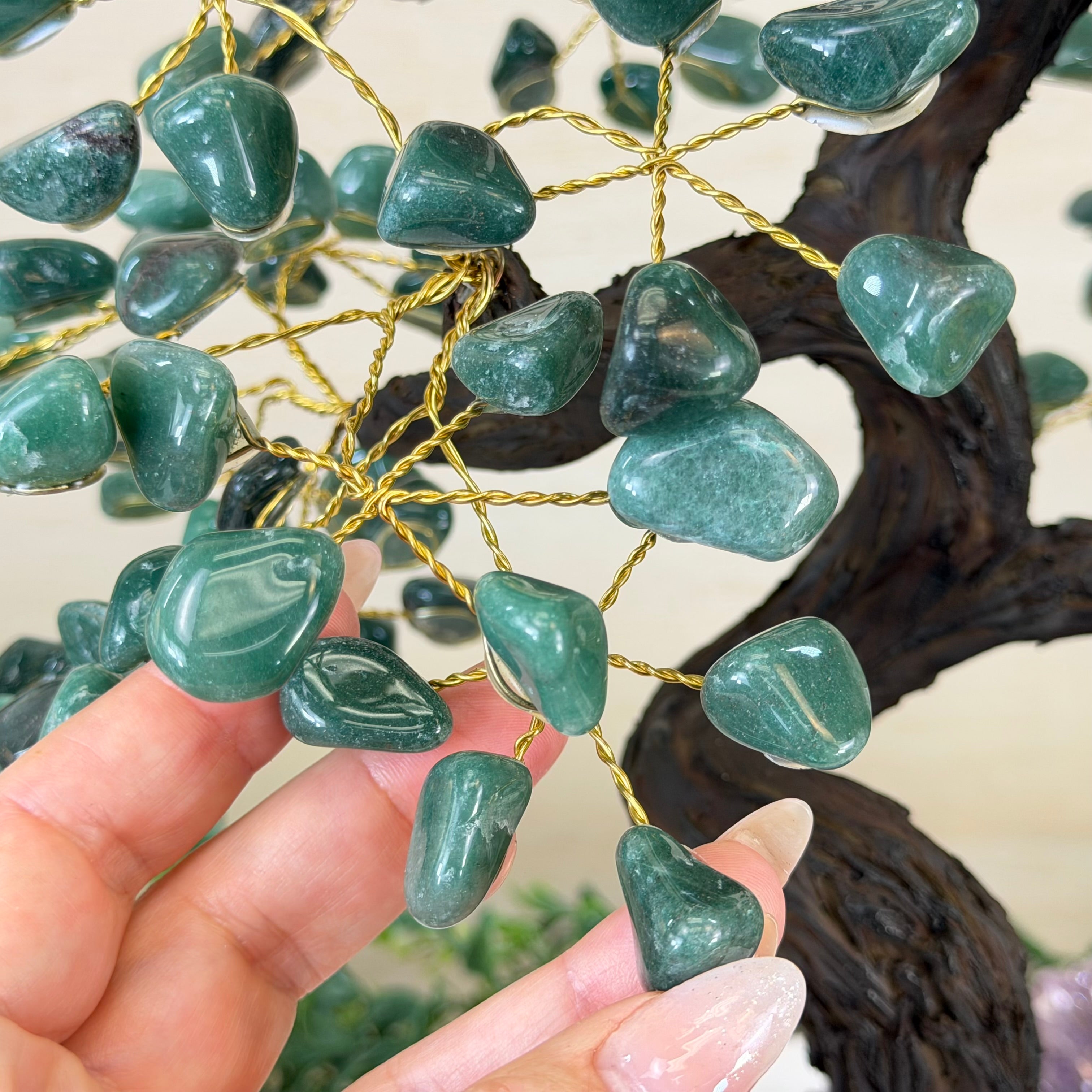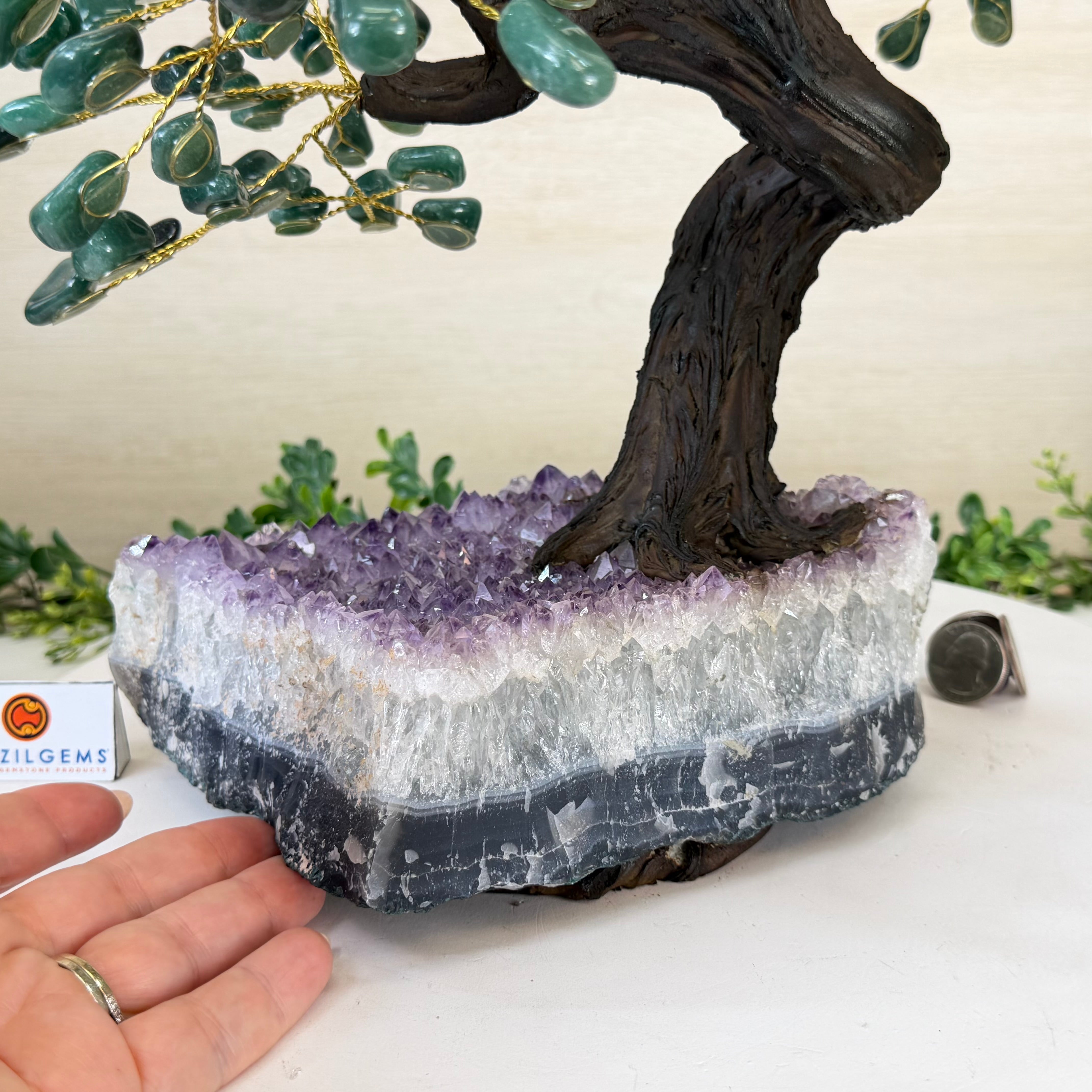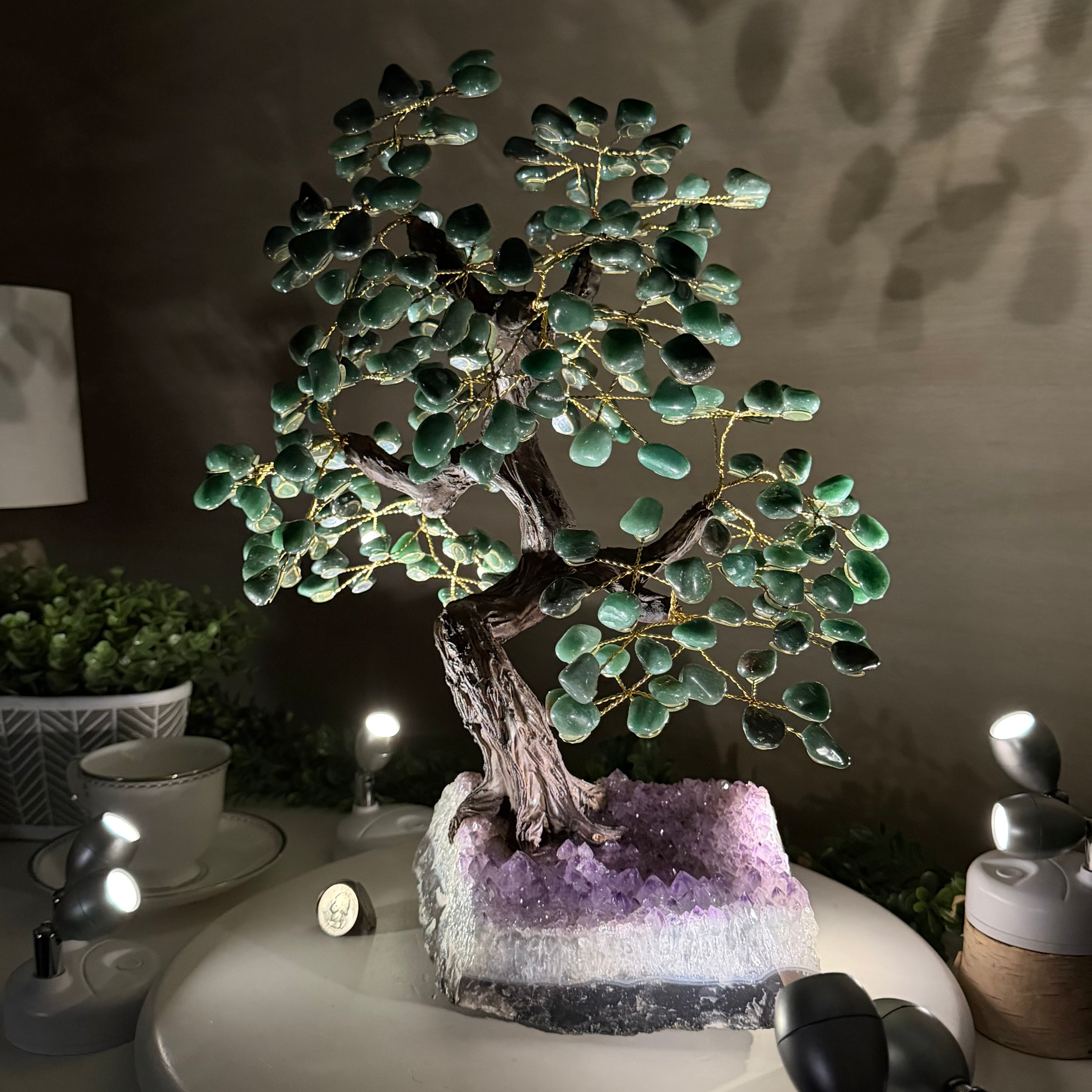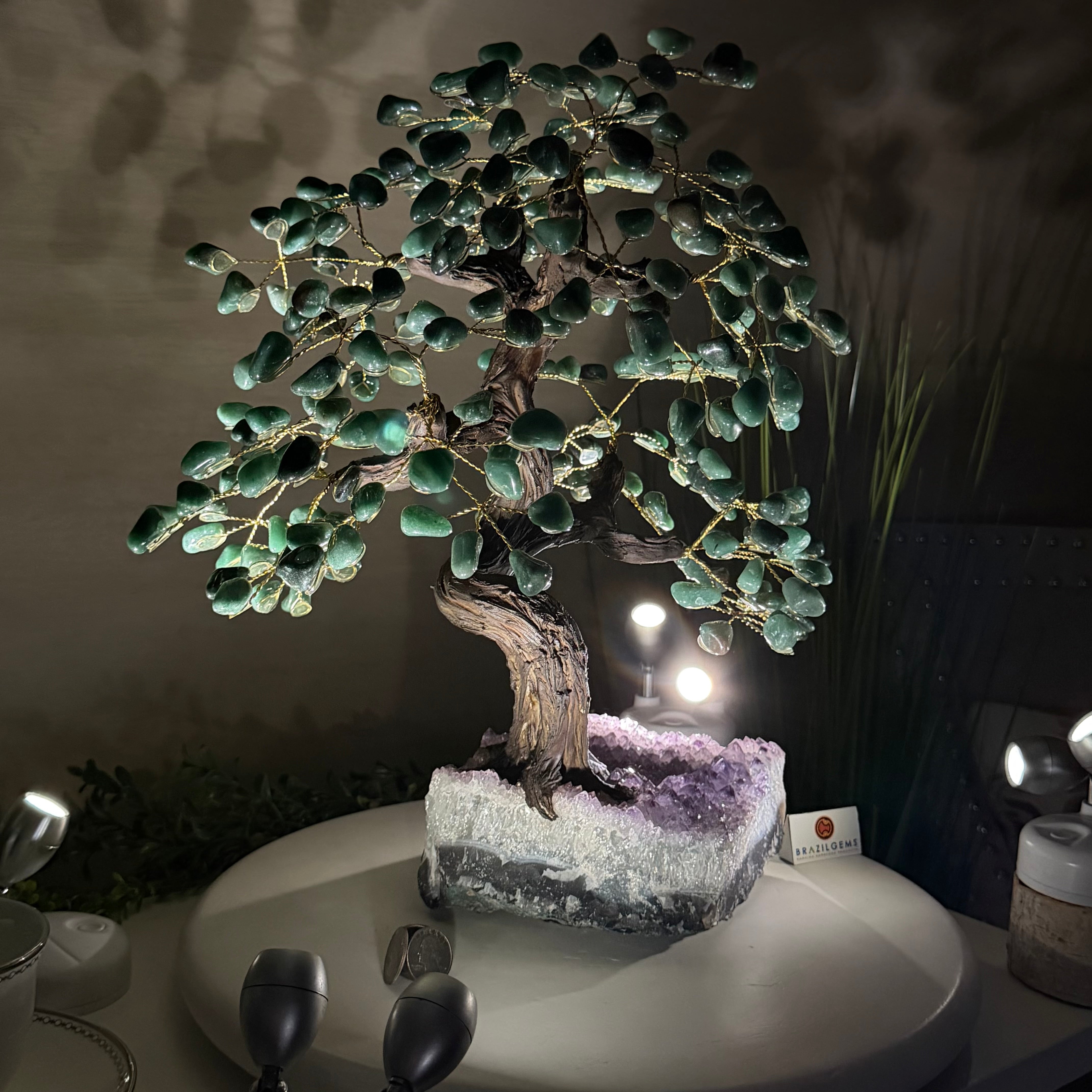 Green Quartz Bonsai Gemstone Tree on an Amethyst Cluster Base Handcrafted in Brazil, this striking gemstone tree stands approximately 17" tall and features a sturdy bonsai-style trunk and branches adorned with 240 tumbled Green Quartz gemstones as its leaves.