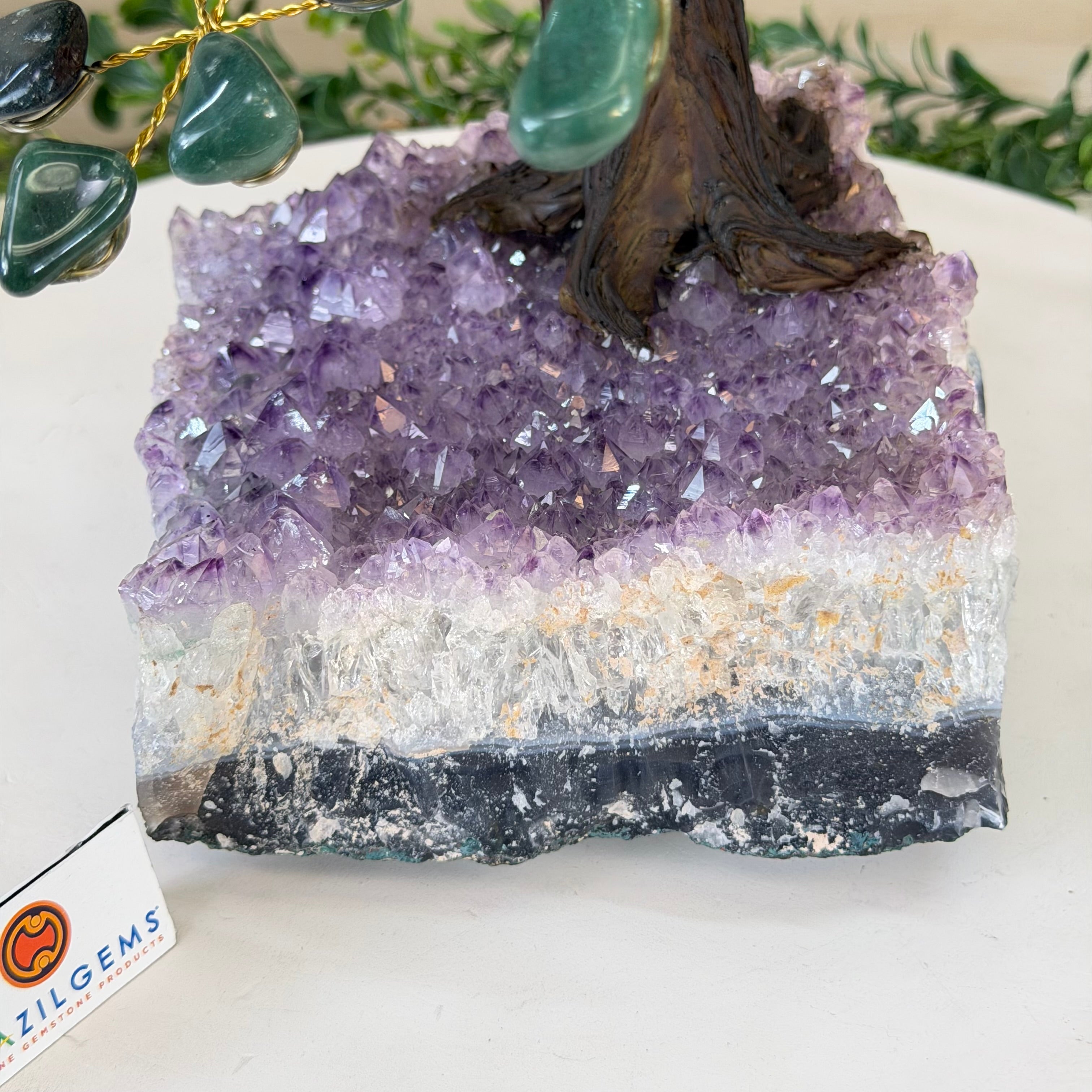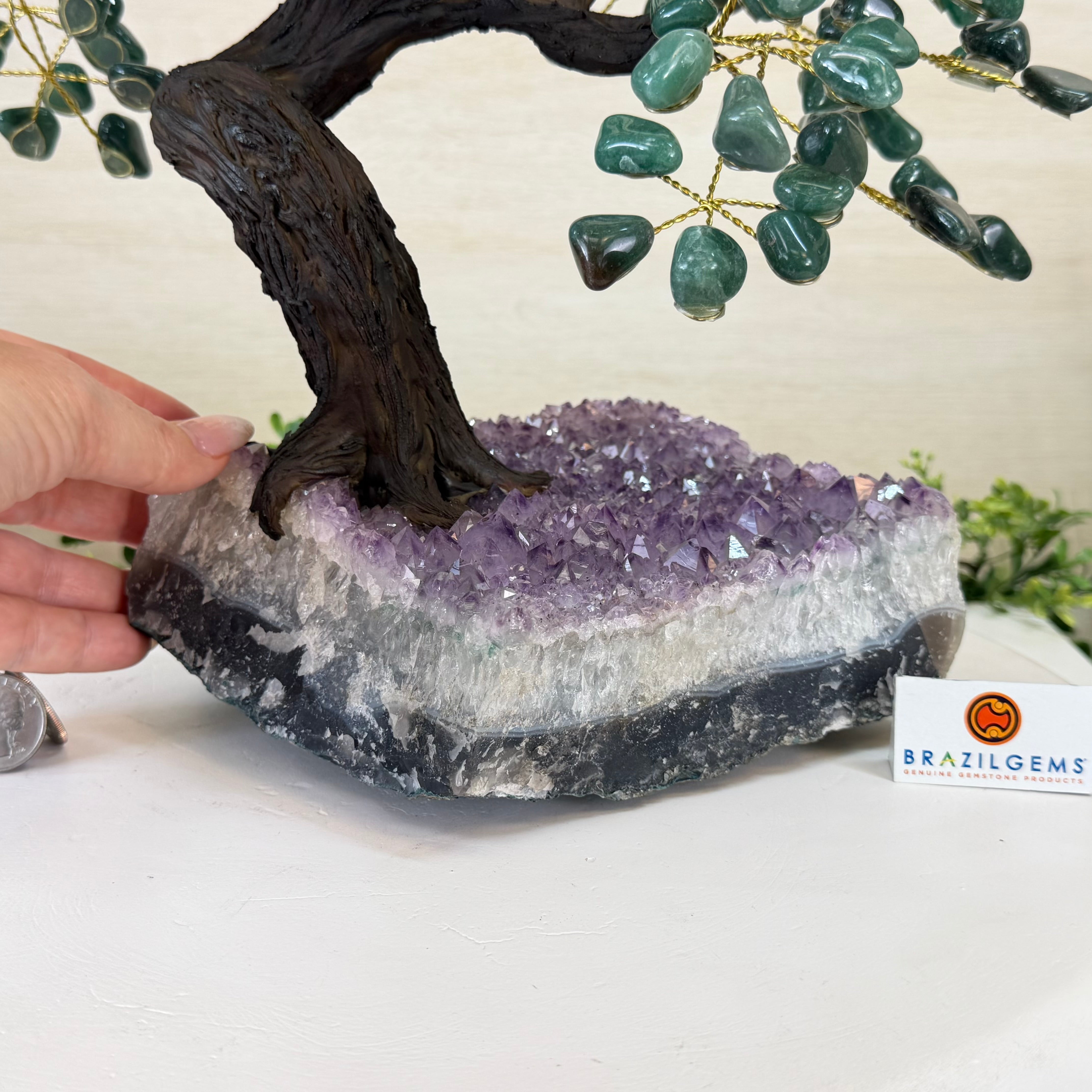 Disclaimer: This is a genuine gemstone handmade item sold by Brazil Gems® as is and as you see it in its images and video. It is the exact tree you will receive. The base may contain natural imperfections as well as imperfections, repairs and broken edges from the extraction and prepping processes and the branches and leaf gemstones may contain imperfections as well. At Brazil Gems® we make every effort to get measurements as exact as possible but they are done by human hands and eyes and therefore may have minor discrepancies. For safe shipping, the branches will arrive compacted—you’ll simply need to gently “fluff” or spread them into place upon arrival. Also, it's possible a gemstone "leaf" might fall off of a branch. If this happens, it's a simple fix with hot glue or super glue.