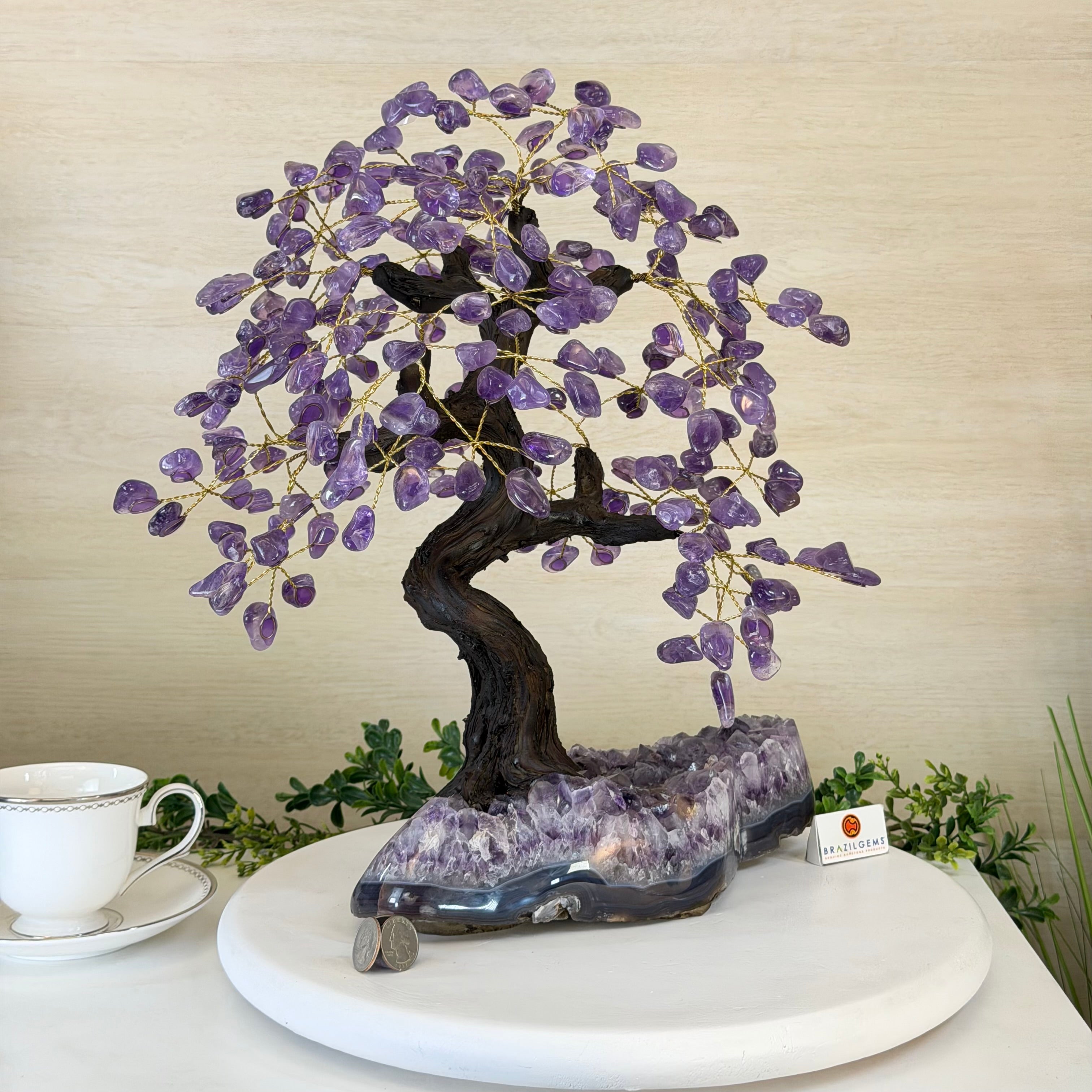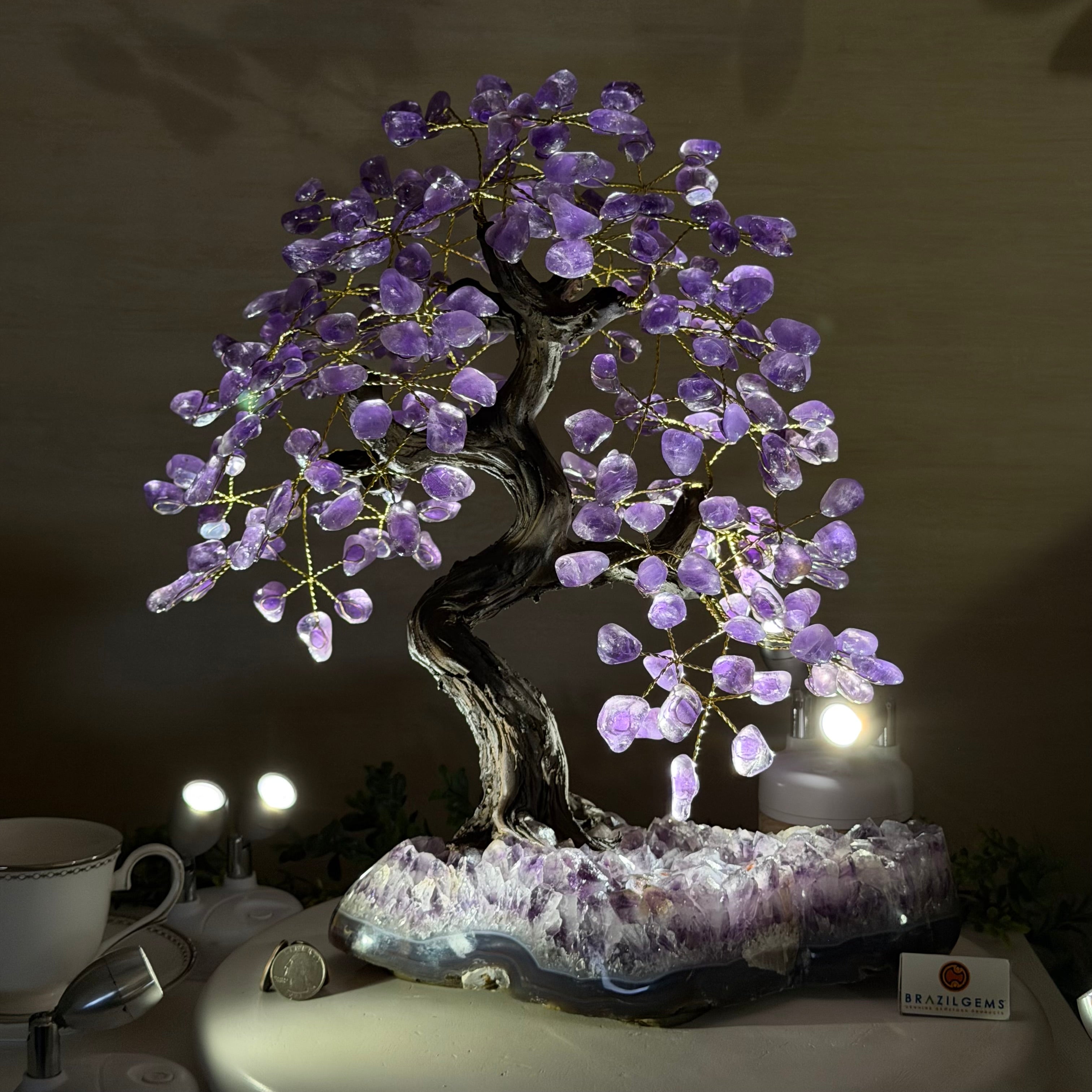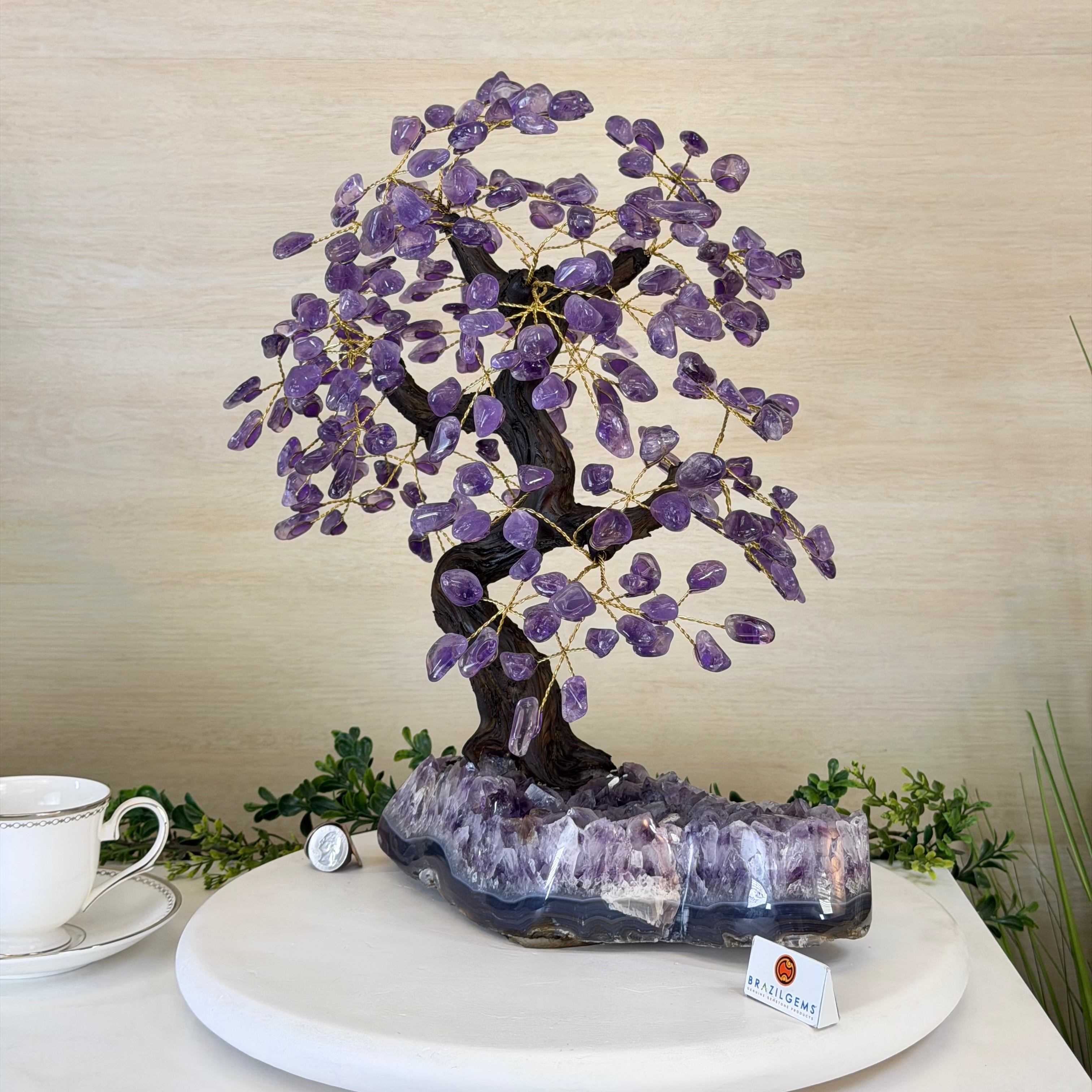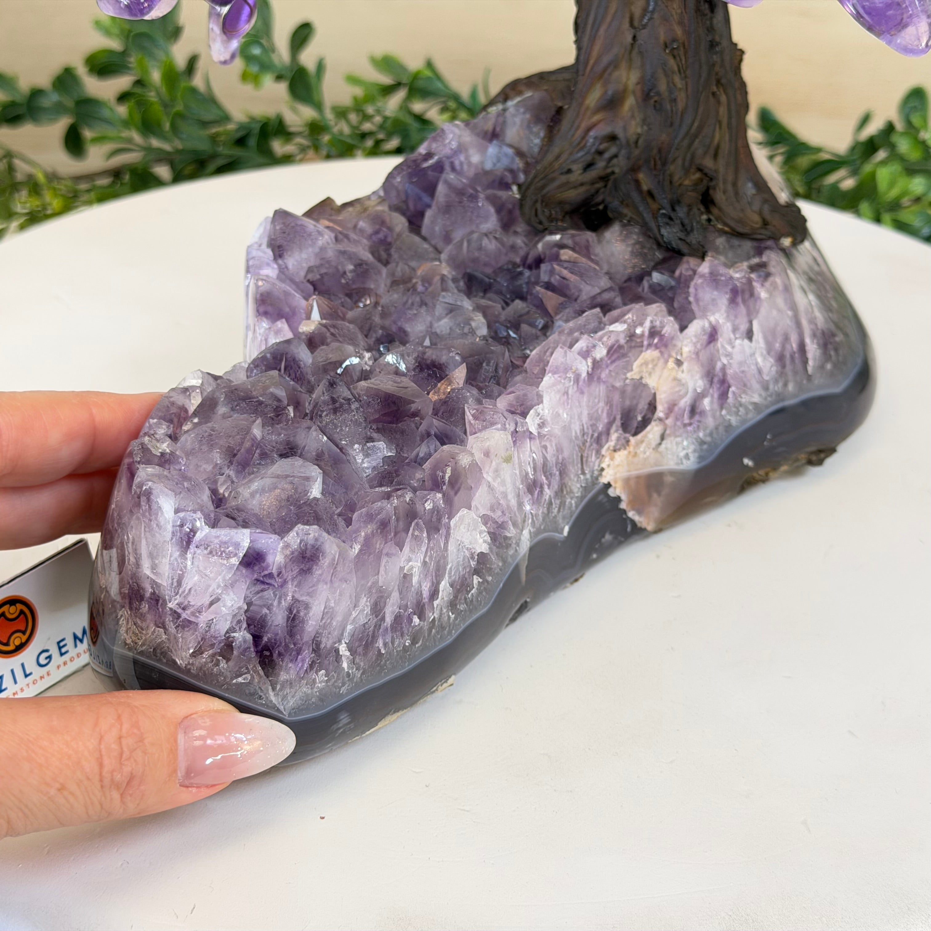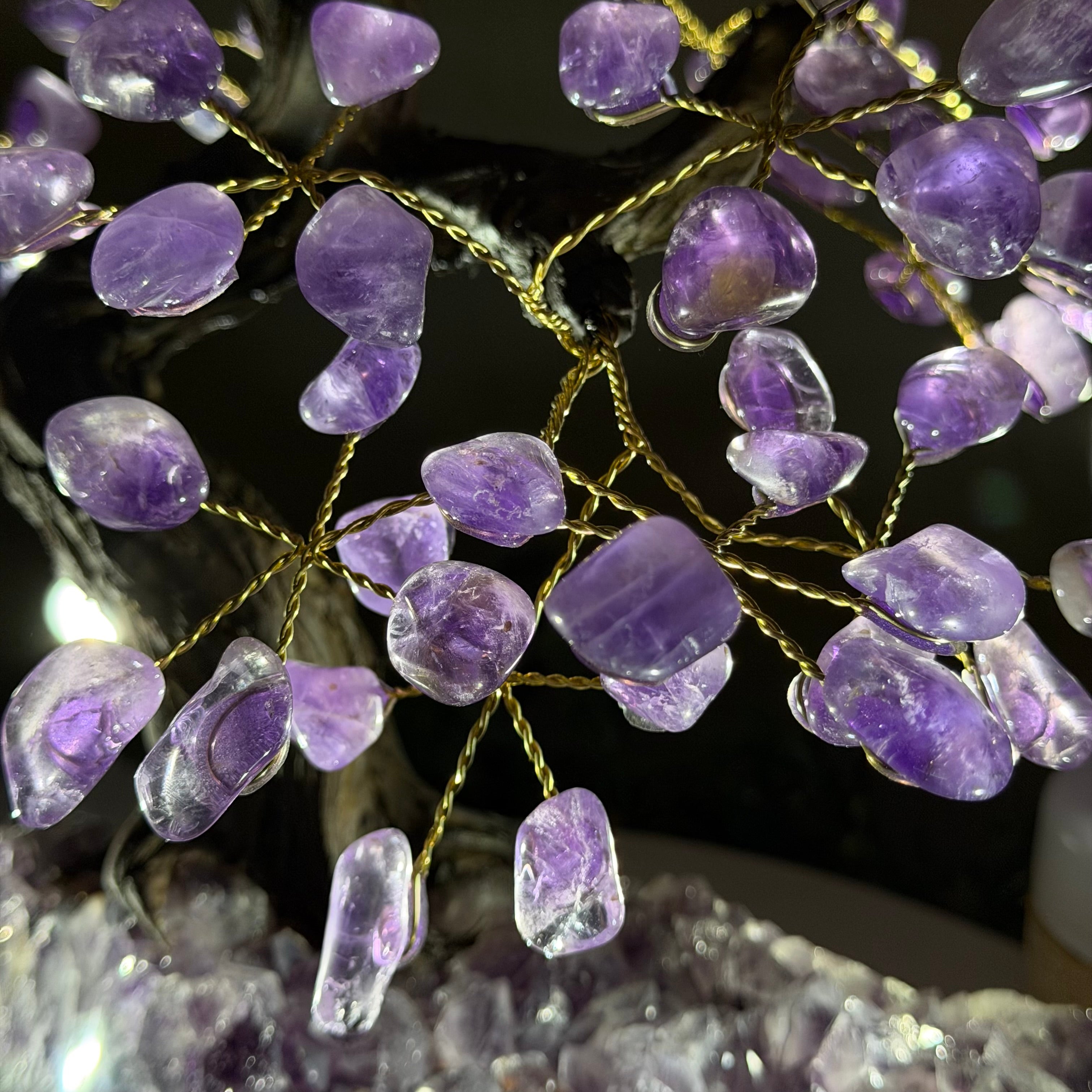 What makes this tree Special? Its polished Amethyst cluster base and its gemstones leaves are of a higher quality crystal with deeper purple colors and clarity making it even more beautiful.