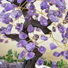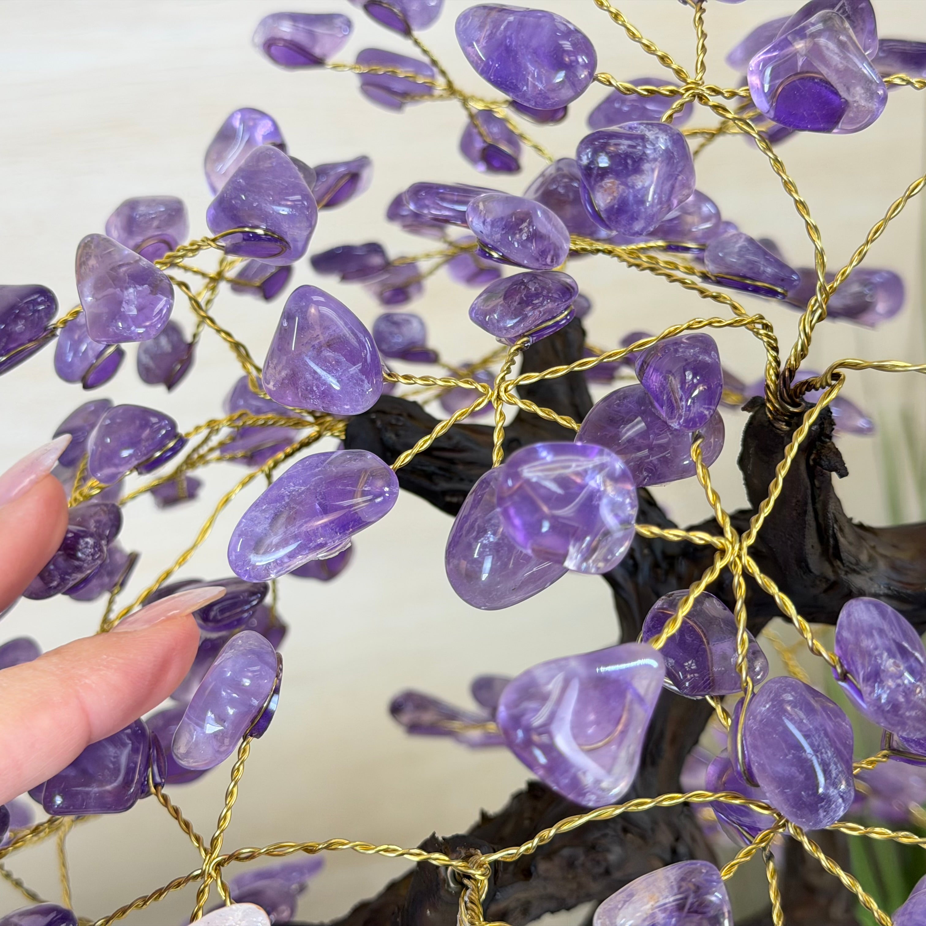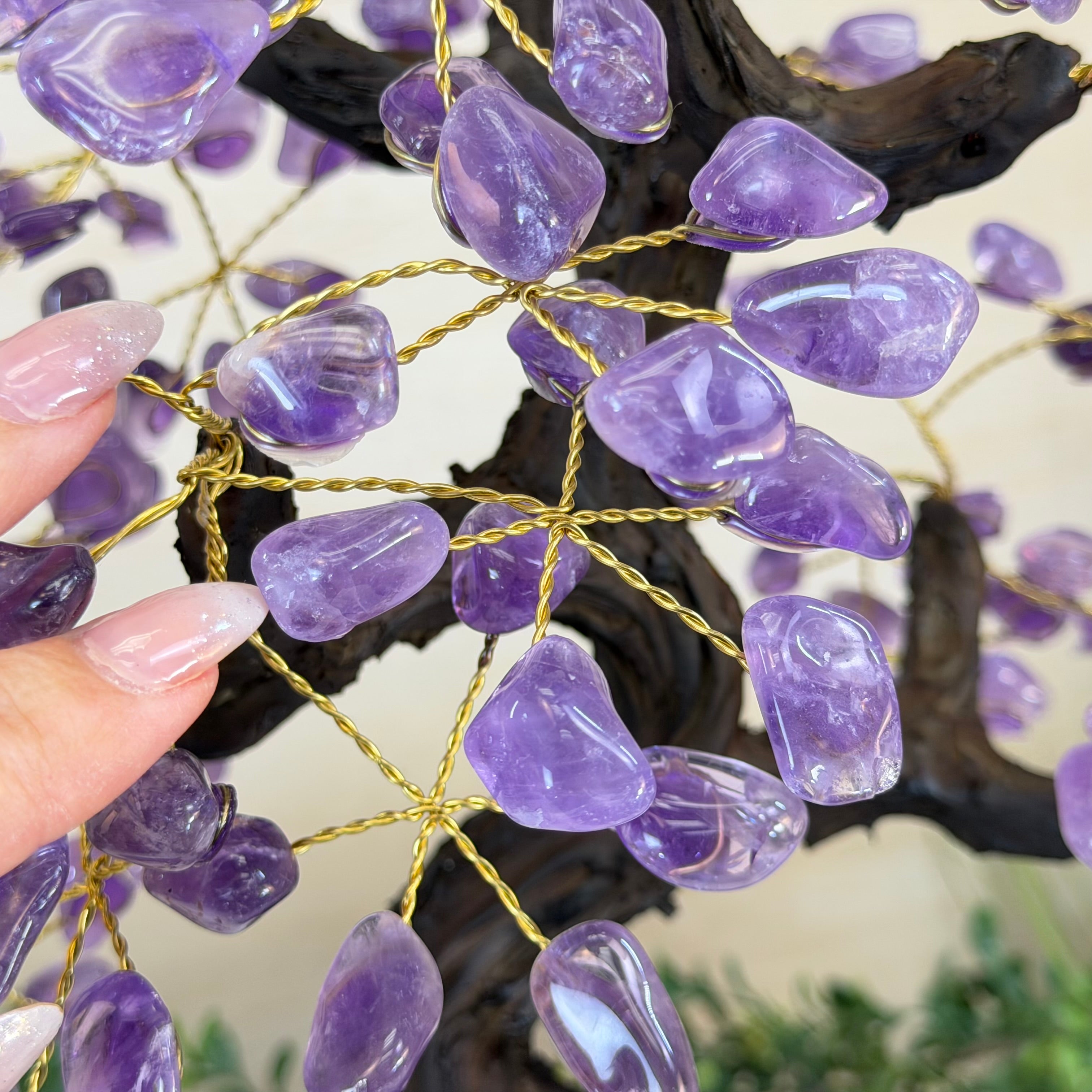 Handcrafted in Brazil, this striking gemstone tree stands approximately 16" tall and features a sturdy bonsai-style trunk and branches adorned with 240 tumbled Amethyst gemstones as its leaves.