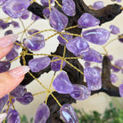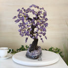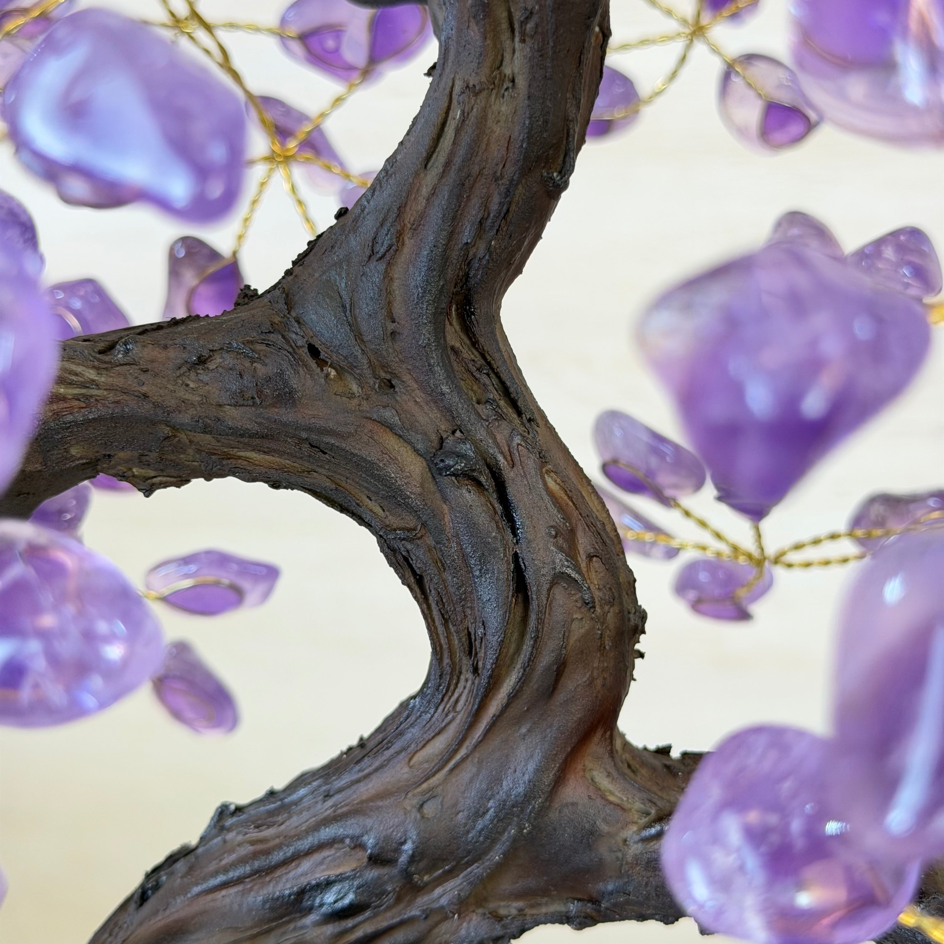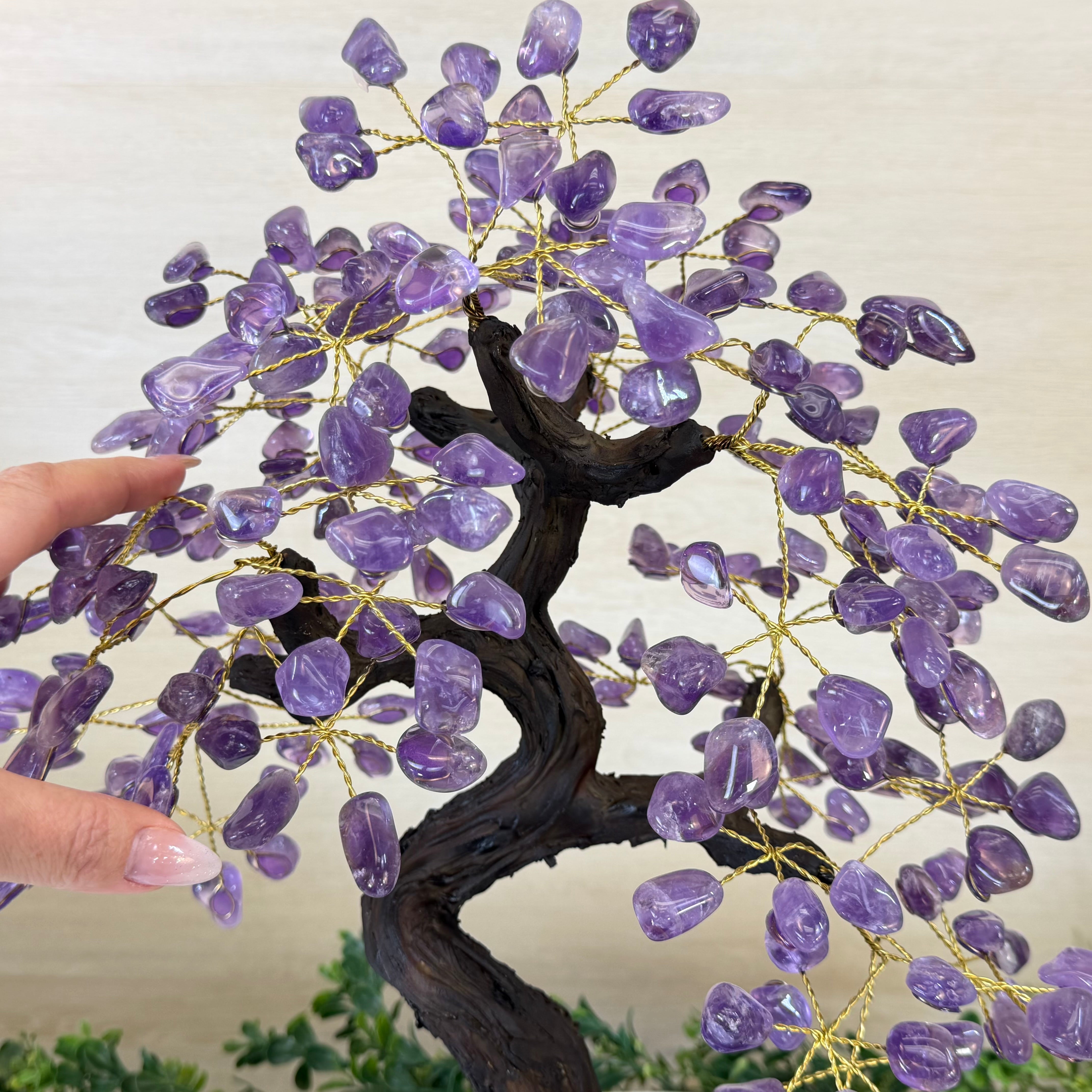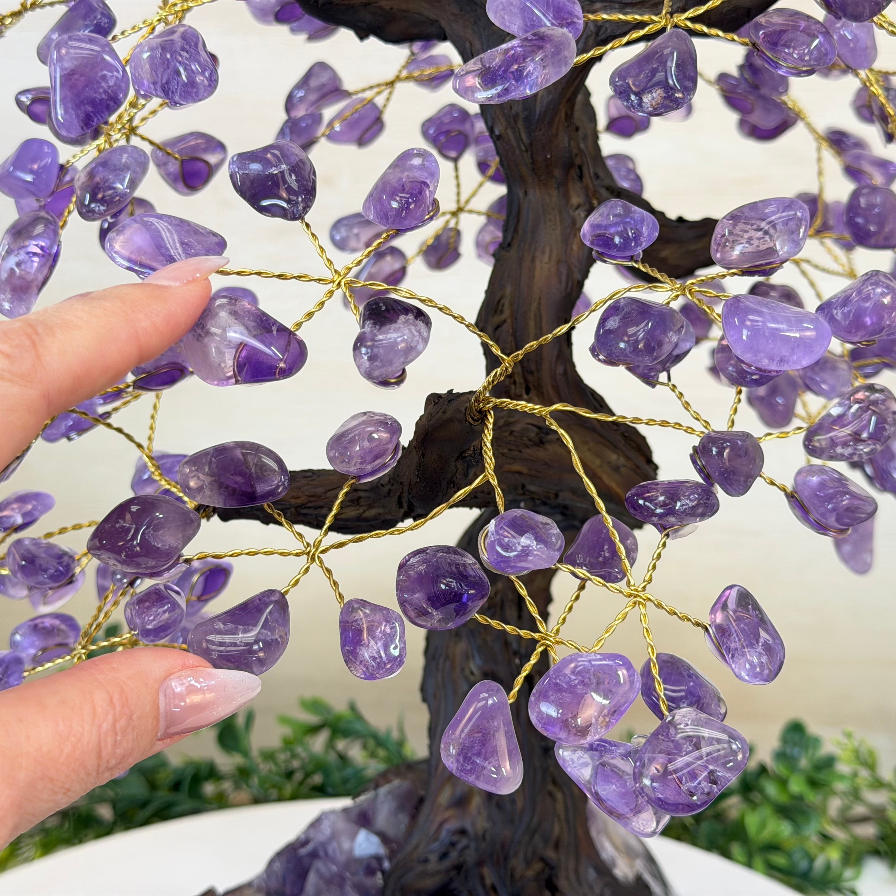 The process to make a gemstone tree like this is very extensive and meticulous. A special polished Amethyst cluster is selected for the base, the resin trunk and branches are crafted into a bonsai style by artisans in Brazil and then each gemstone is glued to the tree by hand. The result is a work of art that radiates harmony, care, and intention.
