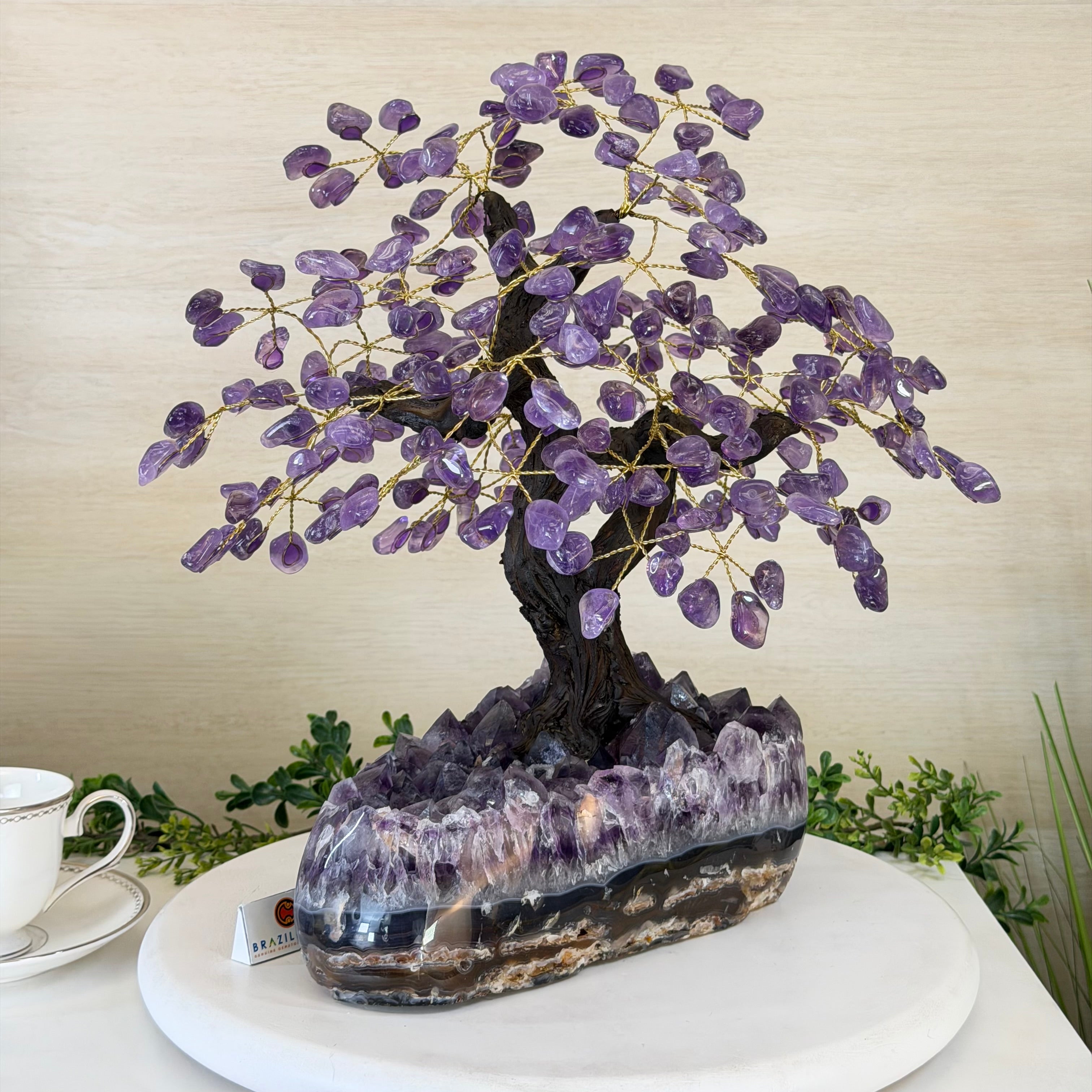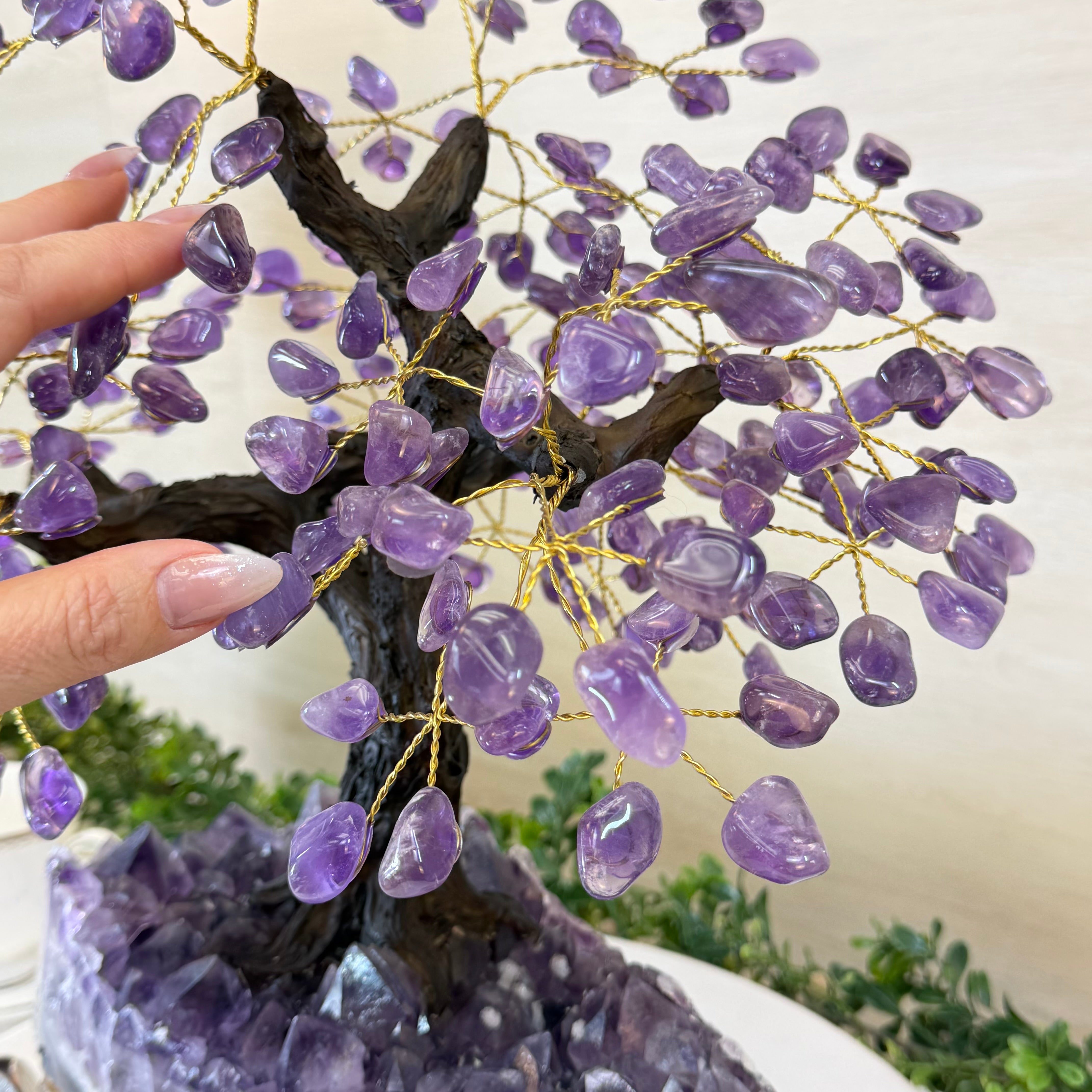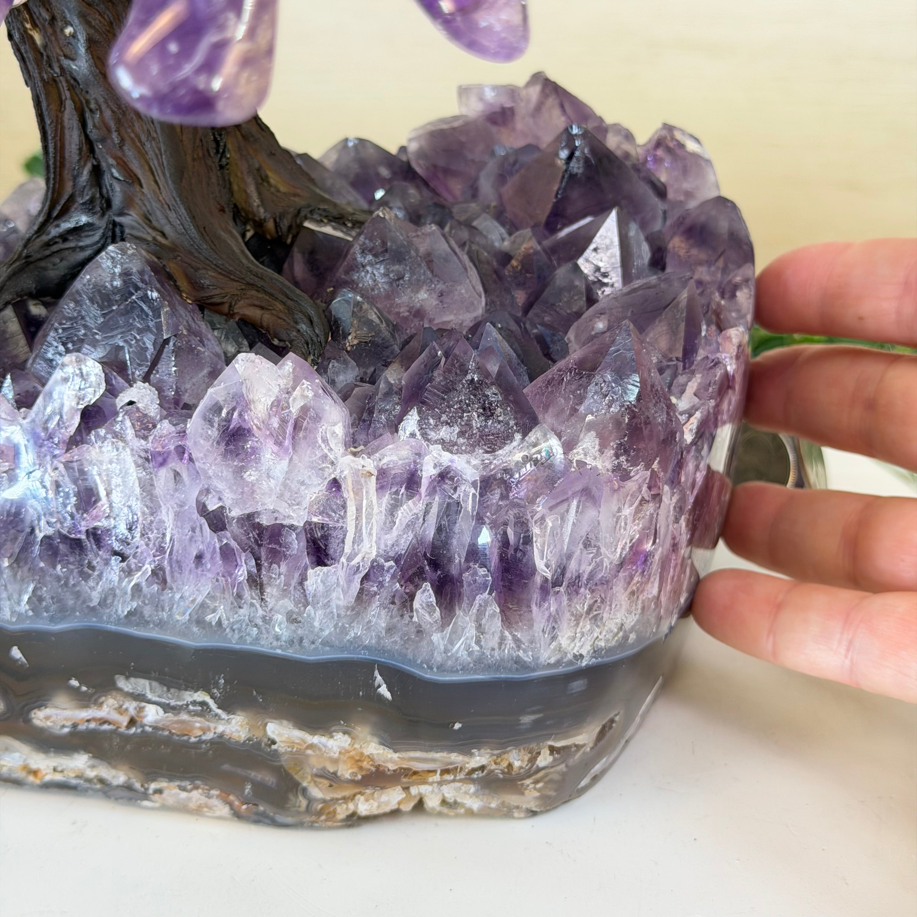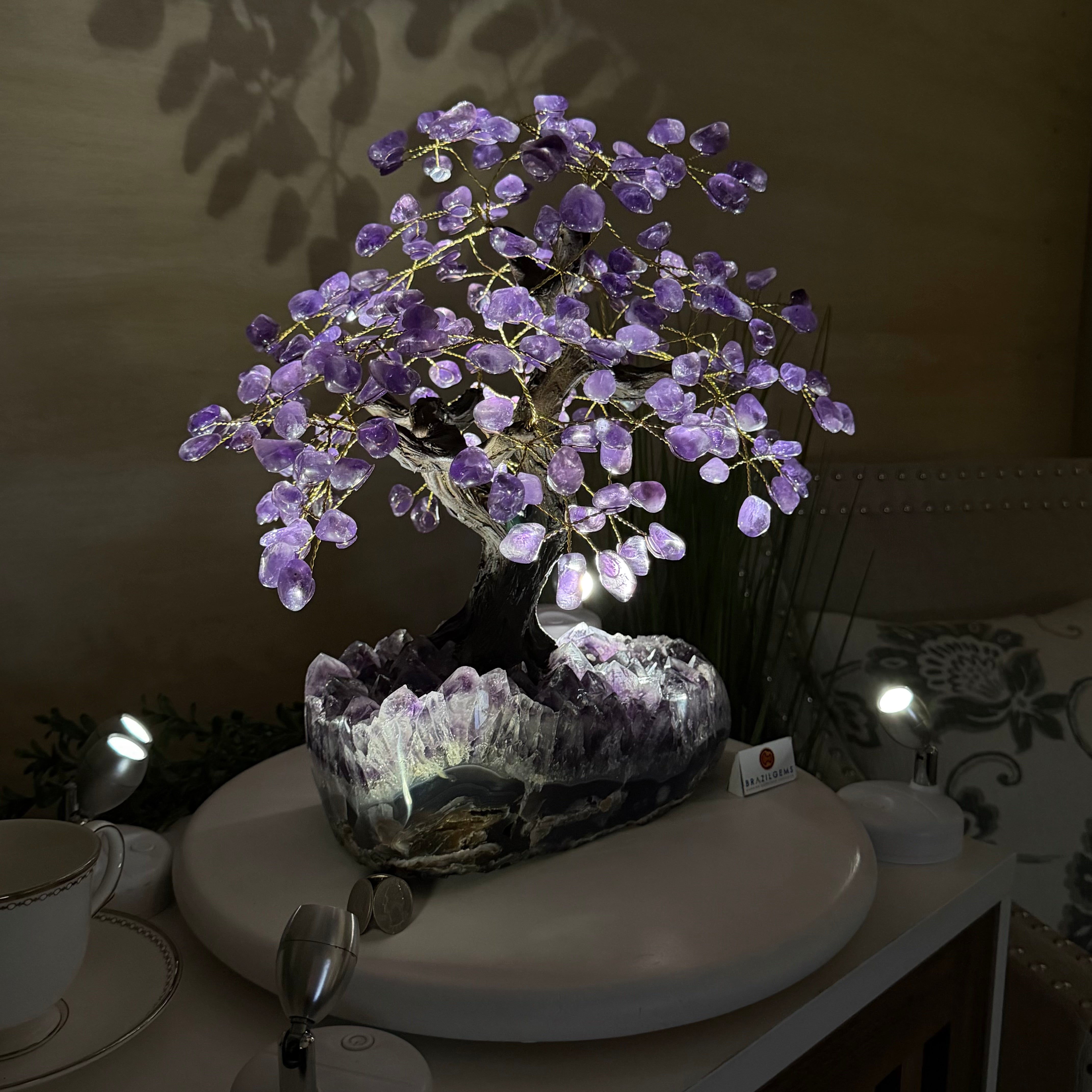 What makes this tree Special? Its polished Amethyst cluster base and its gemstones leaves are of a higher quality crystal with deeper purple colors and clarity making it even more beautiful.