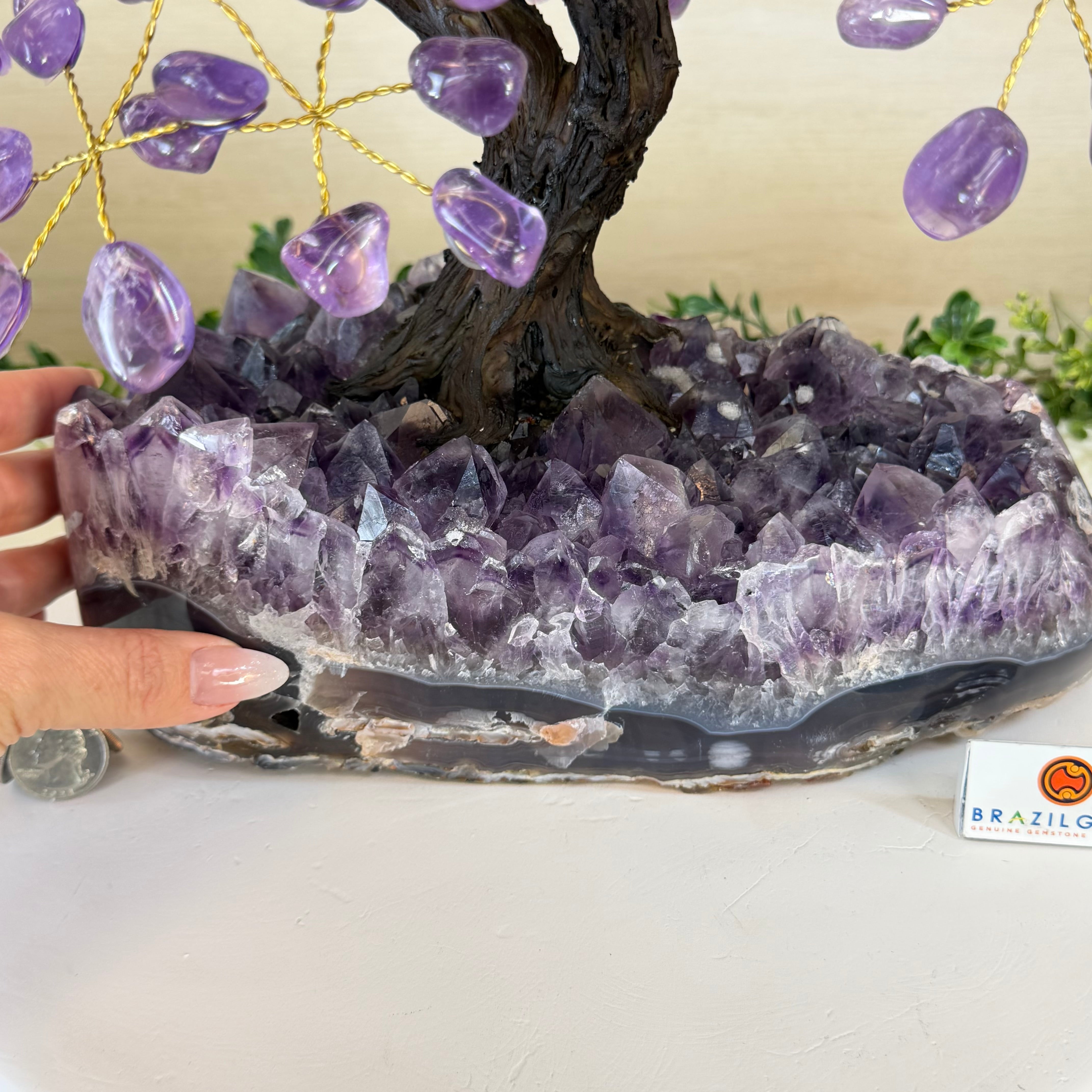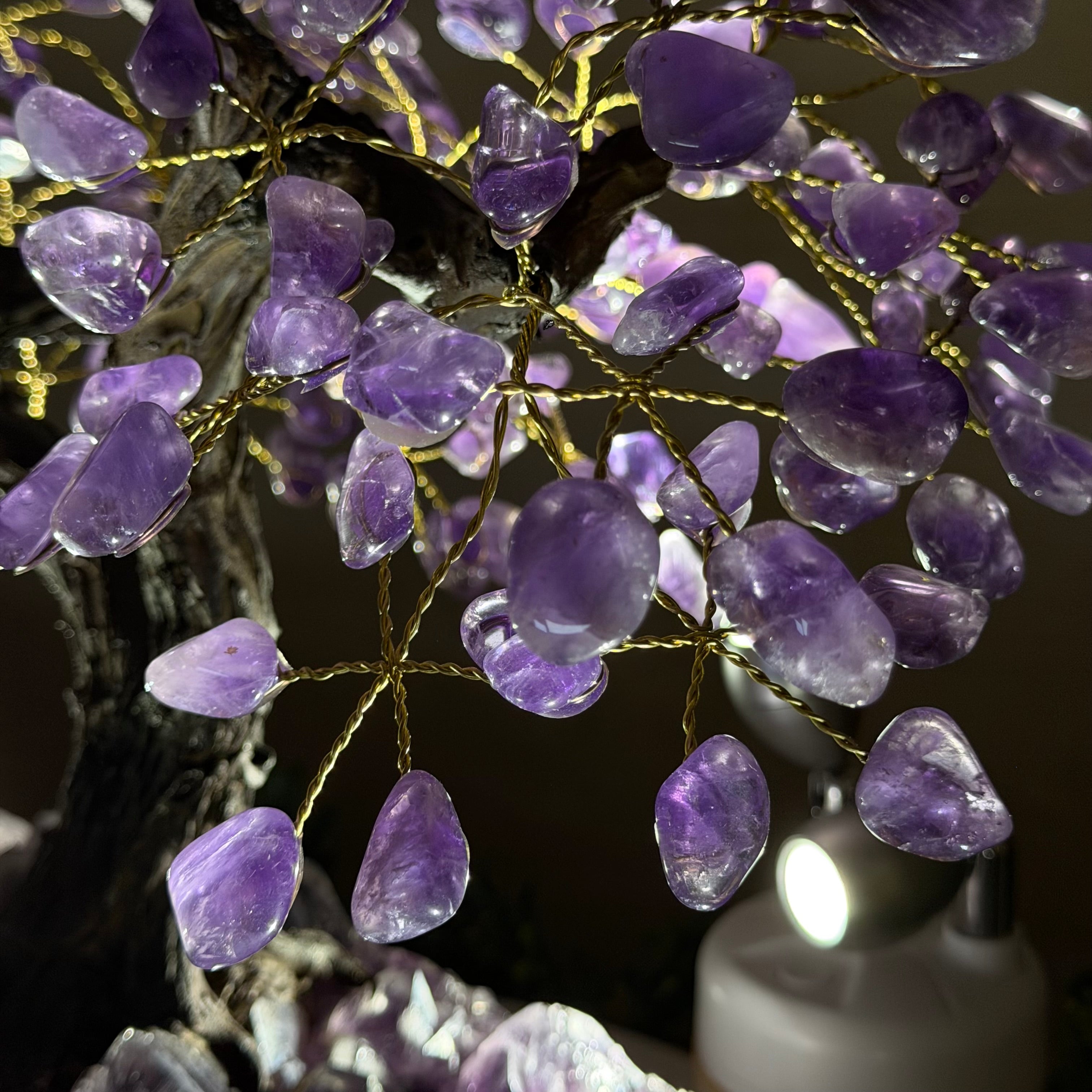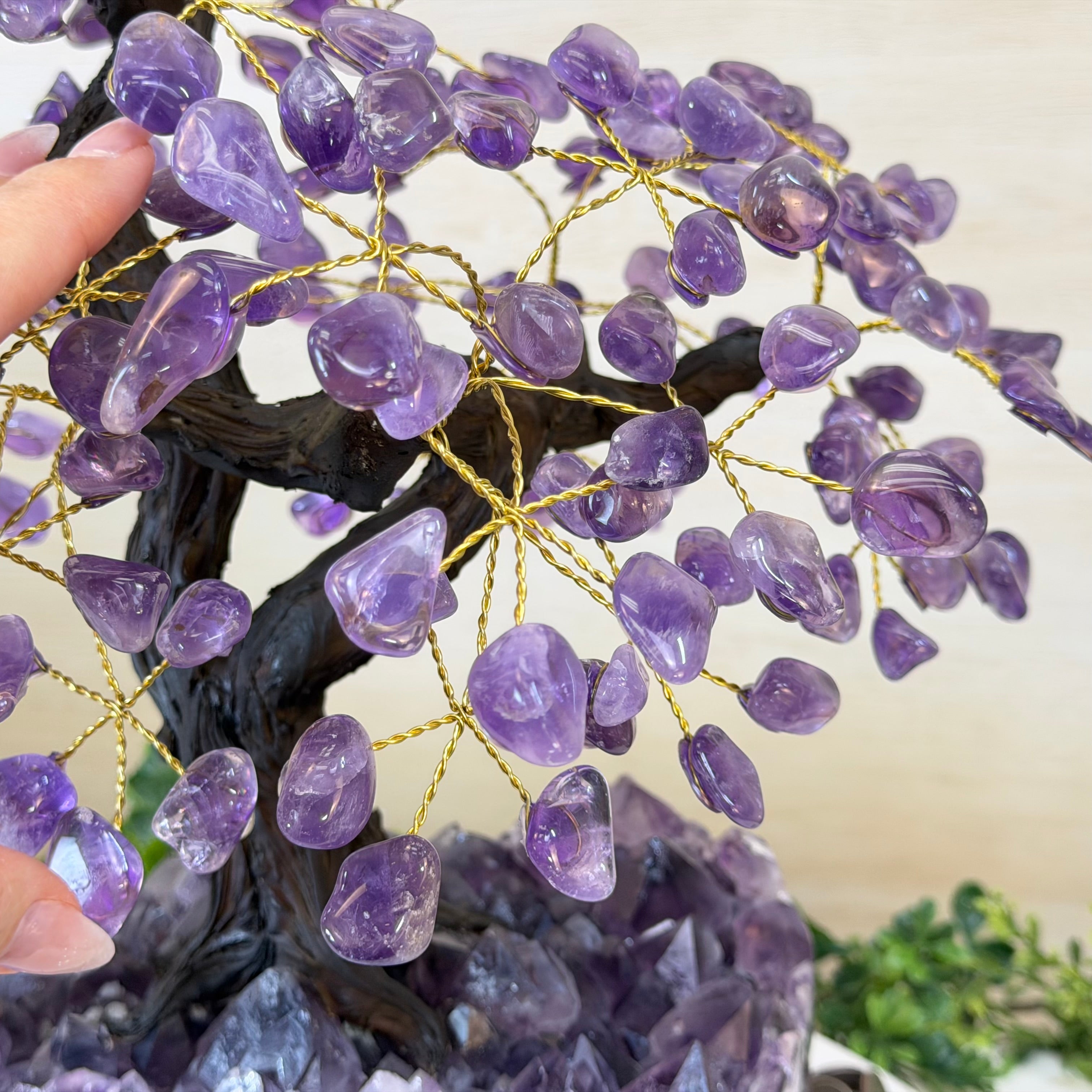 What makes this tree Special? Its polished Amethyst cluster base and its gemstones leaves are of a higher quality crystal with deeper purple colors and clarity making it even more beautiful.