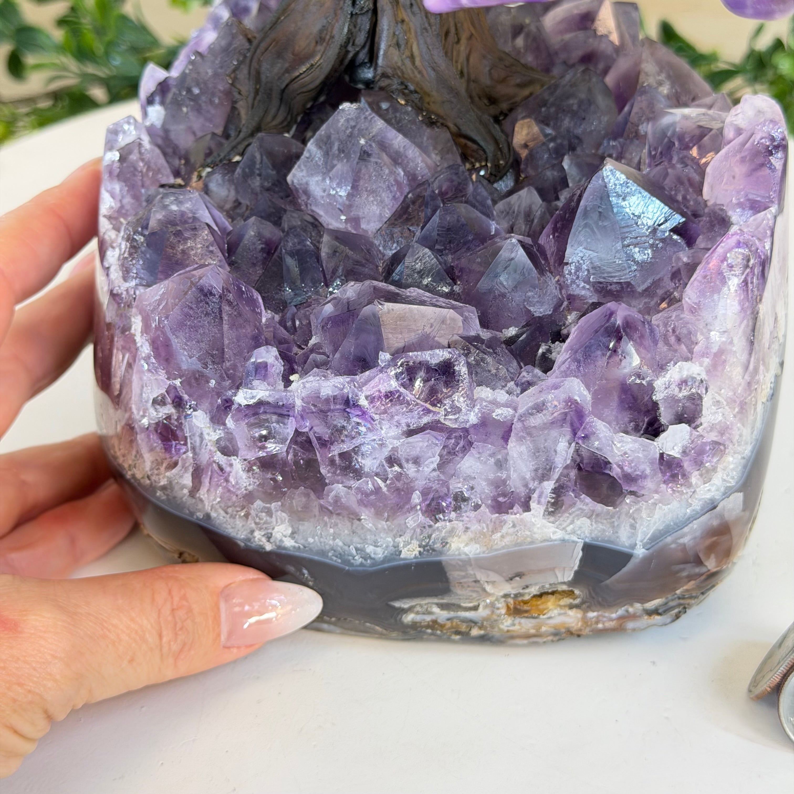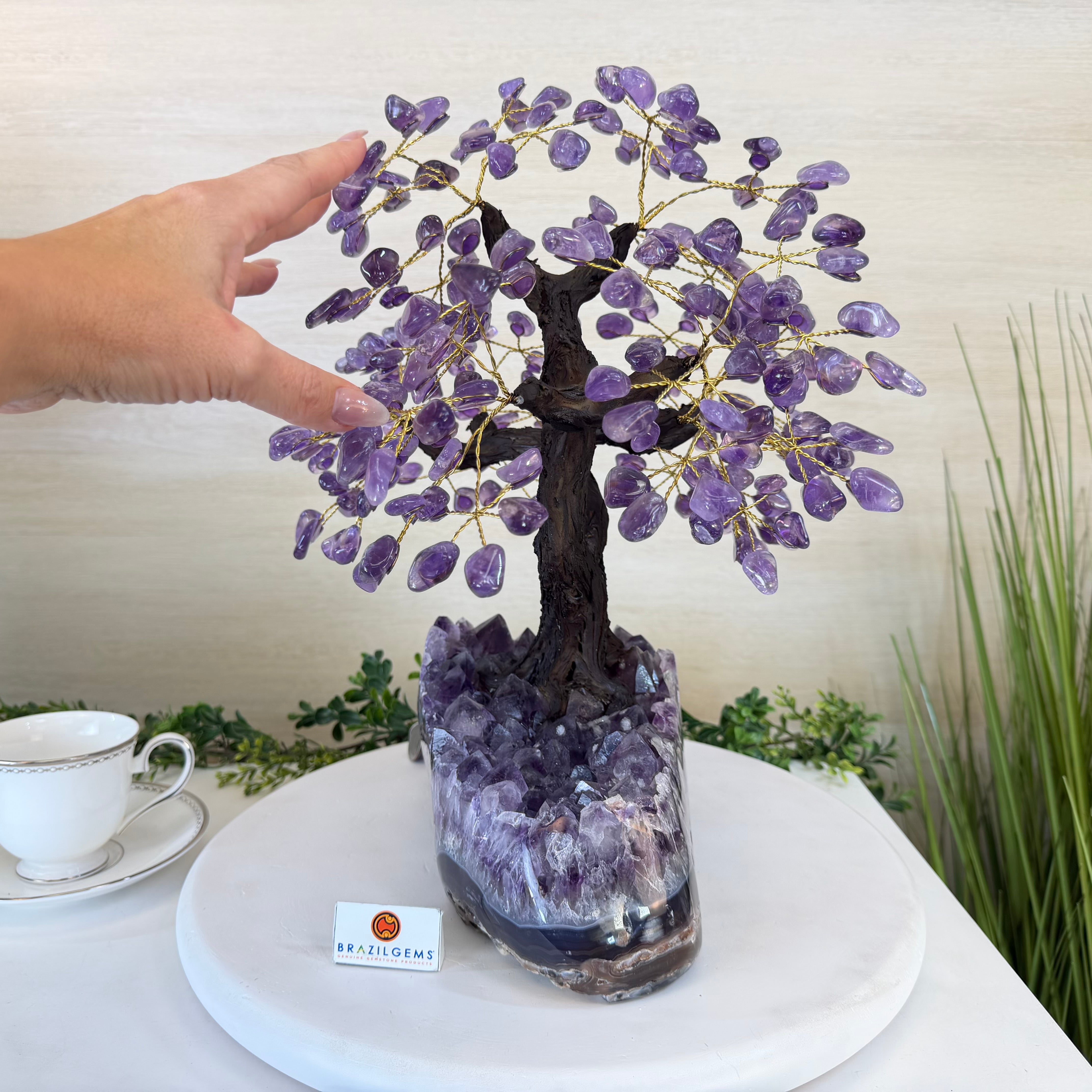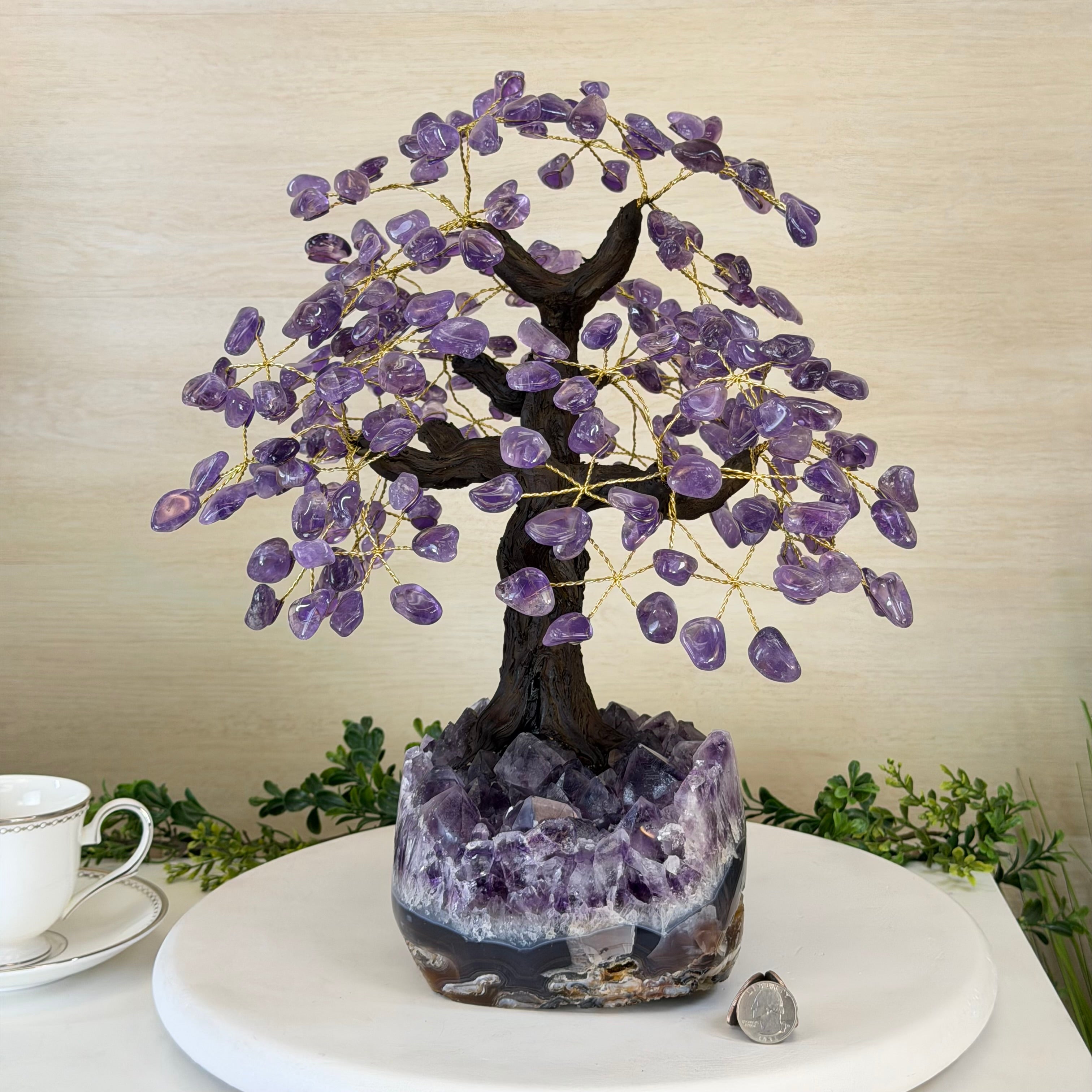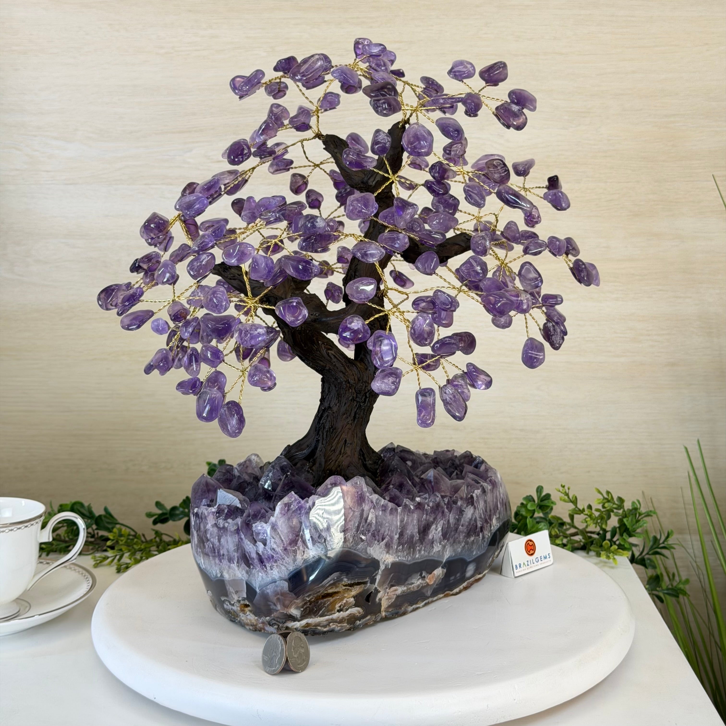 What makes this tree Special? Its polished Amethyst cluster base and its gemstones leaves are of a higher quality crystal with deeper purple colors and clarity making it even more beautiful.
