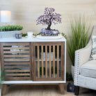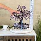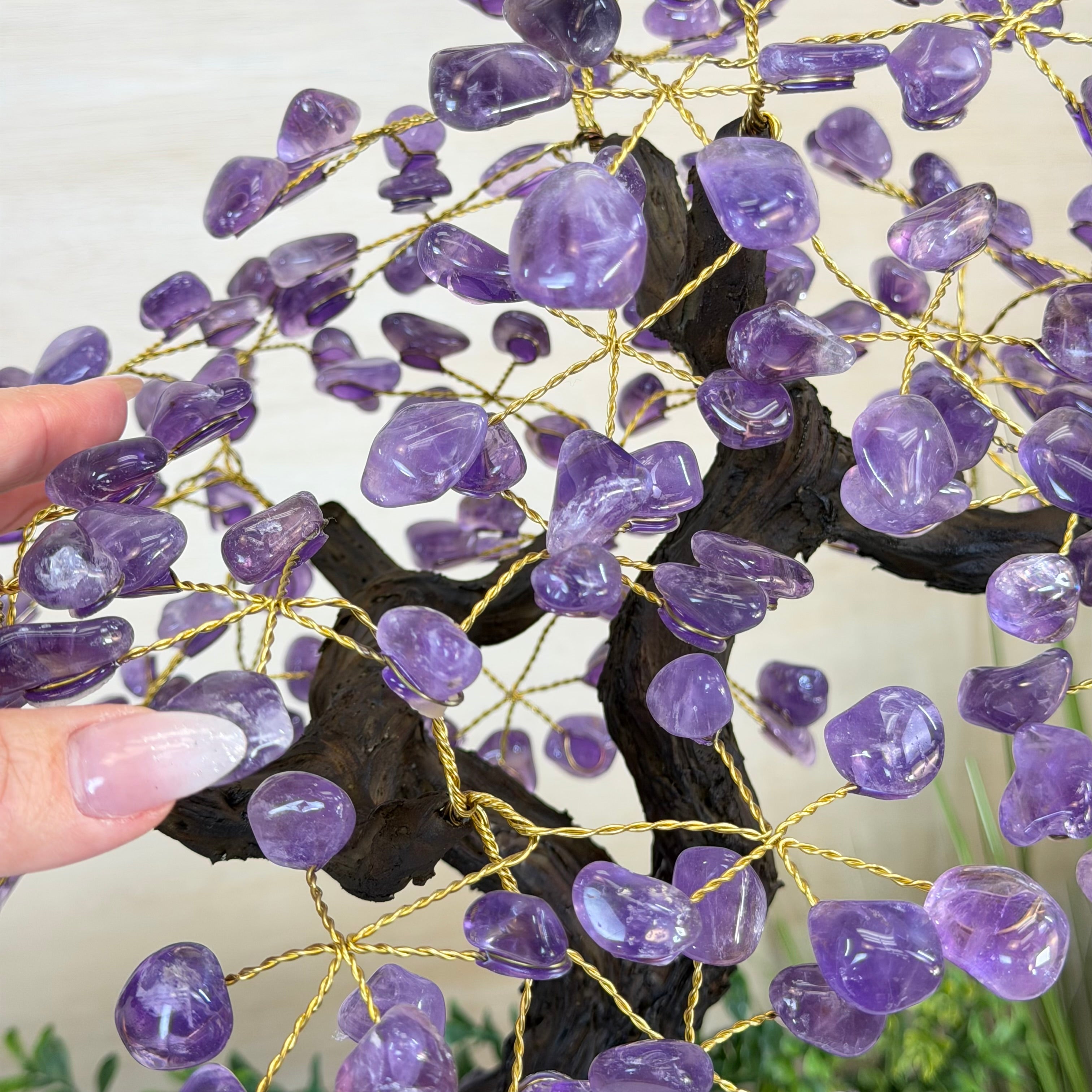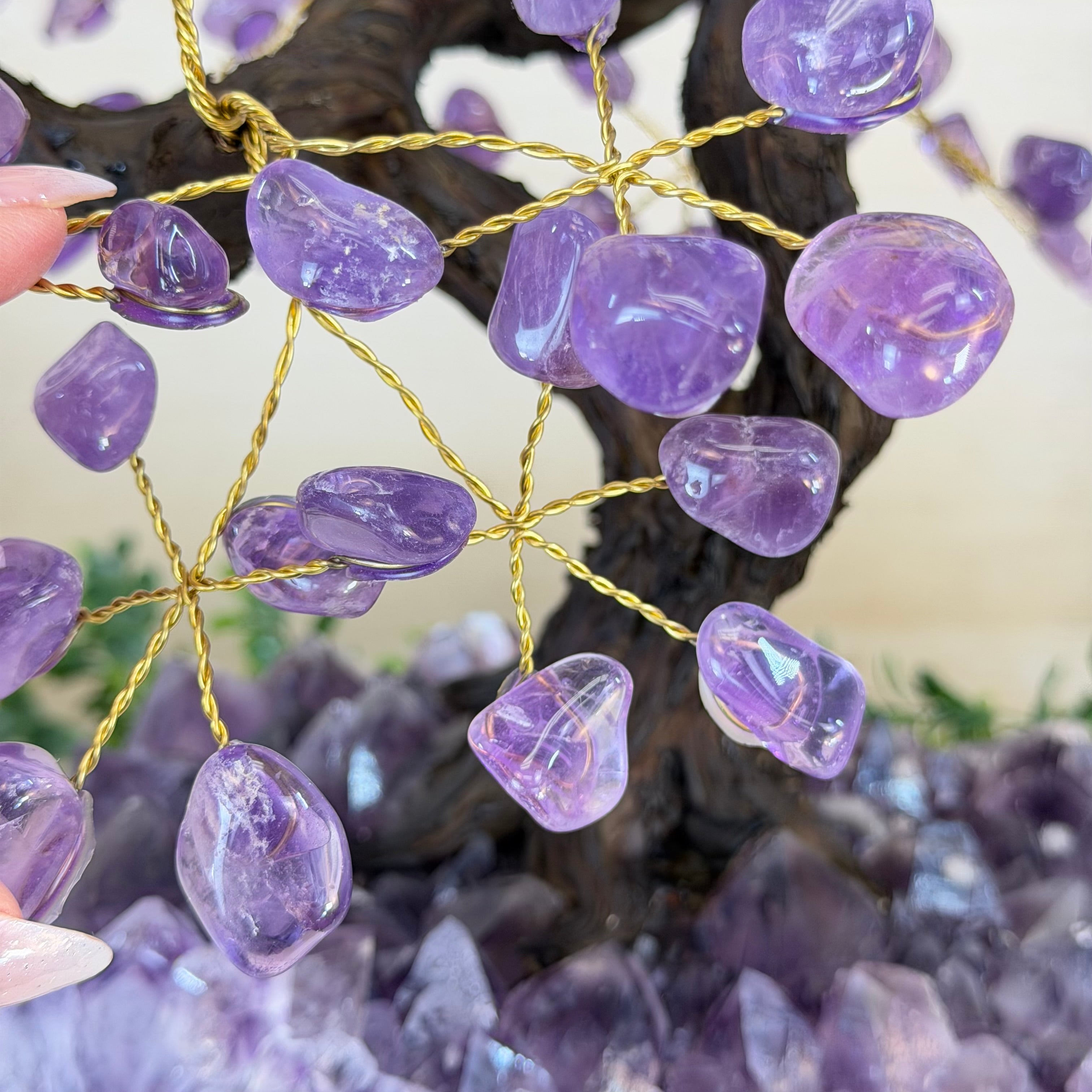Handcrafted in Brazil, this striking gemstone tree stands approximately 16" tall and features a sturdy bonsai-style trunk and branches adorned with 240 tumbled Amethyst gemstones as its leaves.