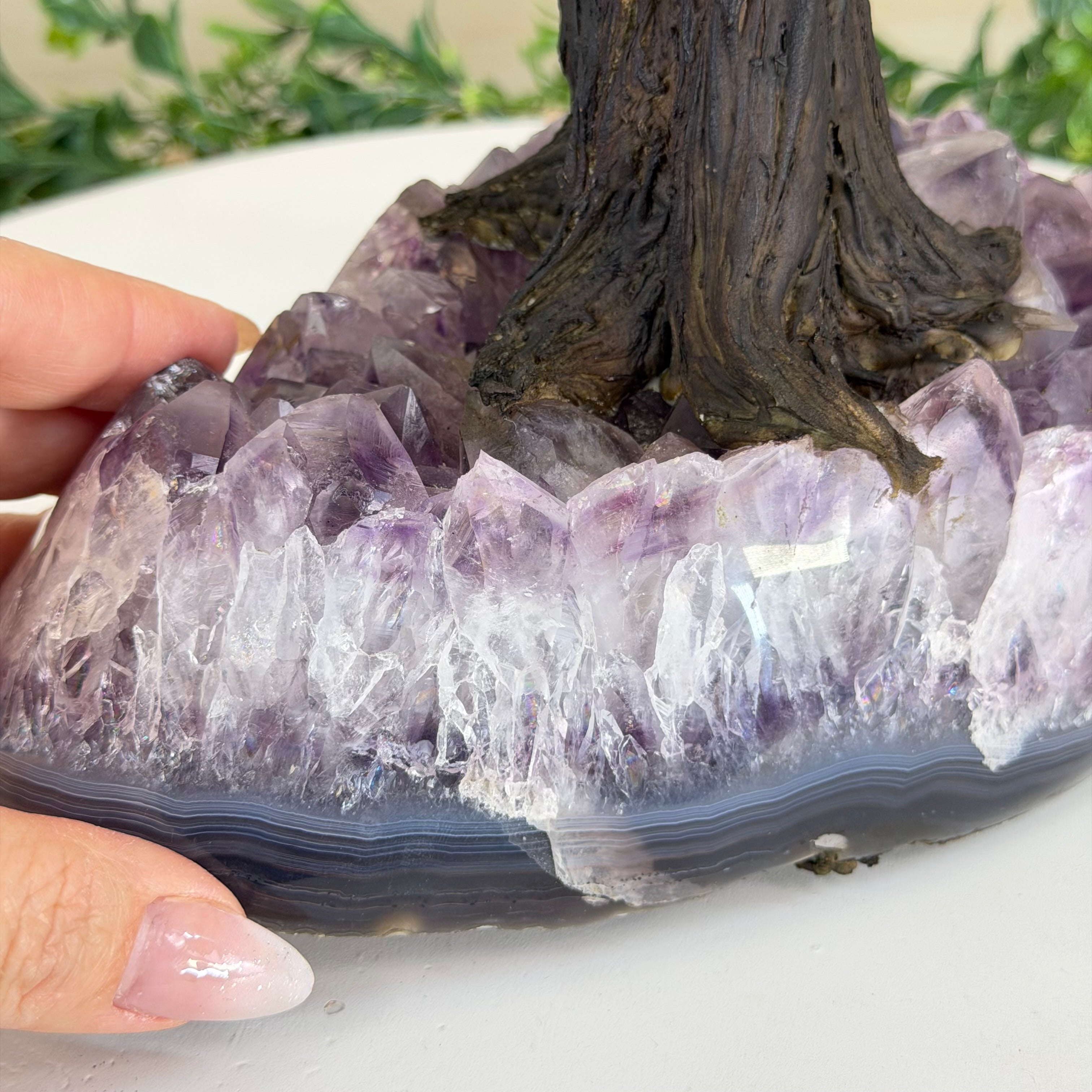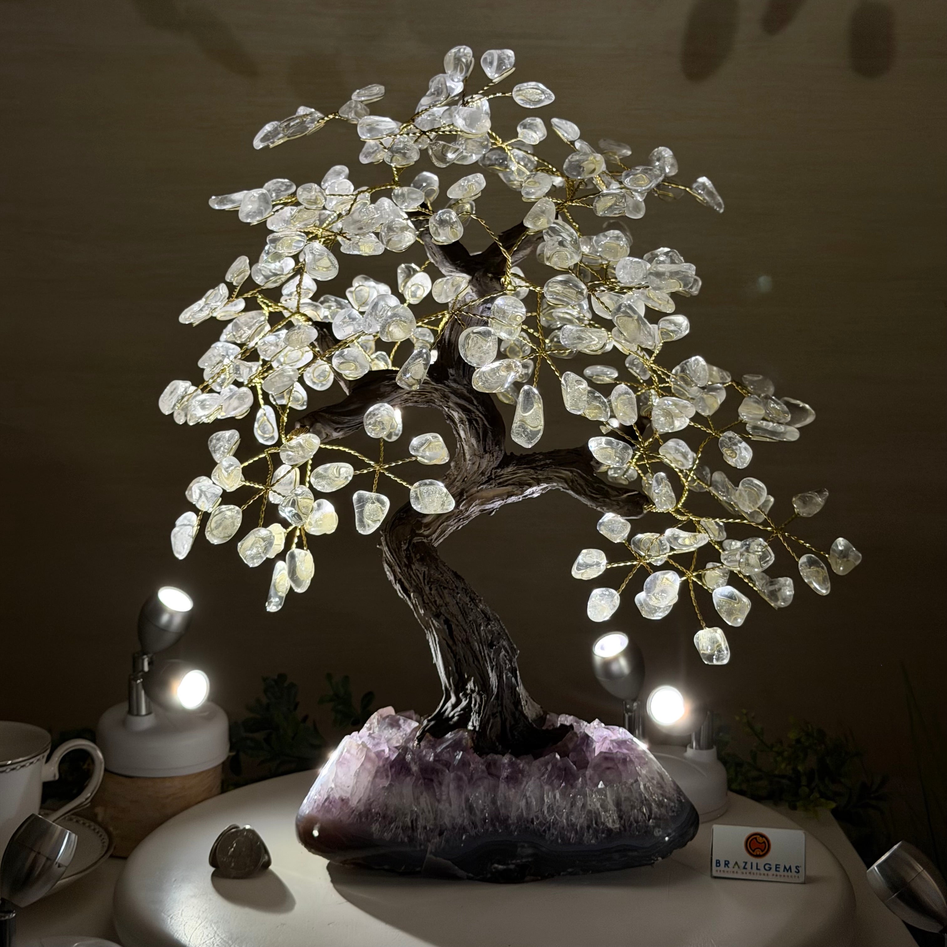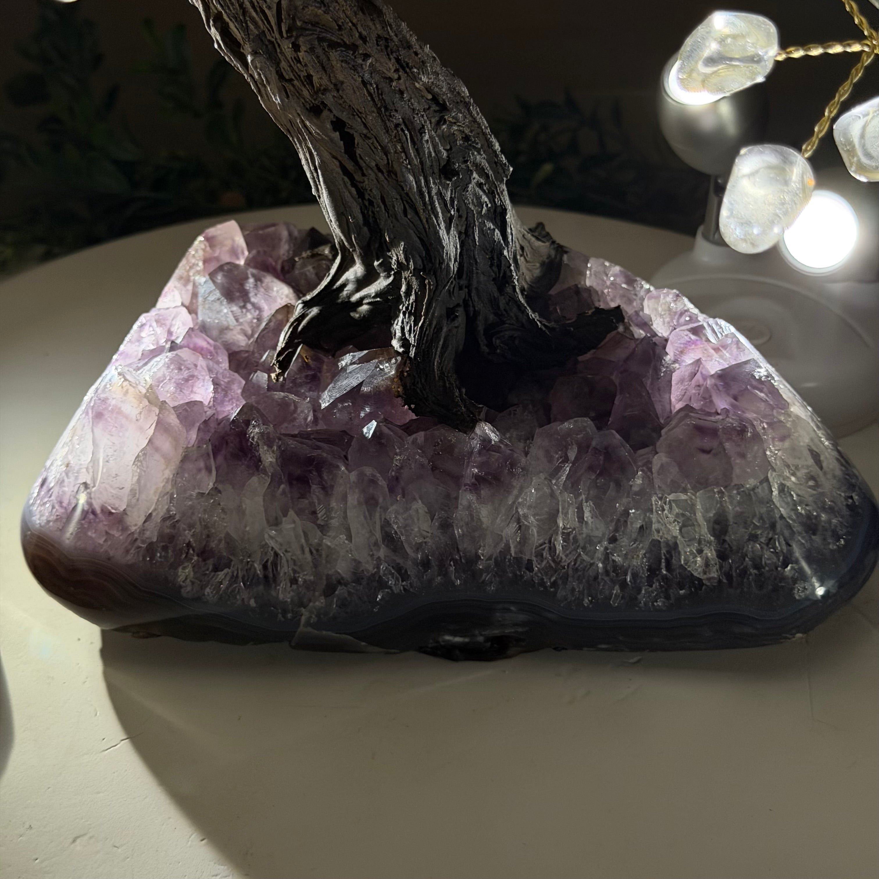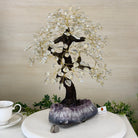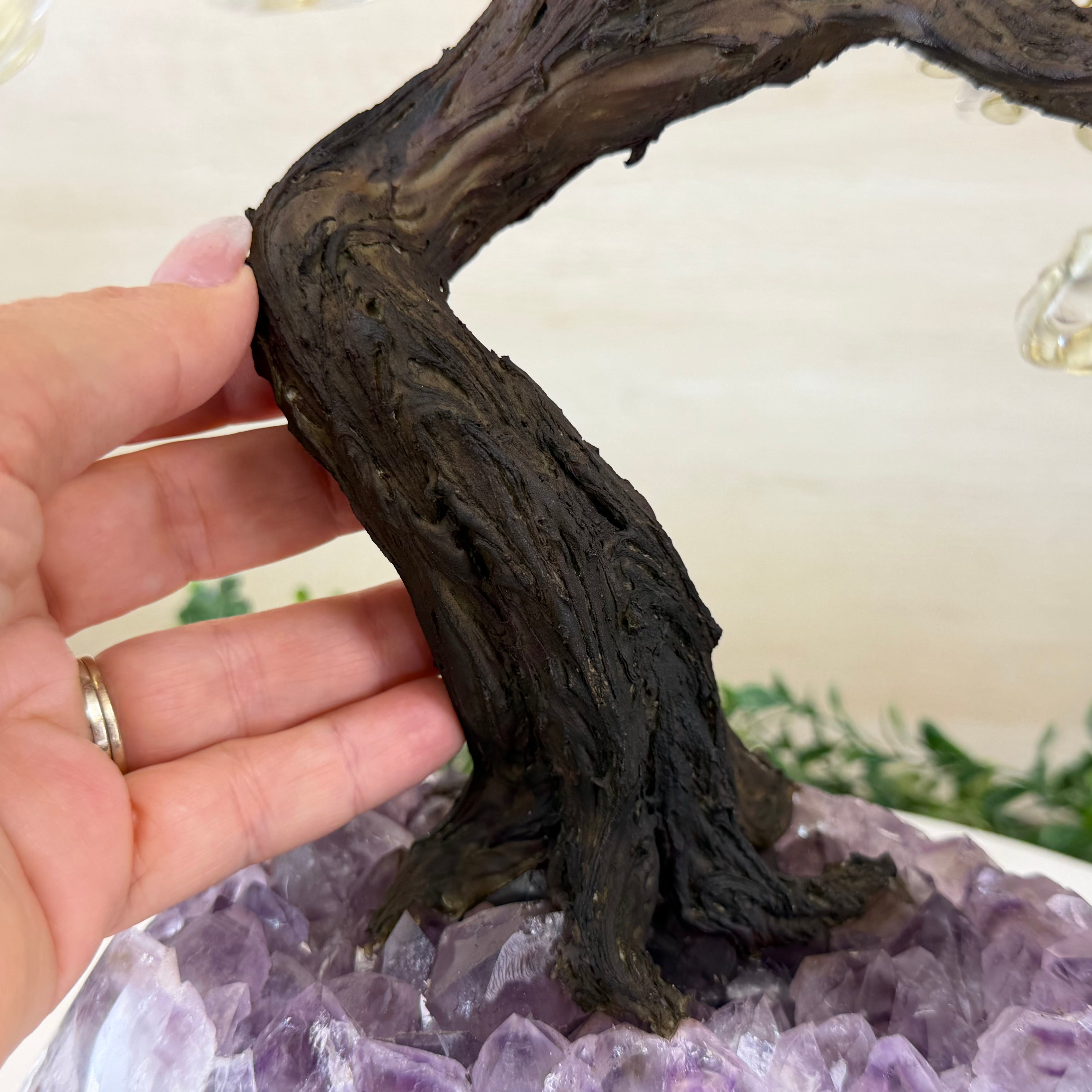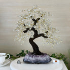 Special Clear Quartz Bonsai Gemstone Tree on a Polished Amethyst Cluster Base
