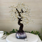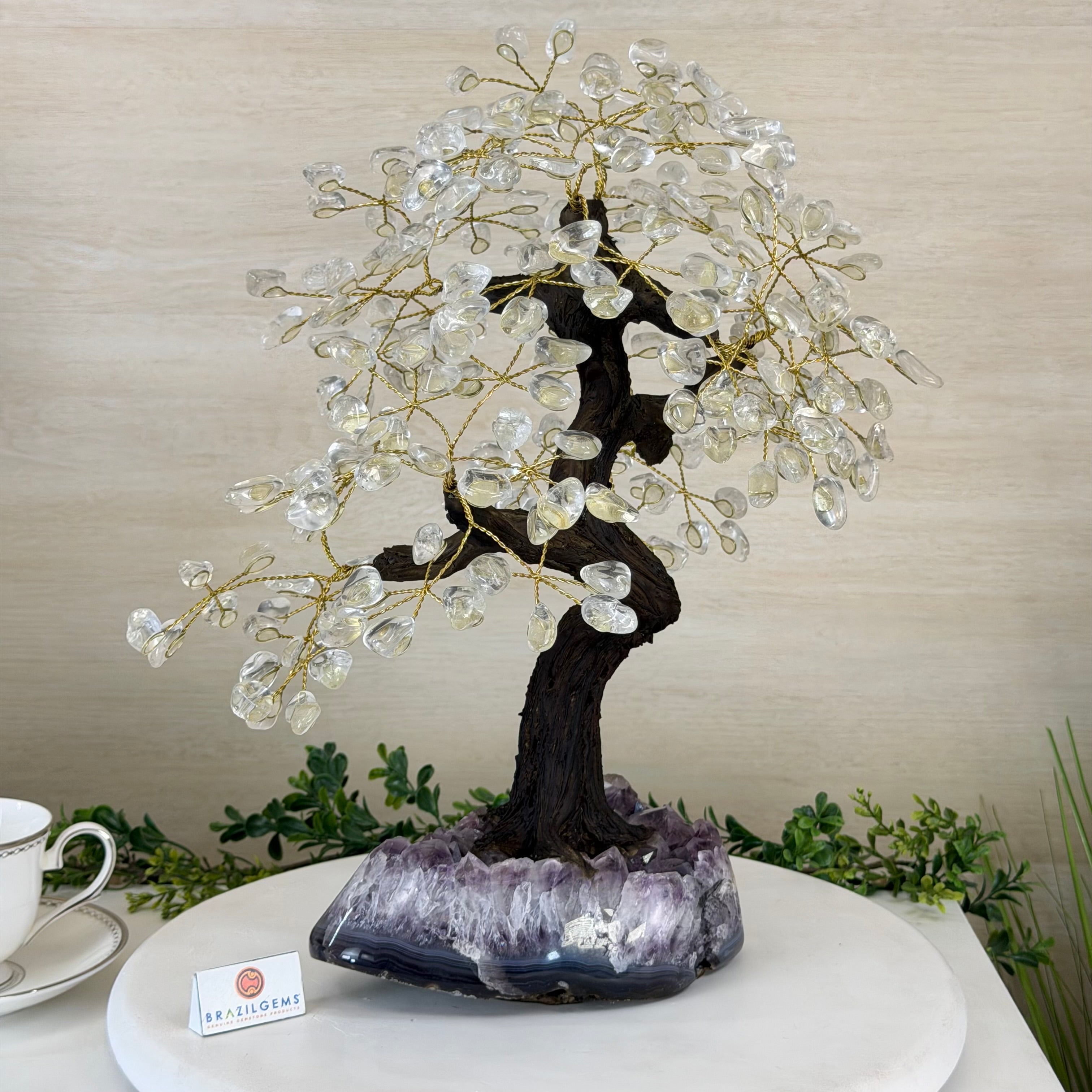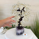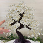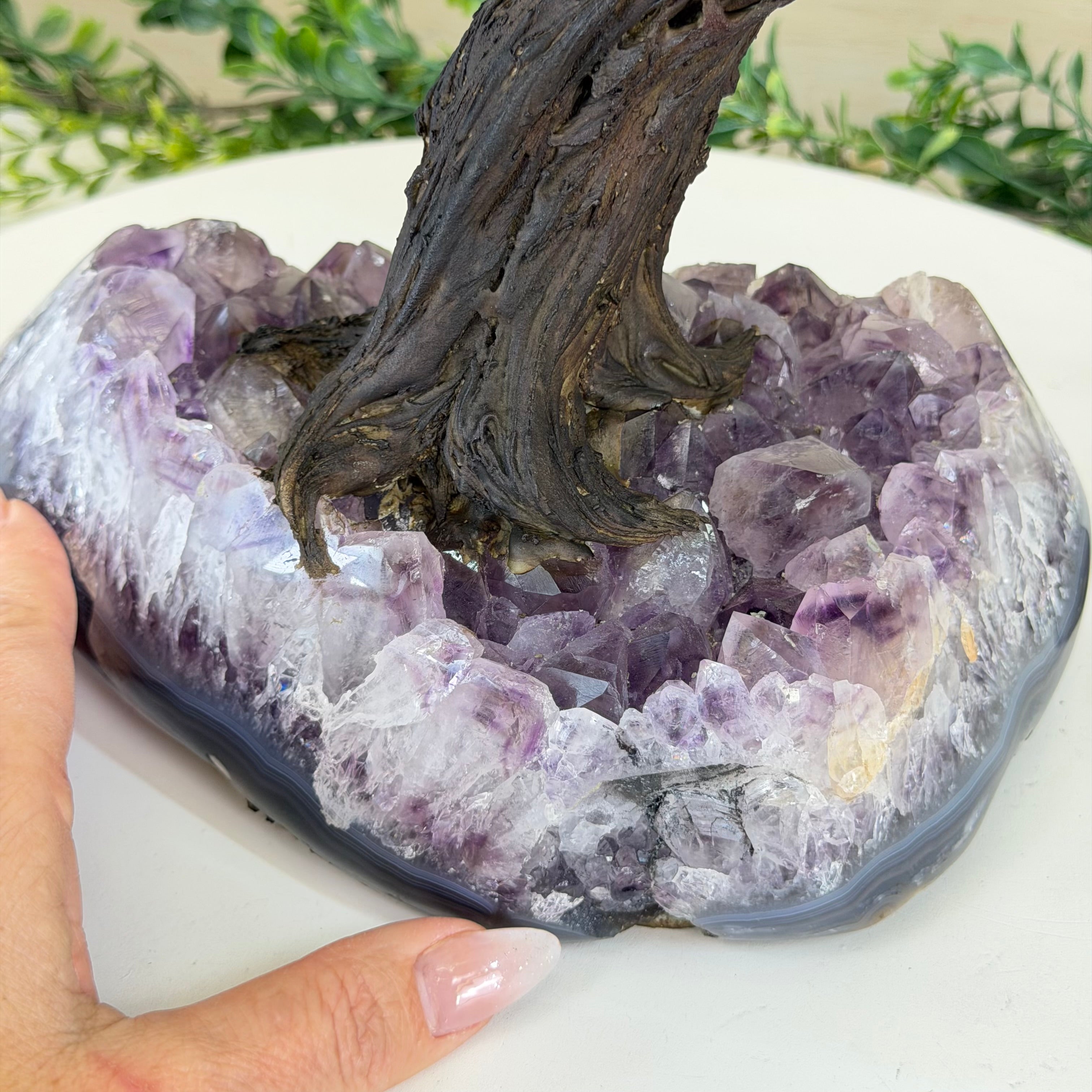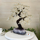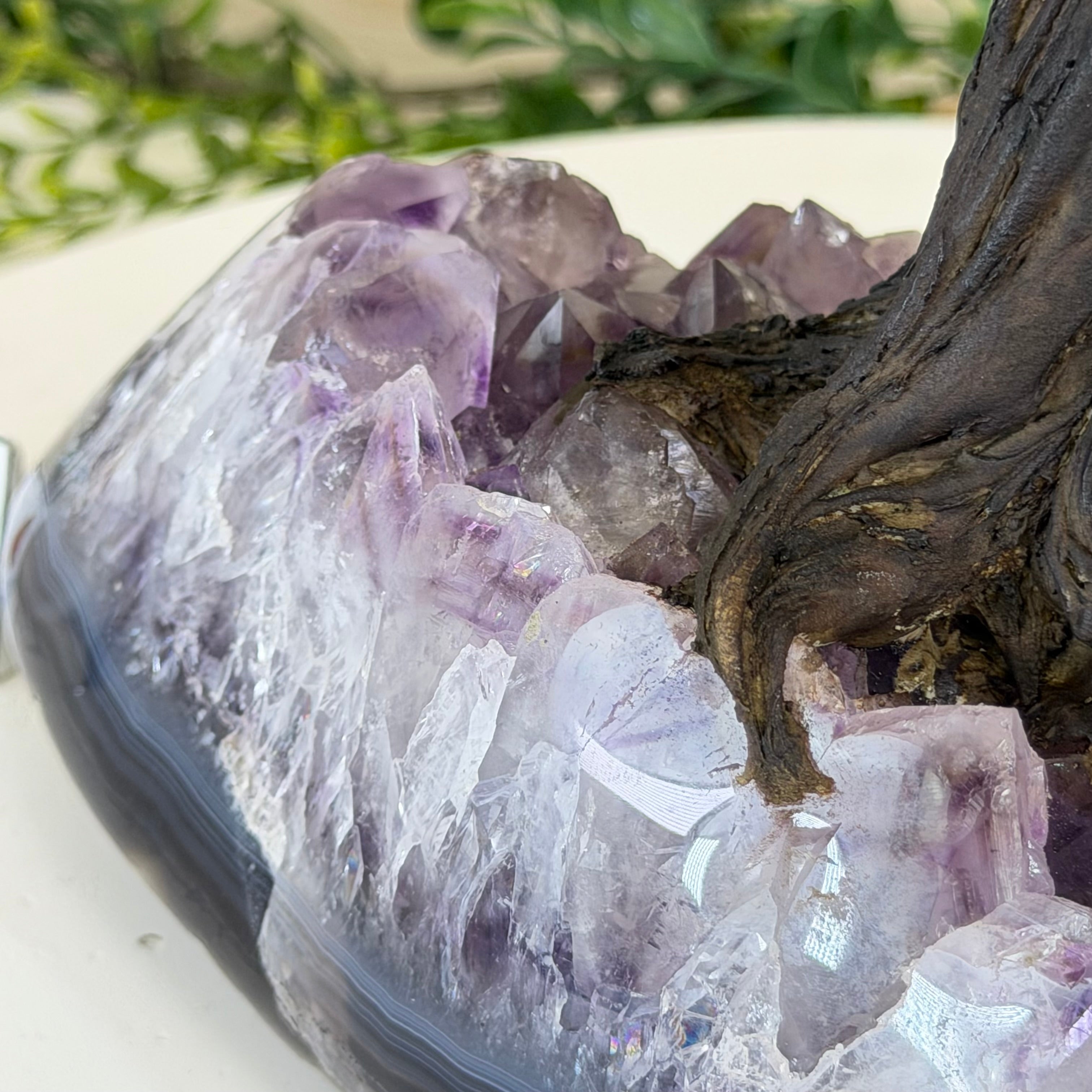 Special Clear Quartz Bonsai Gemstone Tree on a Polished Amethyst Cluster Base