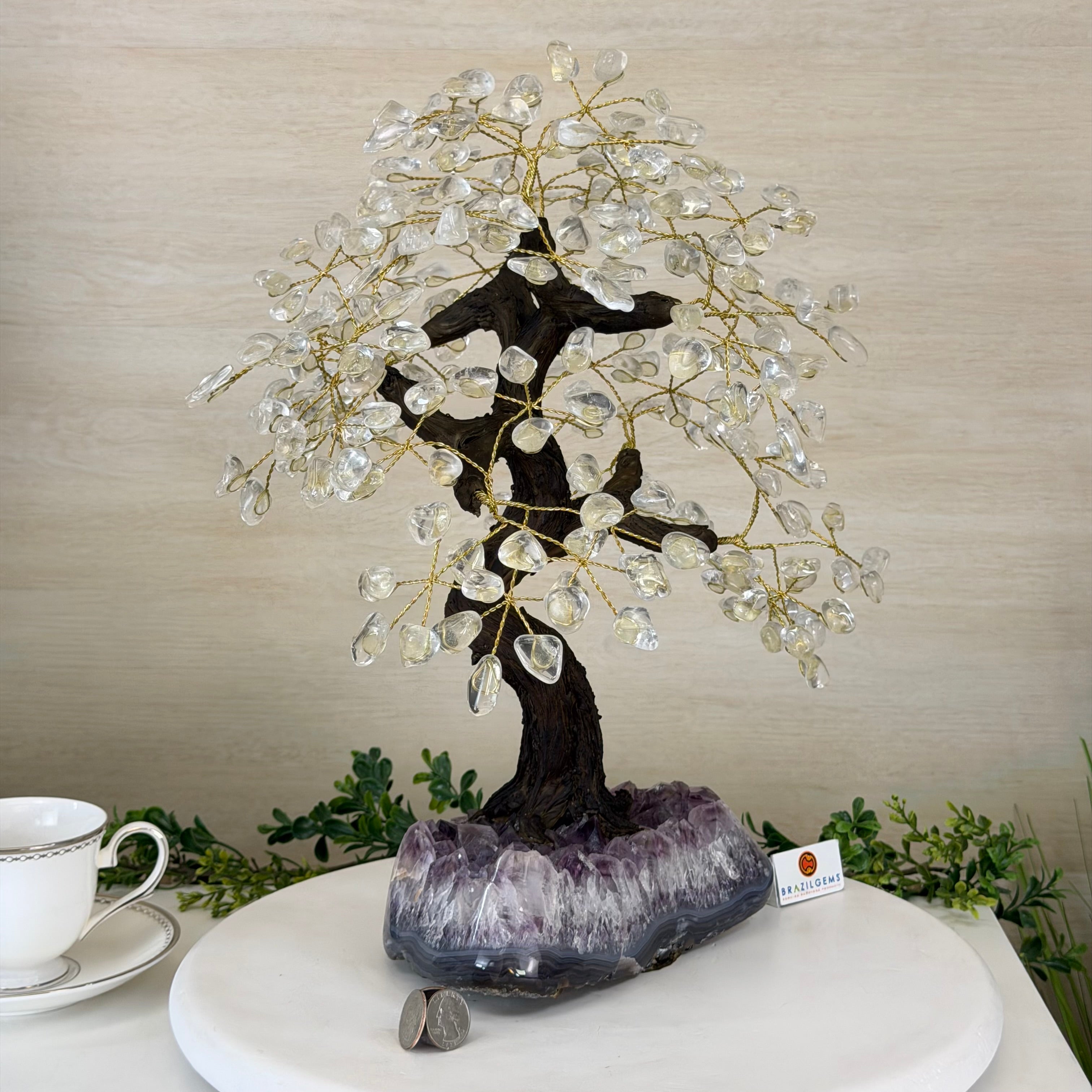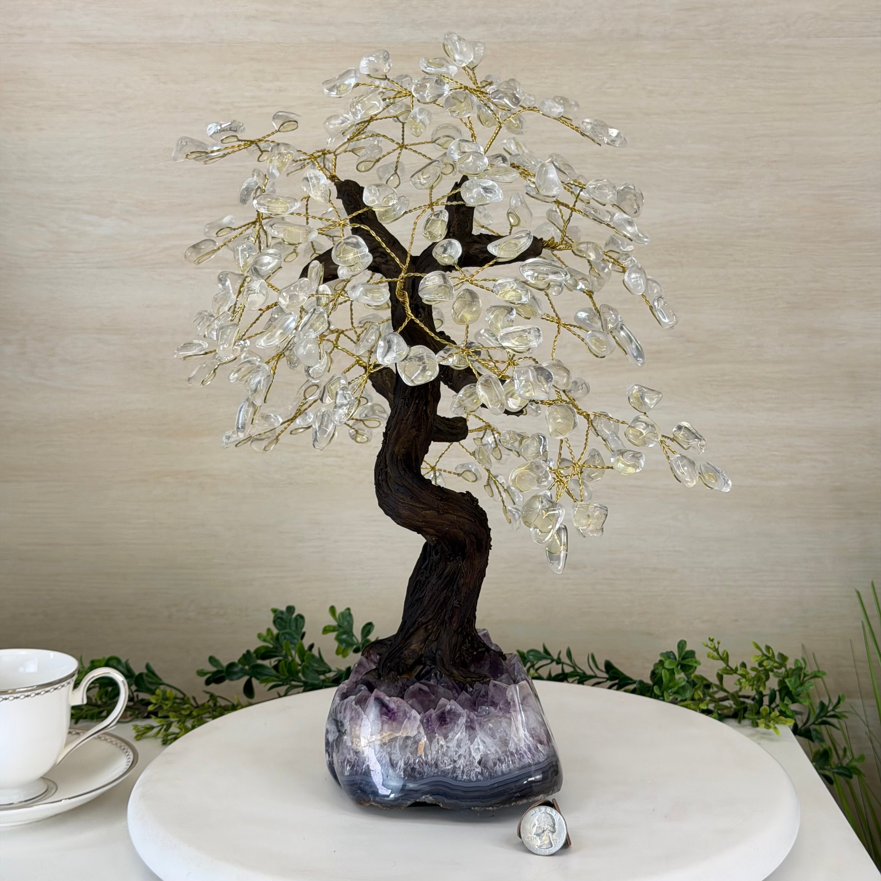 What makes this tree Special? Its polished Amethyst cluster base has smoothly polished edges and features crystals with a deeper purple color and clarity. Also, its Clear Quartz gemstone leaves have exceptional clarity, making it even more beautiful.