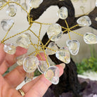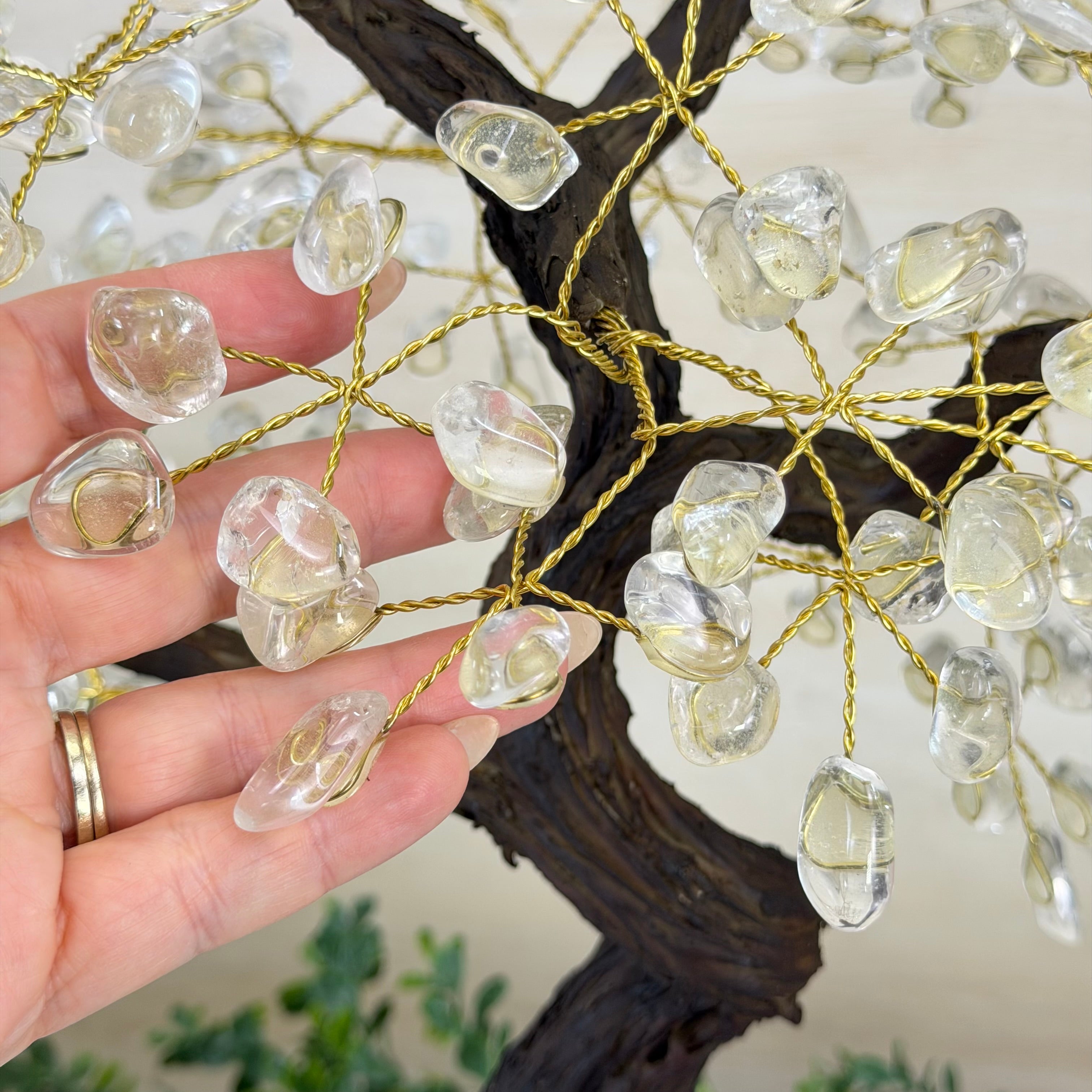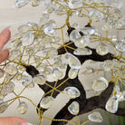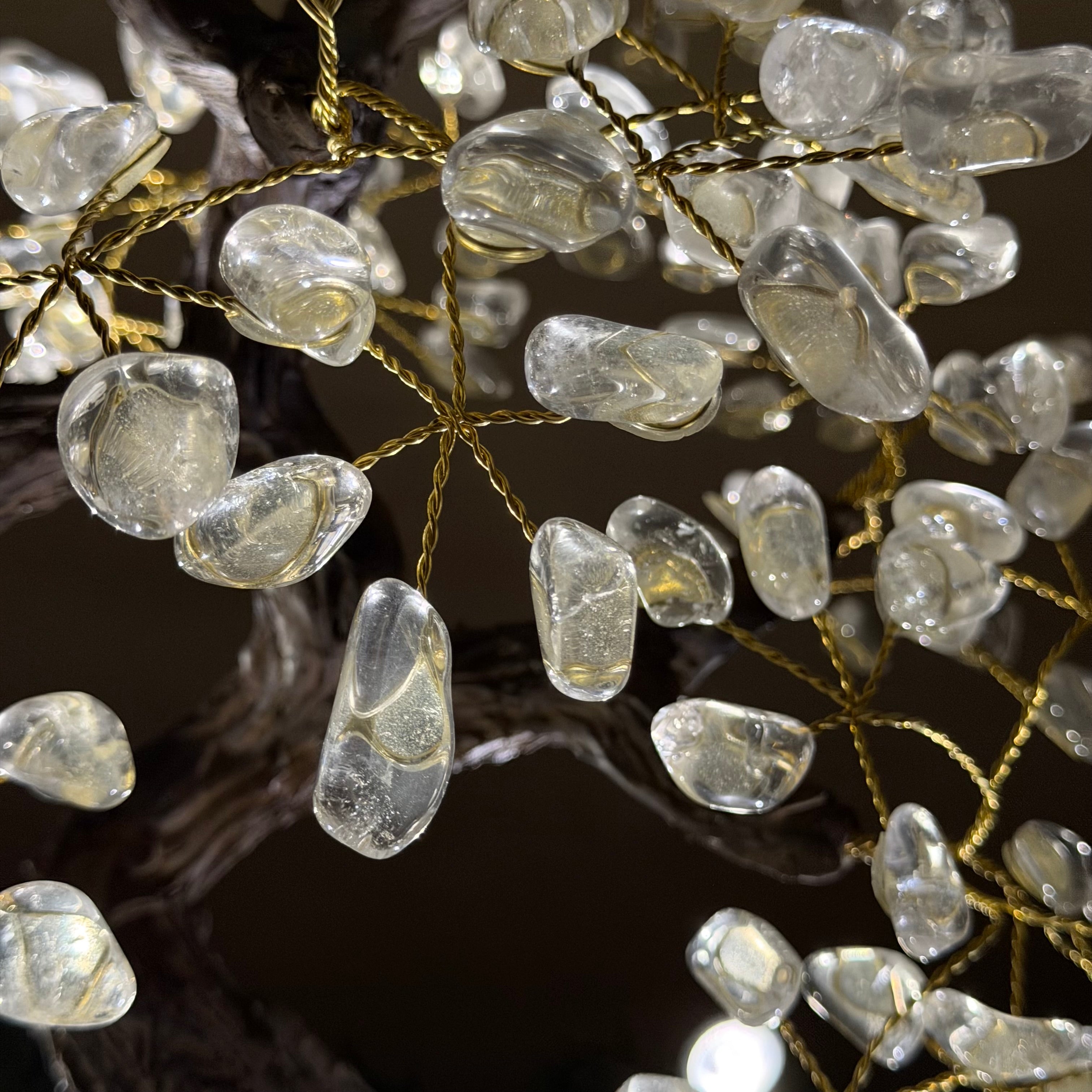 Handcrafted in Brazil, this striking gemstone tree stands approximately 16" tall and features a sturdy resin trunk adorned with 240 tumbled Clear Quartz gemstones as the leaves.