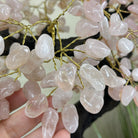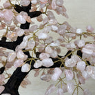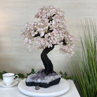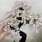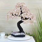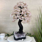 Nature and Artistry combine to create this Large Handmade Gemstone Tree with Rose Quartz Gemstones as leaves. Set atop a large Amethyst cluster base, it has a masterfully detailed trunk and branches crafted from resin in a bonsai tree style and 108 wired branches supporting 540 tumbled gemstones.