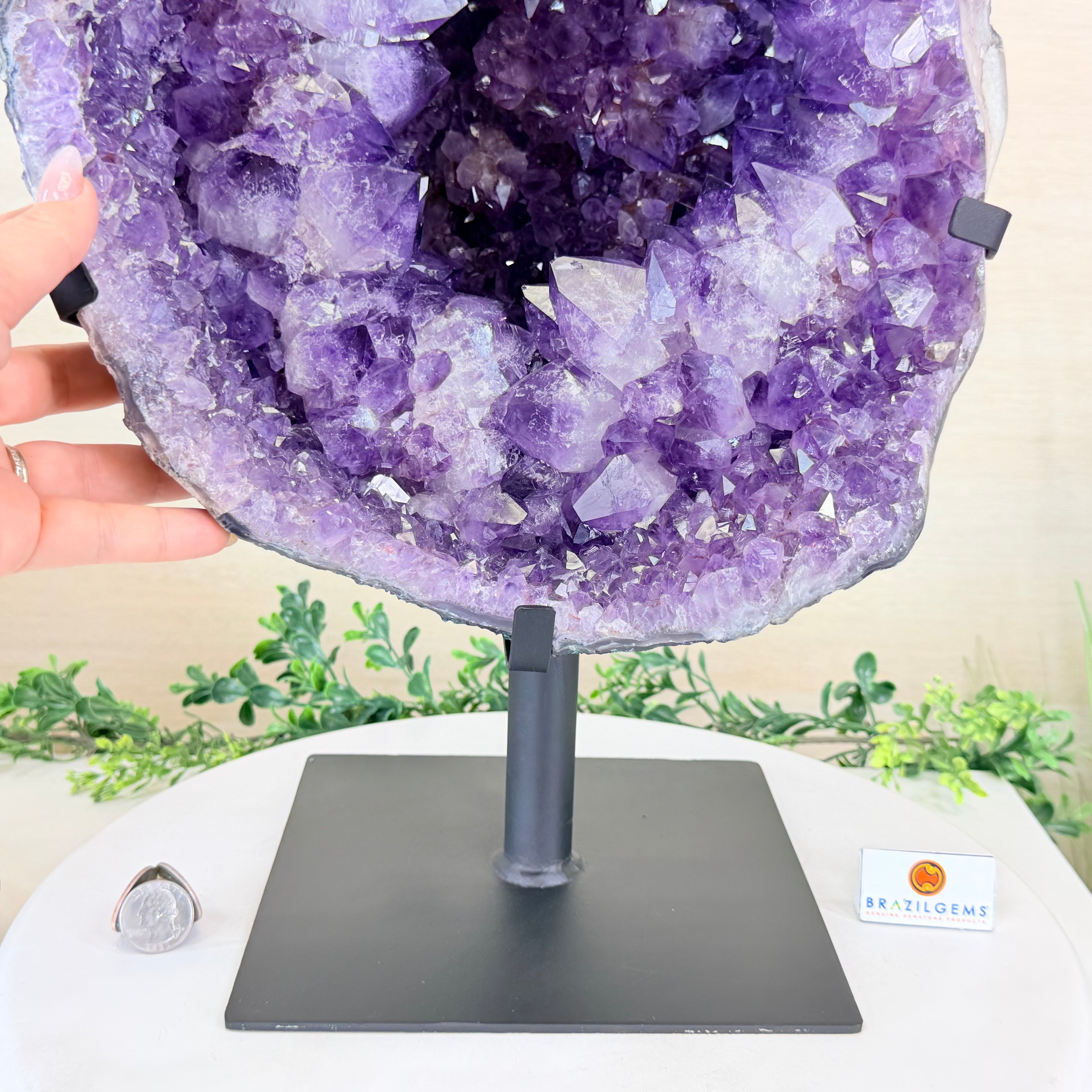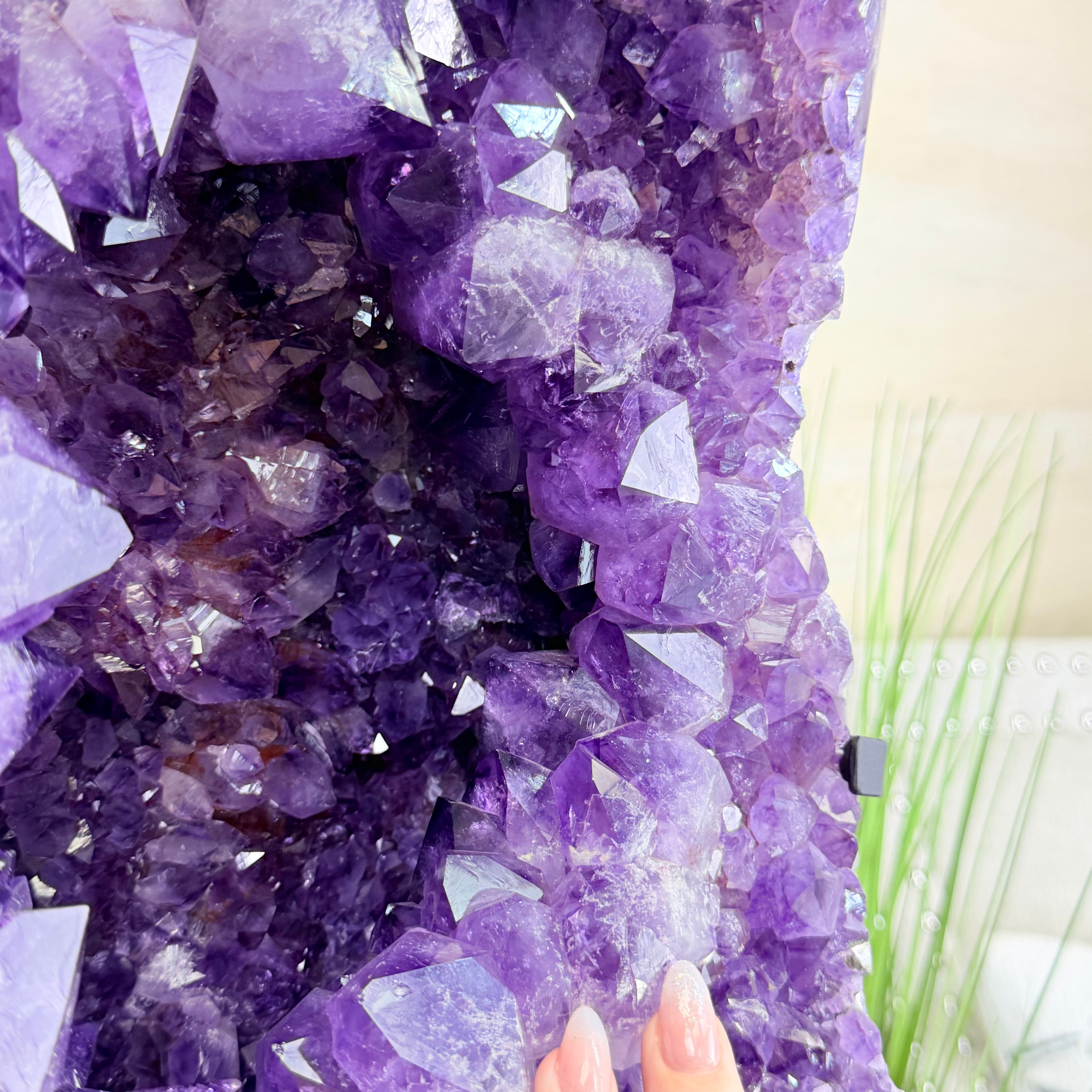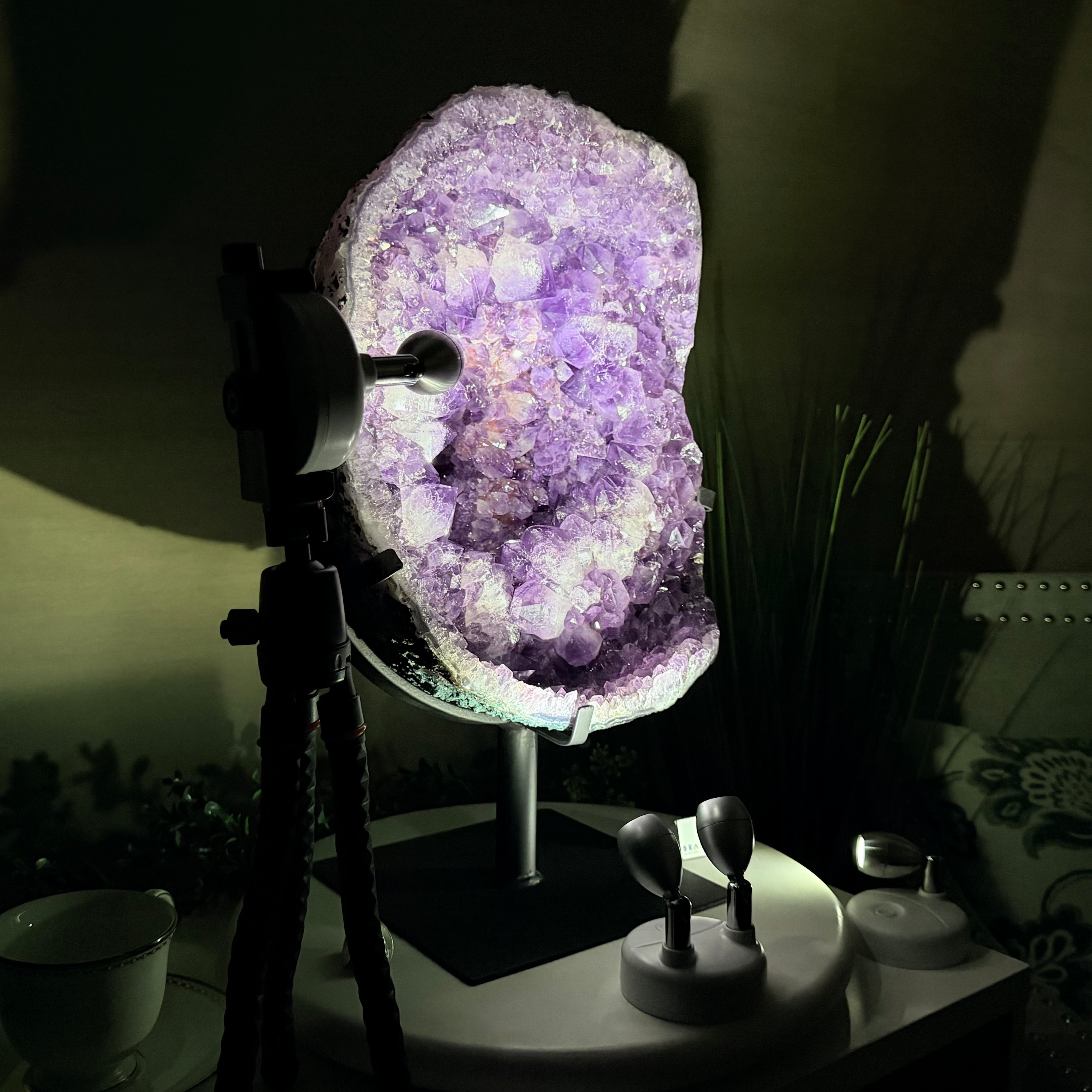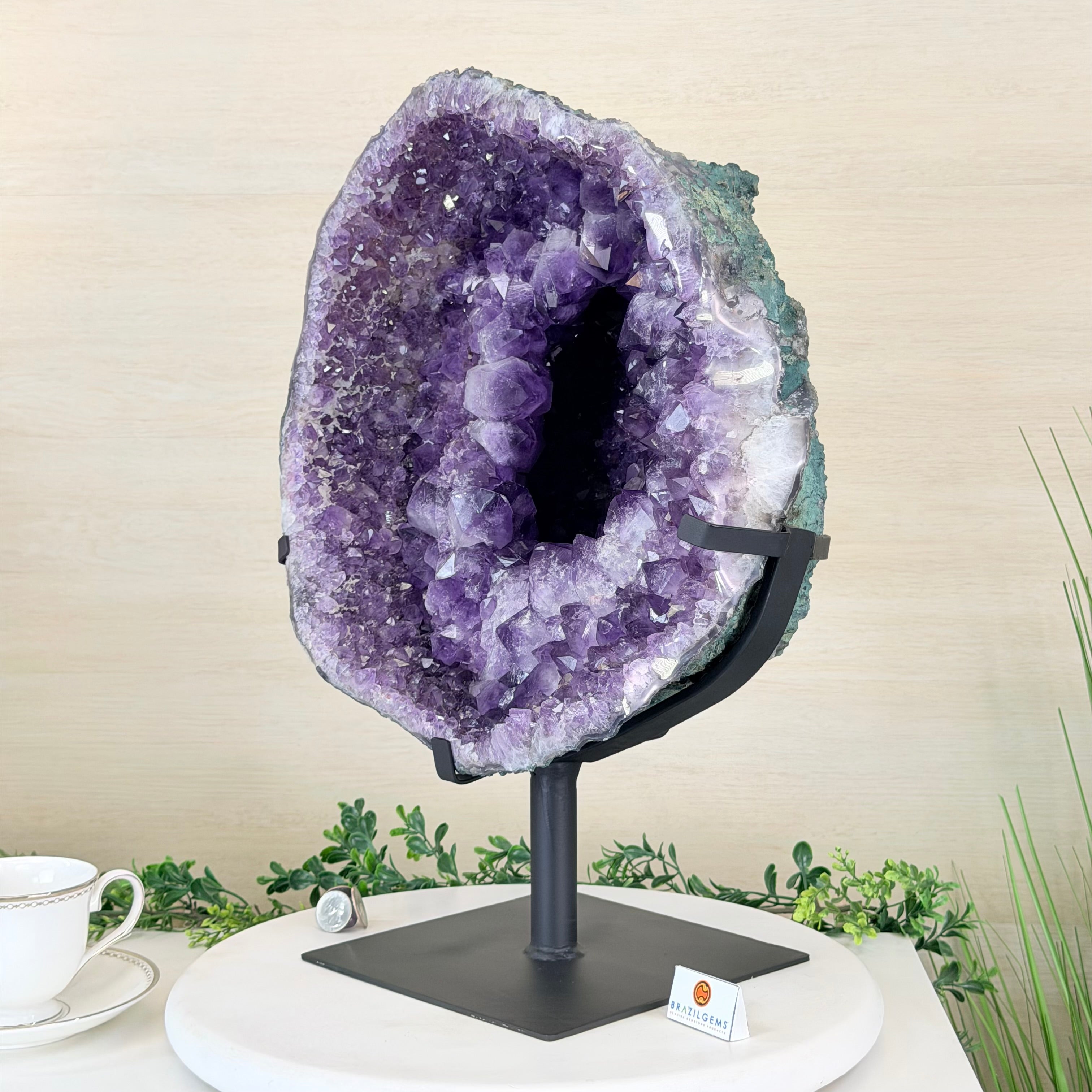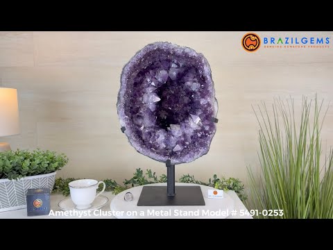 Infuse your room with the natural elegance of this Extra Plus Quality Natural Brazilian Amethyst Cluster on a black metal stand from Brazil Gems®. This gemstone has deep purple amethyst points with a deep chamber hiding large crystals points inside. It is polished in the front with a natural rough outer shell.