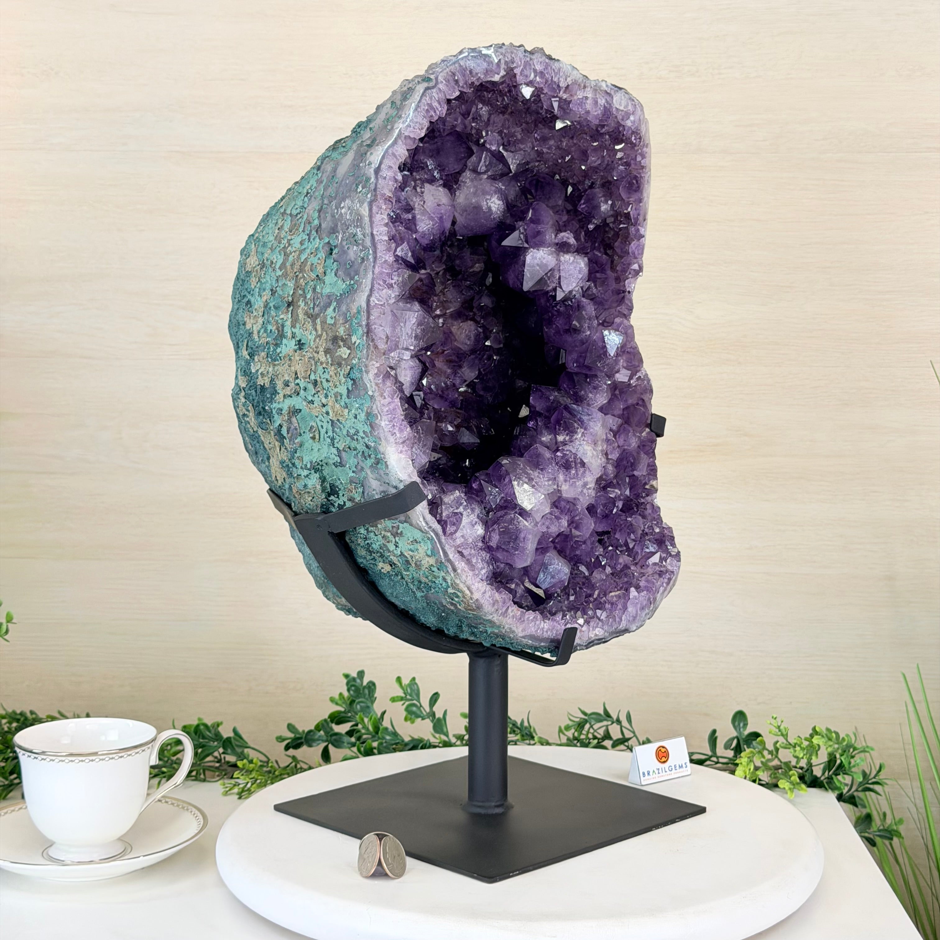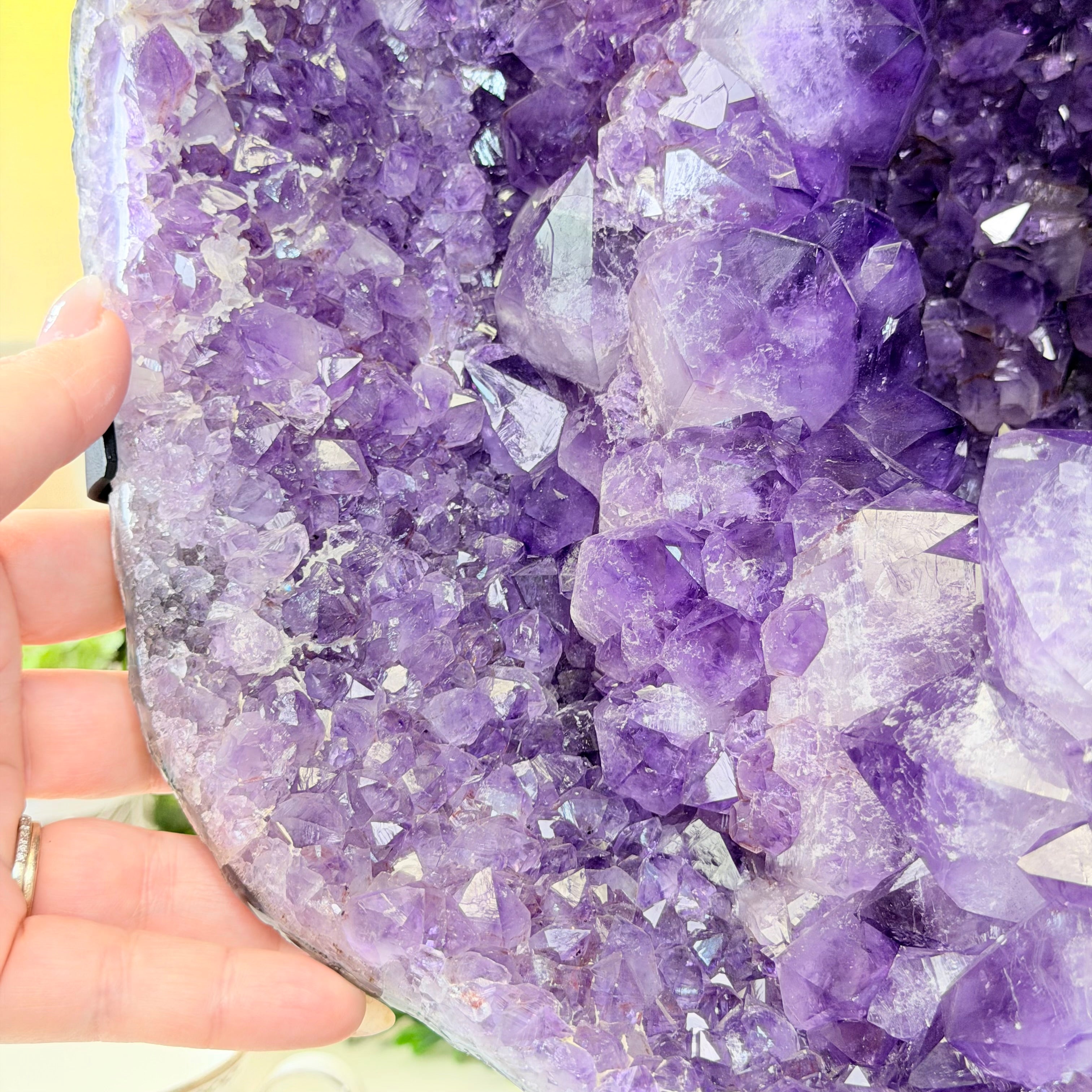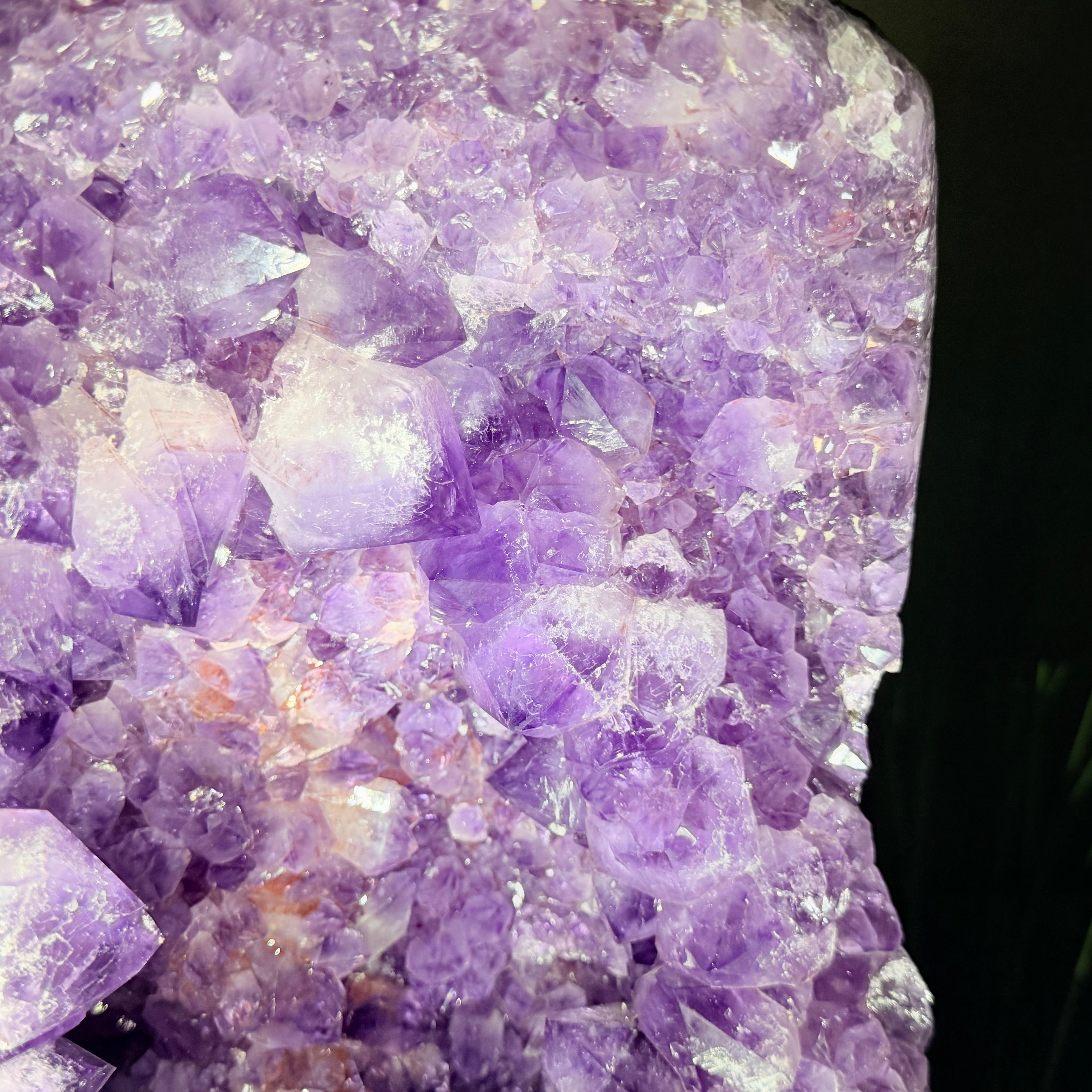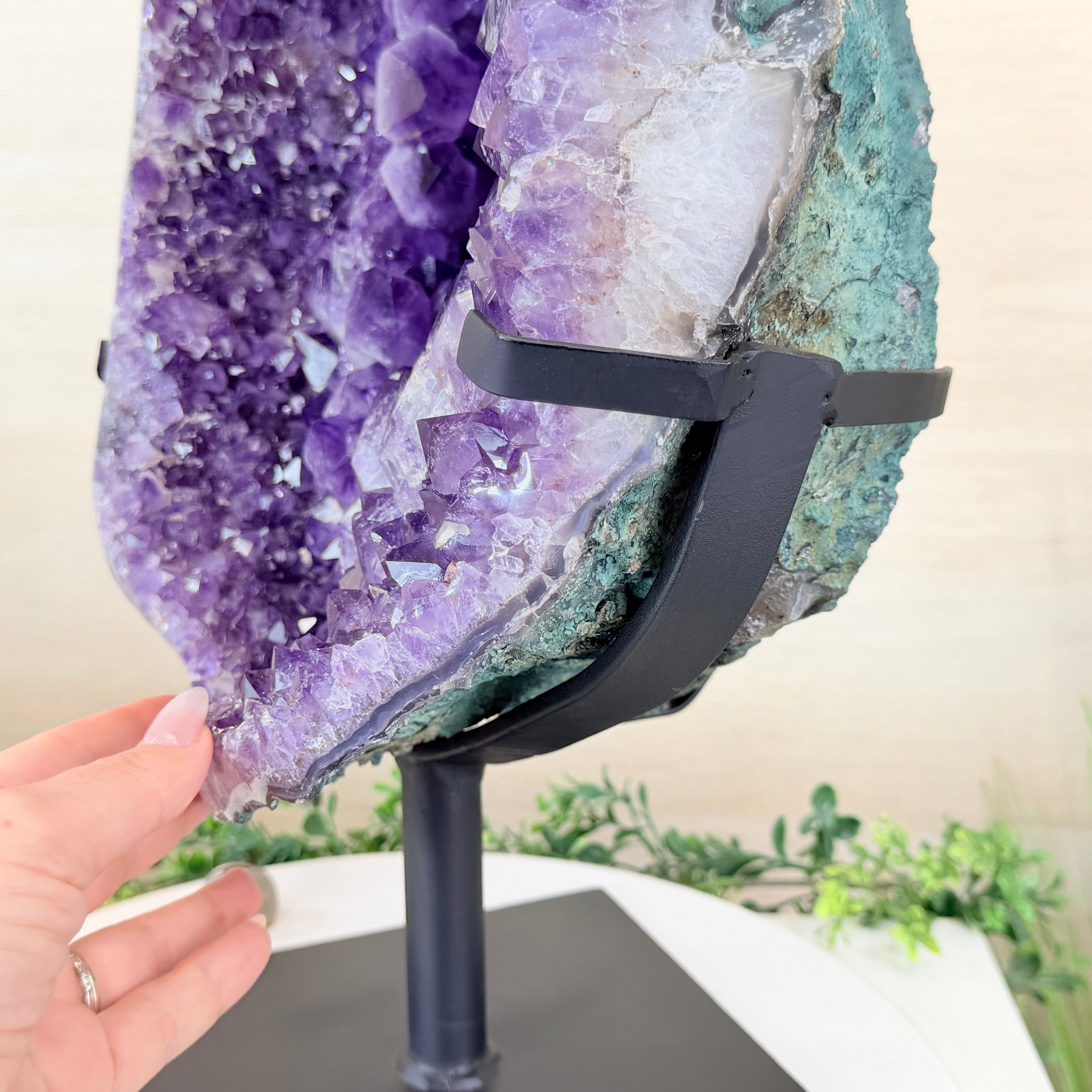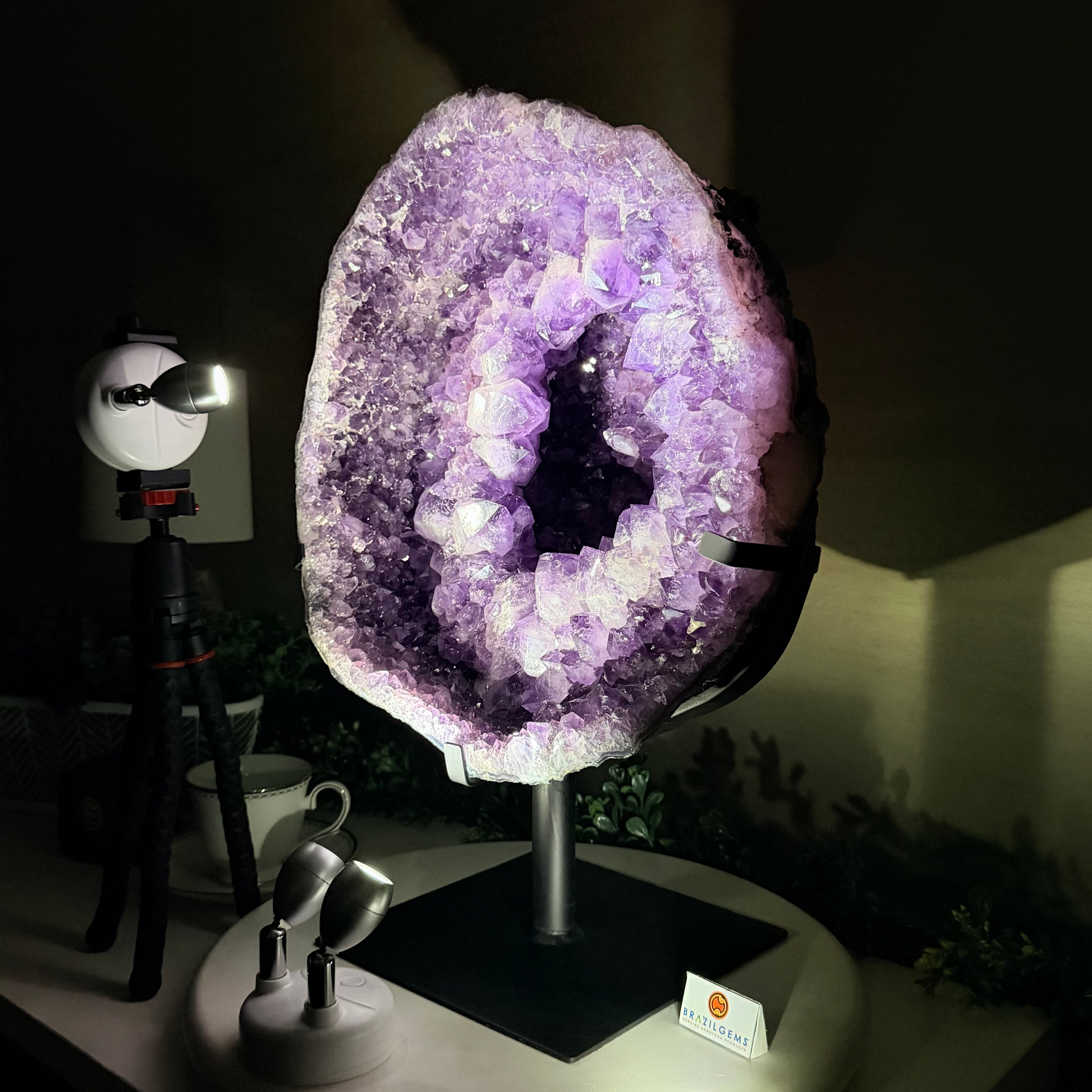 Infuse your room with the natural elegance of this Extra Plus Quality Natural Brazilian Amethyst Cluster on a black metal stand from Brazil Gems®. This gemstone has deep purple amethyst points with a deep chamber hiding large crystals points inside. It is polished in the front with a natural rough outer shell.