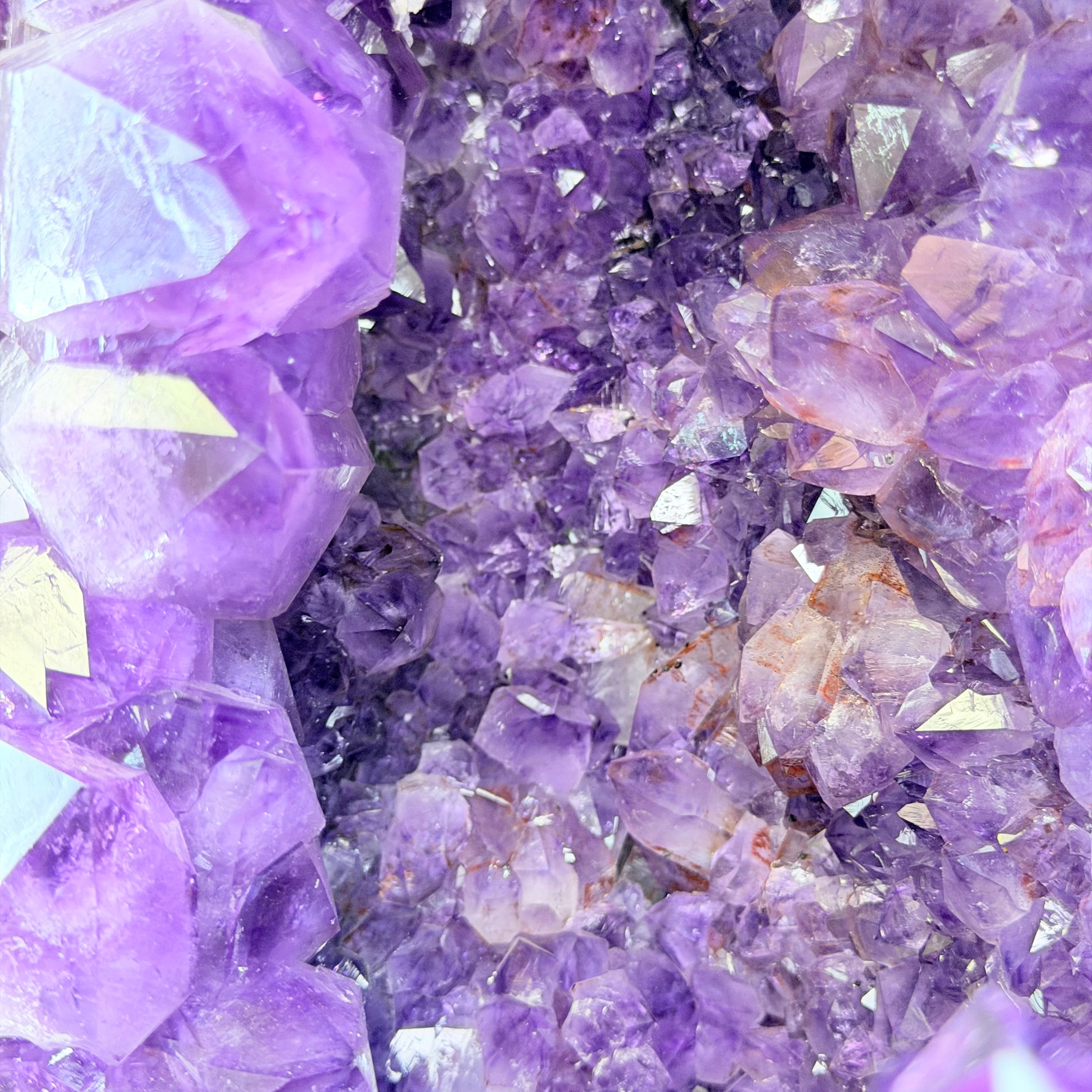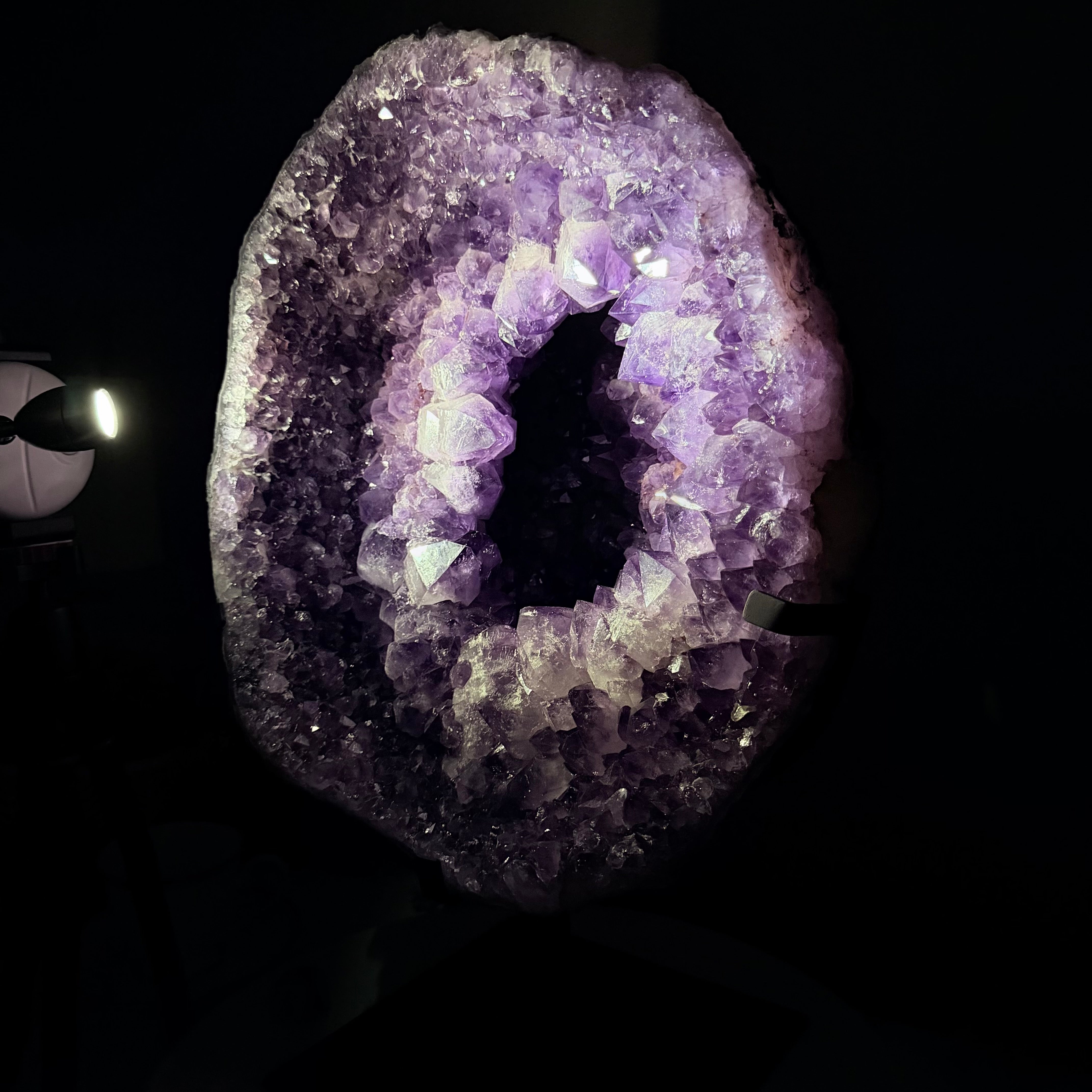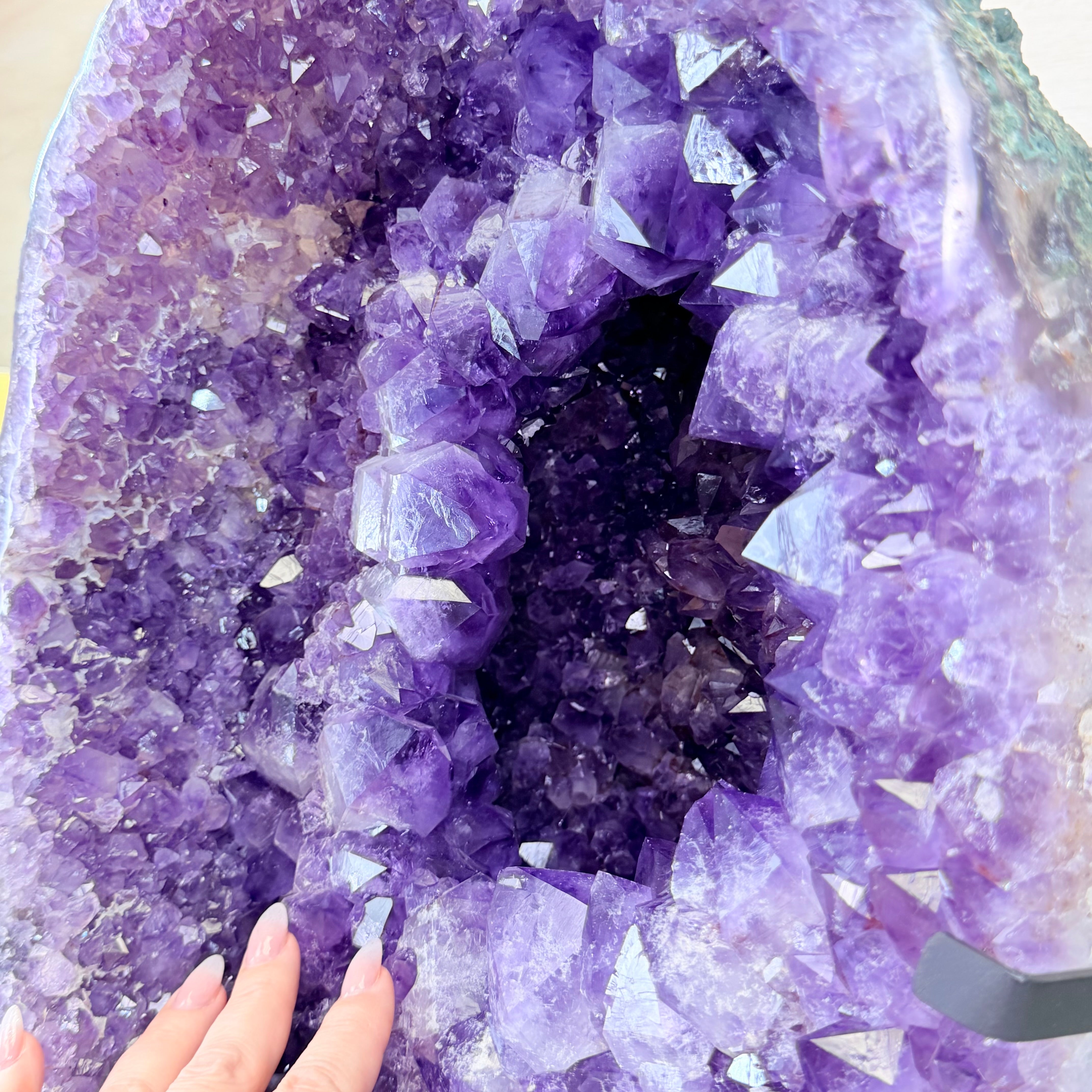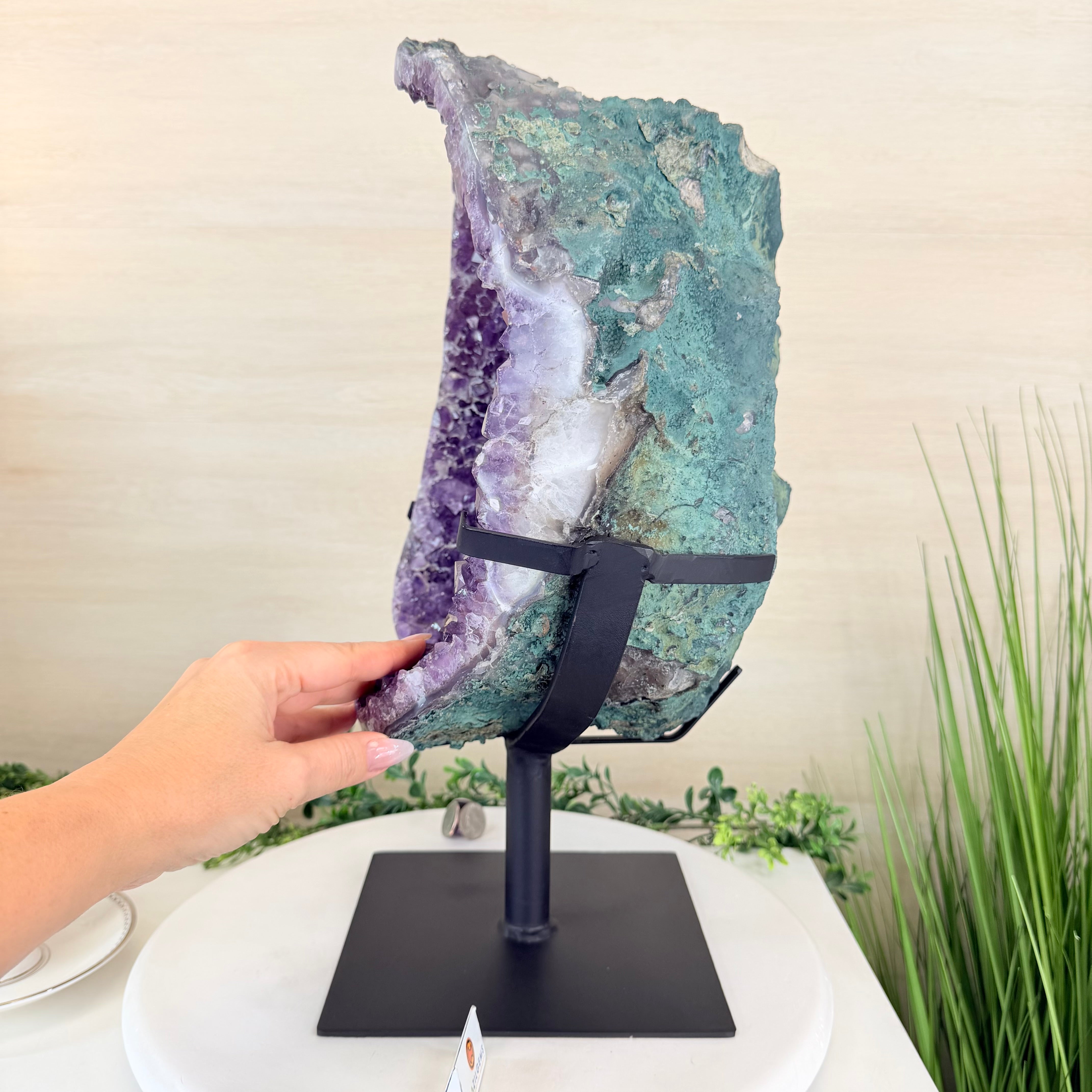 Infuse your room with the natural elegance of this Extra Plus Quality Natural Brazilian Amethyst Cluster on a black metal stand from Brazil Gems®. This gemstone has deep purple amethyst points with a deep chamber hiding large crystals points inside. It is polished in the front with a natural rough outer shell.
