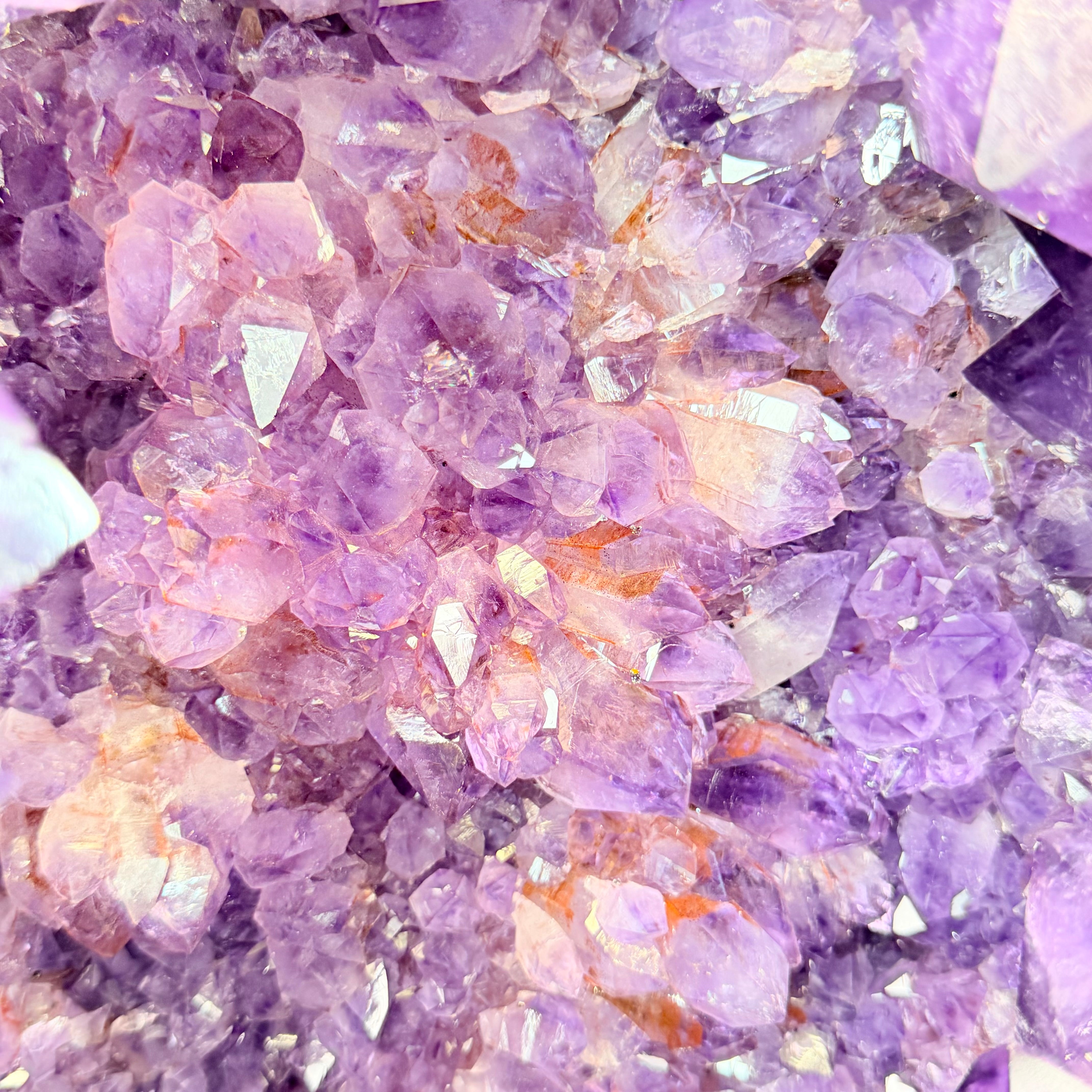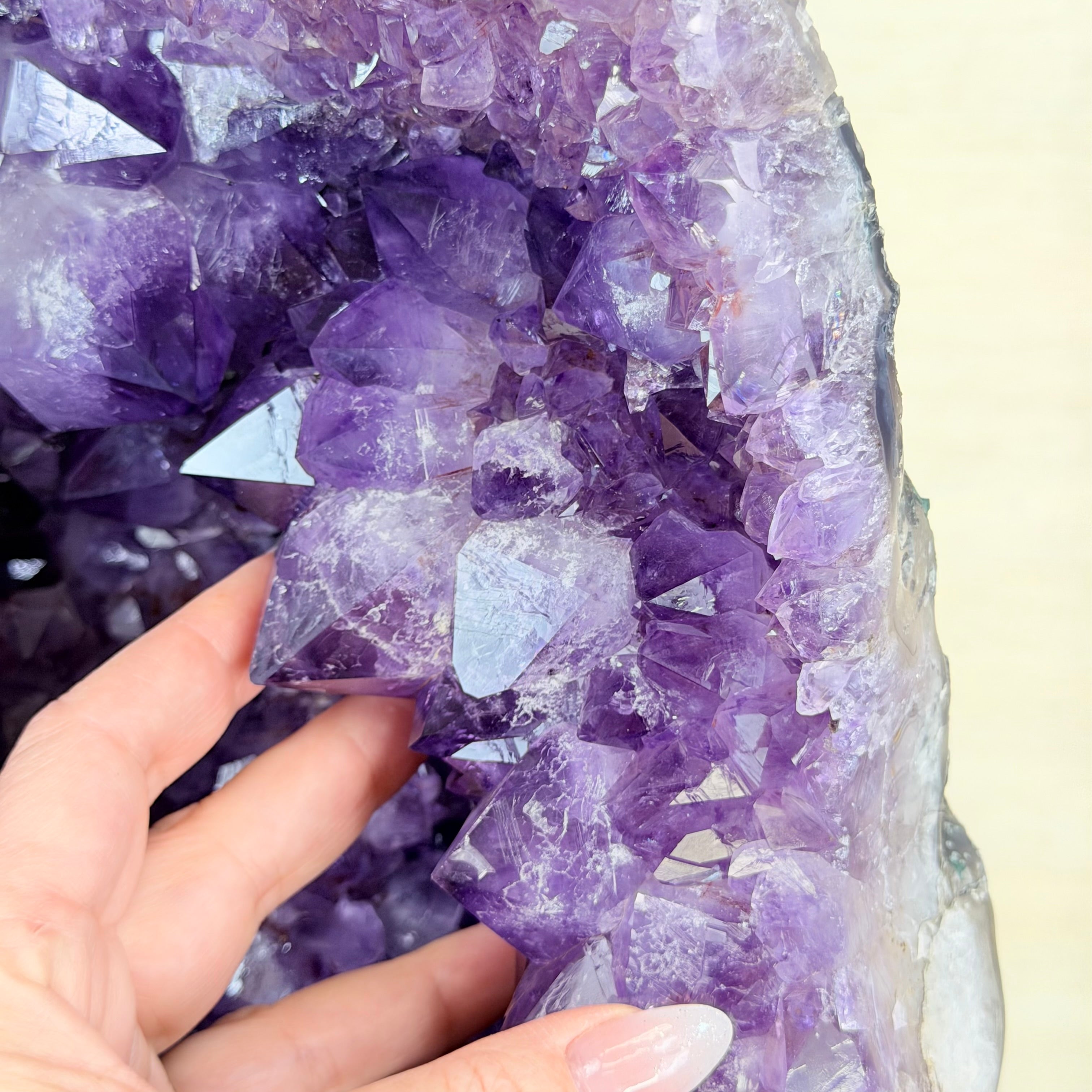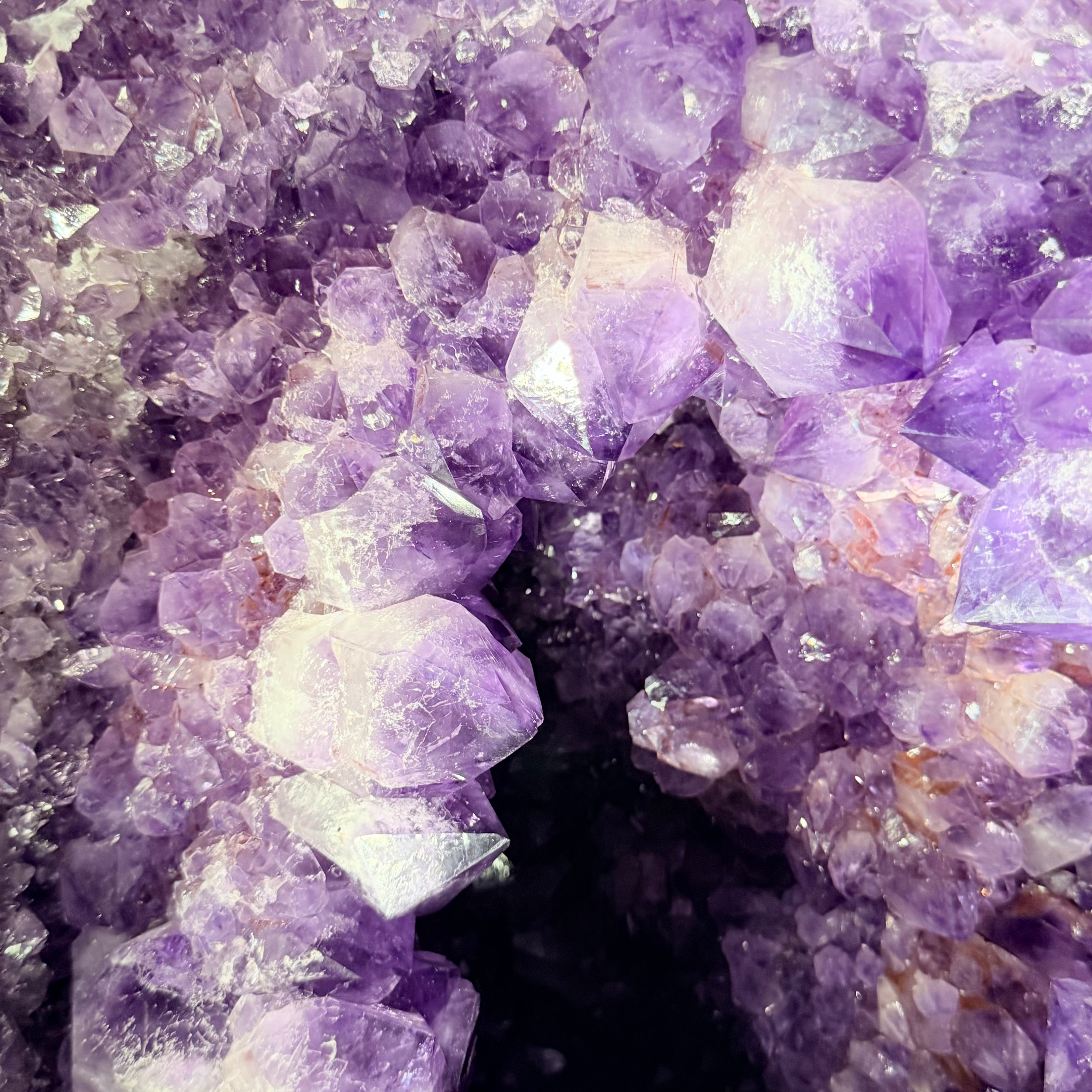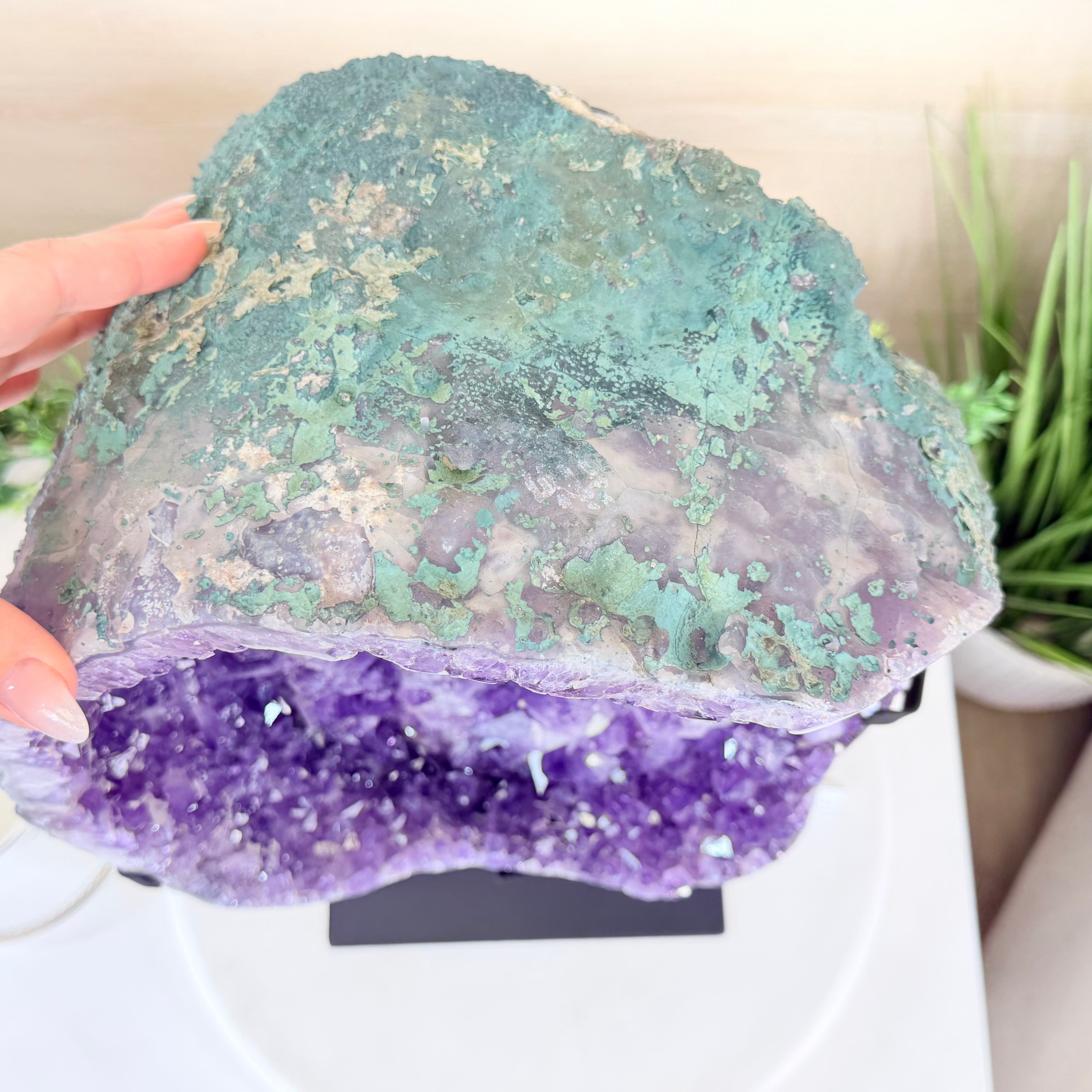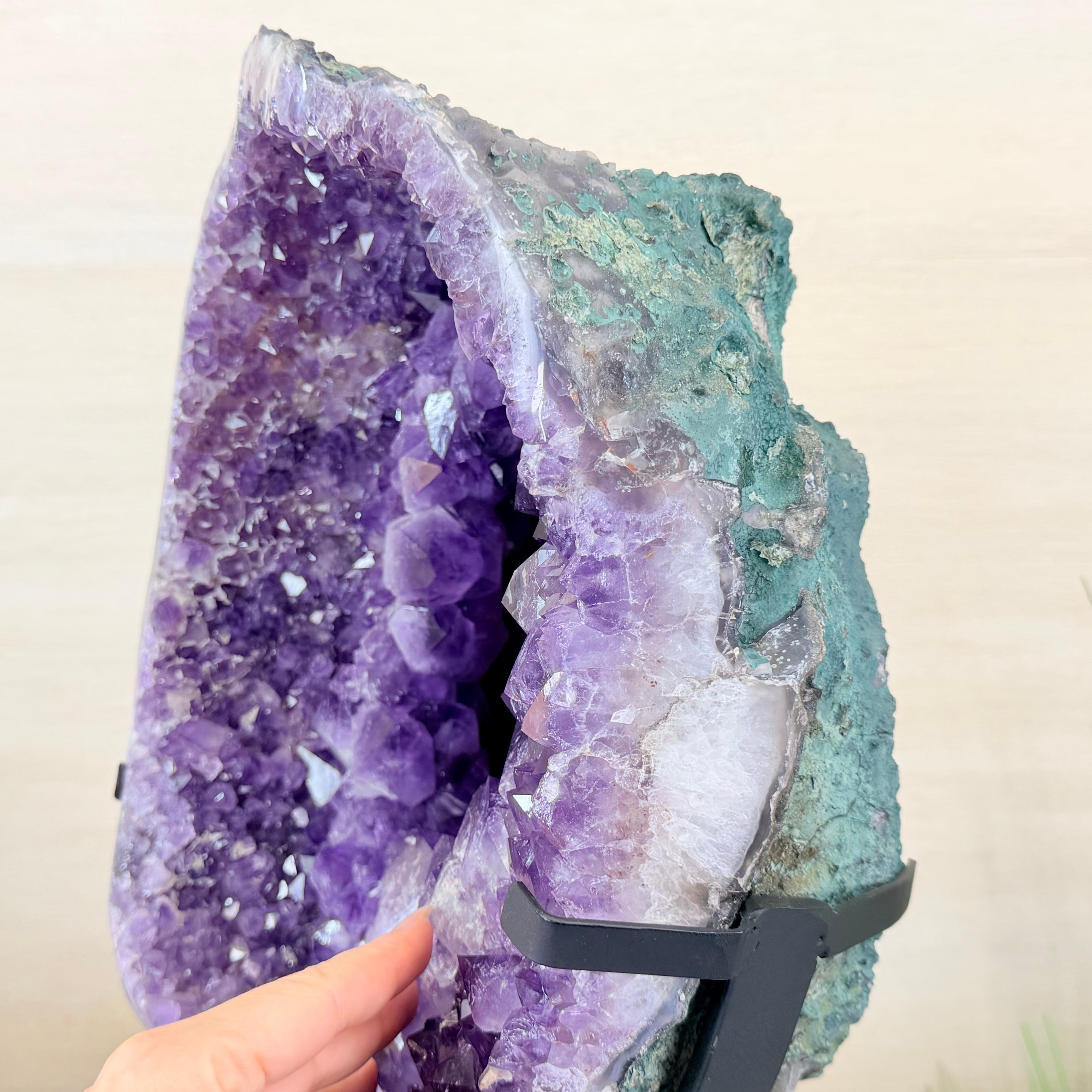 Infuse your room with the natural elegance of this Extra Plus Quality Natural Brazilian Amethyst Cluster on a black metal stand from Brazil Gems®. This gemstone has deep purple amethyst points with a deep chamber hiding large crystals points inside. It is polished in the front with a natural rough outer shell.