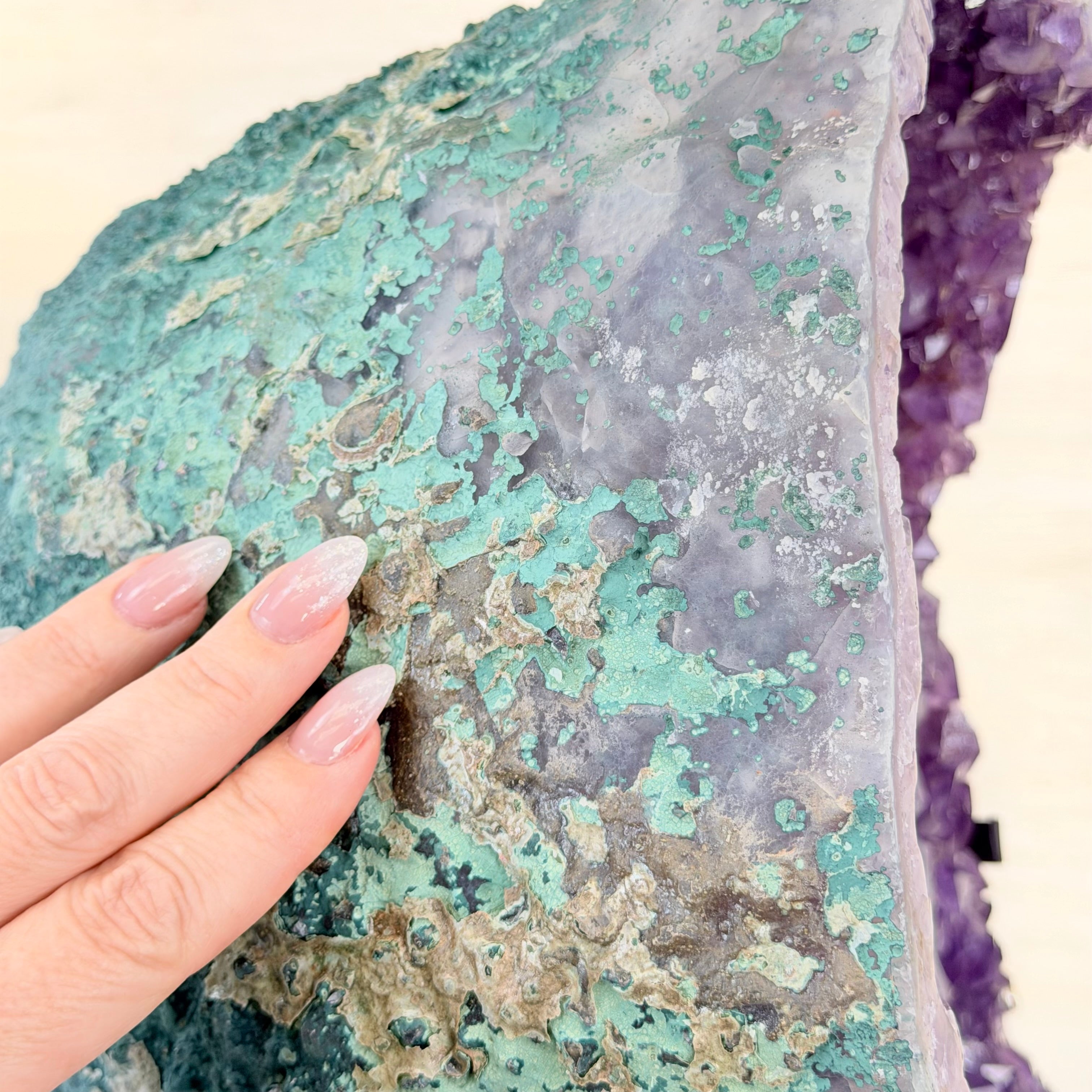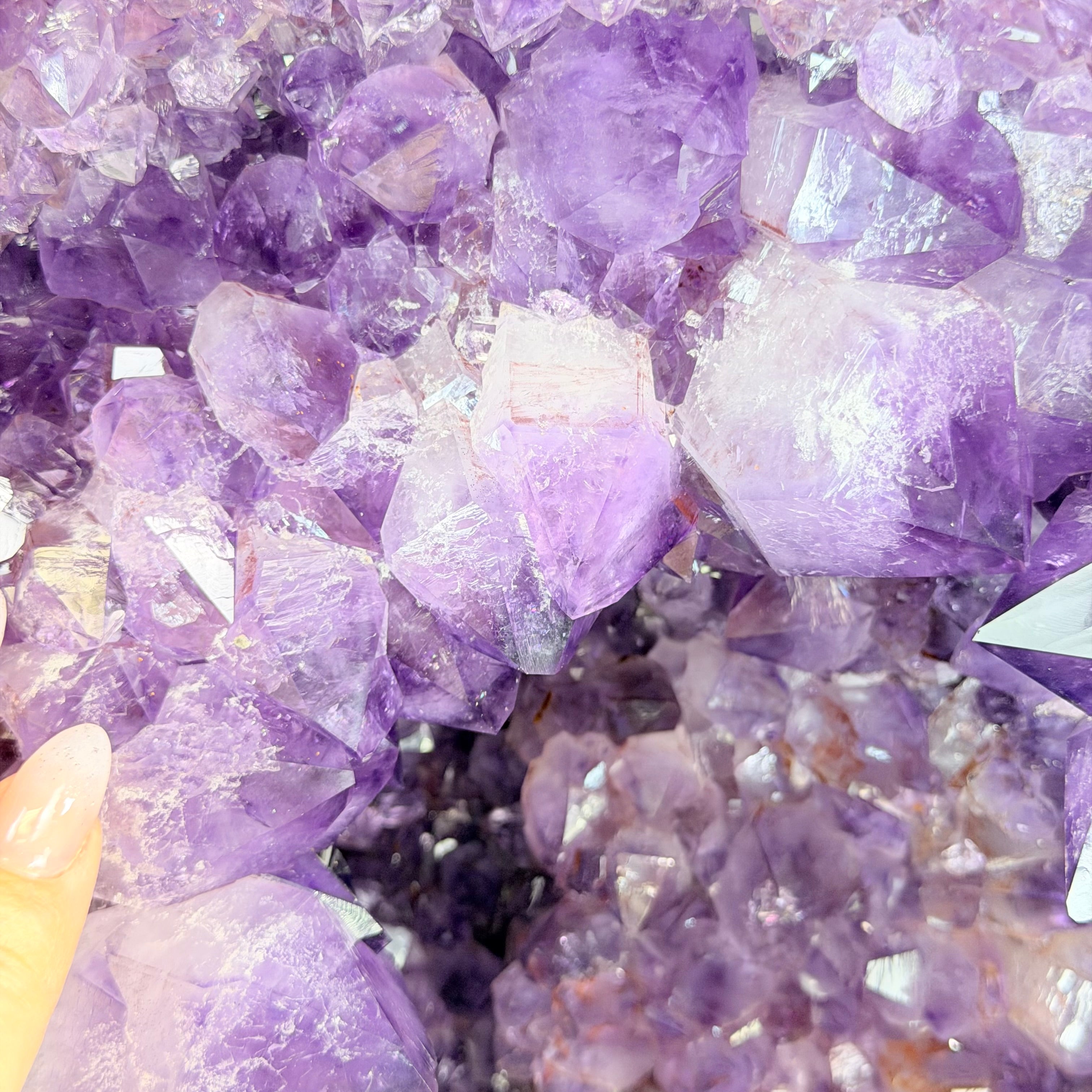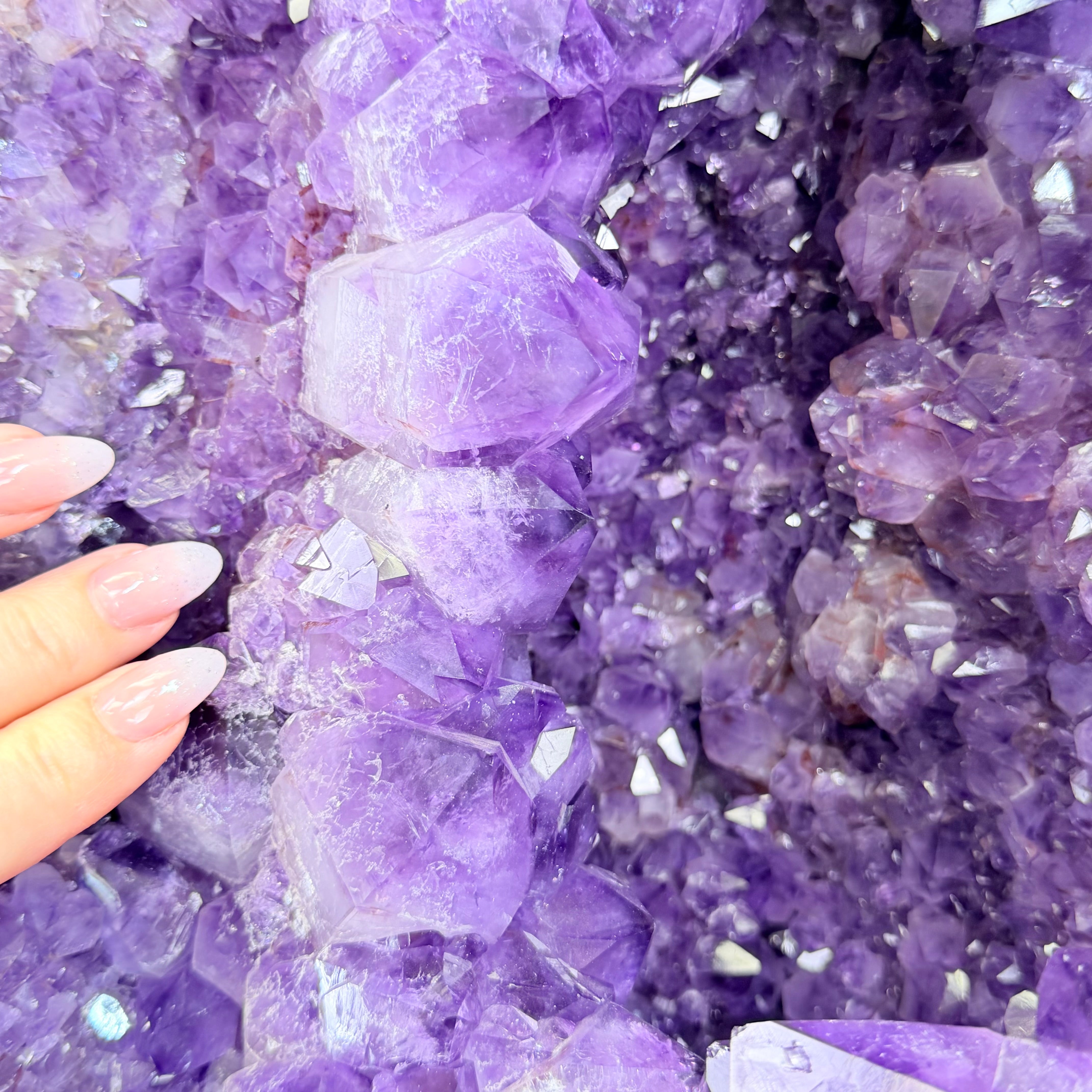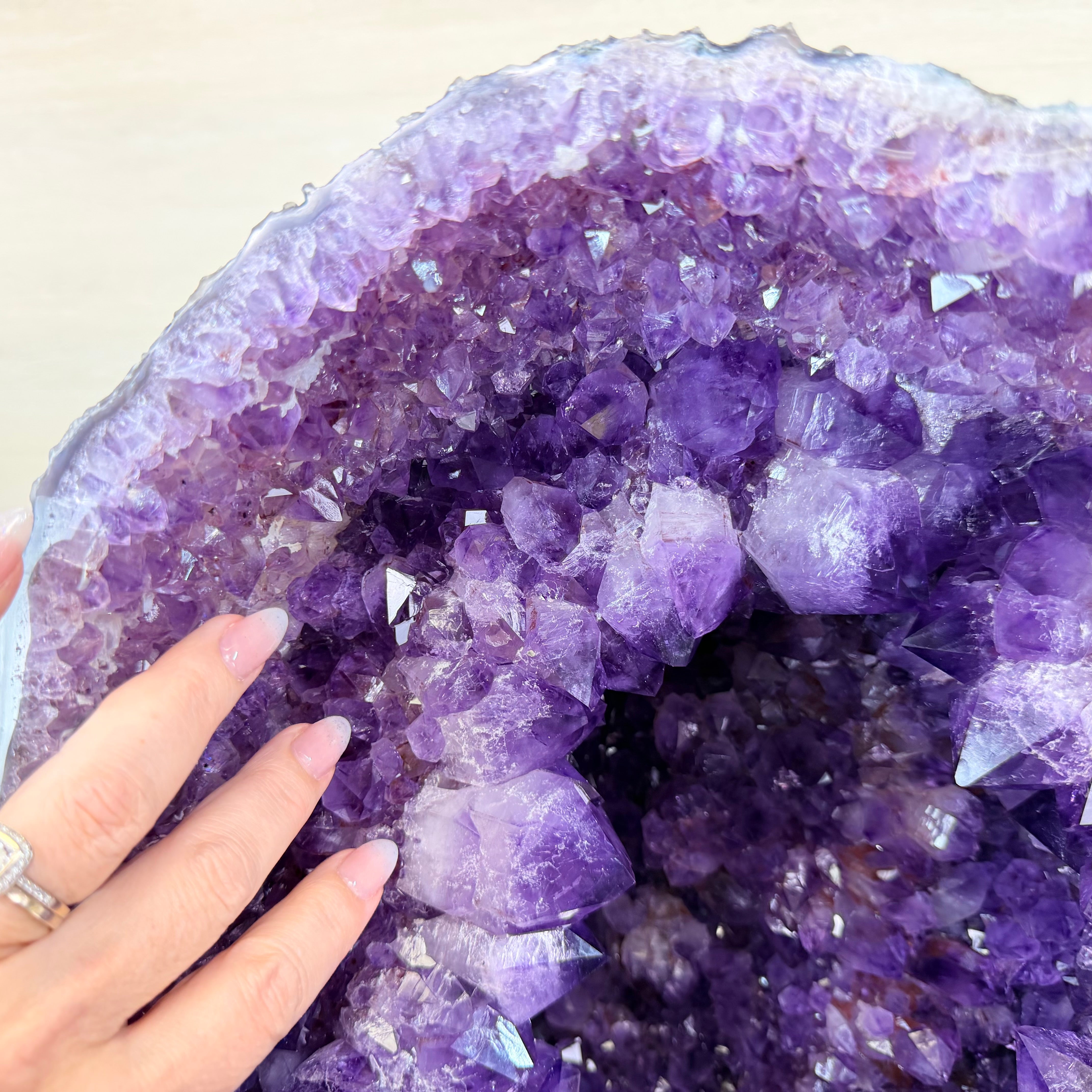 Infuse your room with the natural elegance of this Extra Plus Quality Natural Brazilian Amethyst Cluster on a black metal stand from Brazil Gems®. This gemstone has deep purple amethyst points with a deep chamber hiding large crystals points inside. It is polished in the front with a natural rough outer shell.