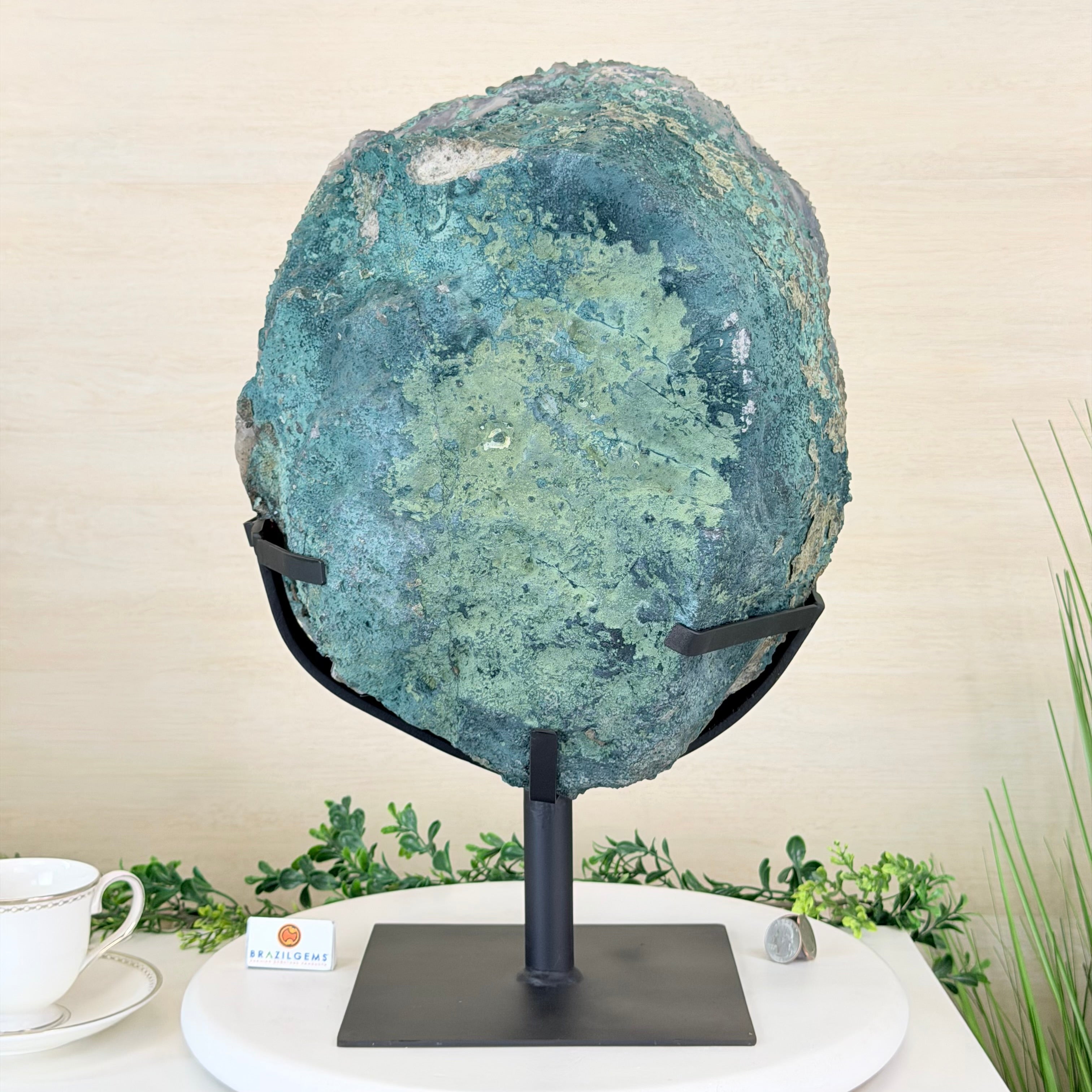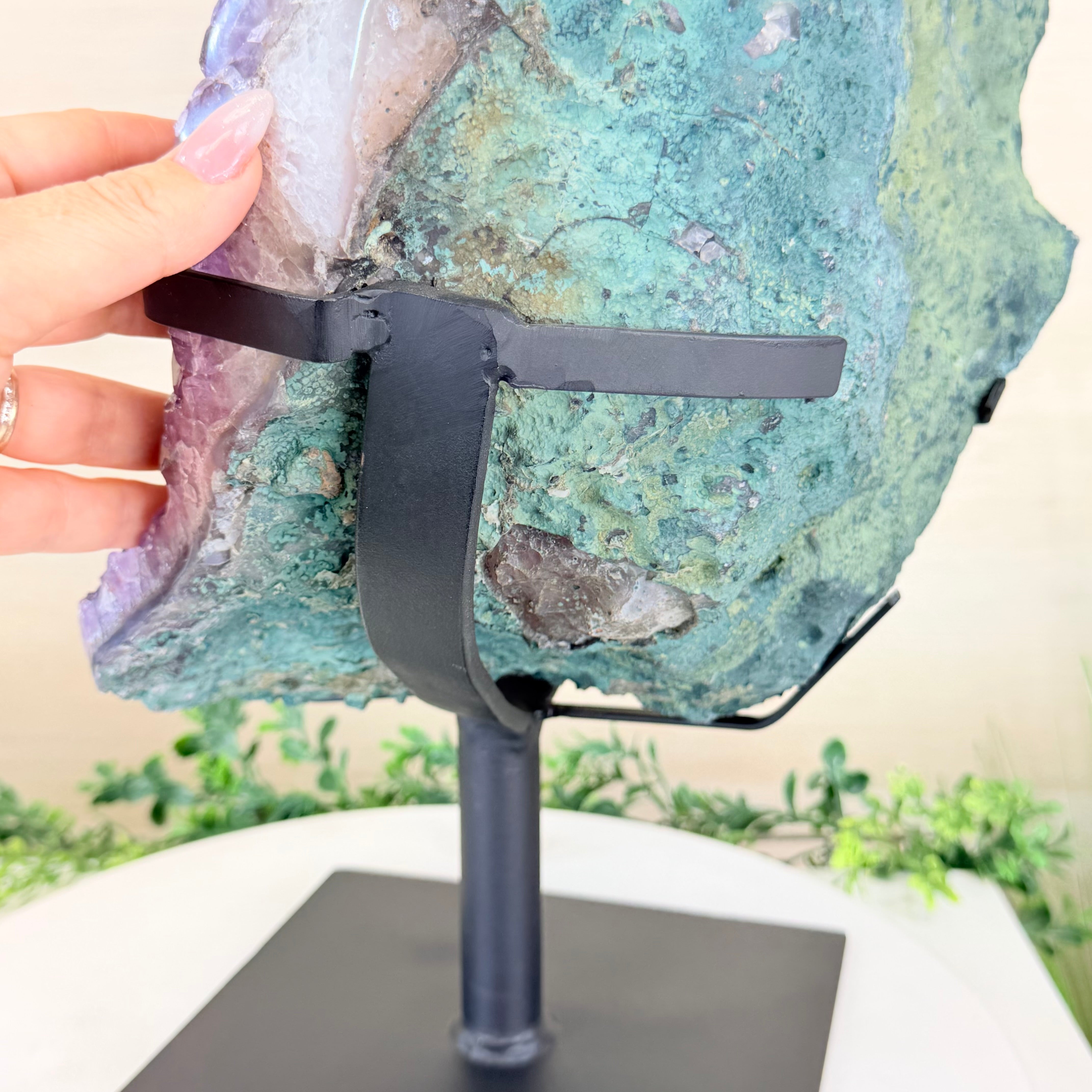 Disclaimer: This is a natural gemstone crystal sold by Brazil Gems® as is and as you see it in its images and video. It is the exact piece you will receive. It may contain natural imperfections as well as imperfections, repairs, scratches and/or broken edges from the extraction, polishing, mounting and prepping processes. The metal stand has been hand welded to fit this exact piece and then painted black. The crystal piece can be removed from its metal stand. At Brazil Gems®, we make every effort to get measurements as exact as possible but they are done by human hands and eyes and therefore may have minor discrepancies.
