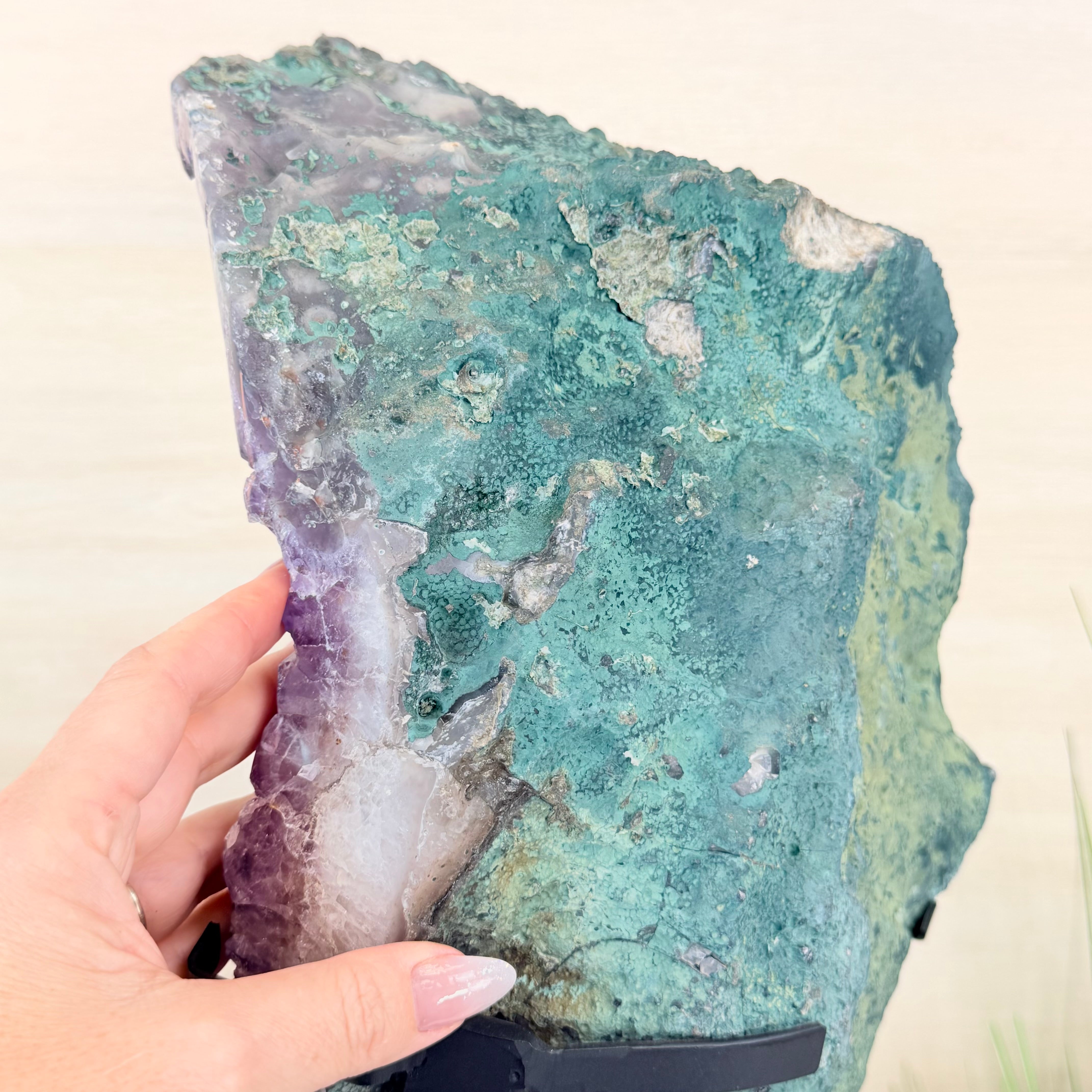 This is a natural gemstone crystal sold by Brazil Gems® as is and as you see it in its images and video. It is the exact piece you will receive. It may contain natural imperfections as well as imperfections, repairs, scratches and/or broken edges from the extraction, polishing, mounting and prepping processes. The metal stand has been hand welded to fit this exact piece and then painted black. The crystal piece can be removed from its metal stand. At Brazil Gems®, we make every effort to get measurements as exact as possible but they are done by human hands and eyes and therefore may have minor discrepancies.