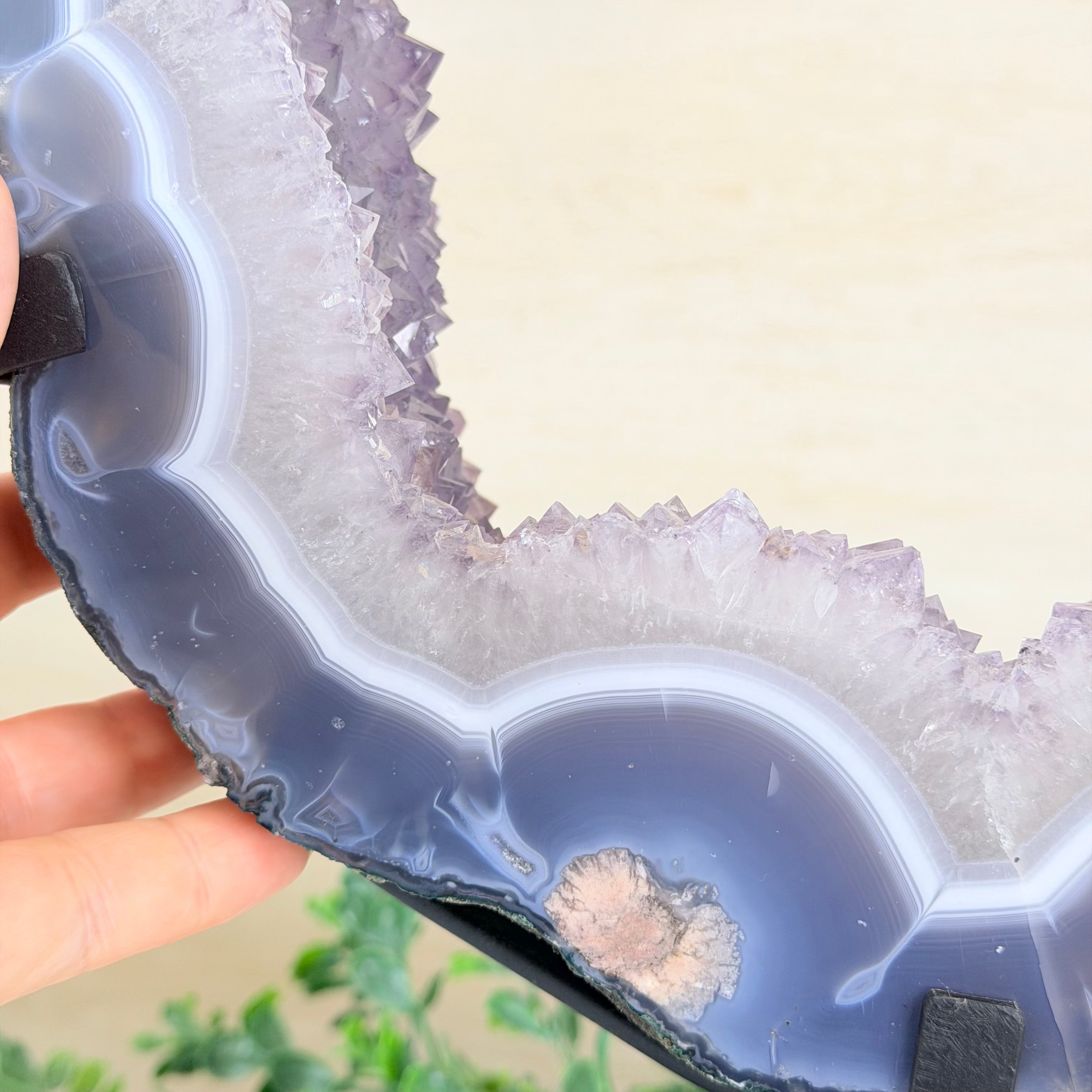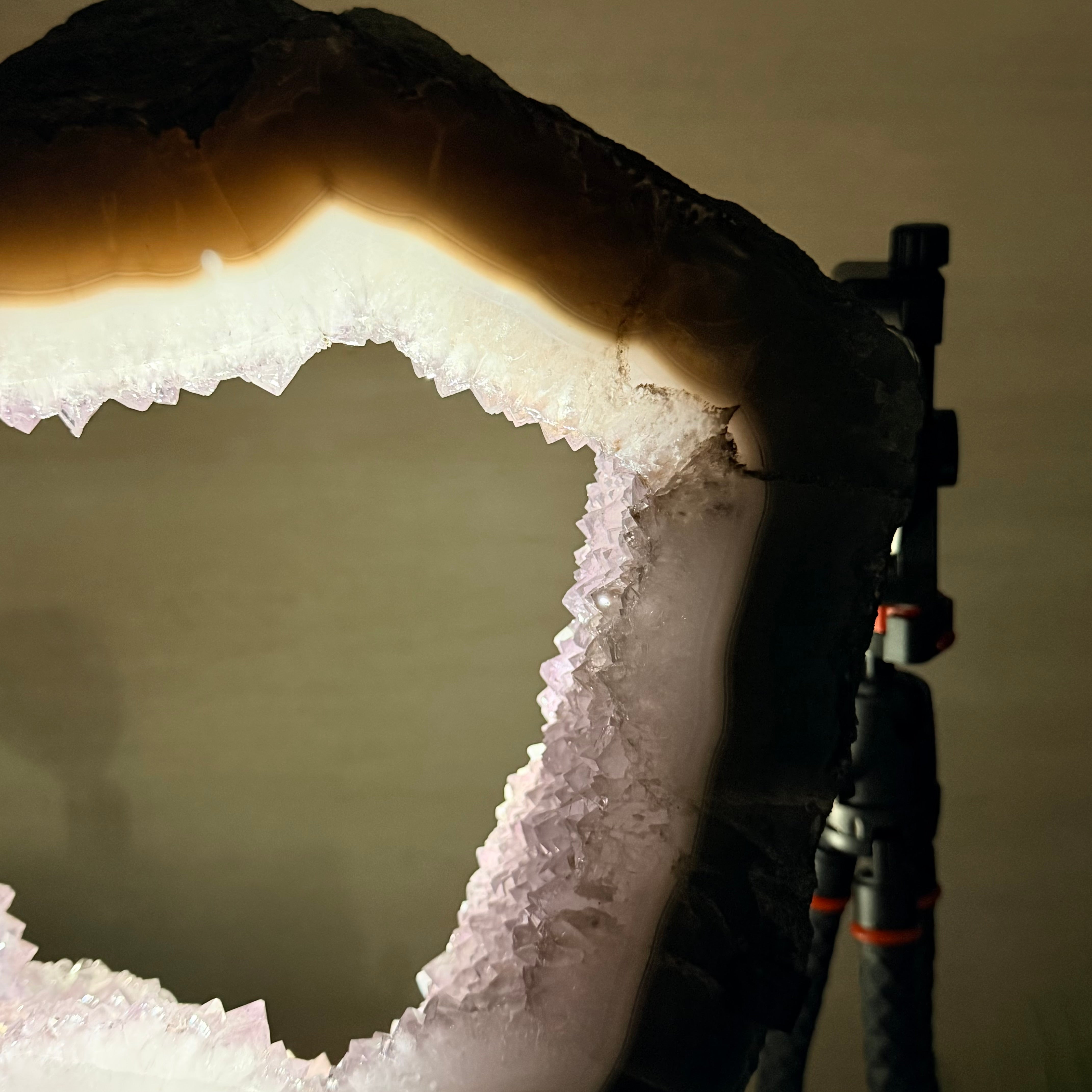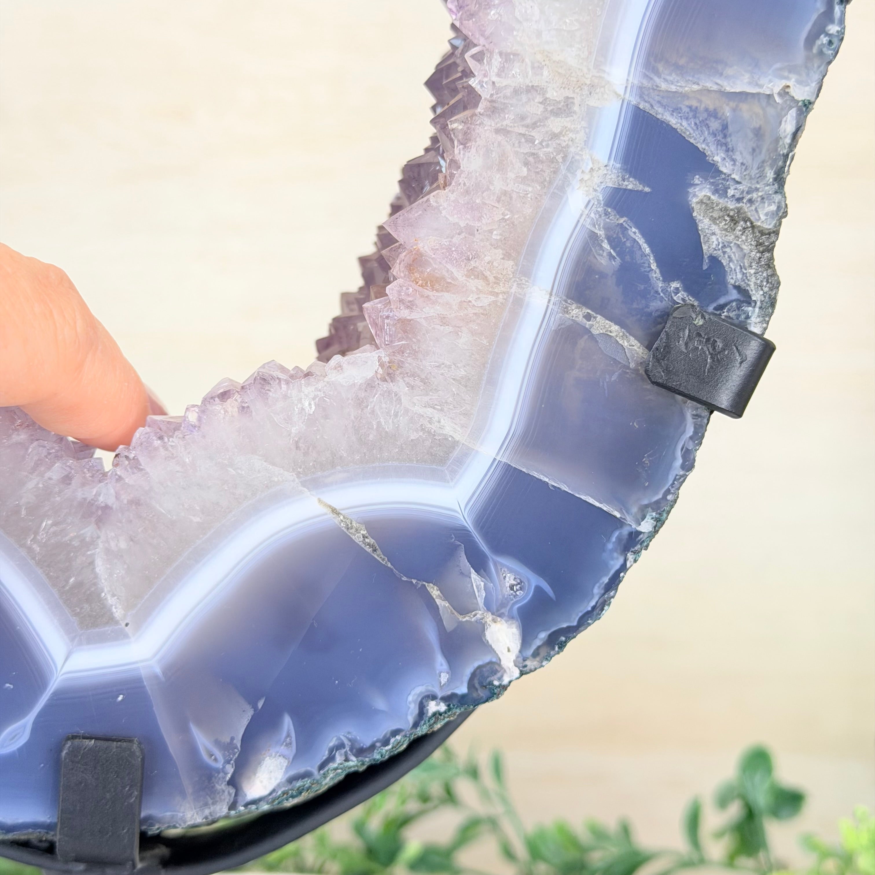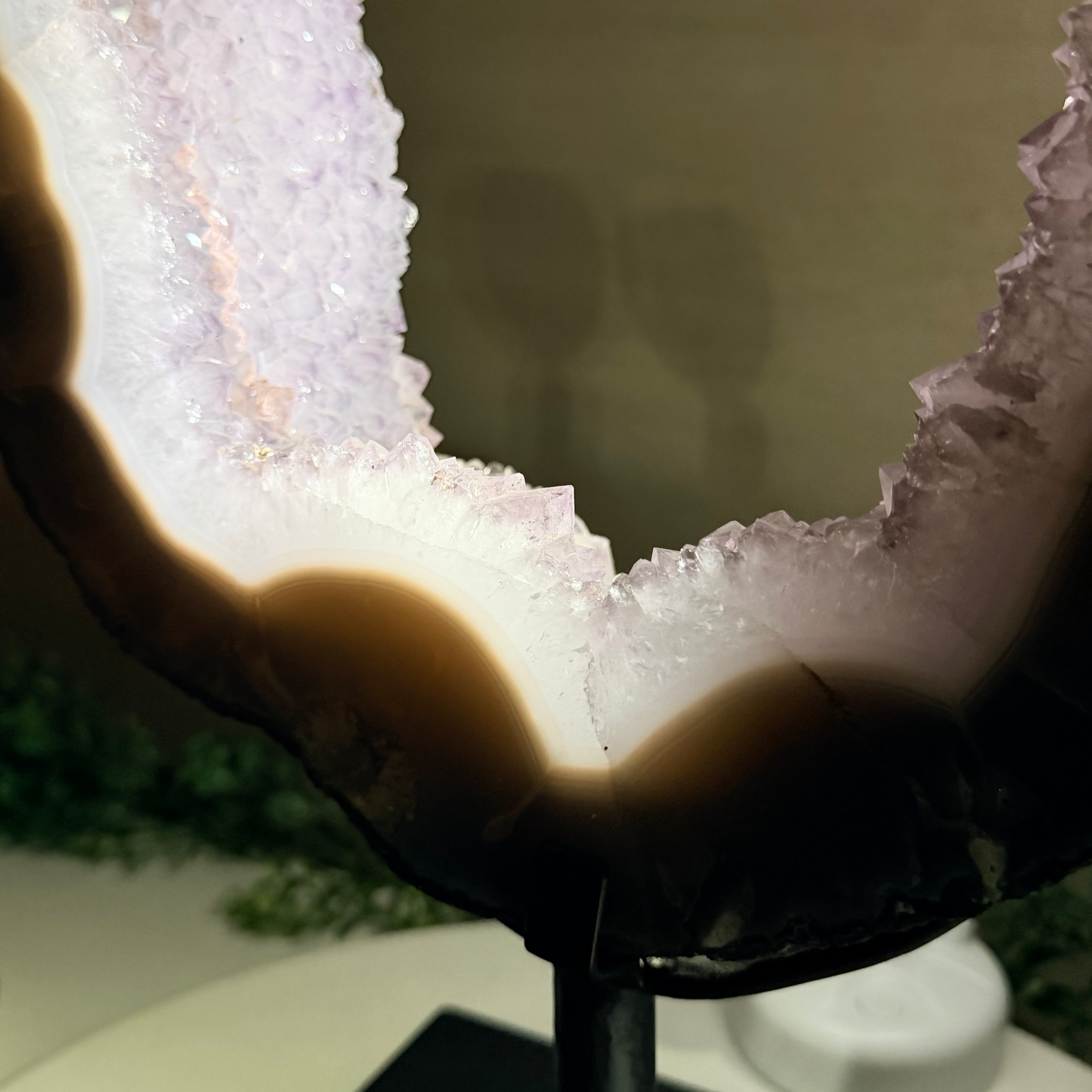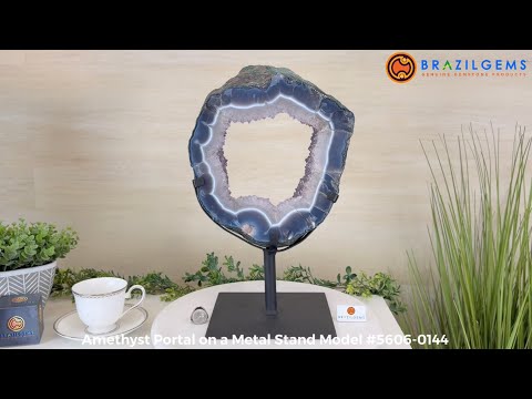 Unveil the charm of this natural Extra Quality Brazilian Amethyst Crystal "Portal" on a black metal fixed stand. This piece is smoothly polished on the front side, rough edges on the back side and a rough natural outer shell. Note the large Agate bands along the edges. Very special!