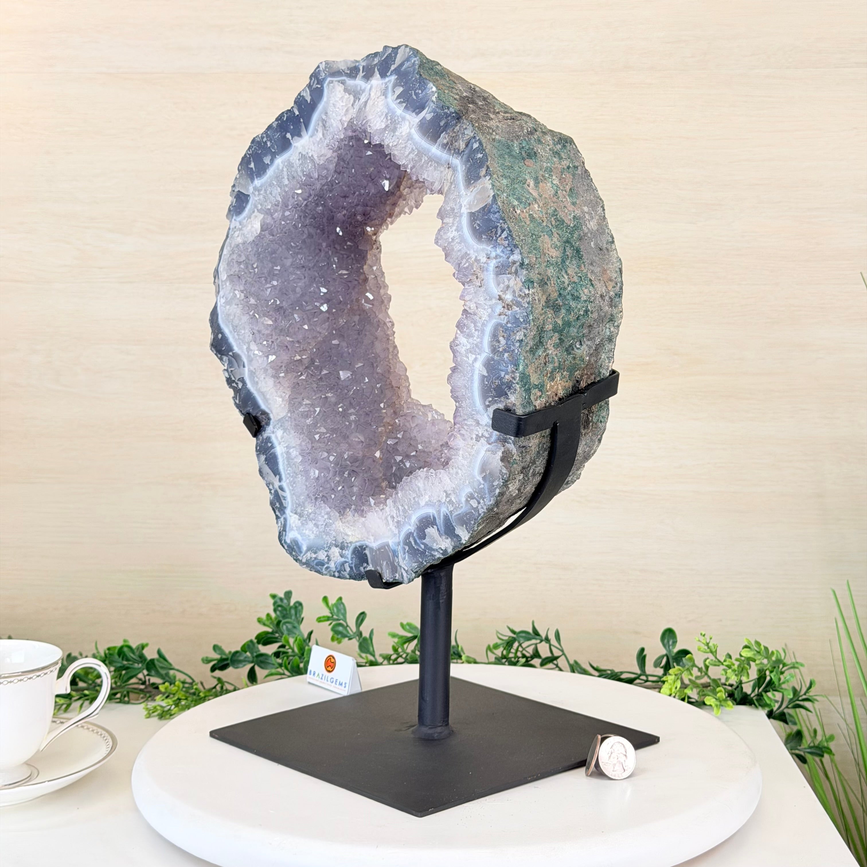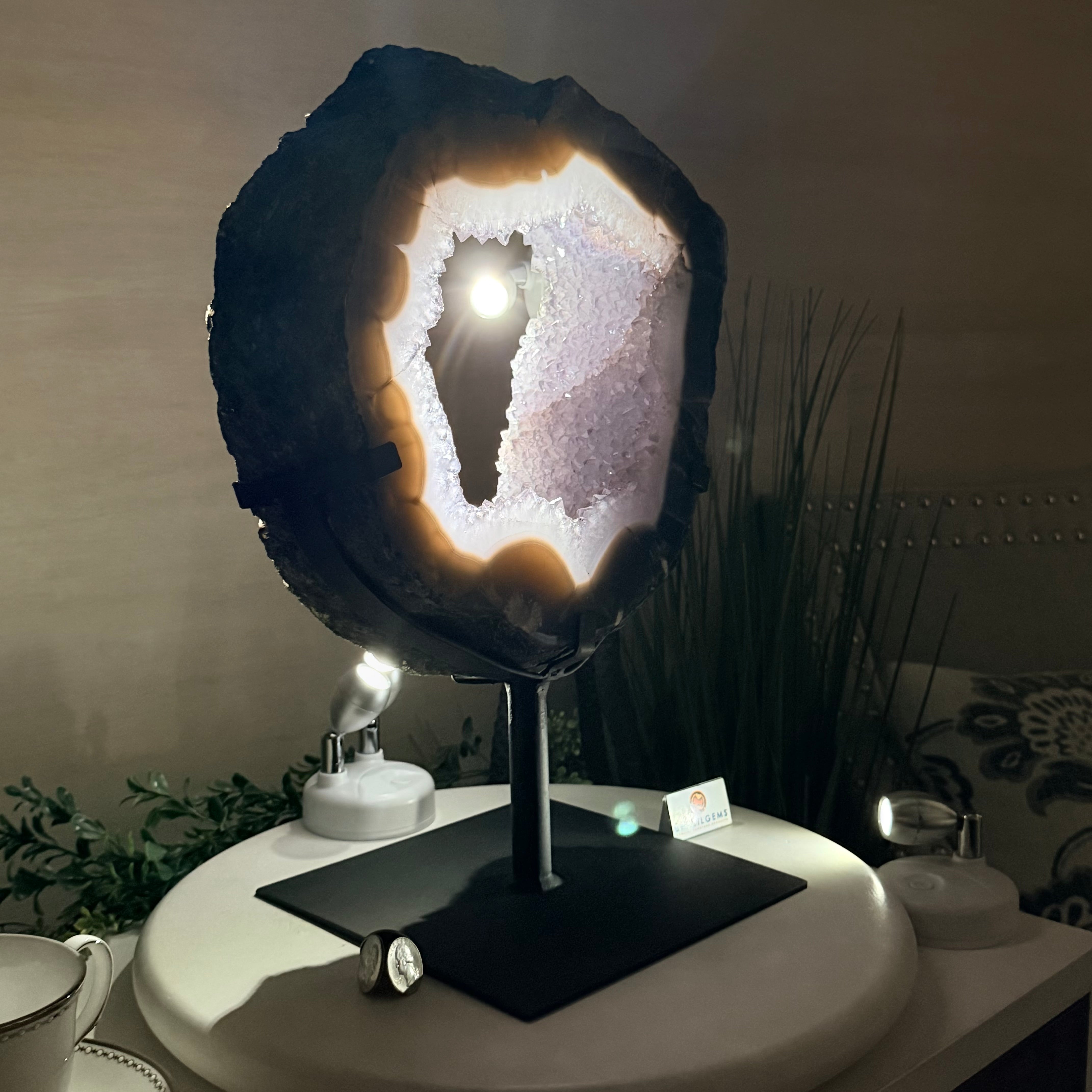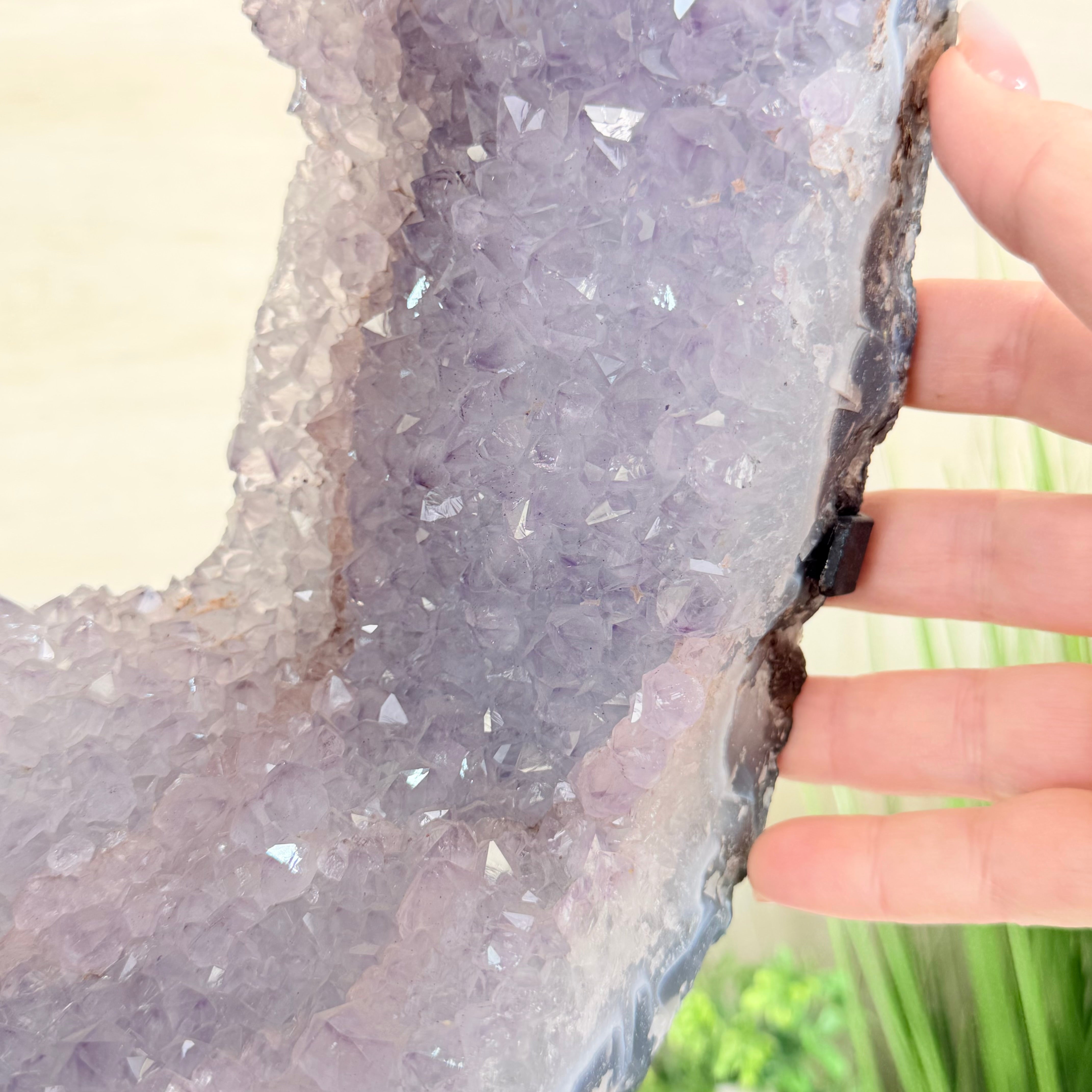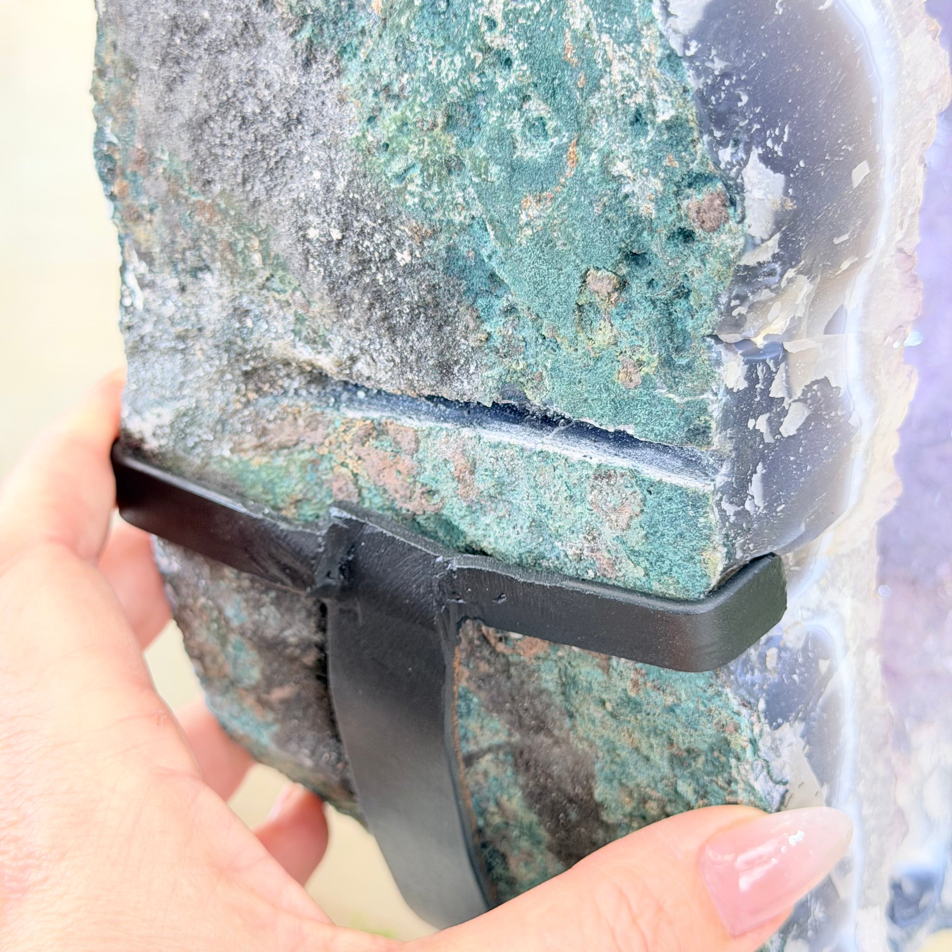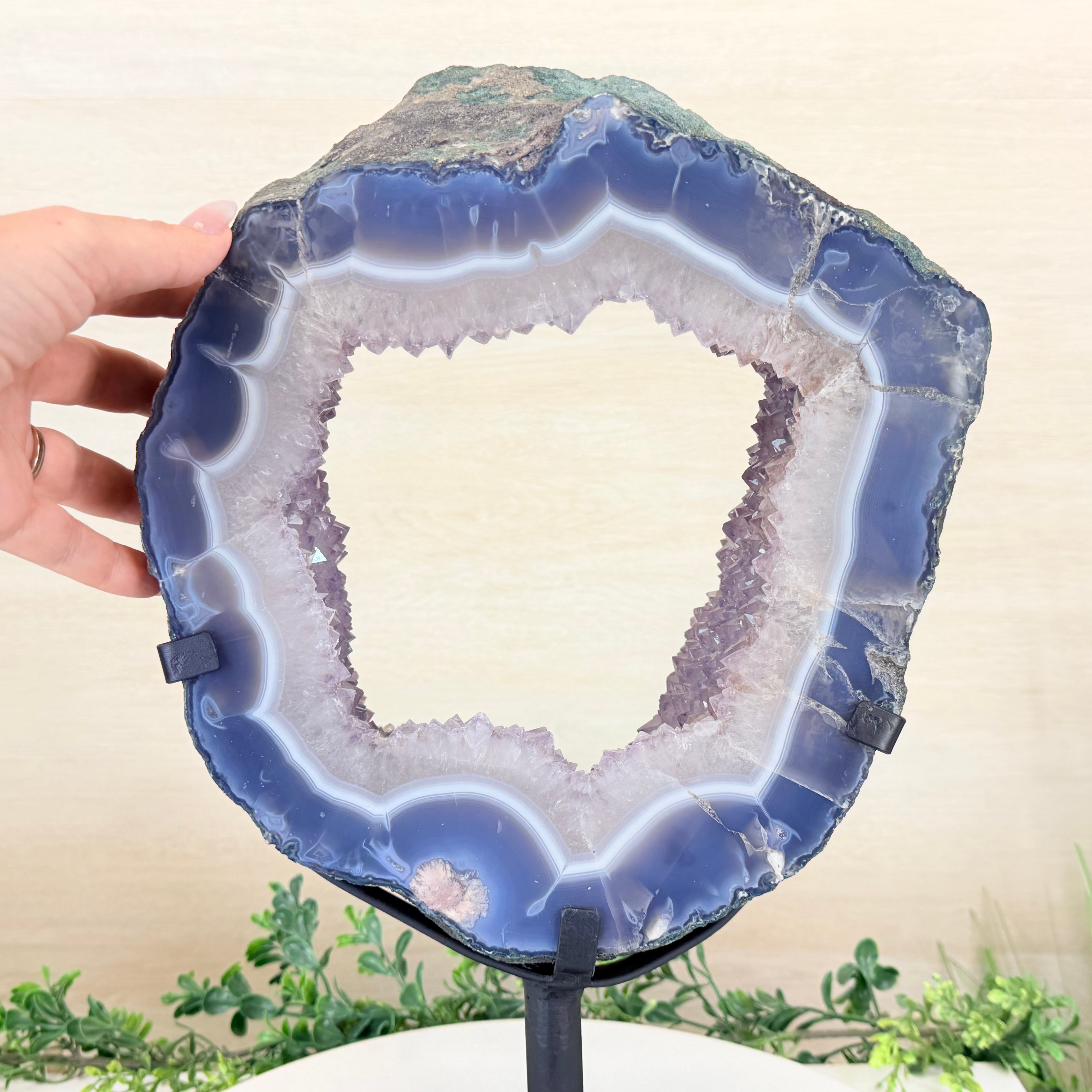 Unveil the charm of this natural Extra Quality Brazilian Amethyst Crystal "Portal" on a black metal fixed stand. This piece is smoothly polished on the front side, rough edges on the back side and a rough natural outer shell. Note the large Agate bands along the edges. Very special!