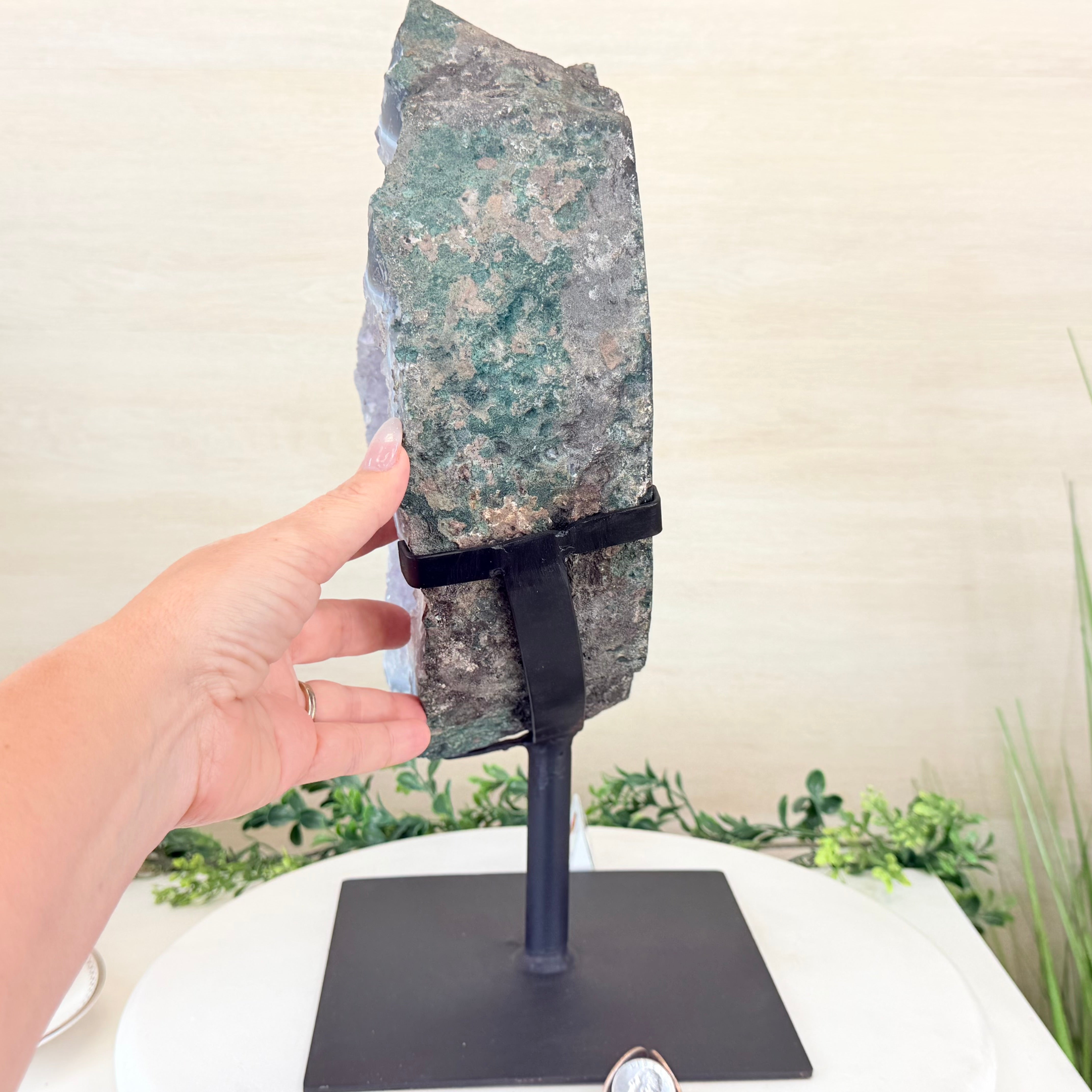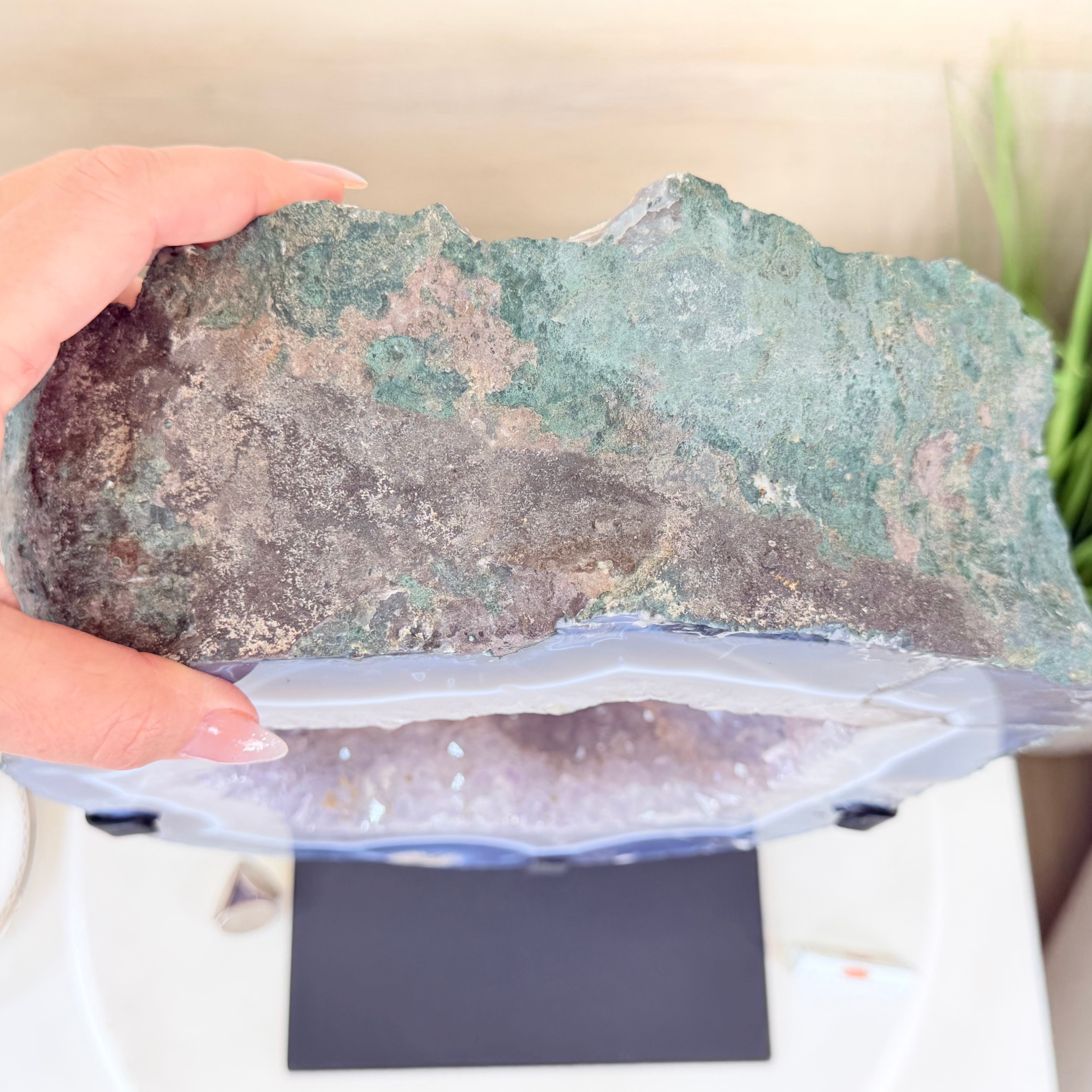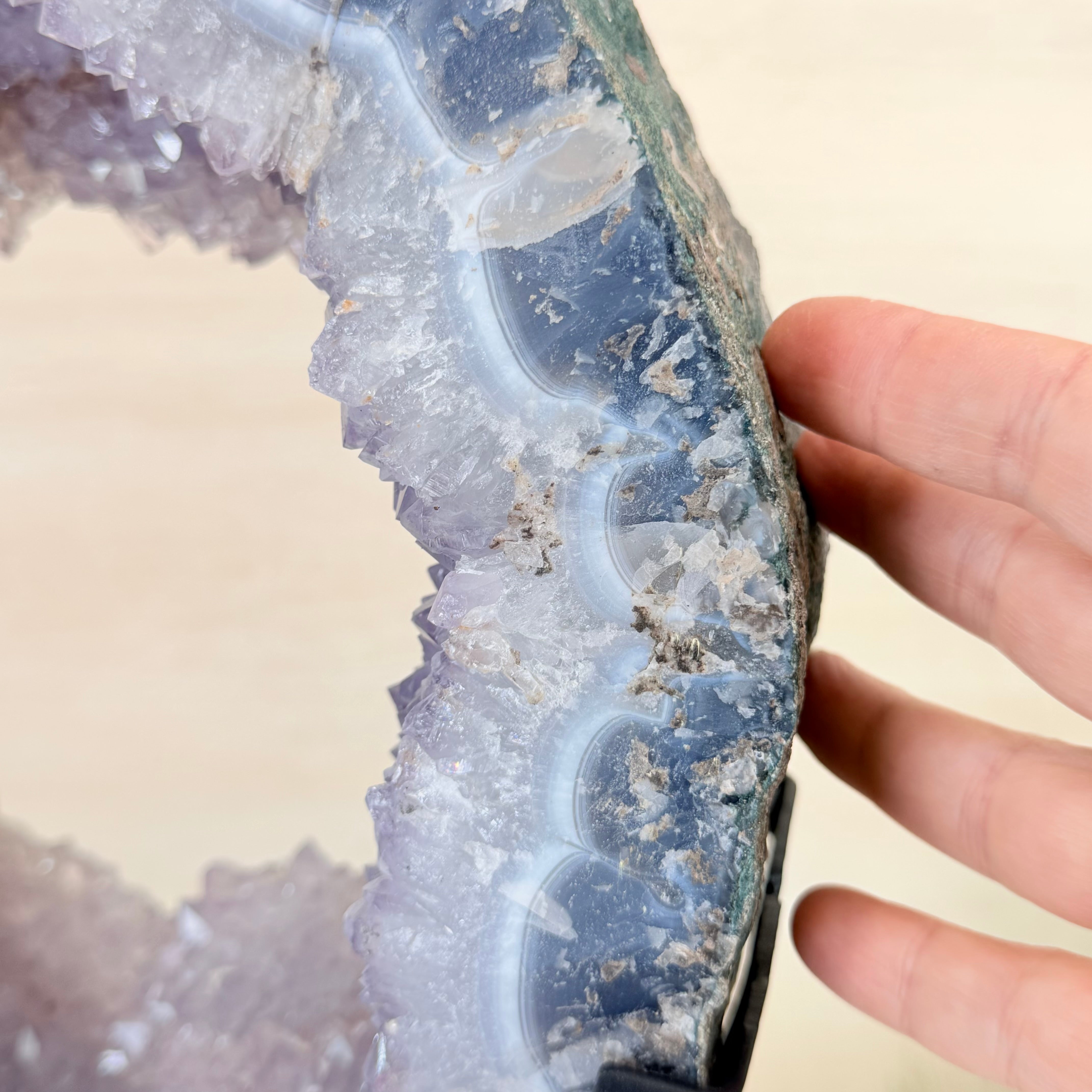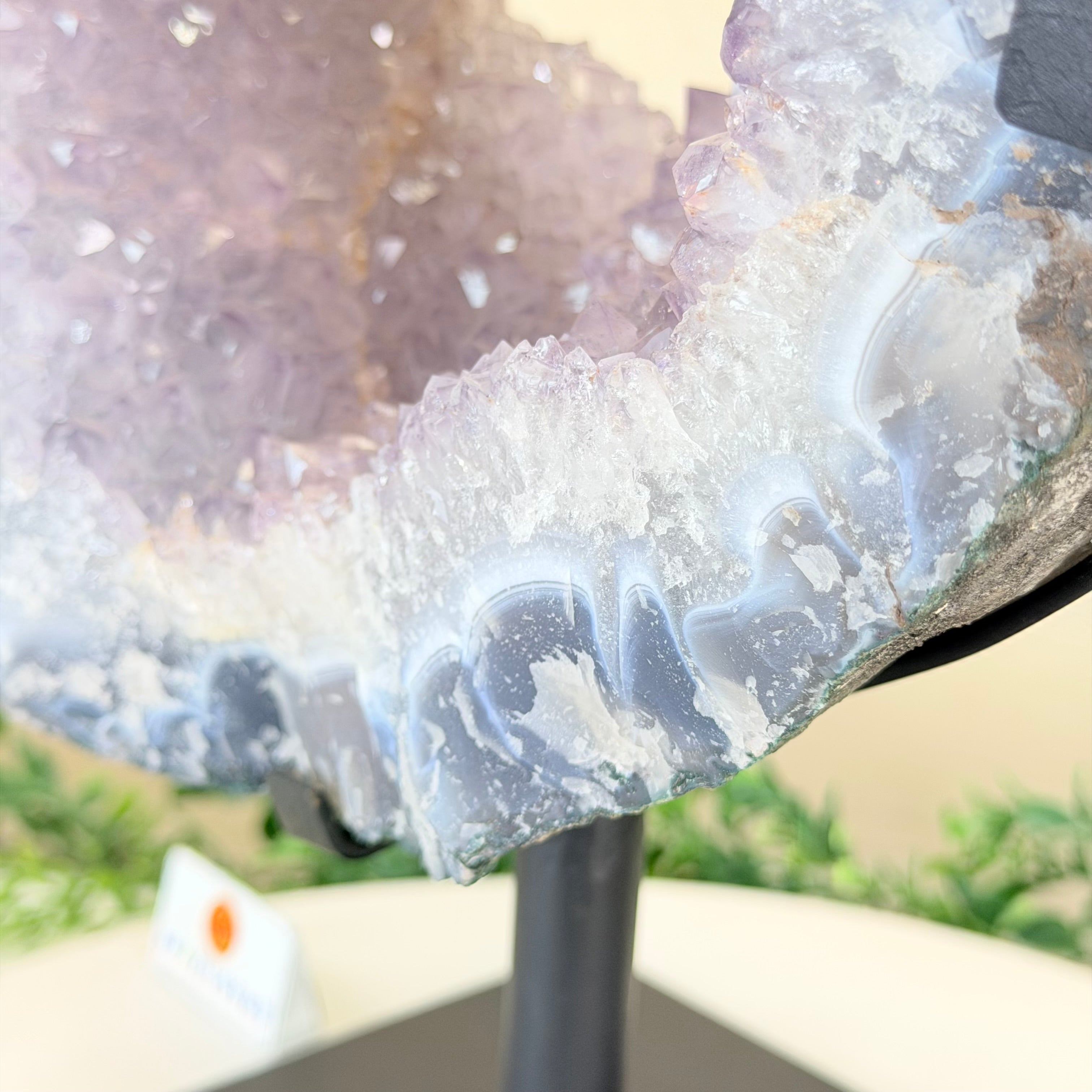 Unveil the charm of this natural Extra Quality Brazilian Amethyst Crystal "Portal" on a black metal fixed stand. This piece is smoothly polished on the front side, rough edges on the back side and a rough natural outer shell. Note the large Agate bands along the edges. Very special!