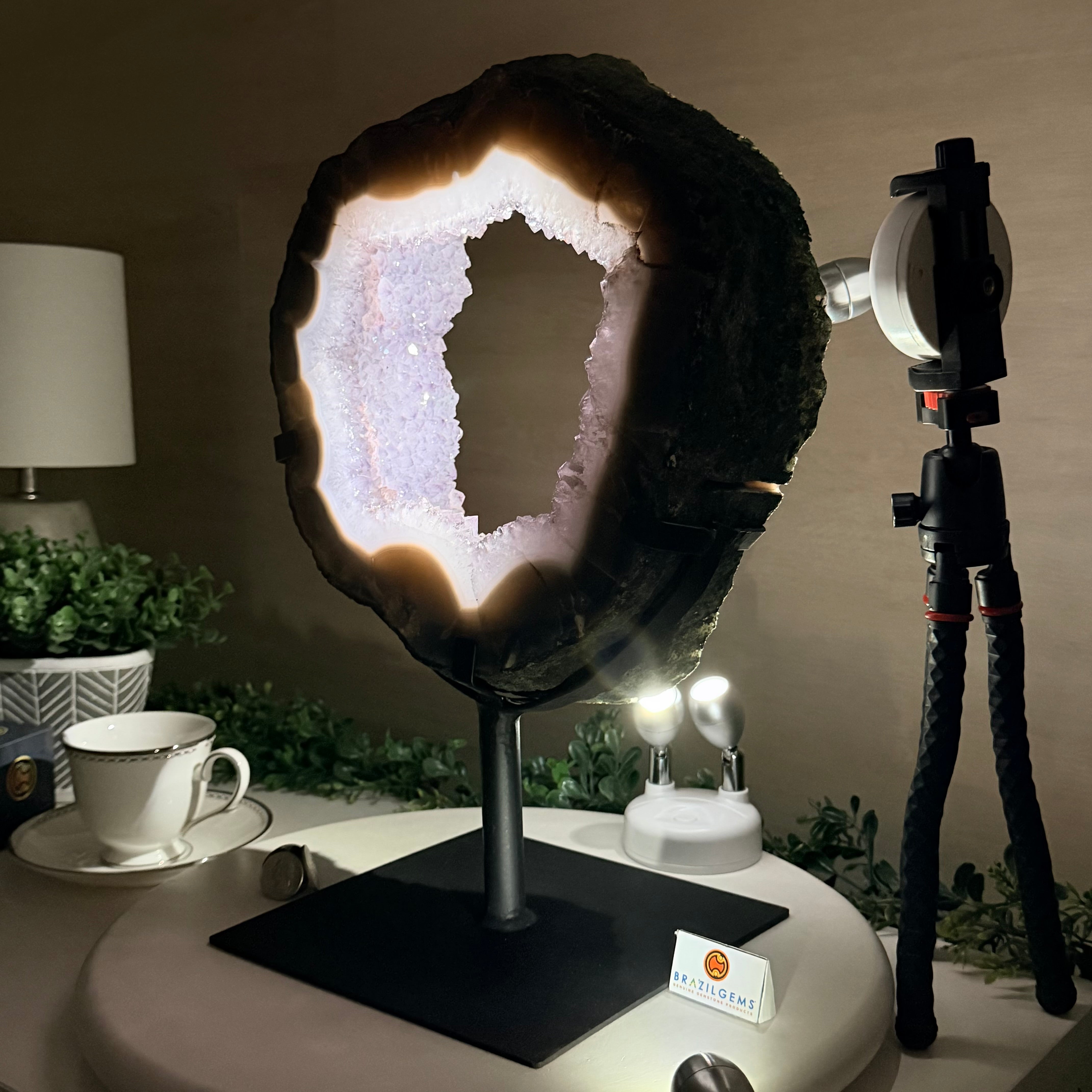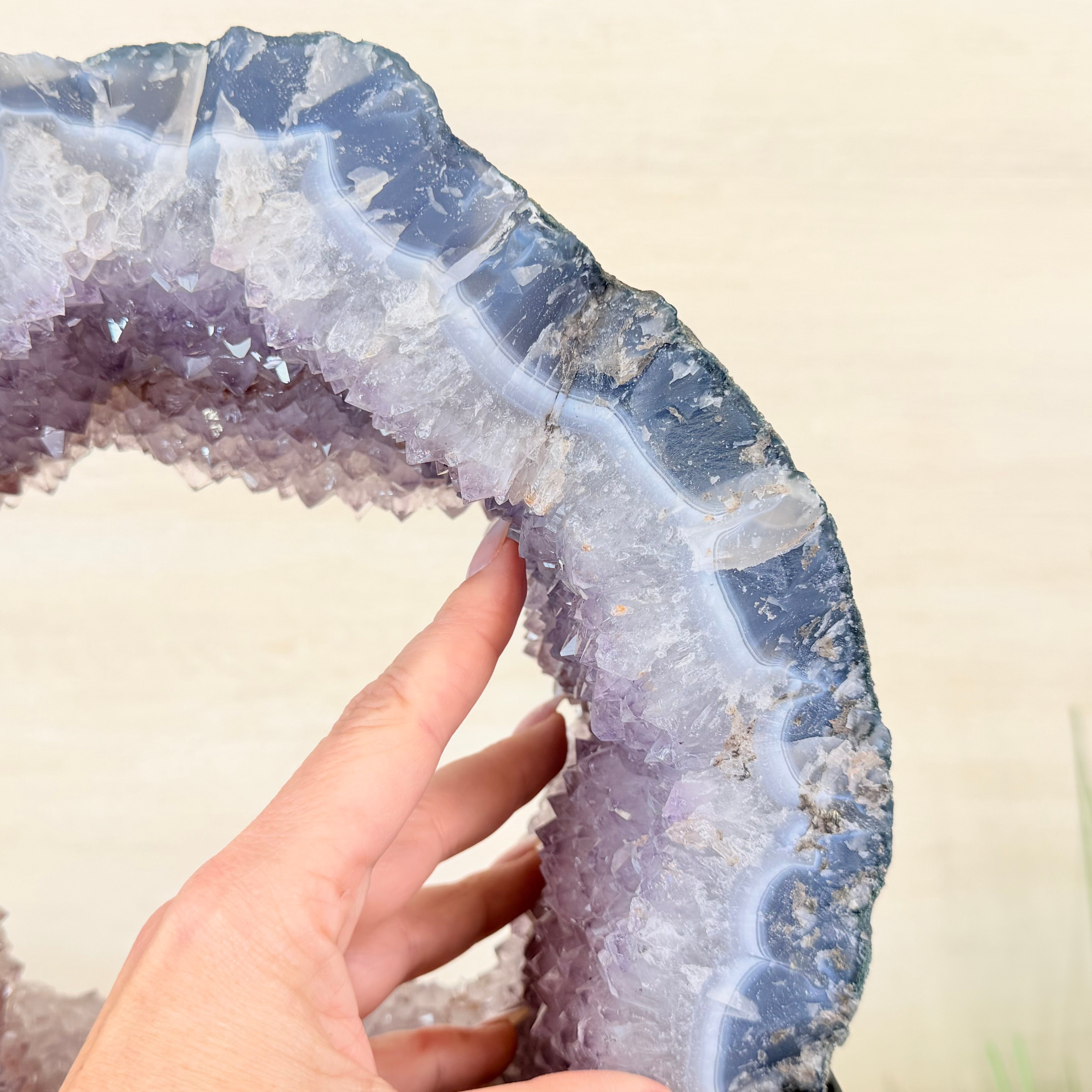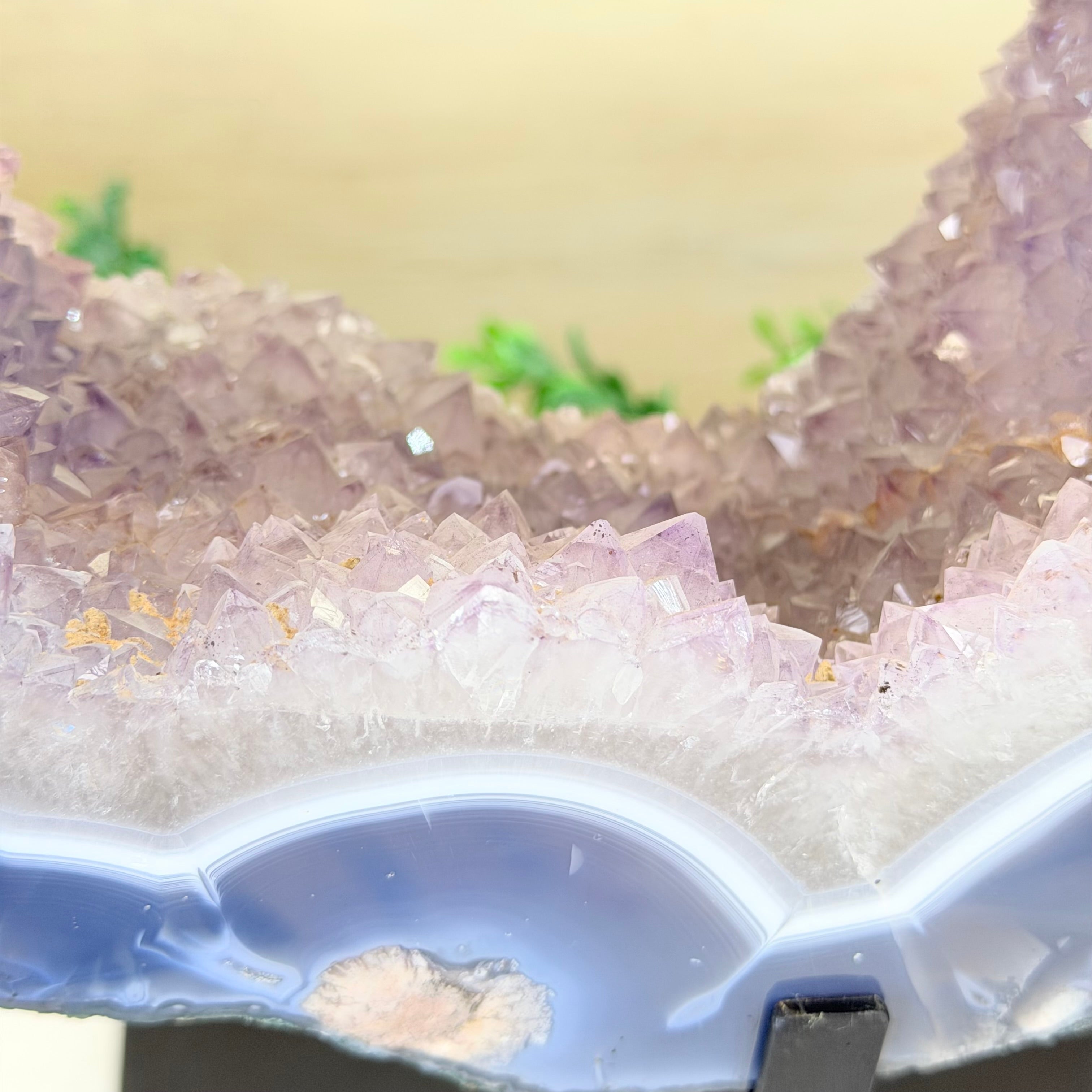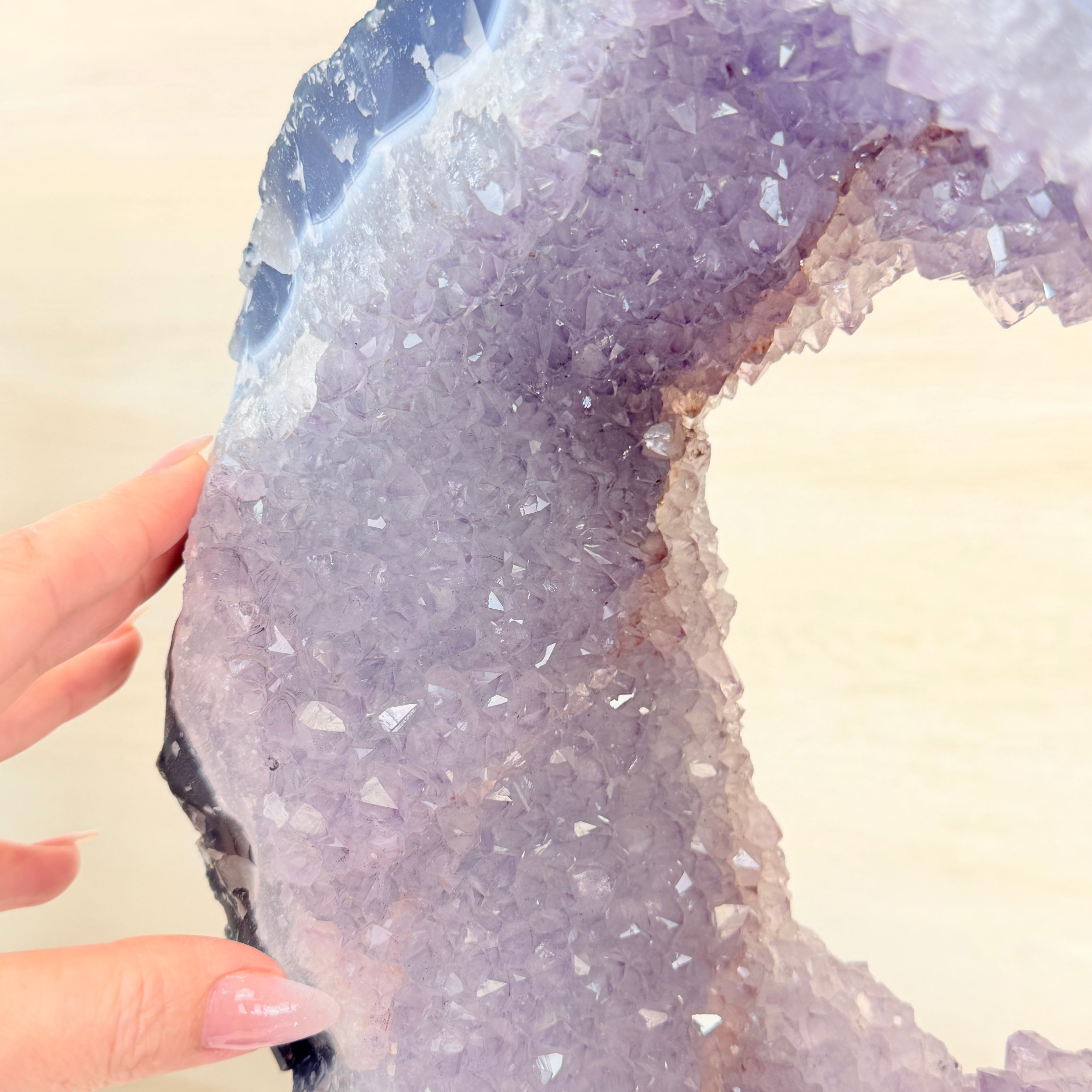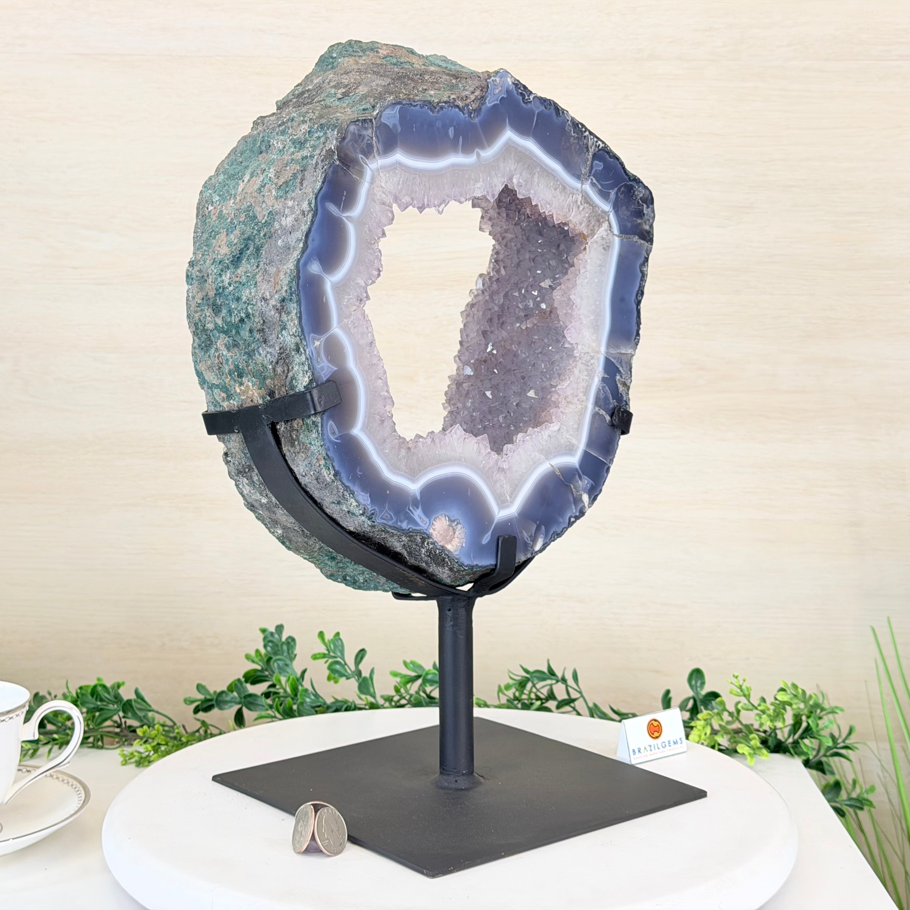 Unveil the charm of this natural Extra Quality Brazilian Amethyst Crystal "Portal" on a black metal fixed stand. This piece is smoothly polished on the front side, rough edges on the back side and a rough natural outer shell. Note the large Agate bands along the edges. Very special!