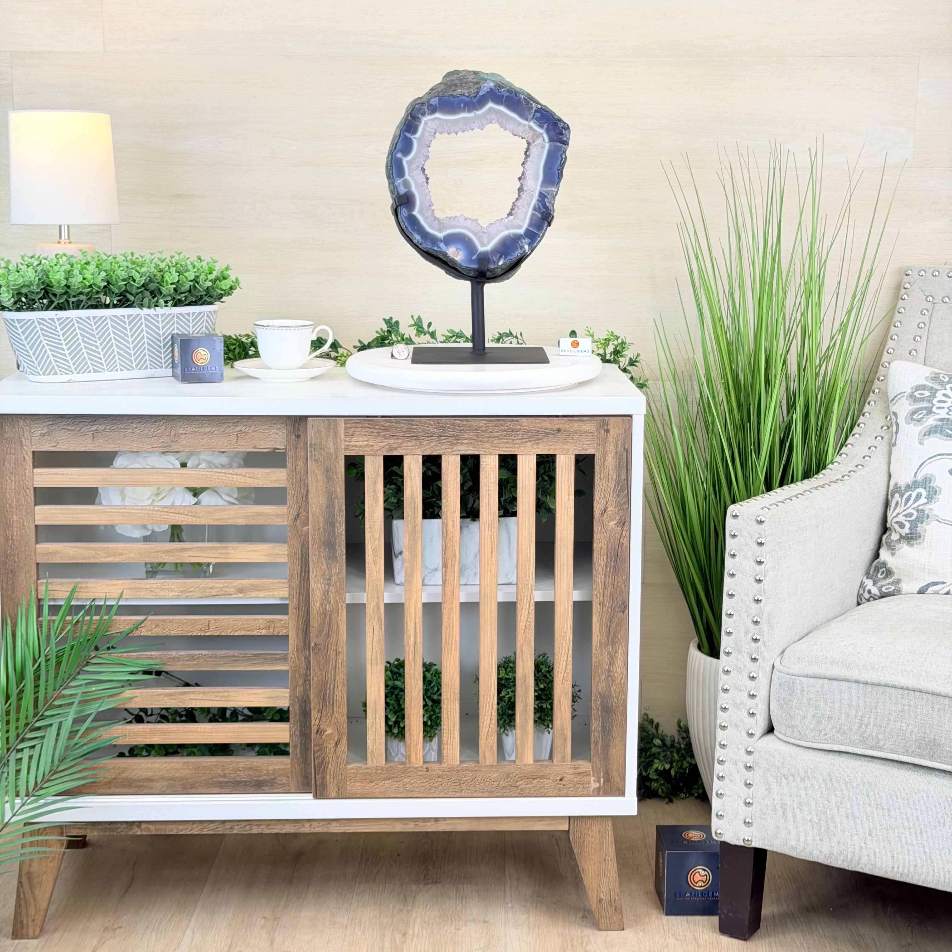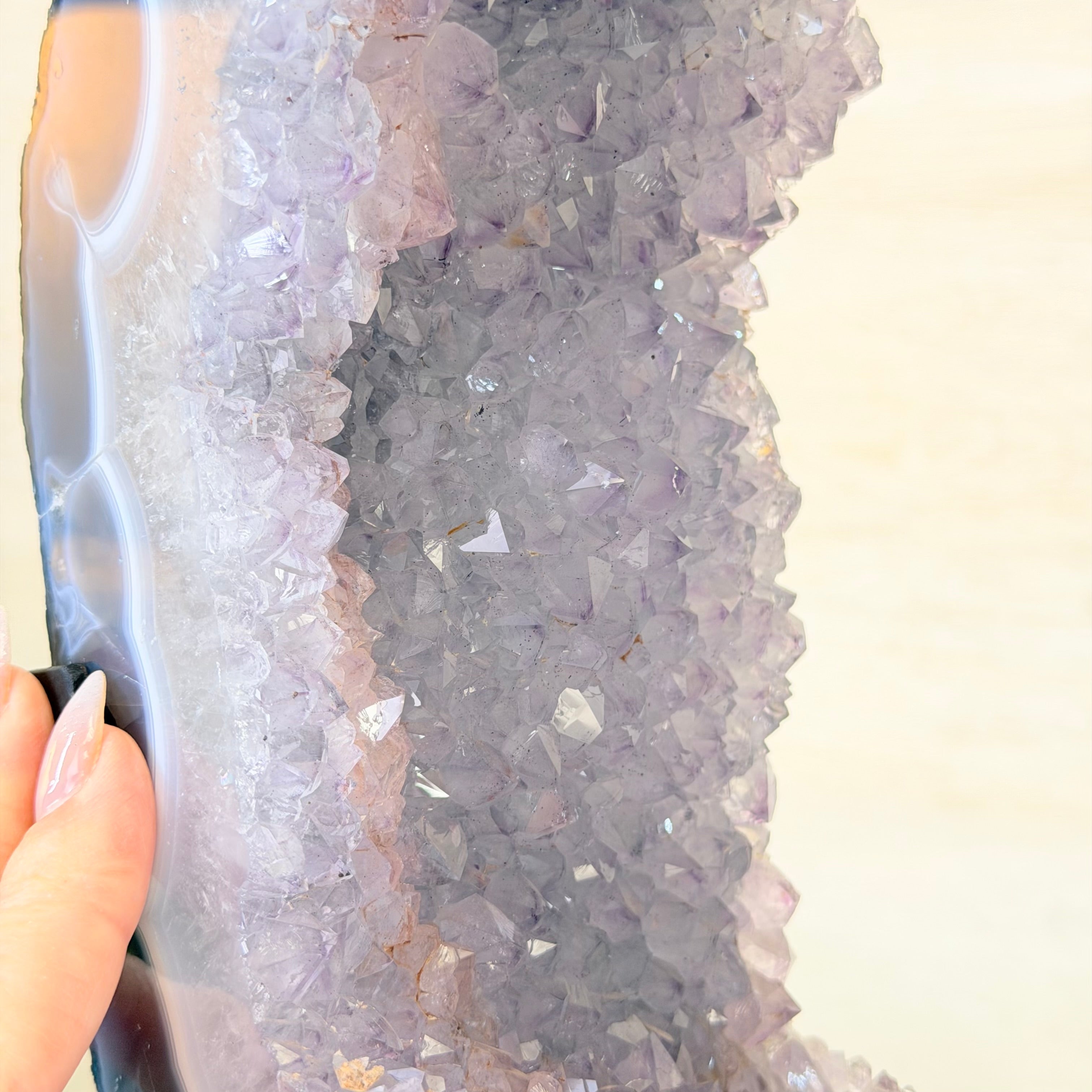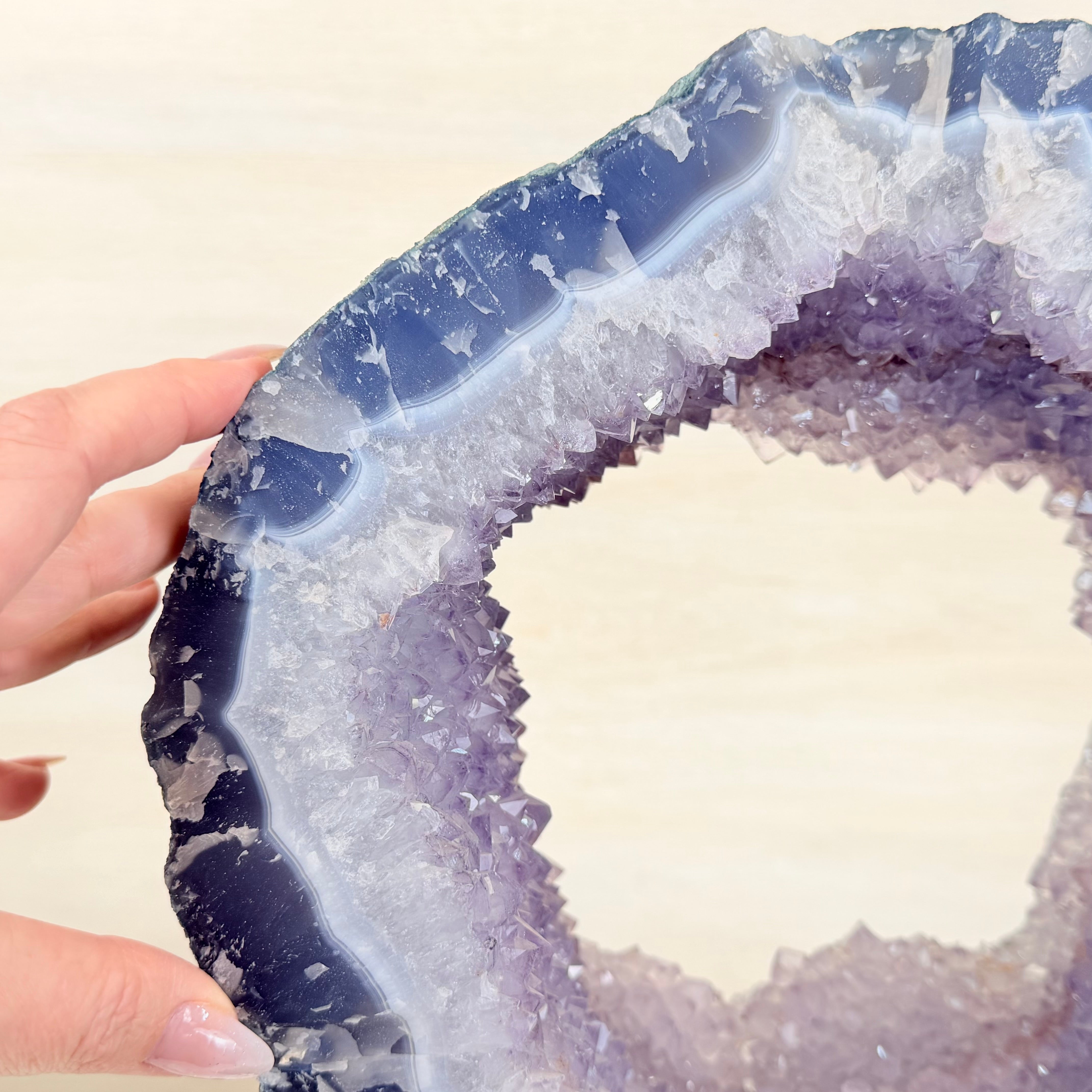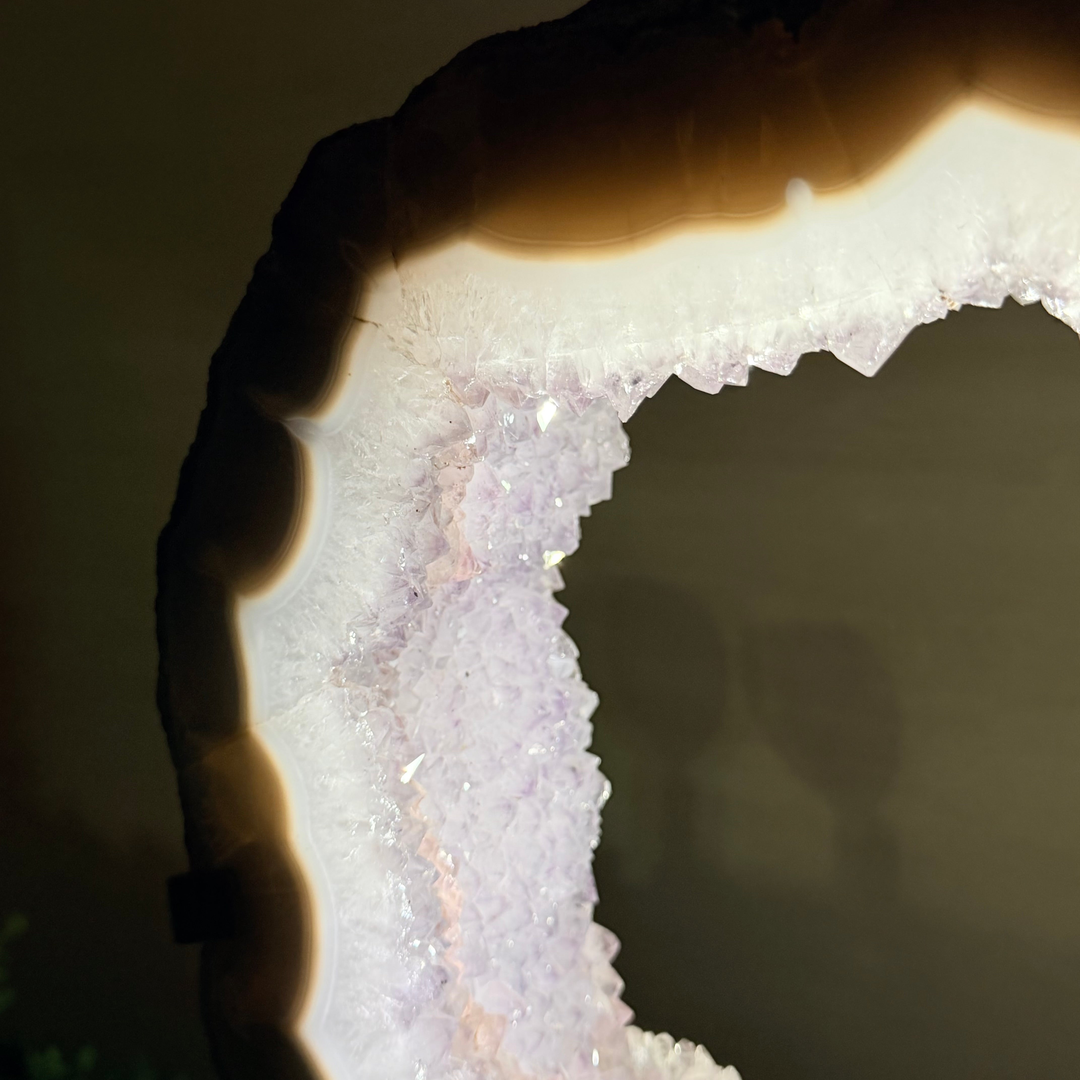 Unveil the charm of this natural Extra Quality Brazilian Amethyst Crystal "Portal" on a black metal fixed stand. This piece is smoothly polished on the front side, rough edges on the back side and a rough natural outer shell. Note the large Agate bands along the edges. Very special!