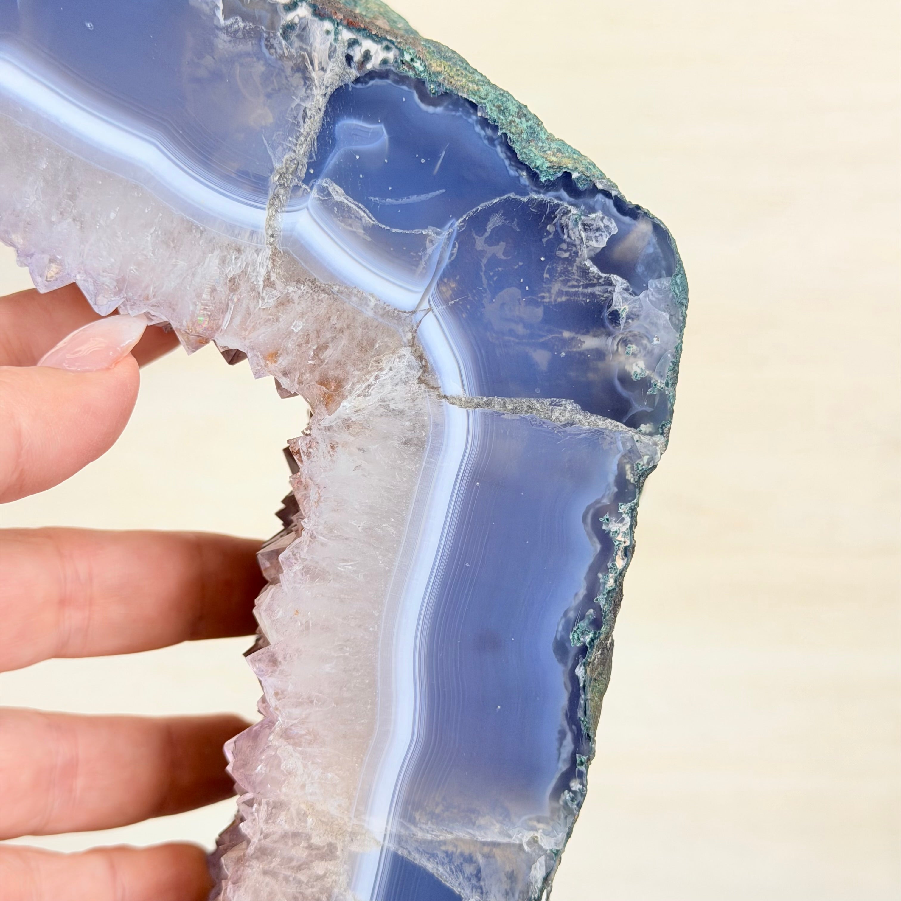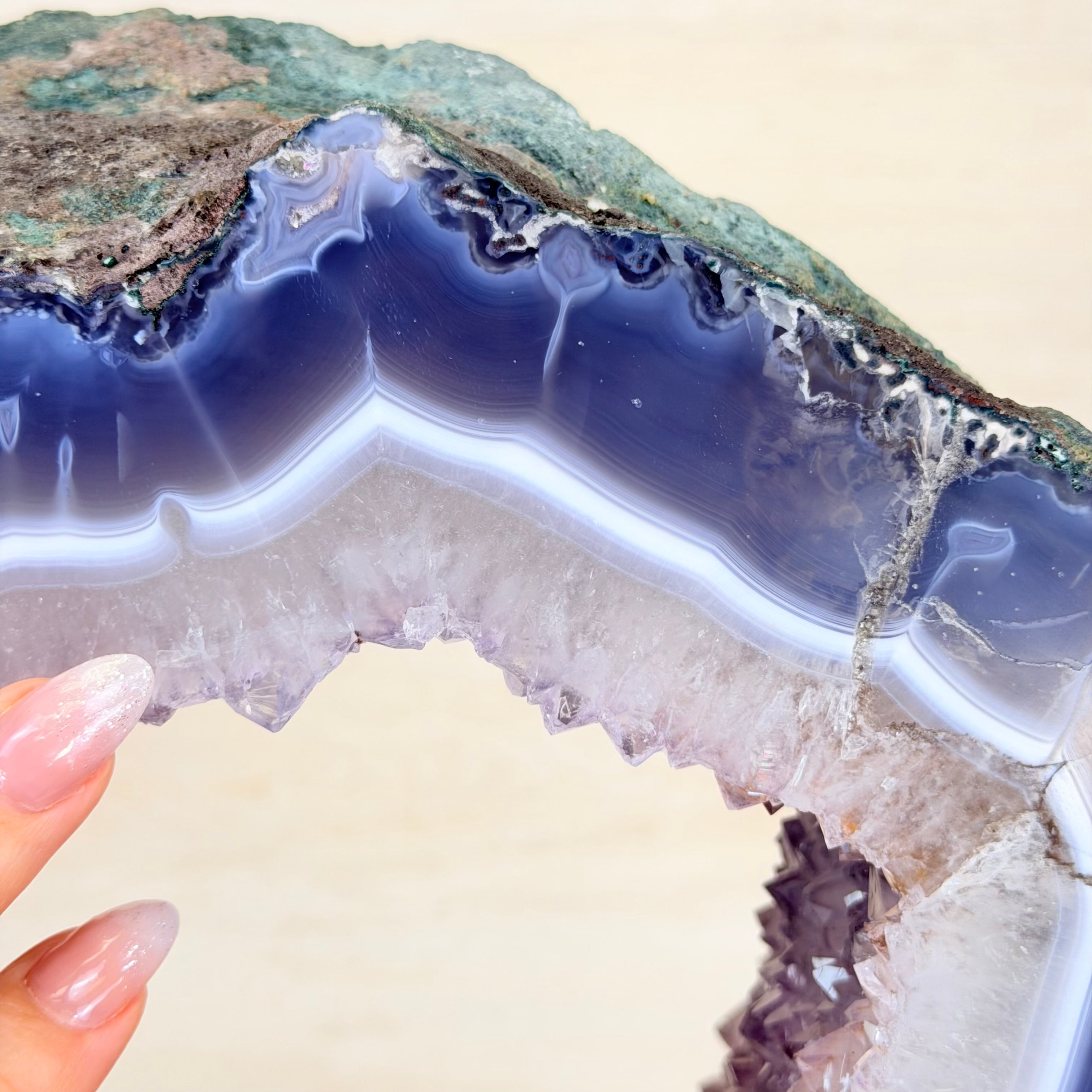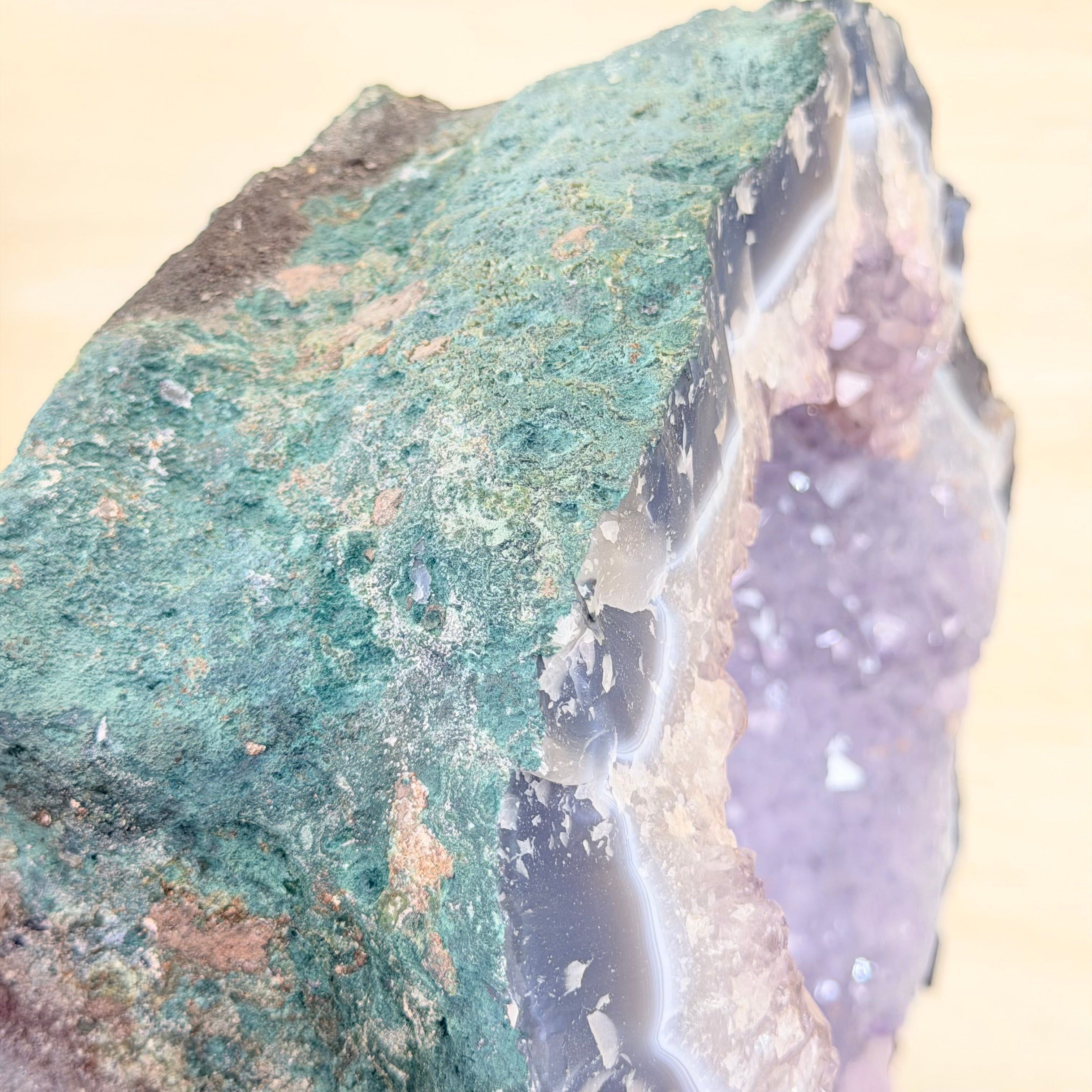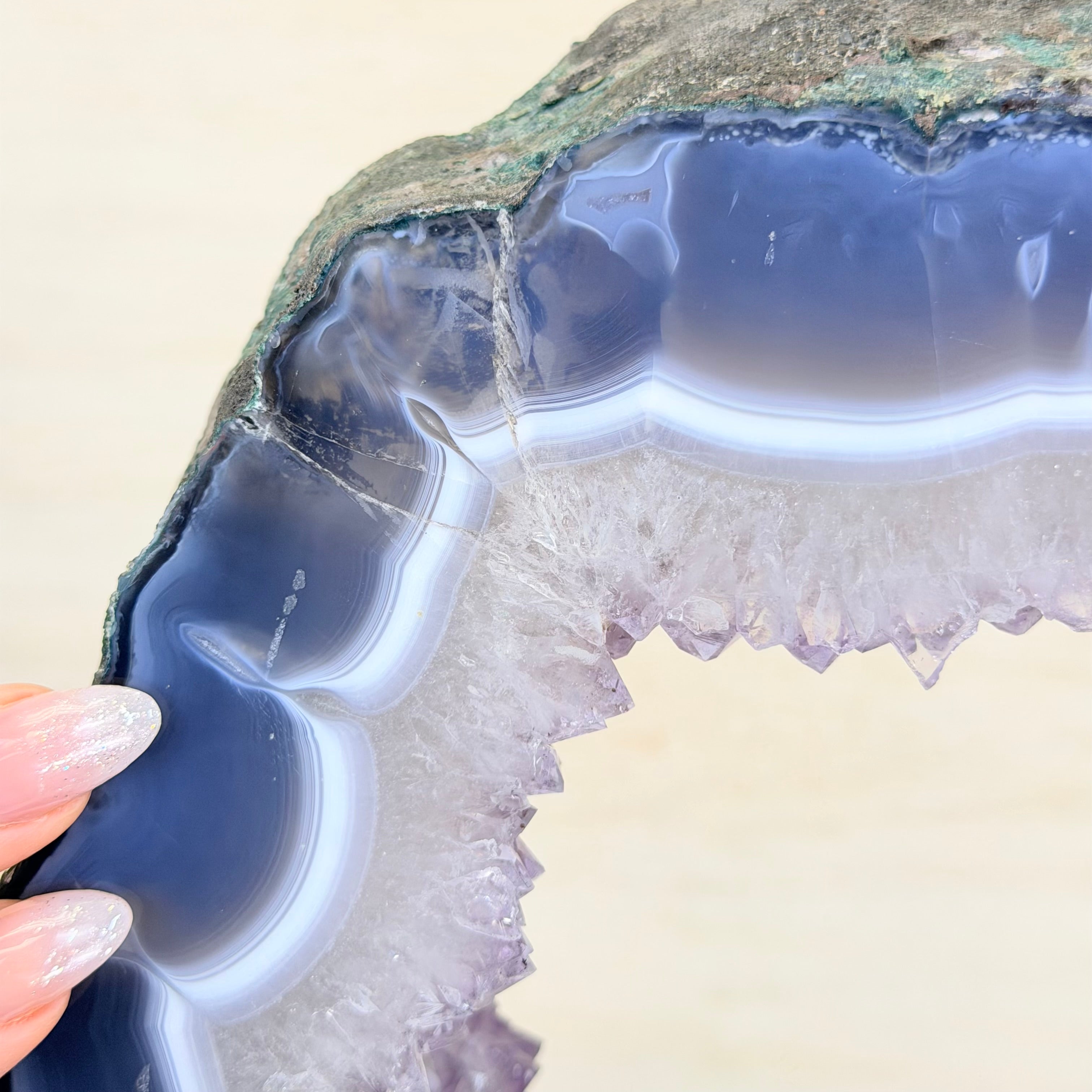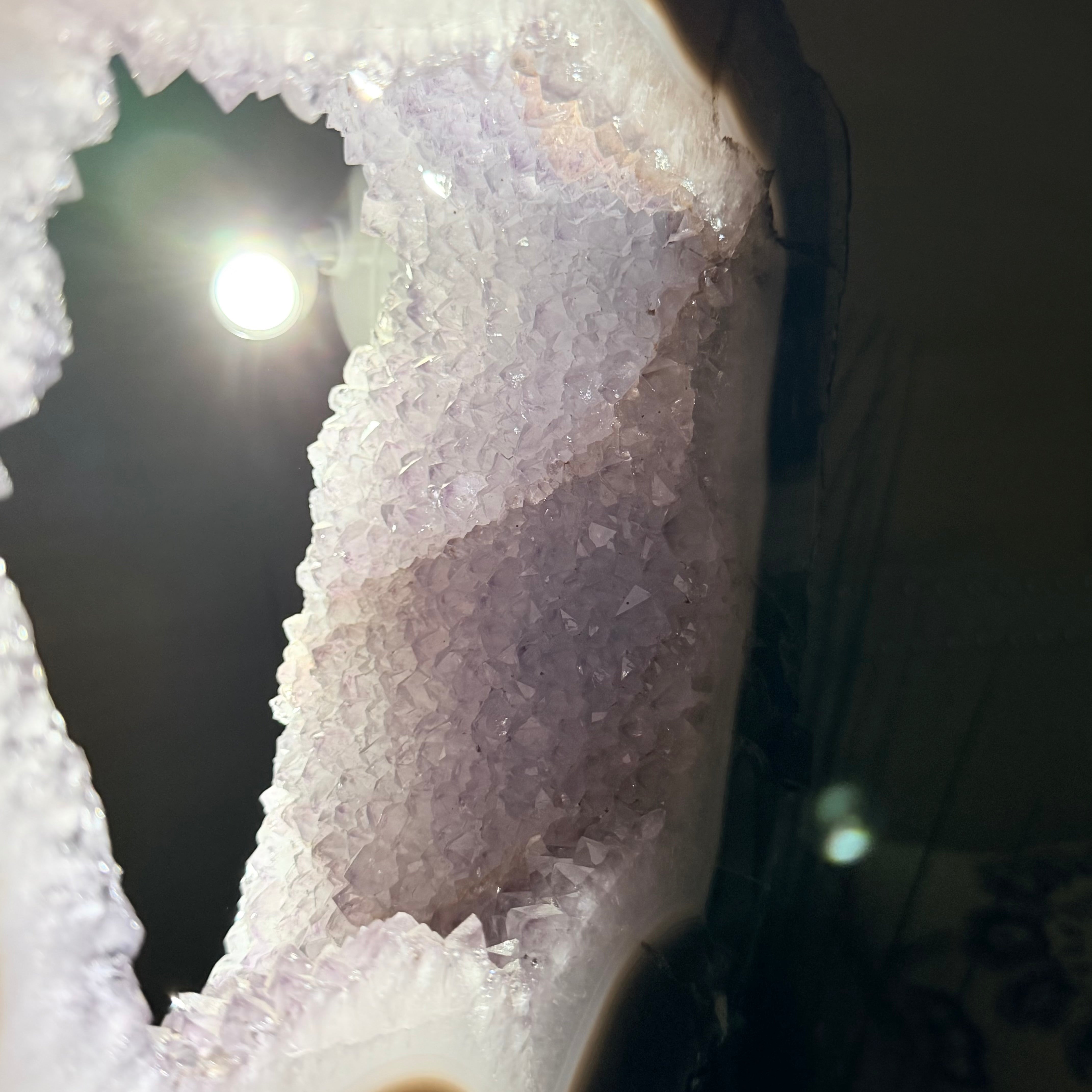 Unveil the charm of this natural Extra Quality Brazilian Amethyst Crystal "Portal" on a black metal fixed stand. This piece is smoothly polished on the front side, rough edges on the back side and a rough natural outer shell. Note the large Agate bands along the edges. Very special!