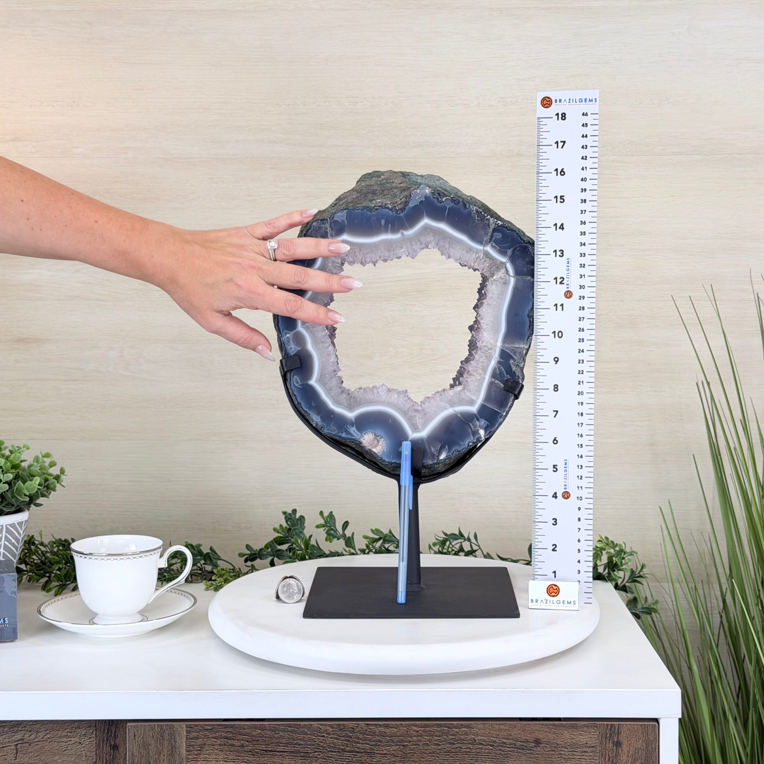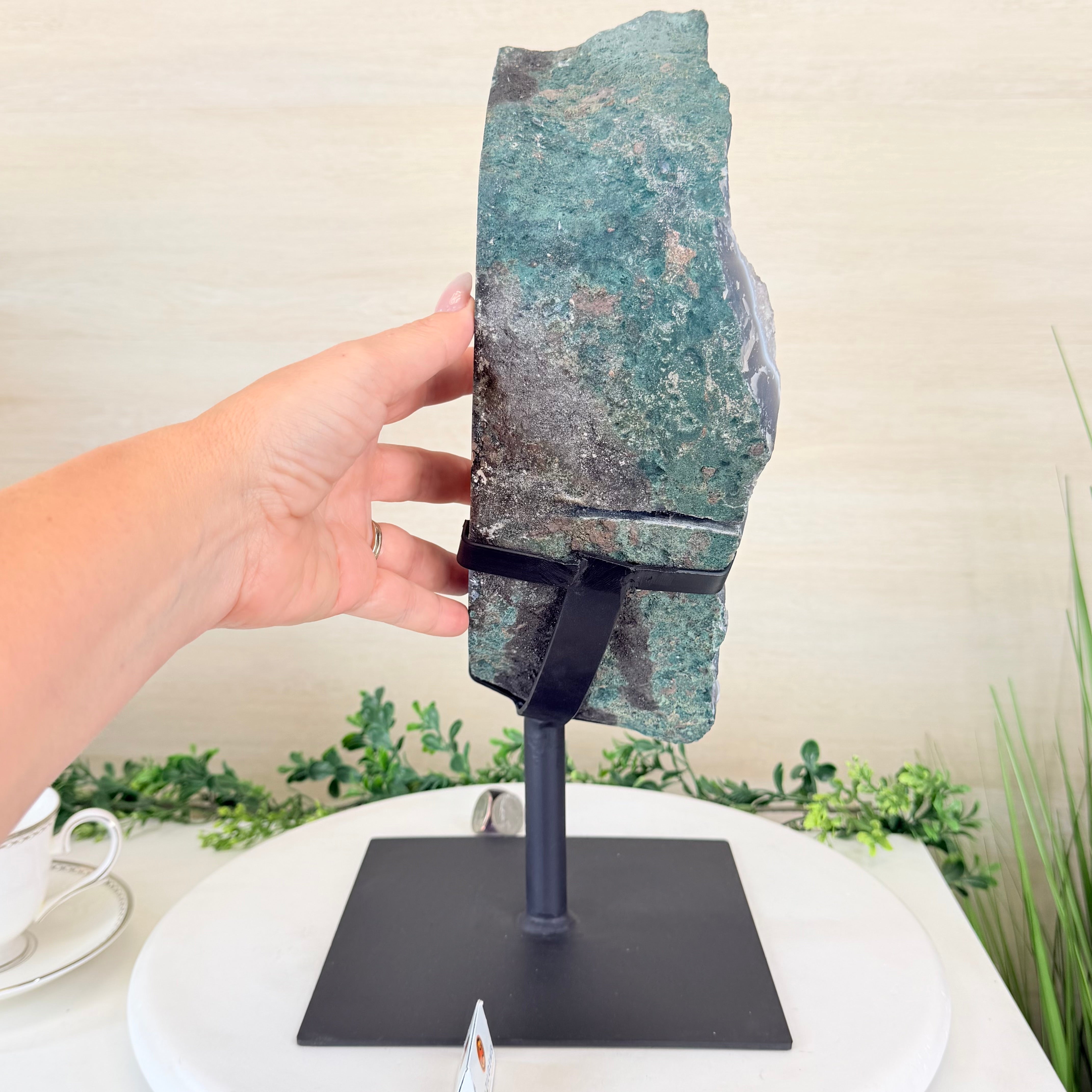 Disclaimer: This is a natural gemstone crystal sold by Brazil Gems® as is and as you see it in its images and video. It is the exact item you will receive. It may contain natural imperfections as well as imperfections, scratches, broken edges and repairs from the extraction, polishing and mounting processes. The base has been custom welded to fit this crystal and painted black. At Brazil Gems® we make every effort to get measurements as exact as possible but they are done by human hands and eyes and therefore may have minor discrepancies.
