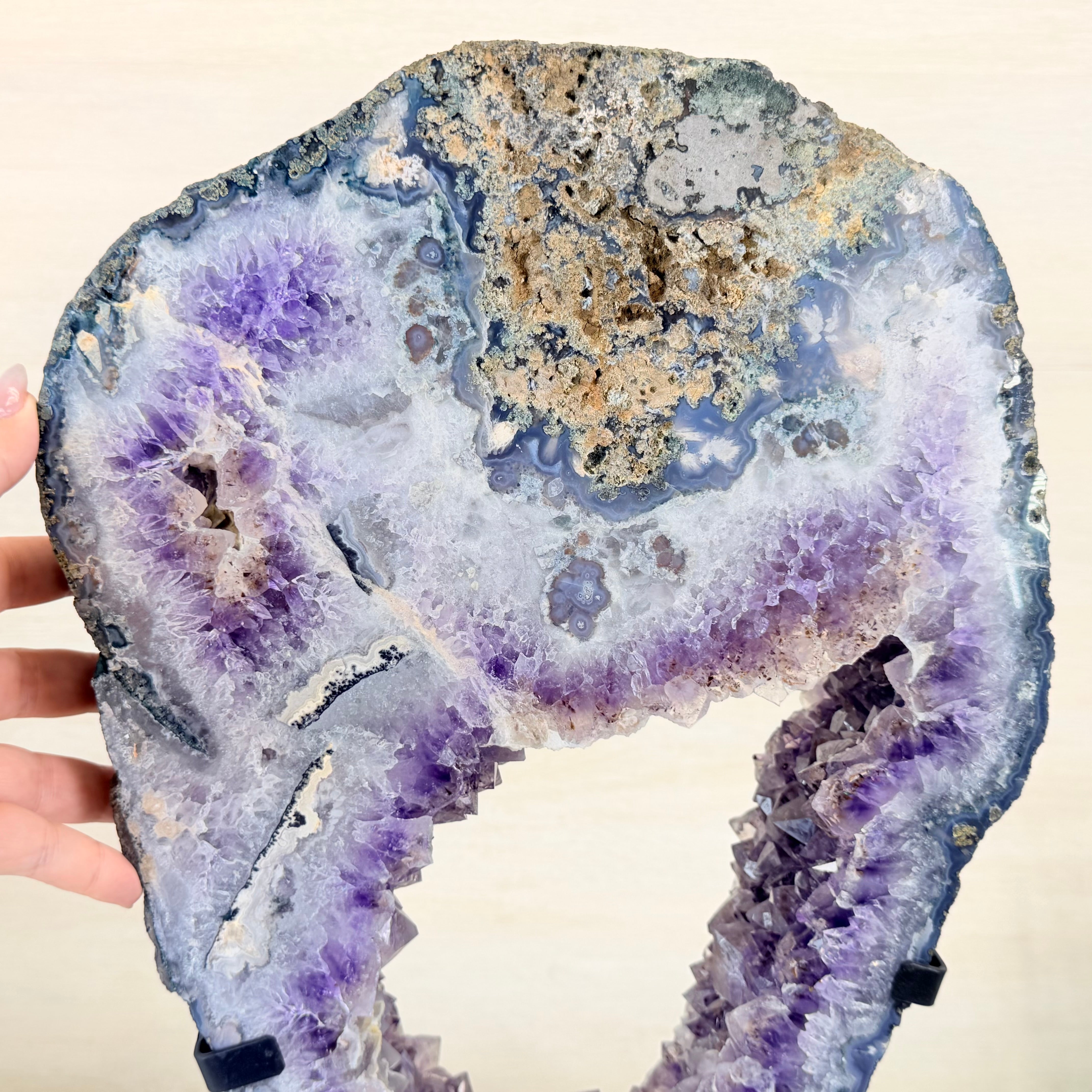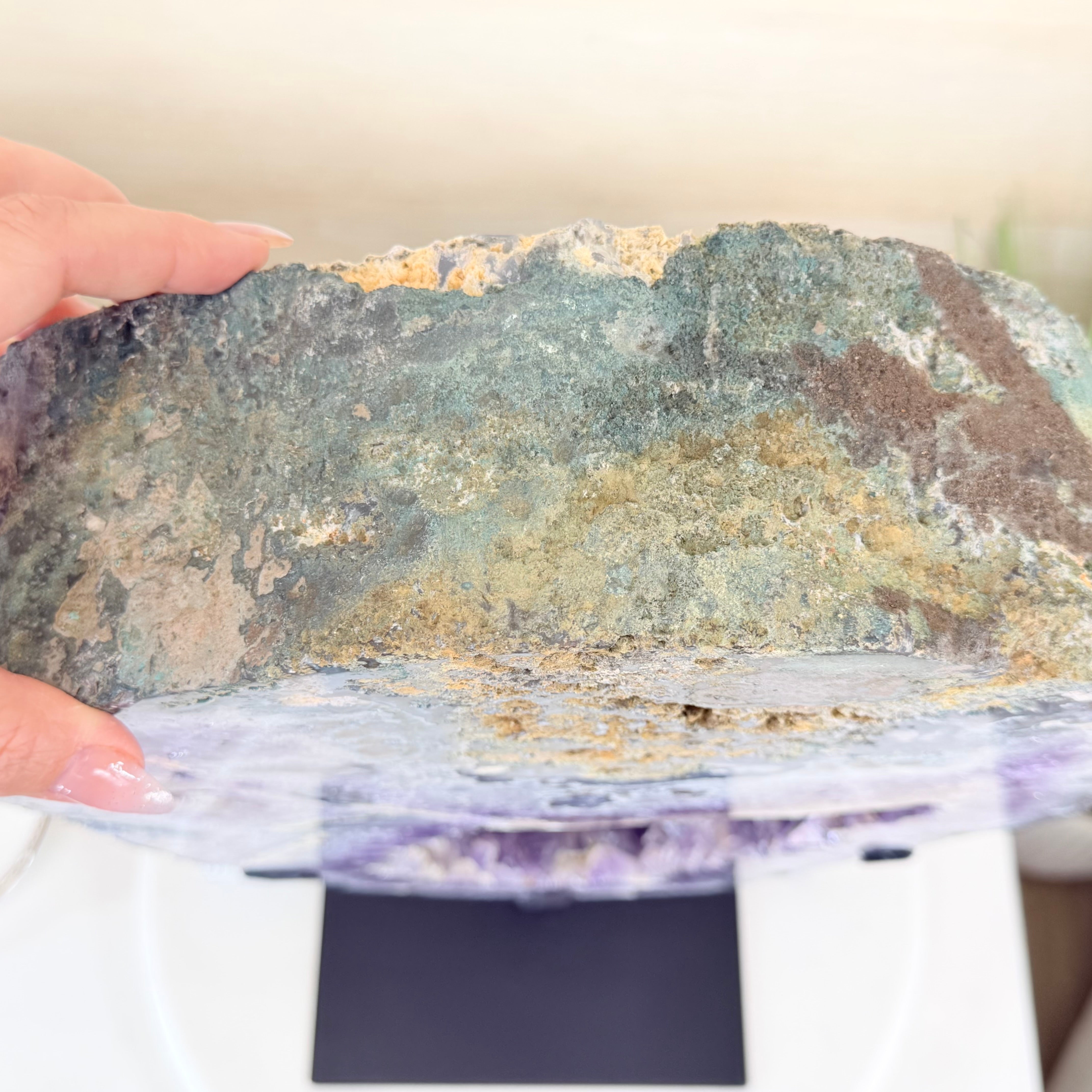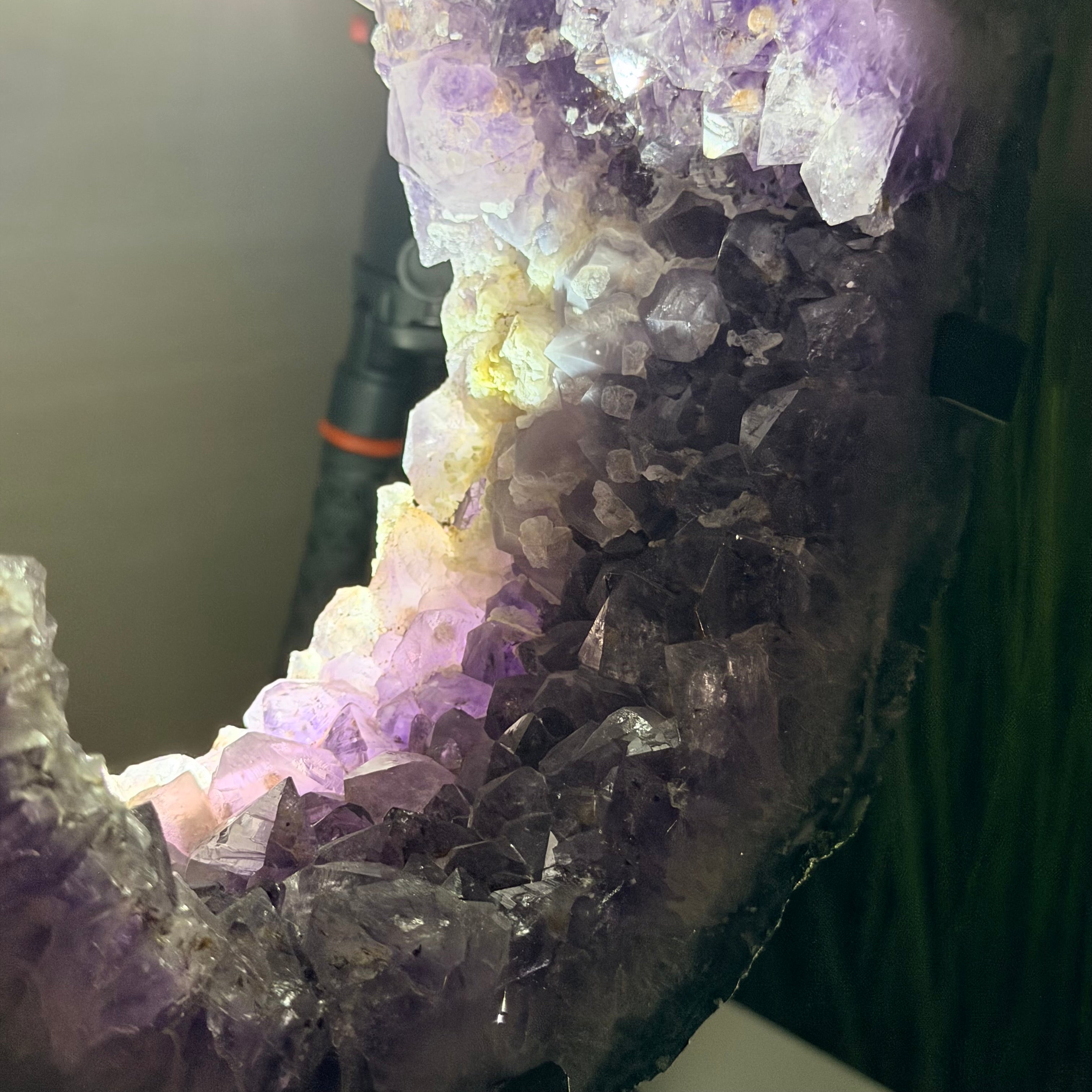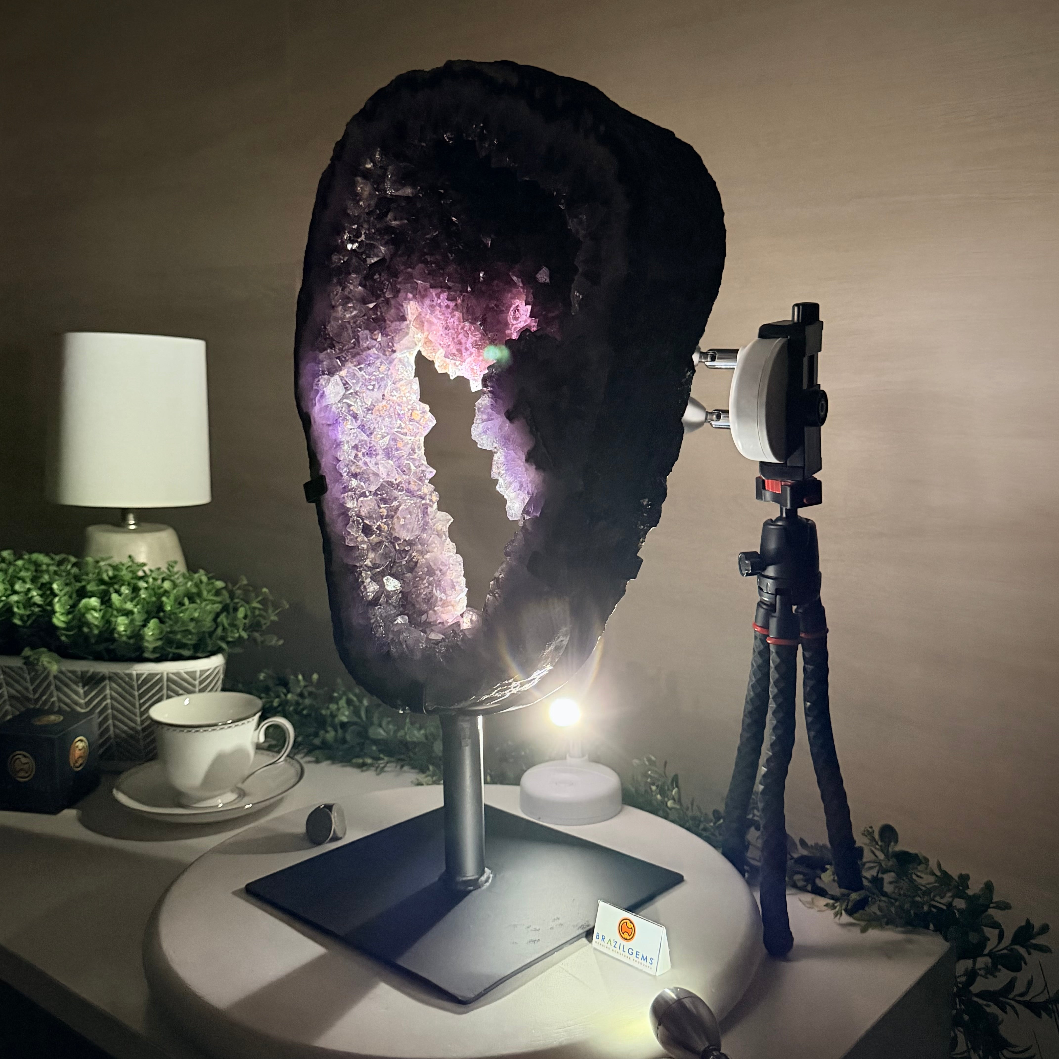 Unveil the charm of this natural Extra Quality Brazilian Amethyst Crystal "Portal" on a black metal fixed stand. This piece is smoothly polished on both the front and back with a rough natural outer shell. Very special!