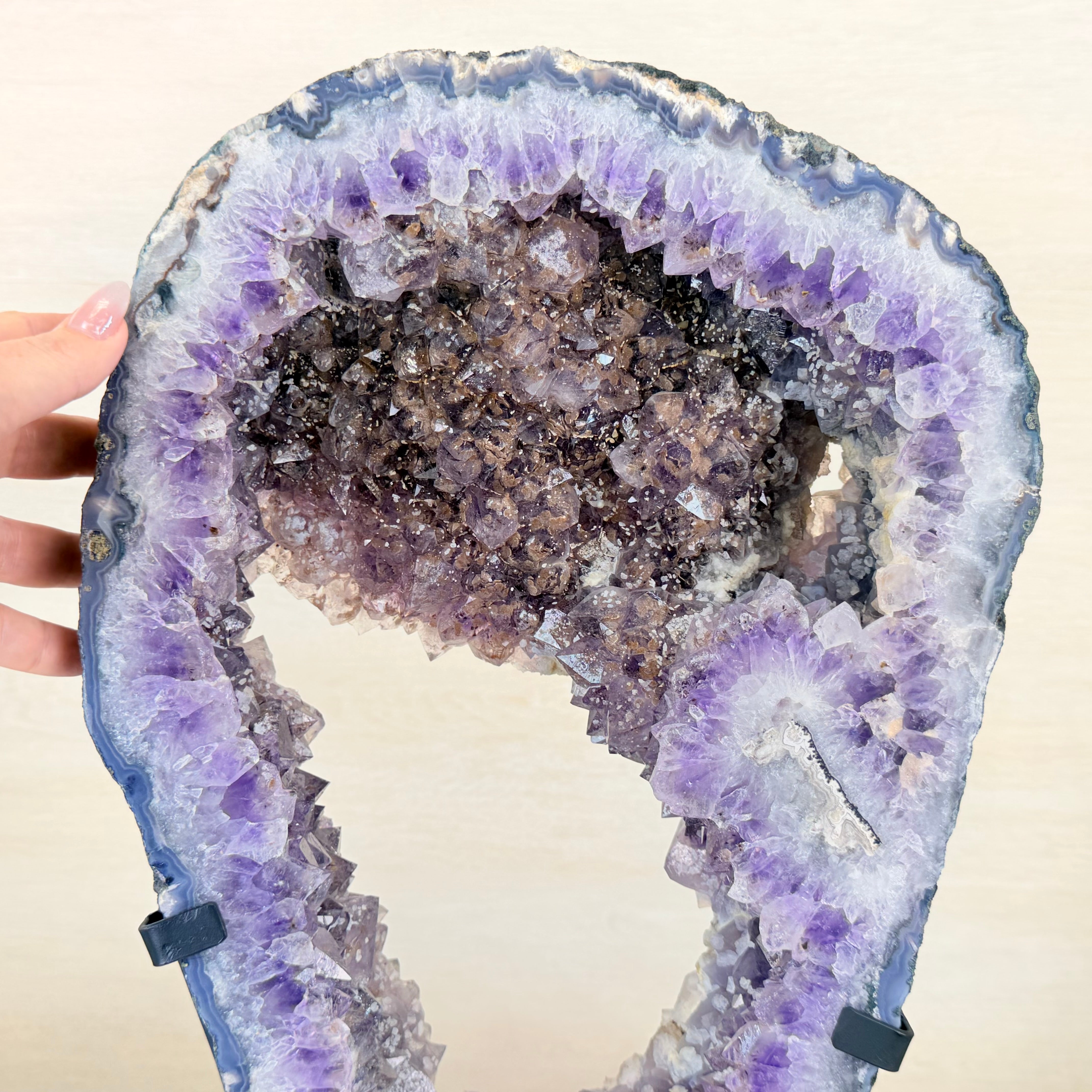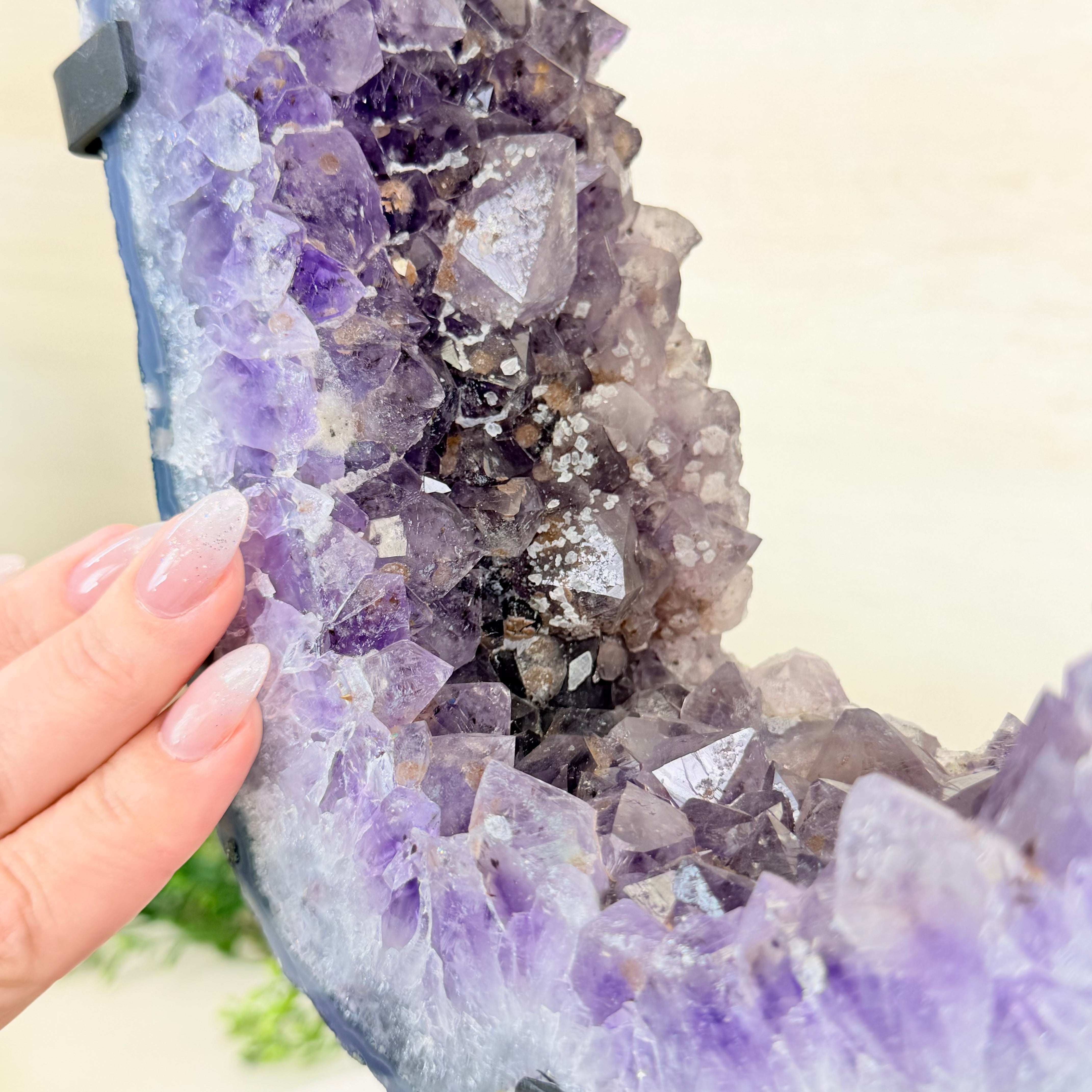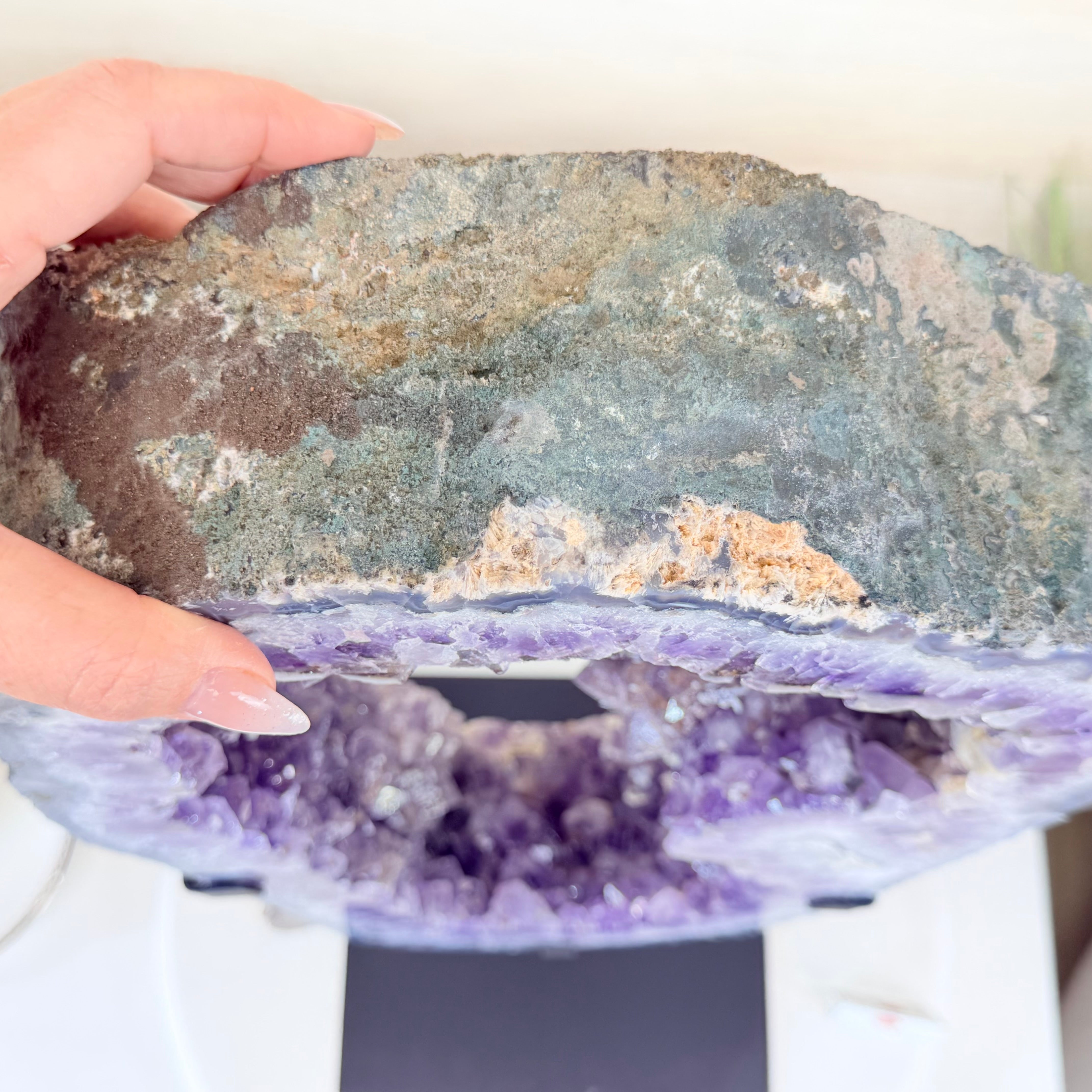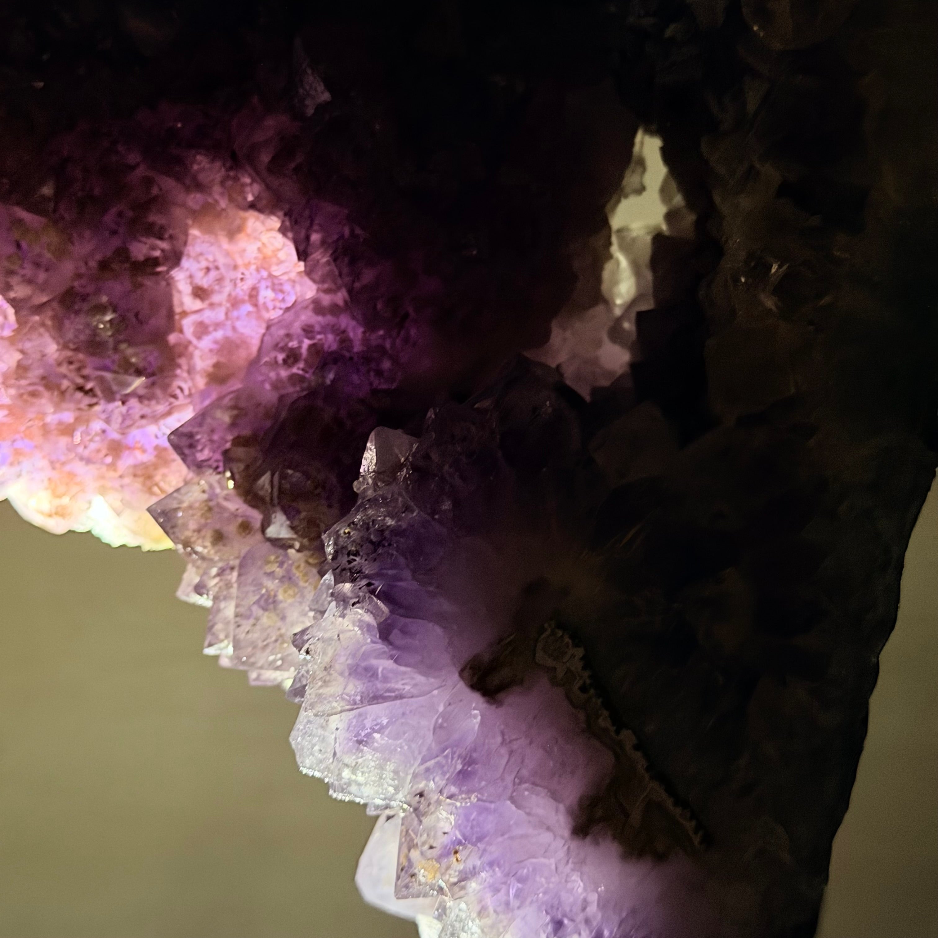 Unveil the charm of this natural Extra Quality Brazilian Amethyst Crystal "Portal" on a black metal fixed stand. This piece is smoothly polished on both the front and back with a rough natural outer shell. Very special!