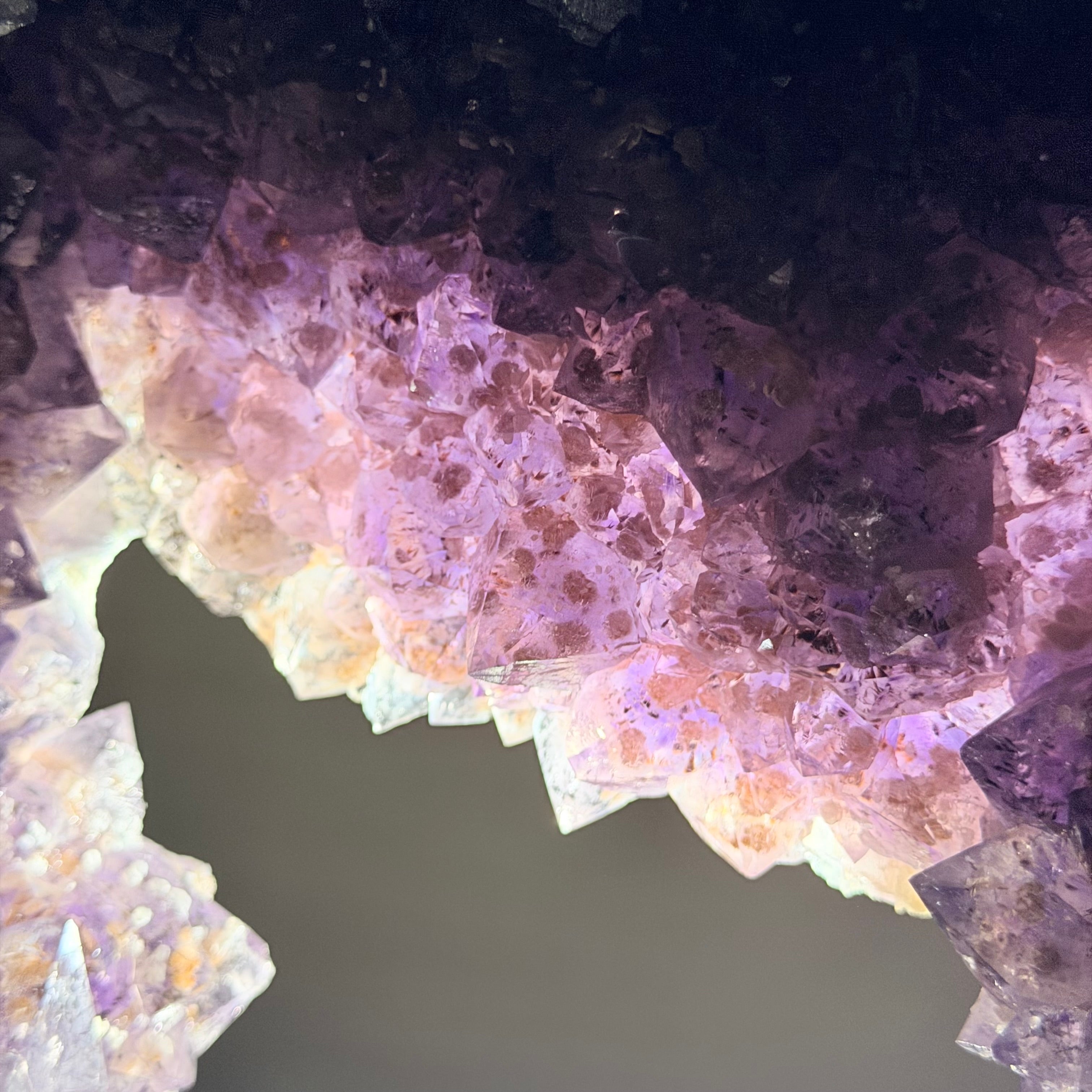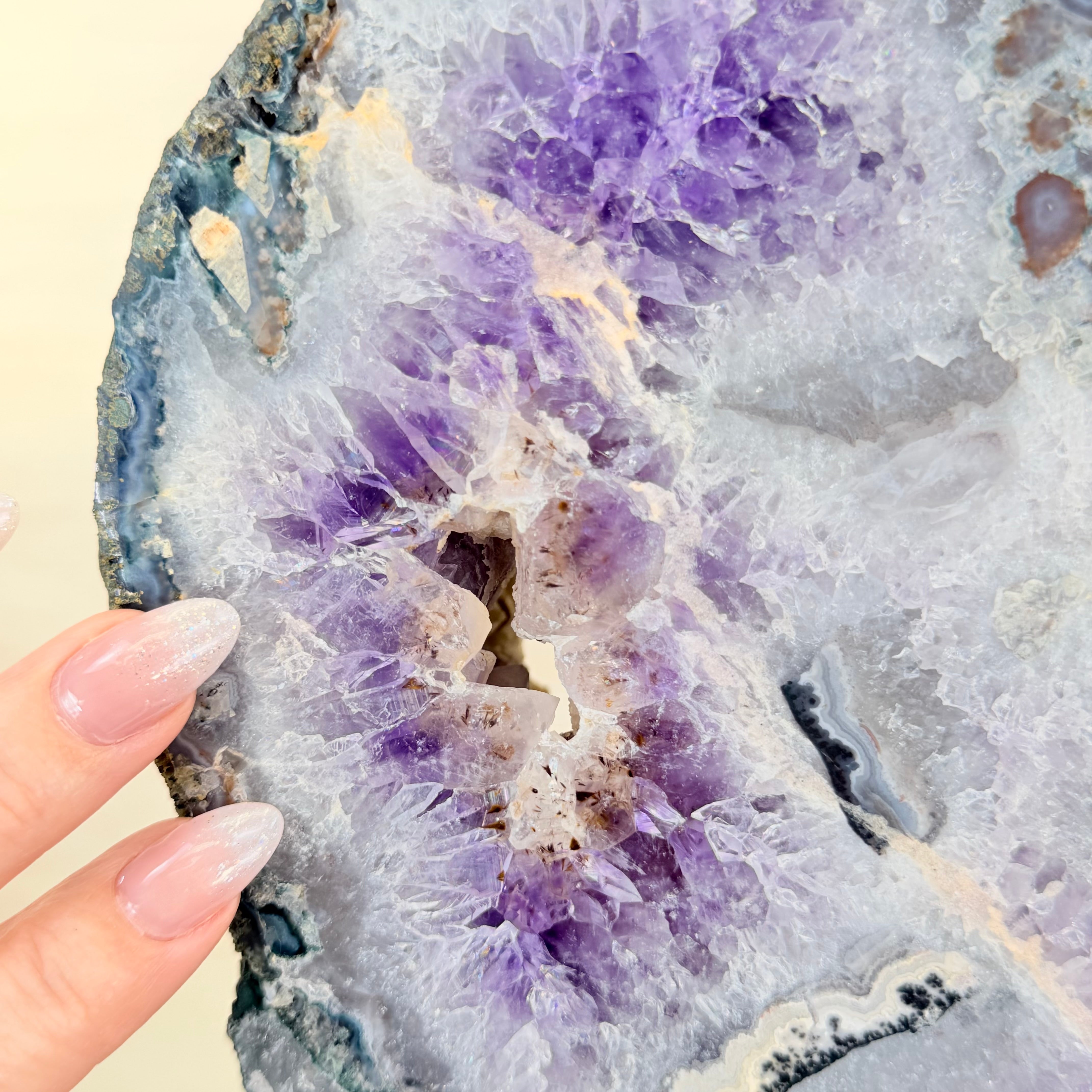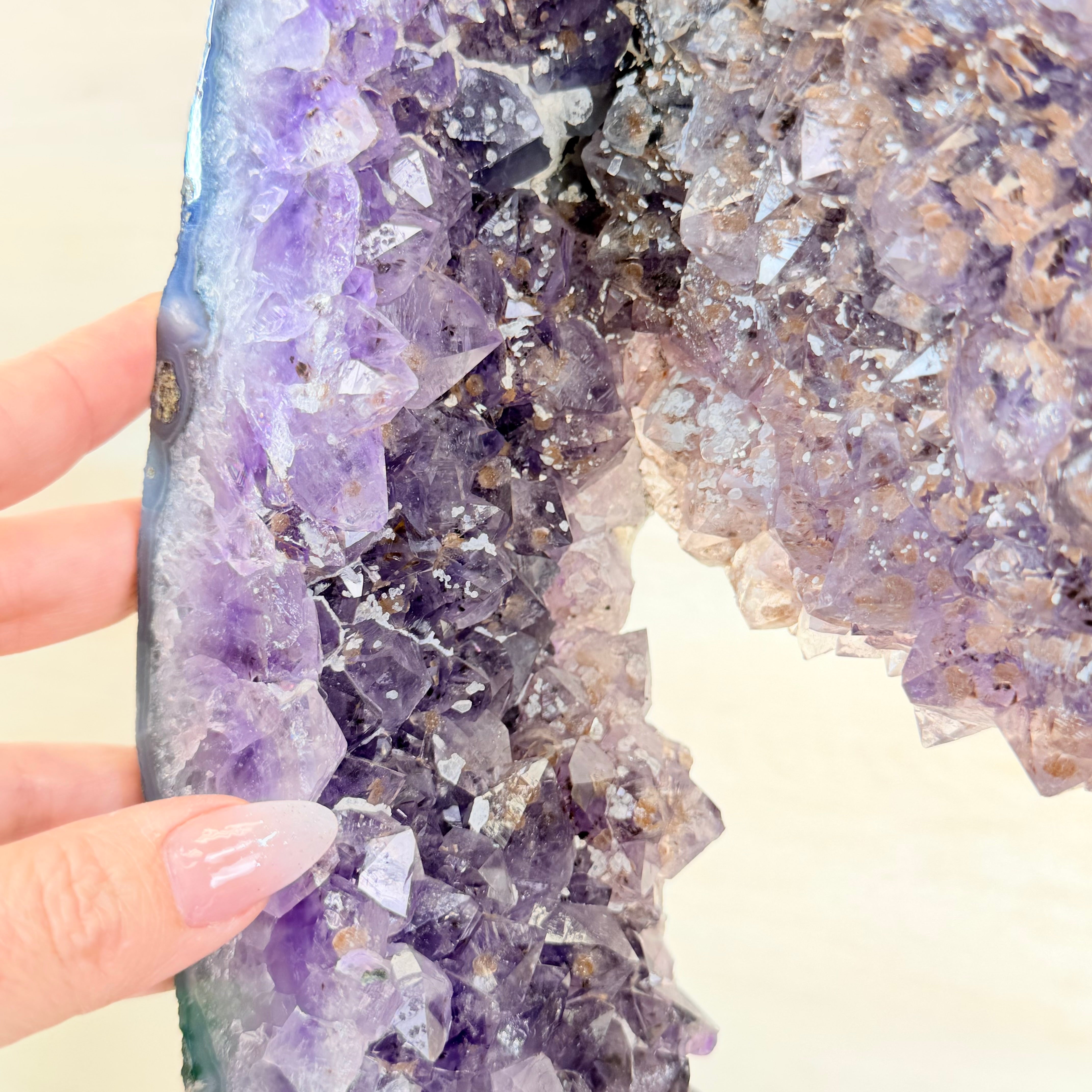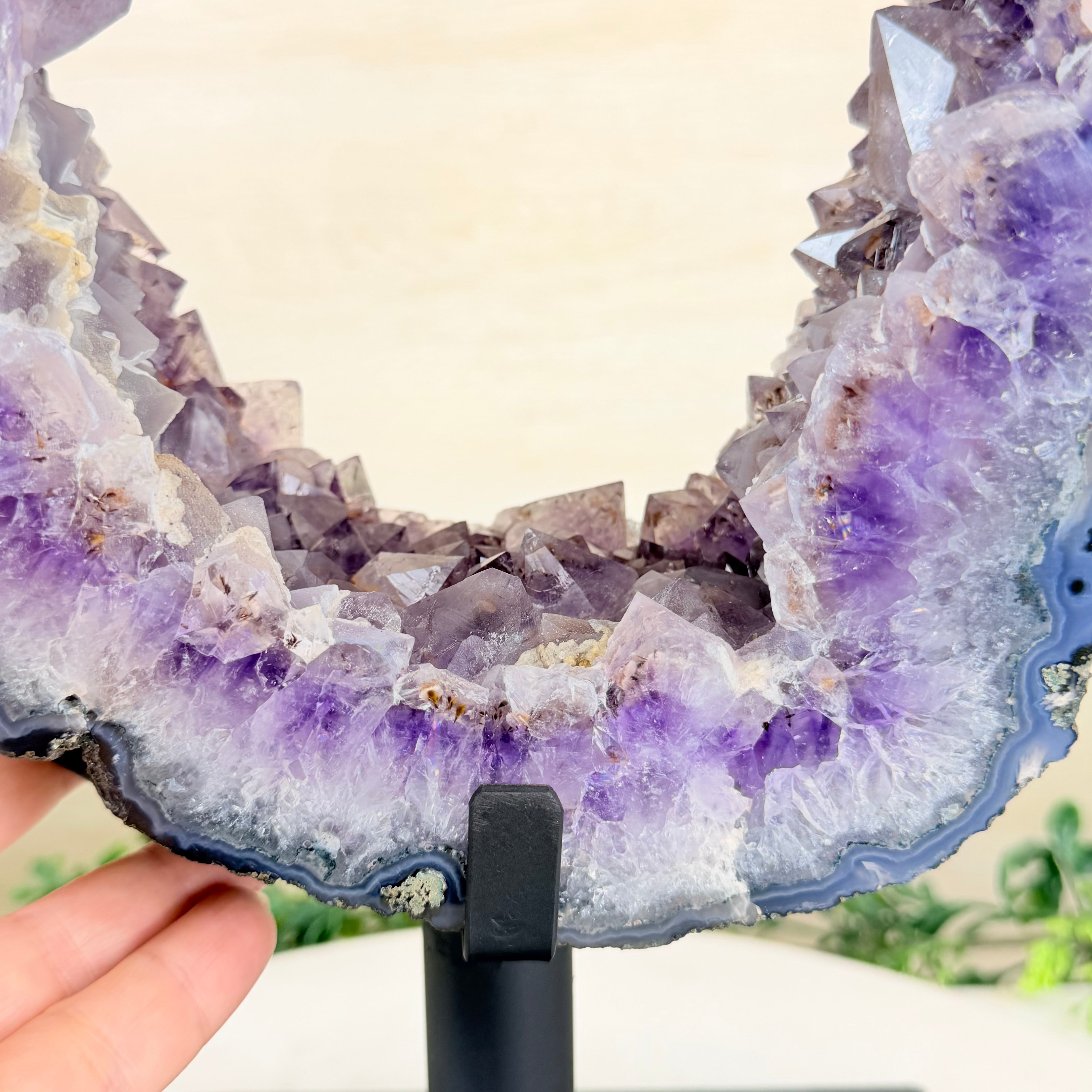 Unveil the charm of this natural Extra Quality Brazilian Amethyst Crystal "Portal" on a black metal fixed stand. This piece is smoothly polished on both the front and back with a rough natural outer shell. Very special!