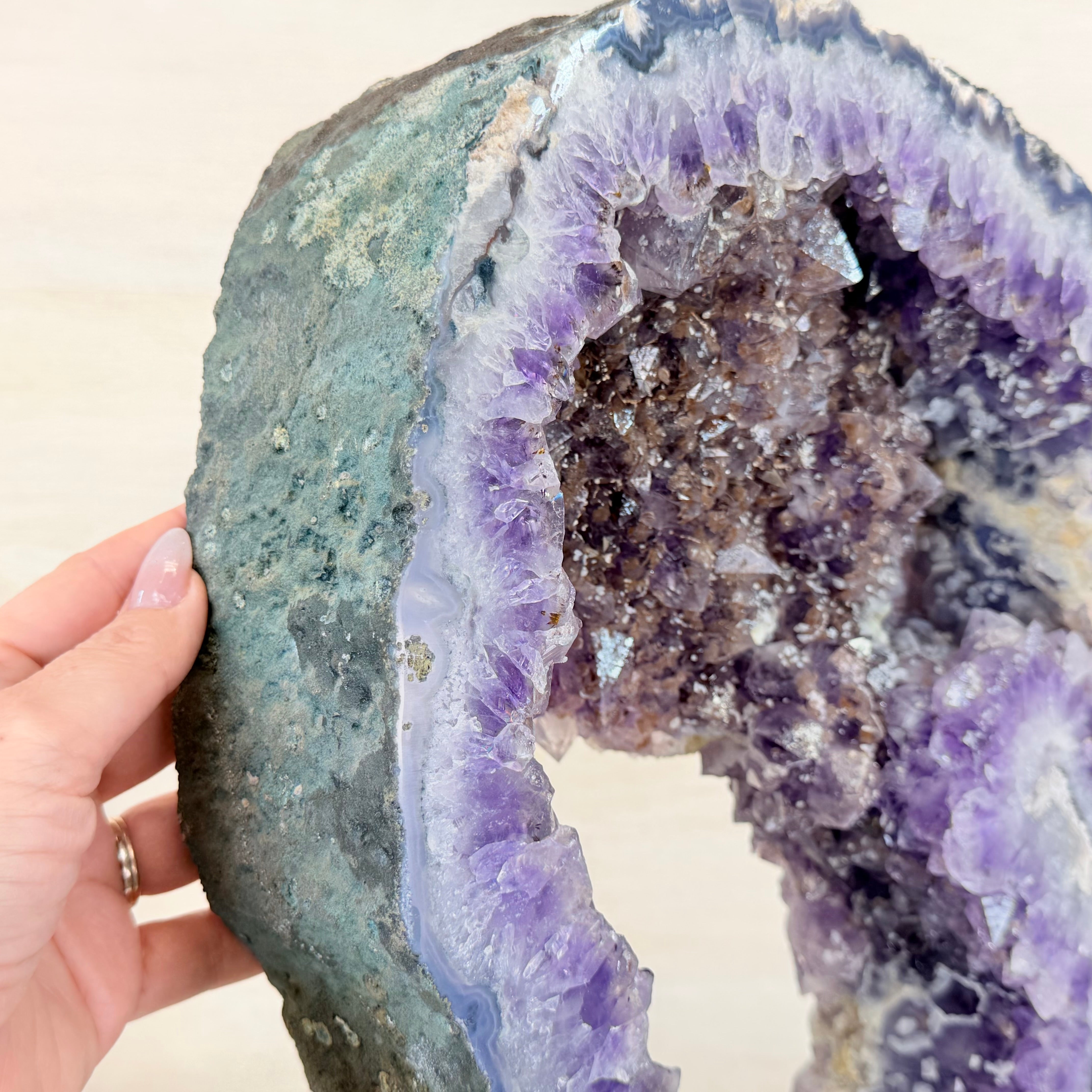 A crystal portal is often depicted as a mystical gateway or entrance formed with crystals, believed to connect different realms or dimensions. It will make a perfect focal point in your home or office. Add a small spotlight behind and watch it glow! It's definitely a gemstone to admire for generations to come.
