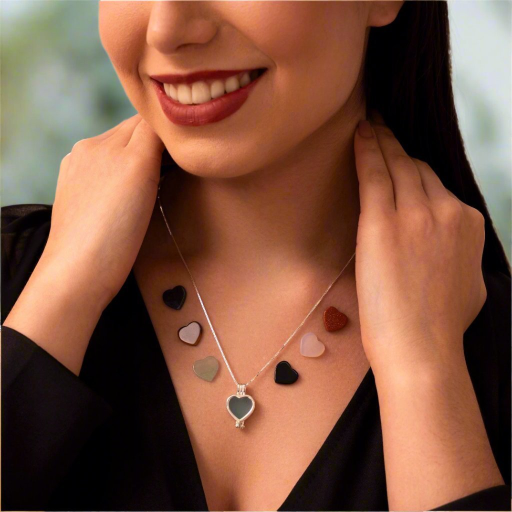 Radiate confidence and style with this stylish Sterling Silver 925 Heart Shaped Locket Necklace including 7 natural heart shaped gemstones. The interchangeable stones allow you to select one of the 7 options that best fit your look and feel for the day.