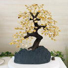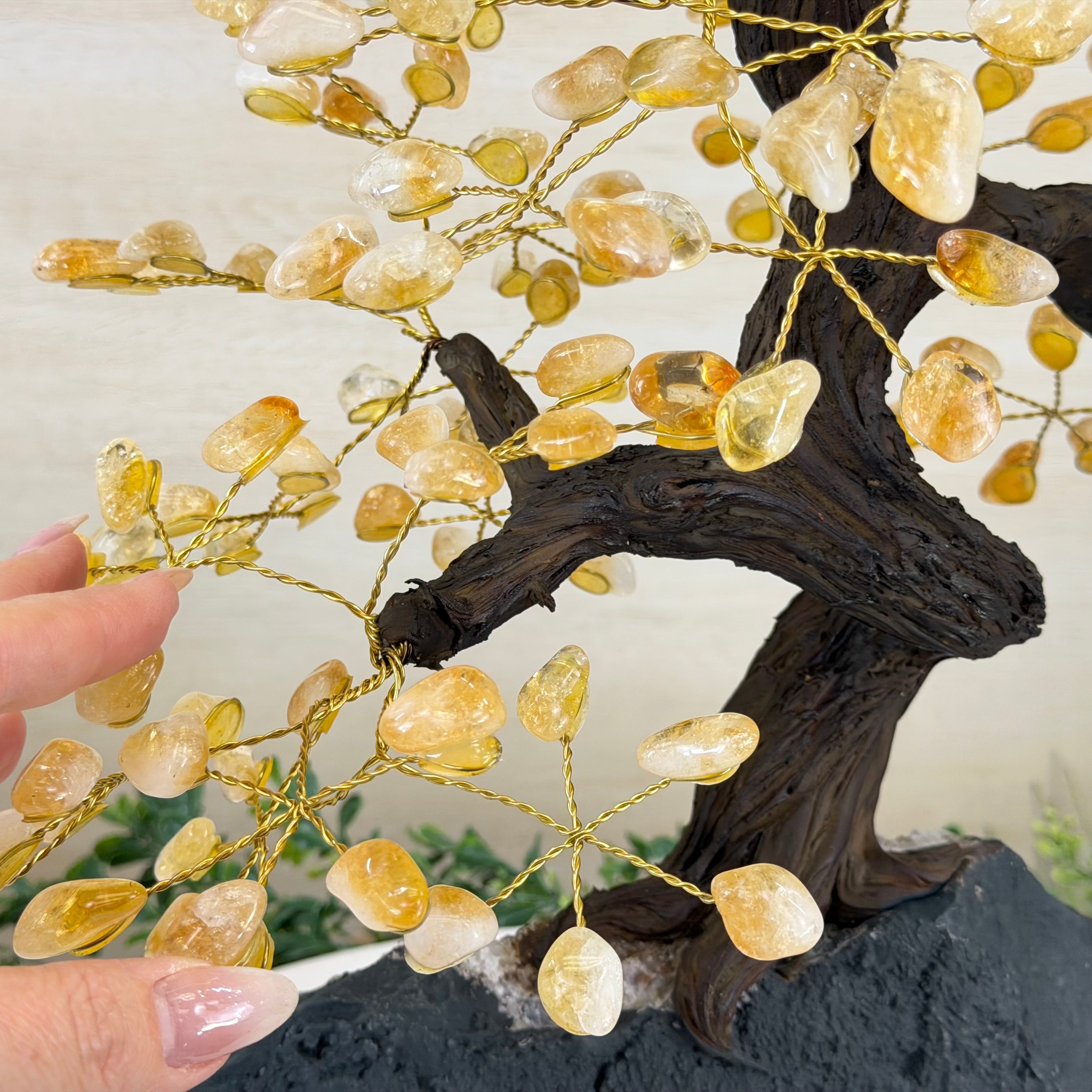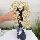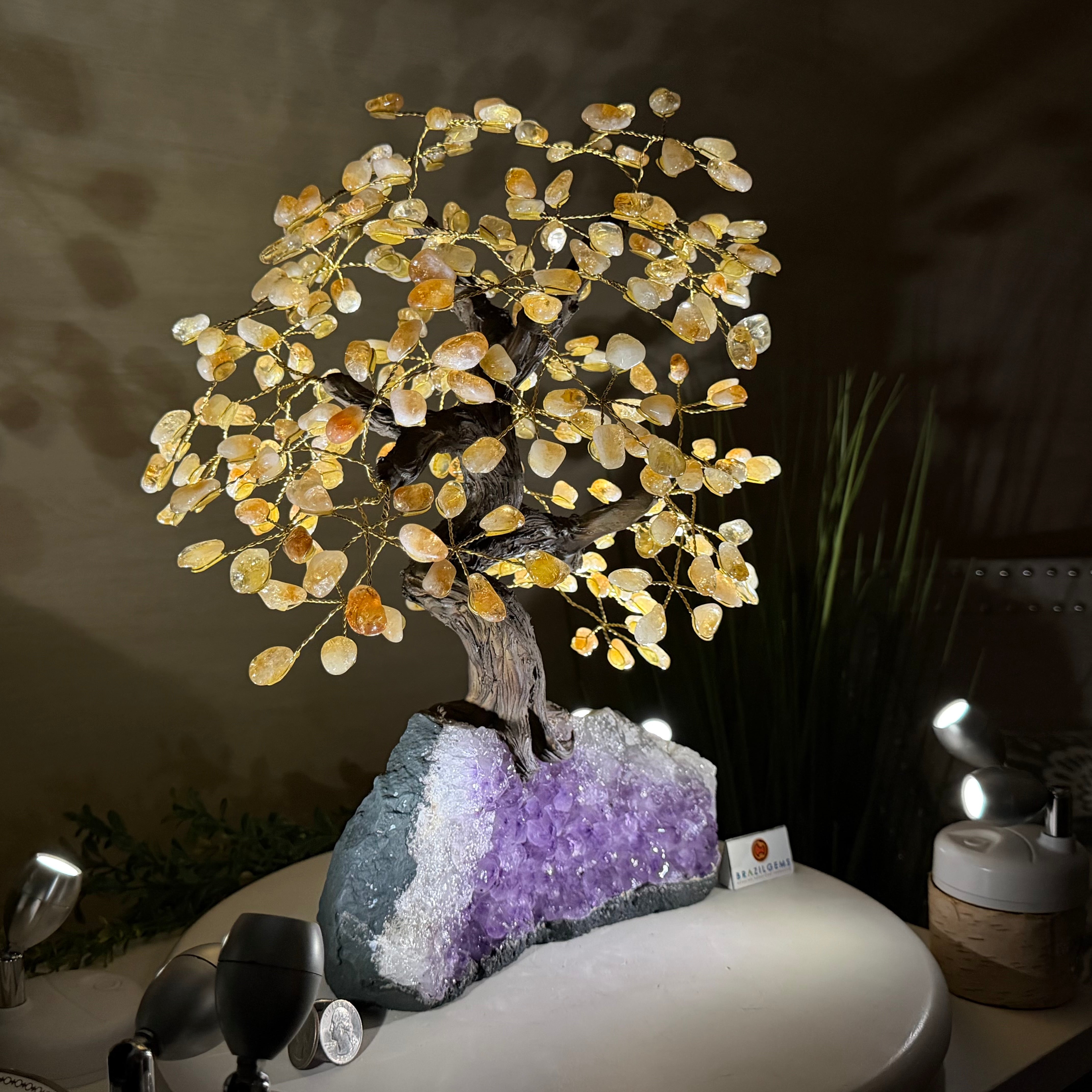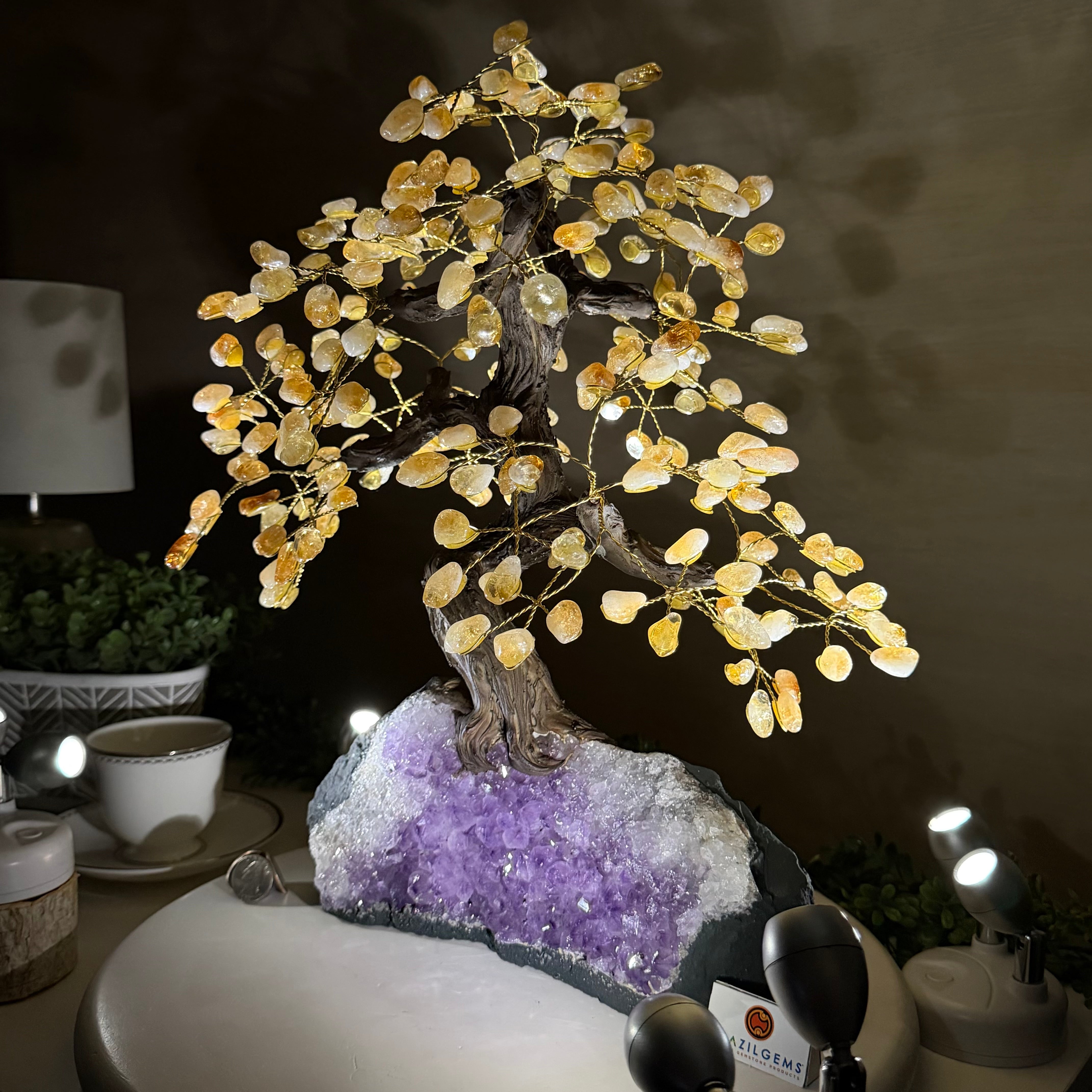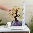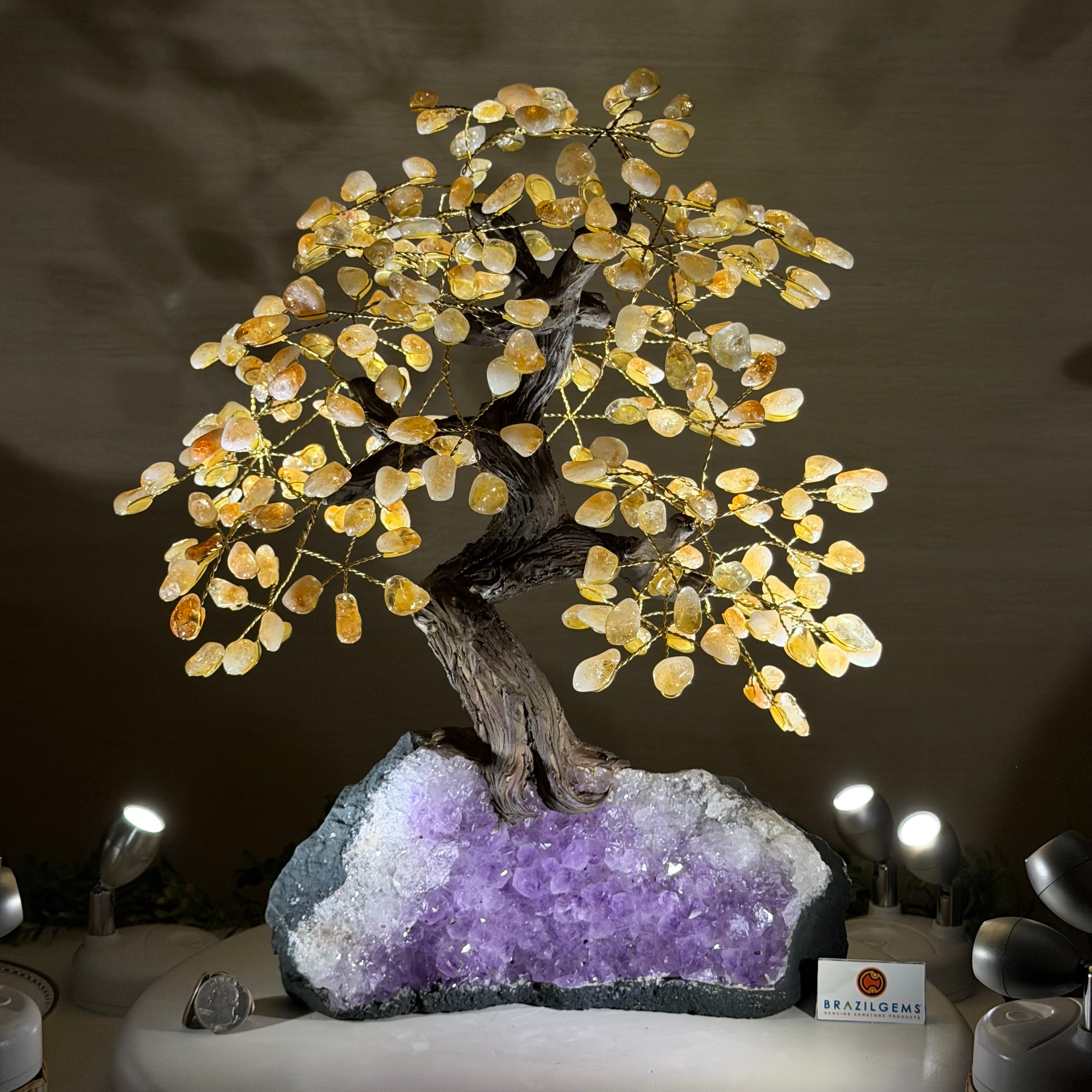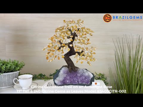 Citrine Bonsai Gemstone Tree on an Amethyst Cluster Base Handcrafted in Brazil, this striking gemstone tree stands approximately 17" tall and features a sturdy bonsai-style trunk and branches adorned with 240 tumbled Citrine gemstones as its leaves.