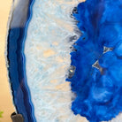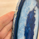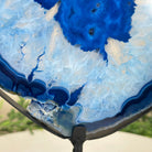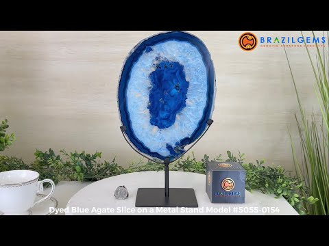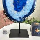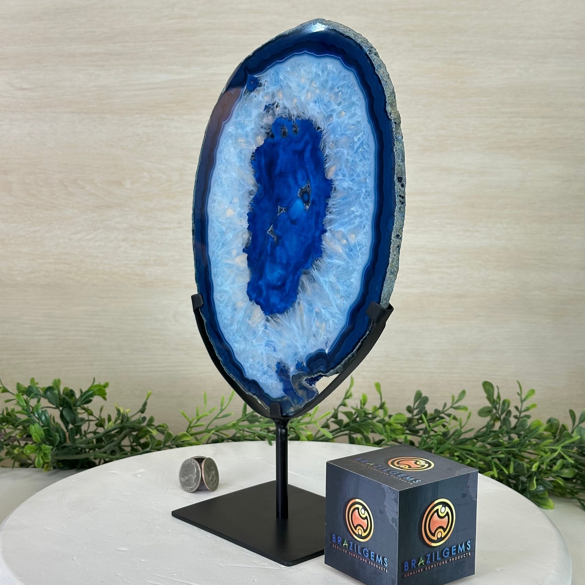 Enhance your decor with this bright slice of Brazilian Blue Agate (dyed blue) beautifully placed on a metal stand by Brazil Gems®. With its striking colors, well defined bands and druzy crystals, this is nature's work of millions of years now available to you.