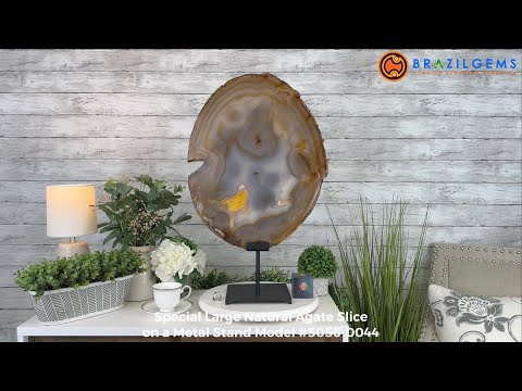 Brazil Gems® offers this Super Special all-natural large slice of Brazilian Agate, beautifully placed on a metal stand. This gemstone is unique and full of nature's colors built across millions of years. It will enhance any room décor with its striking color variations and well defined bands.