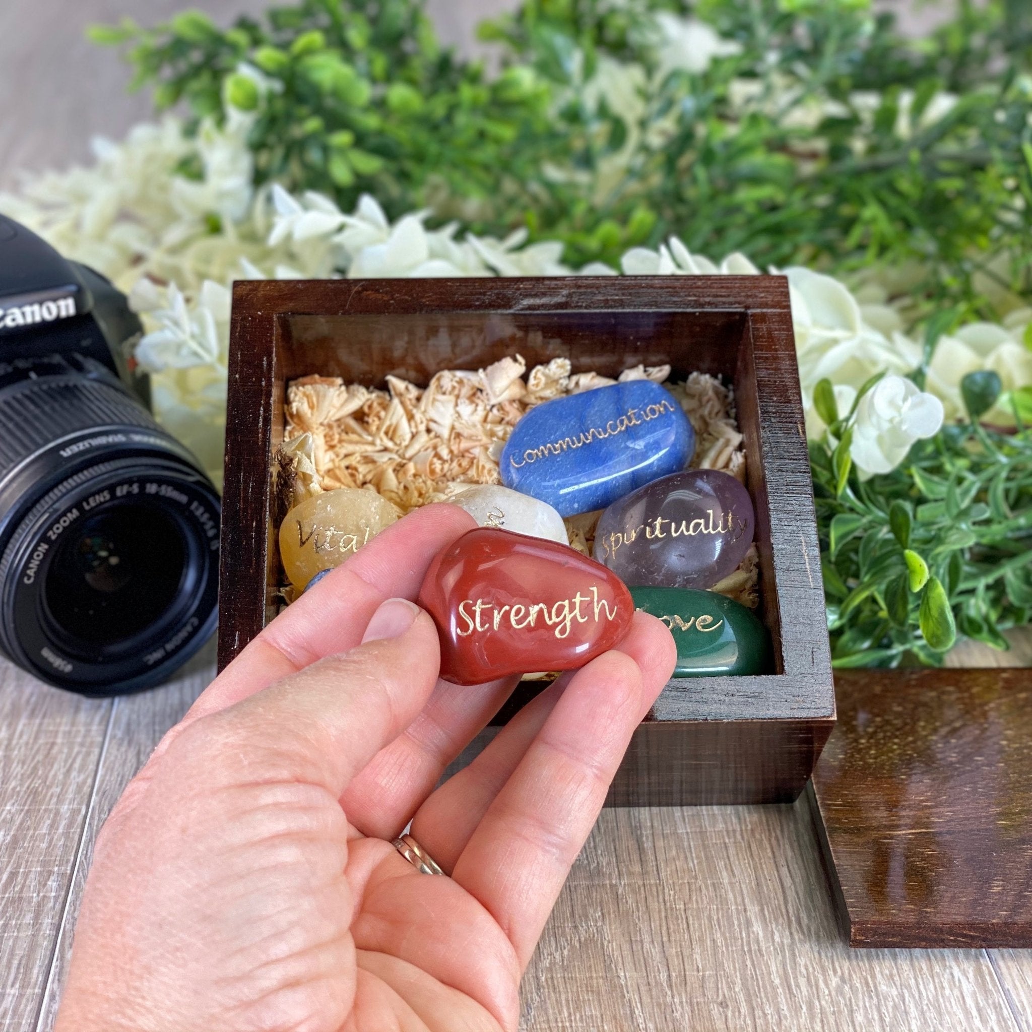 Handmade Chakras stone box set including 7 Chakra stones. This set includes special higher grade gemstones with bright colors and engraved healing words. It's great to keep in your home or office and also makes for a great gift to a loved one.