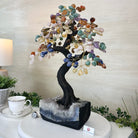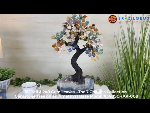 7-Chakra Gemstone Tree on Crystal Cluster Base Handcrafted in Brazil, this striking gemstone tree stands approximately 18" tall and features a sturdy resin trunk with 48 gracefully arched wire branches. Adorned with 240 polished chakra gemstones, it beautifully represents these seven chakras: