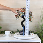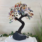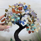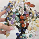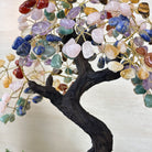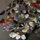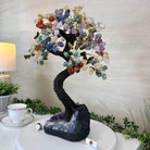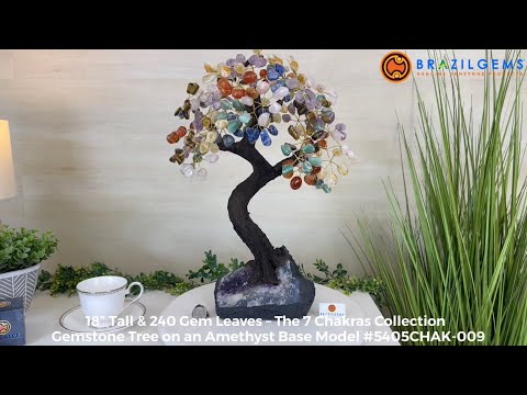 7-Chakra Gemstone Tree on Crystal Cluster Base Handcrafted in Brazil, this striking gemstone tree stands approximately 18" tall and features a sturdy resin trunk with 48 gracefully arched wire branches. Adorned with 240 polished chakra gemstones, it beautifully represents these seven chakras: