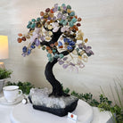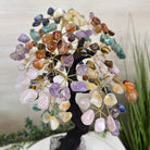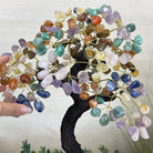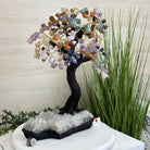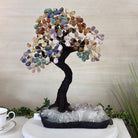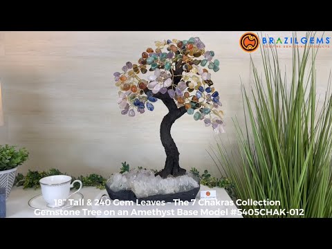 7-Chakra Gemstone Tree on Crystal Cluster Base Handcrafted in Brazil, this striking gemstone tree stands approximately 18" tall and features a sturdy resin trunk with 48 gracefully arched wire branches. Adorned with 240 polished chakra gemstones, it beautifully represents these seven chakras: