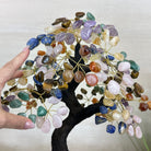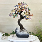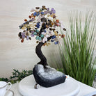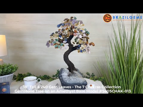 7-Chakra Gemstone Tree on Crystal Cluster Base Handcrafted in Brazil, this striking gemstone tree stands approximately 18" tall and features a sturdy resin trunk with 48 gracefully arched wire branches. Adorned with 240 polished chakra gemstones, it beautifully represents these seven chakras: