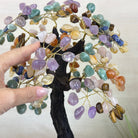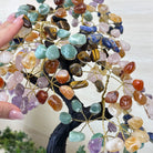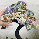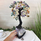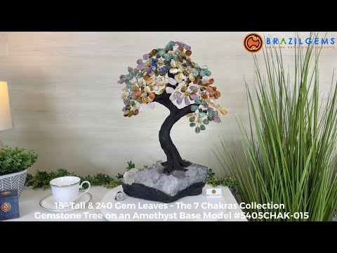 7-Chakra Gemstone Tree on Crystal Cluster Base Handcrafted in Brazil, this striking gemstone tree stands approximately 18" tall and features a sturdy resin trunk with 48 gracefully arched wire branches. Adorned with 240 polished chakra gemstones, it beautifully represents these seven chakras:
