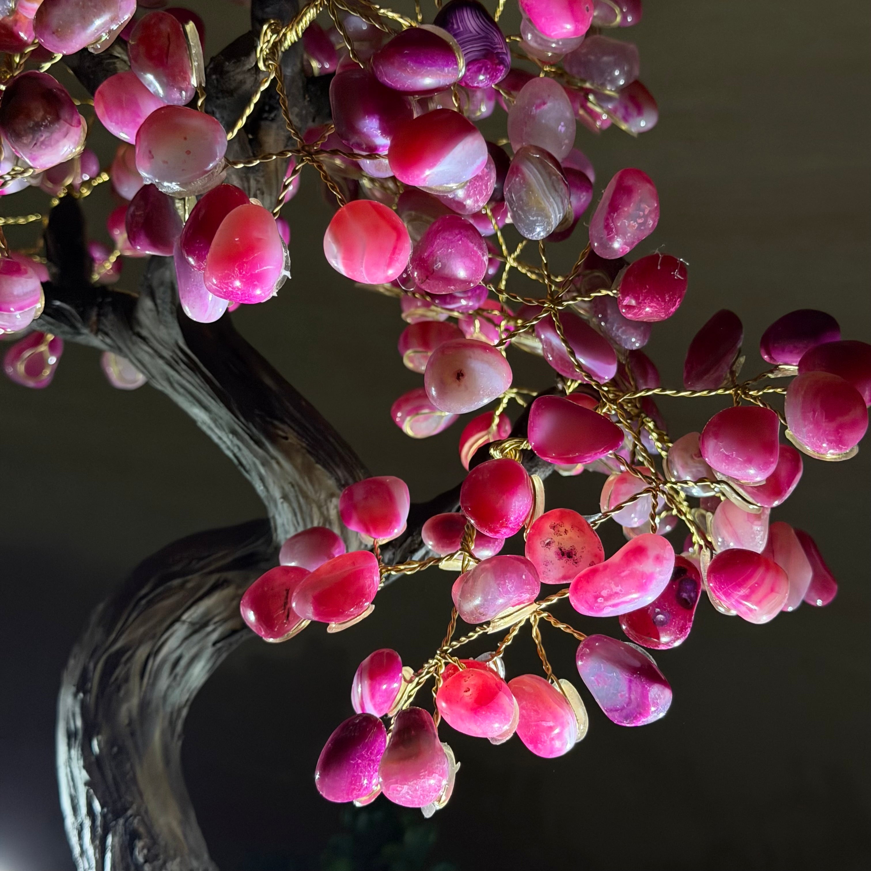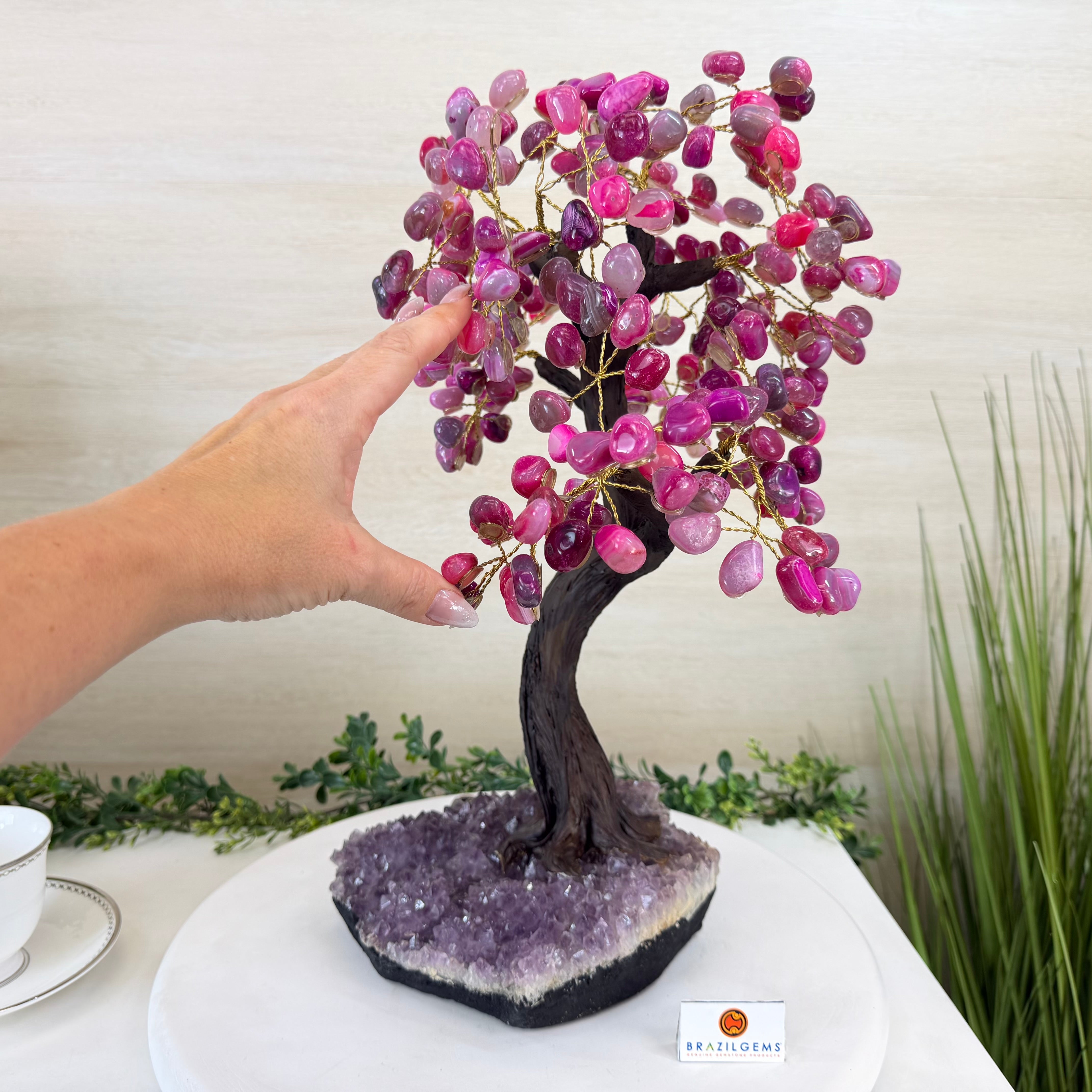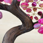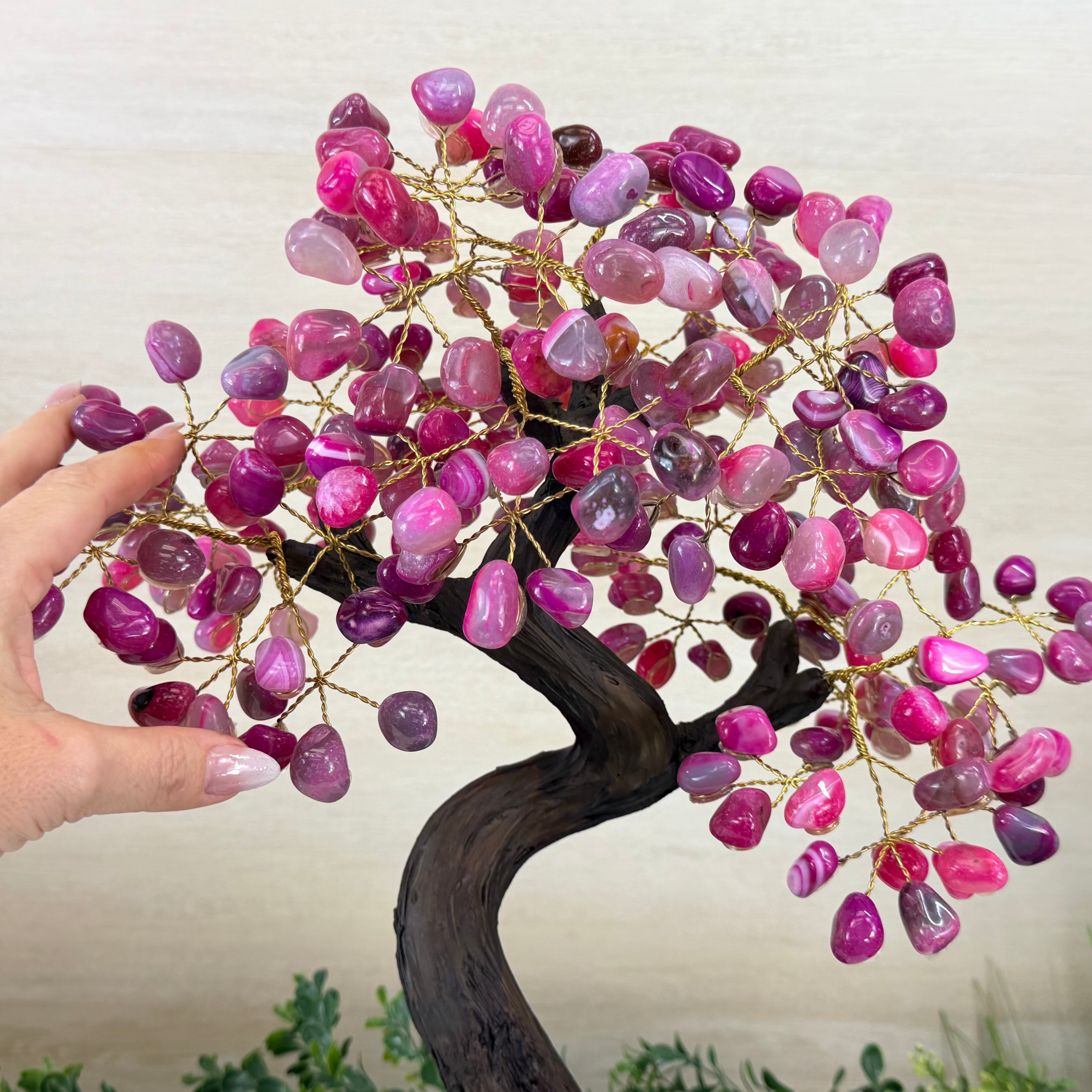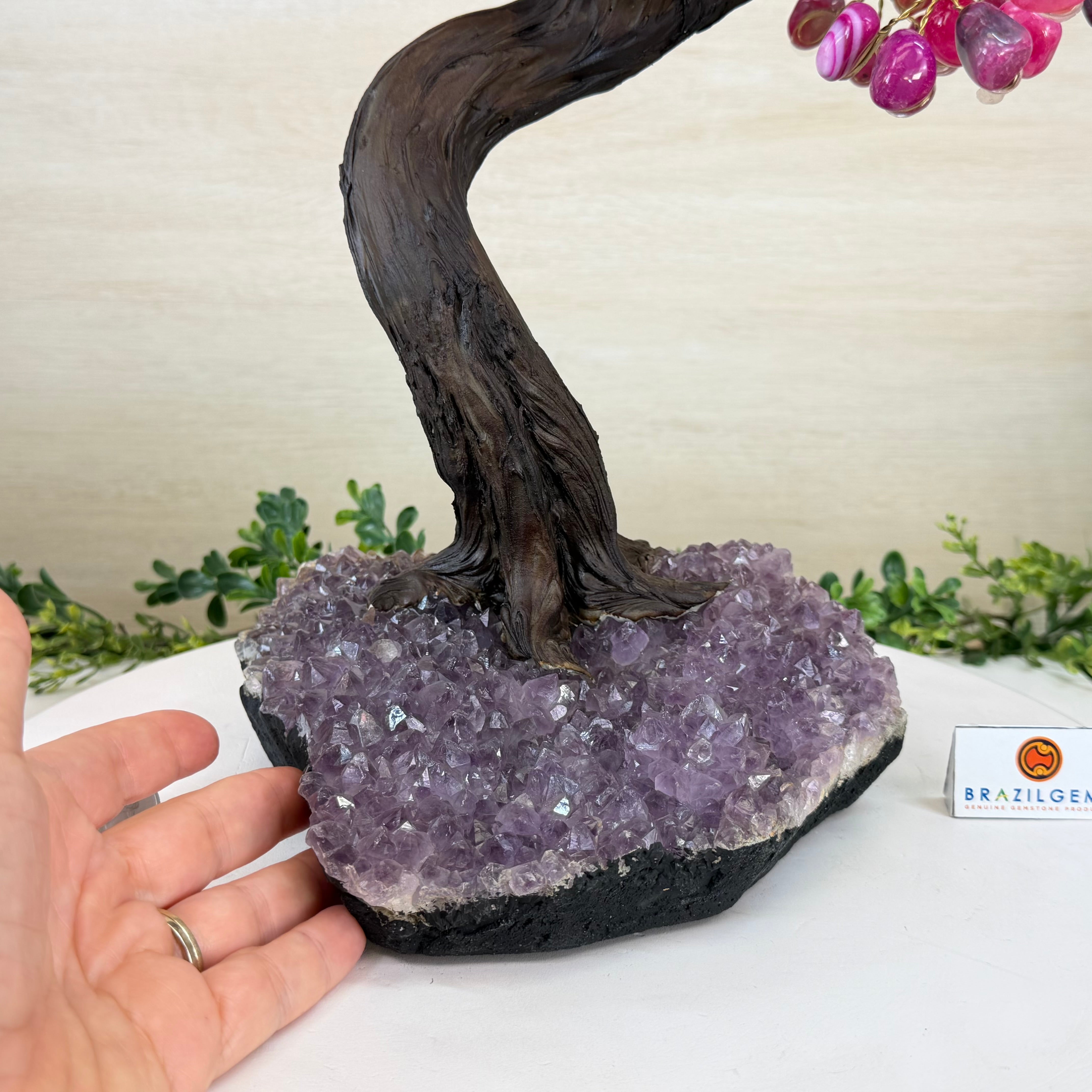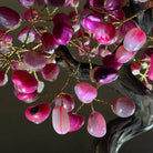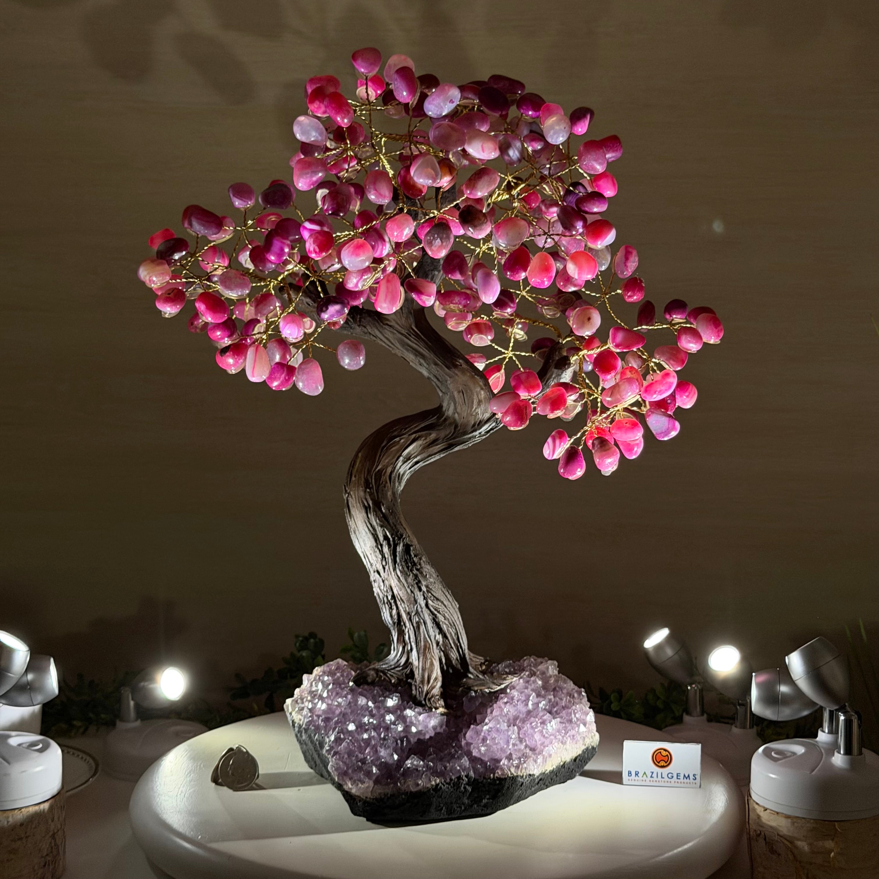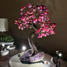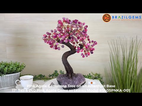 Pink Agate Bonsai Gemstone Tree on an Amethyst Cluster Base Handcrafted in Brazil, this striking gemstone tree stands approximately 17" tall and features a sturdy bonsai style trunk and branches adorned with 240 tumbled Pink Agate gemstones as leaves.