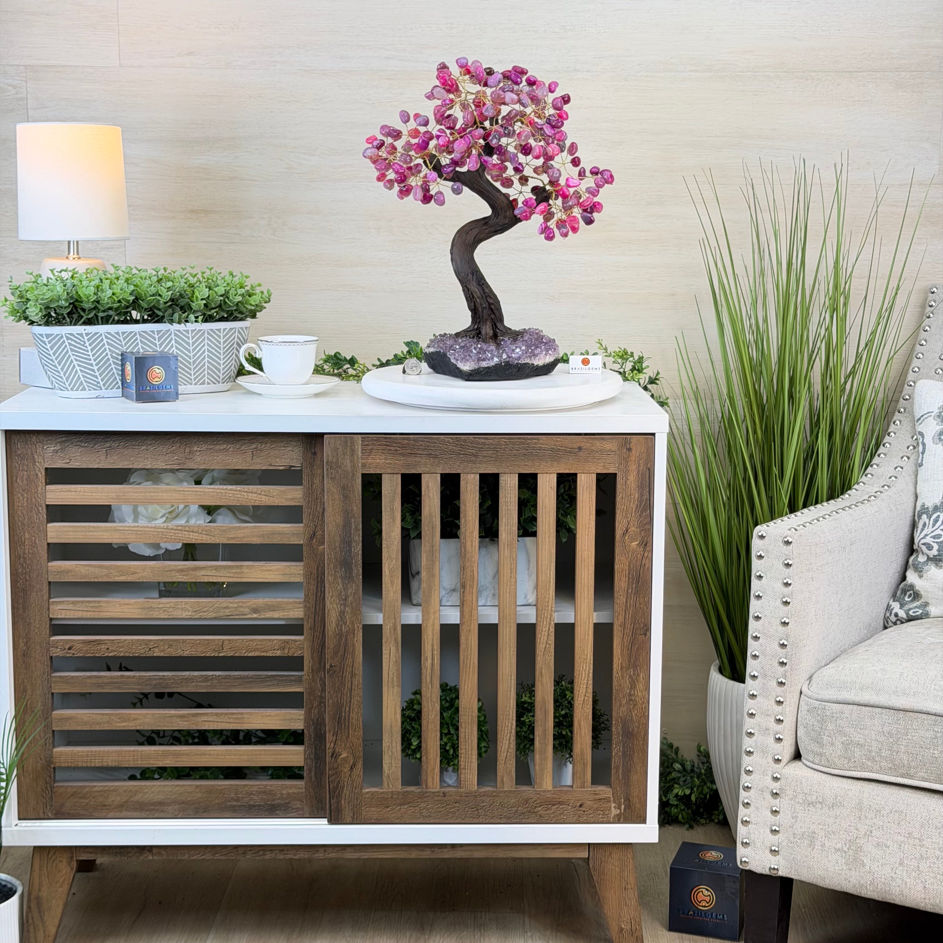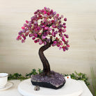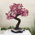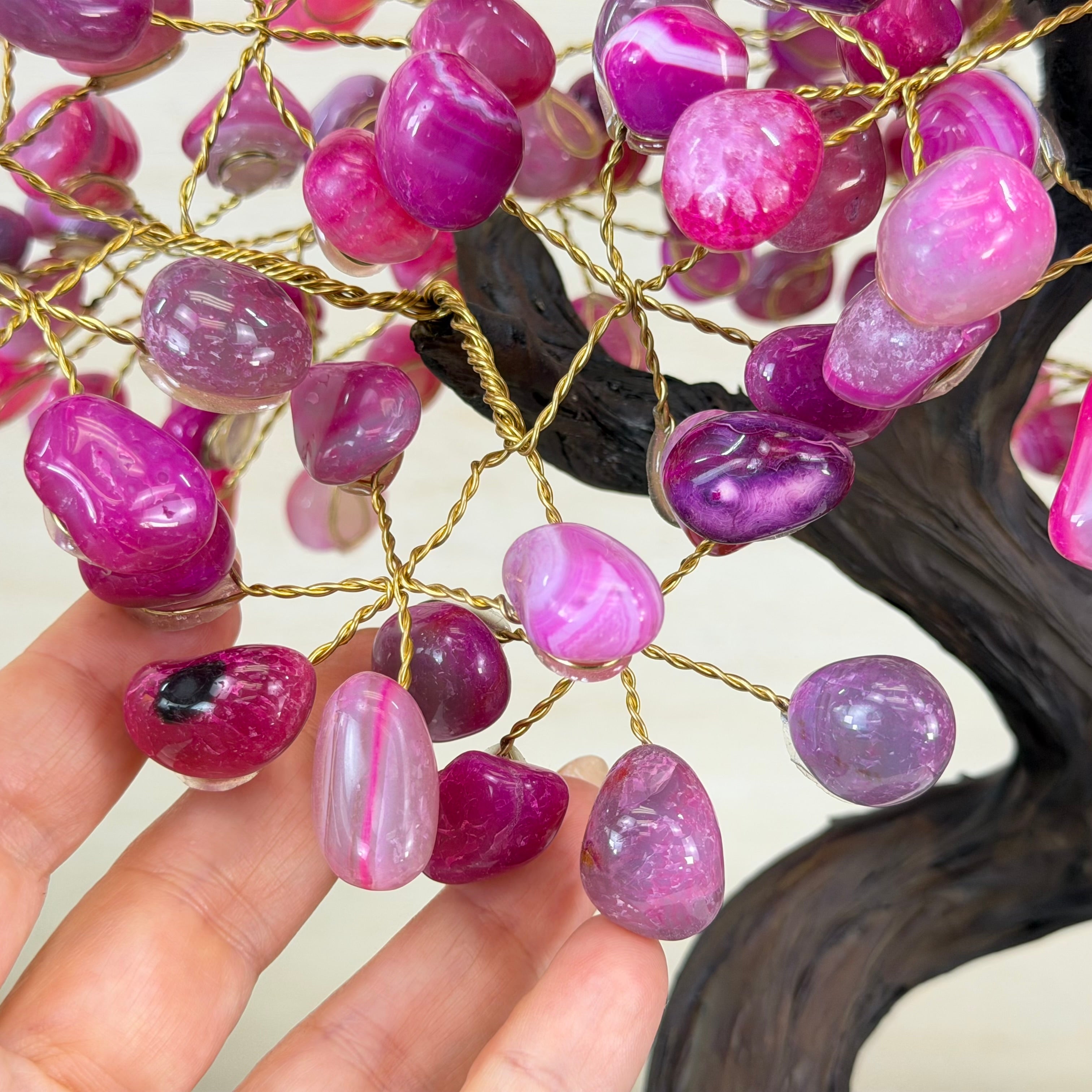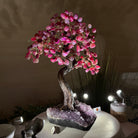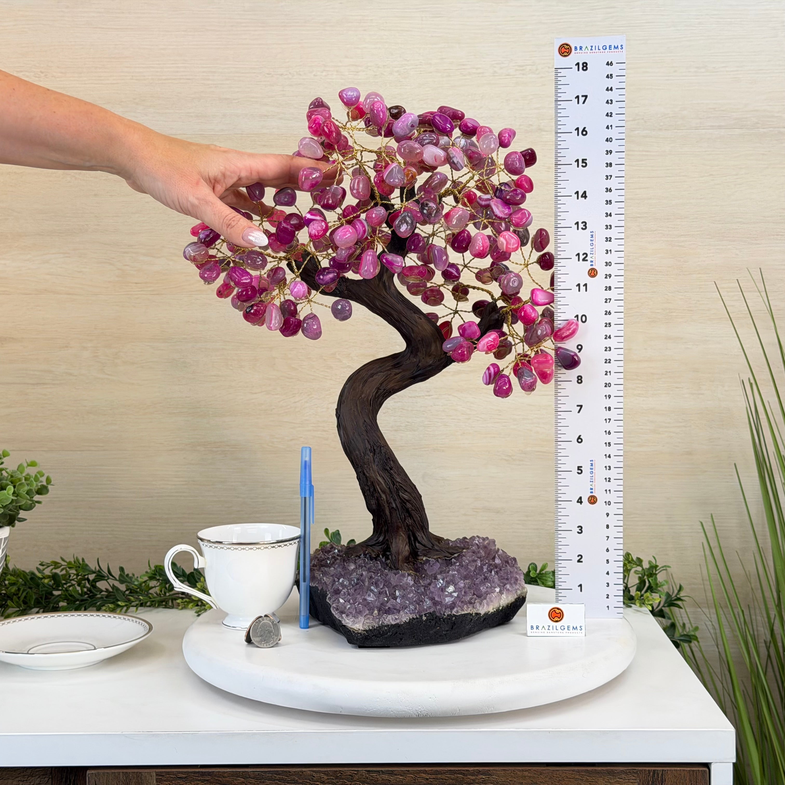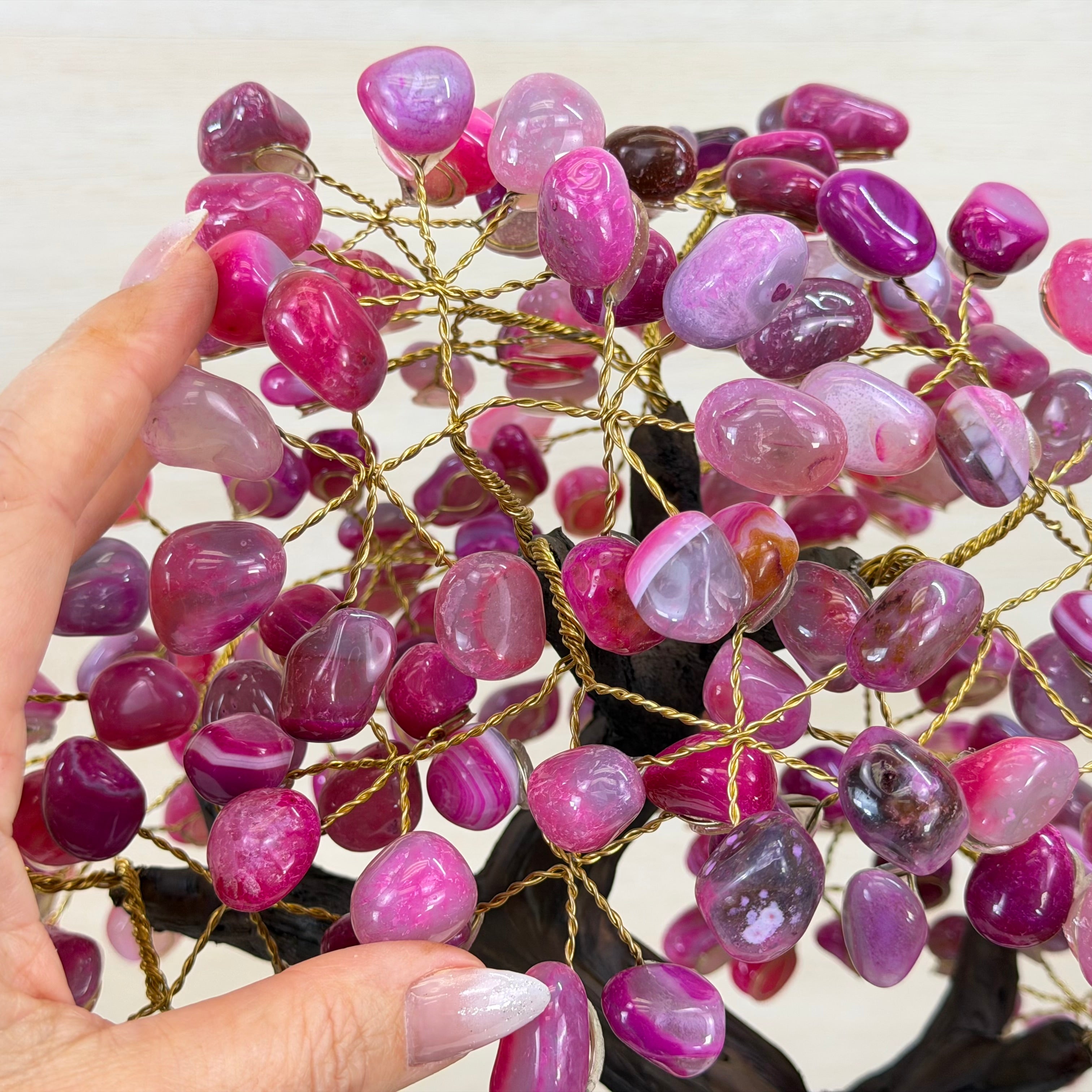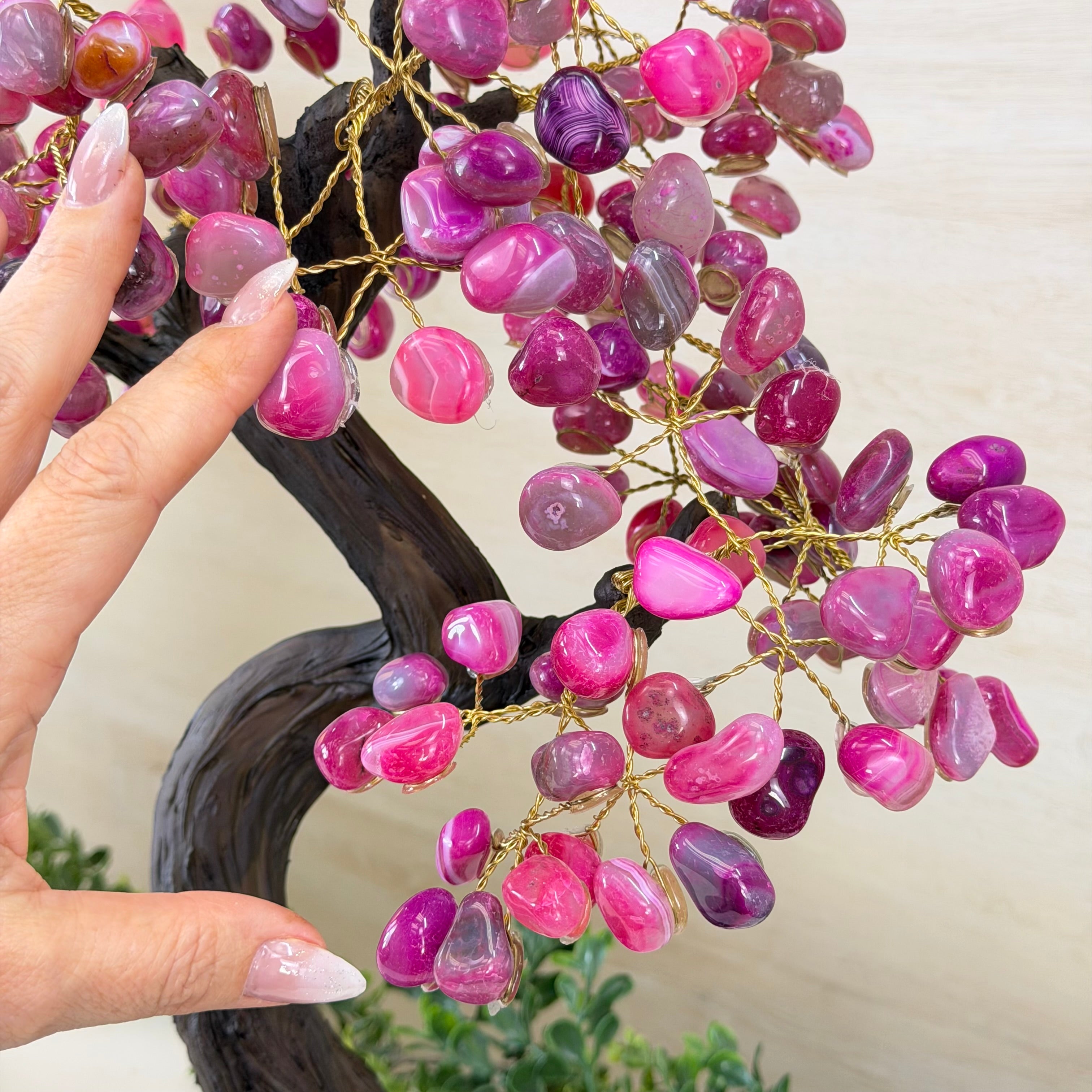Pink Agate Bonsai Gemstone Tree on an Amethyst Cluster Base Handcrafted in Brazil, this striking gemstone tree stands approximately 17" tall and features a sturdy bonsai style trunk and branches adorned with 240 tumbled Pink Agate gemstones as leaves.