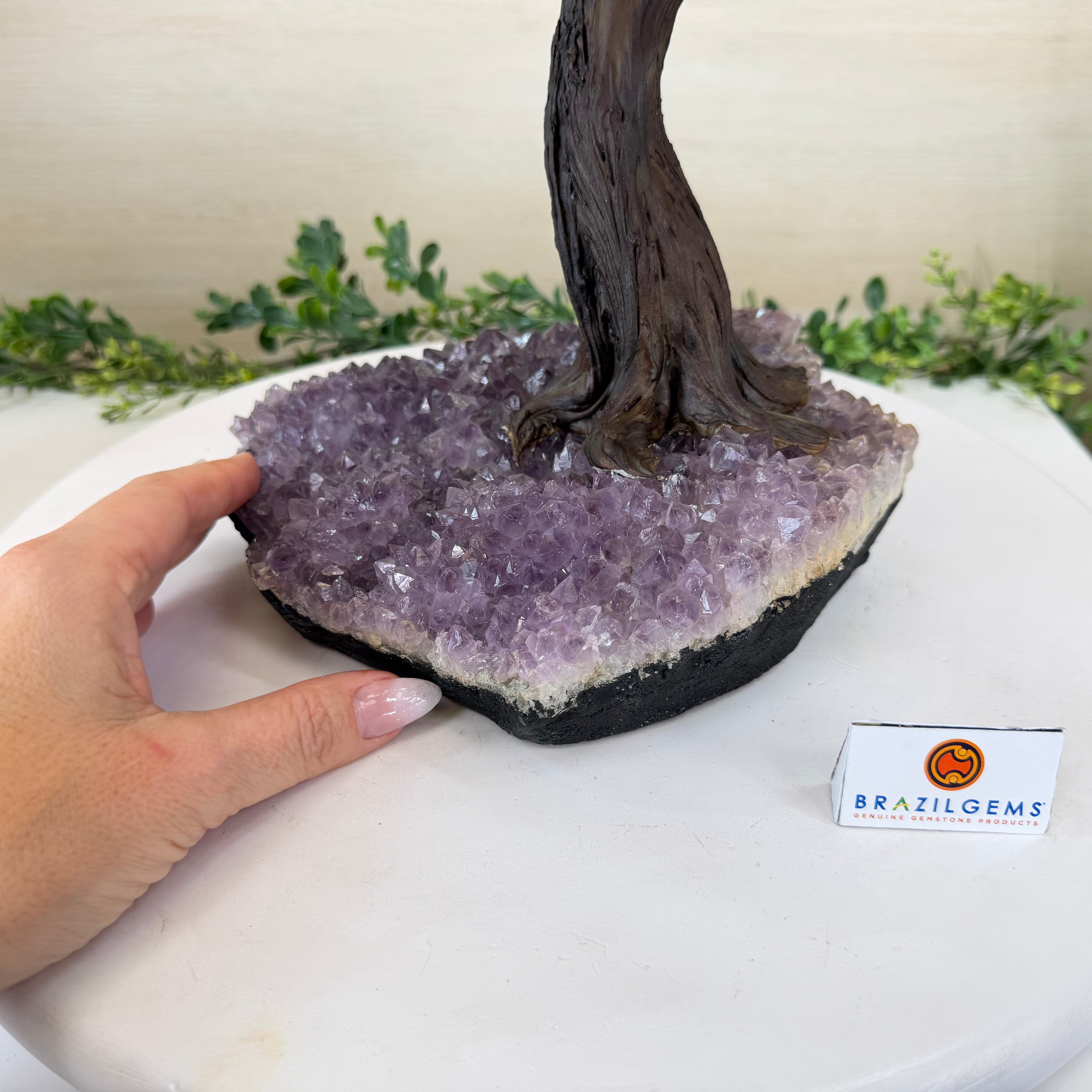 The process to make a gemstone tree like this is very extensive and meticulous. A special polished Amethyst cluster is selected for the base, the resin trunk and branches are crafted into a bonsai style by artisans in Brazil and then each gemstone is glued to the tree by hand. The result is a work of art that radiates harmony, care, and intention.