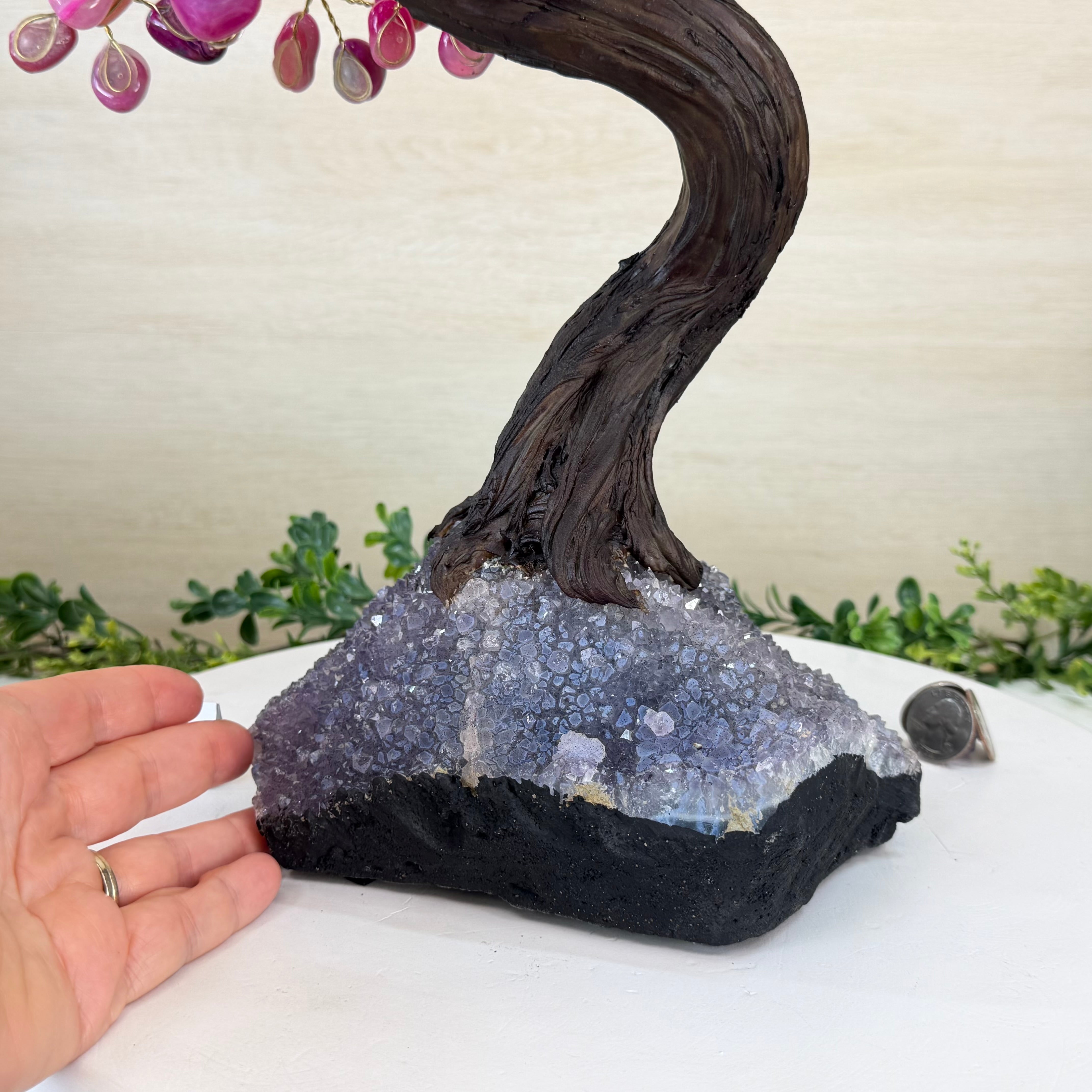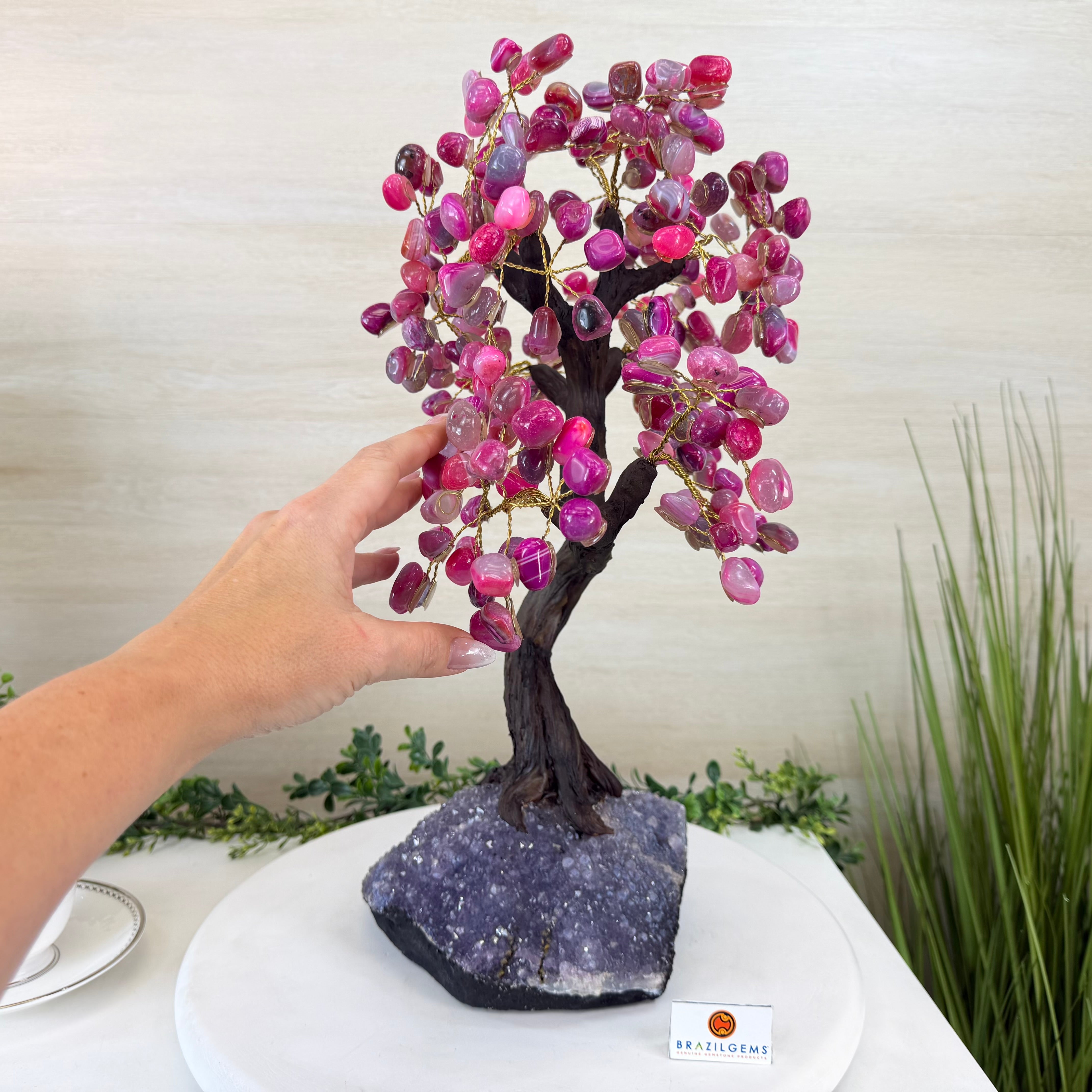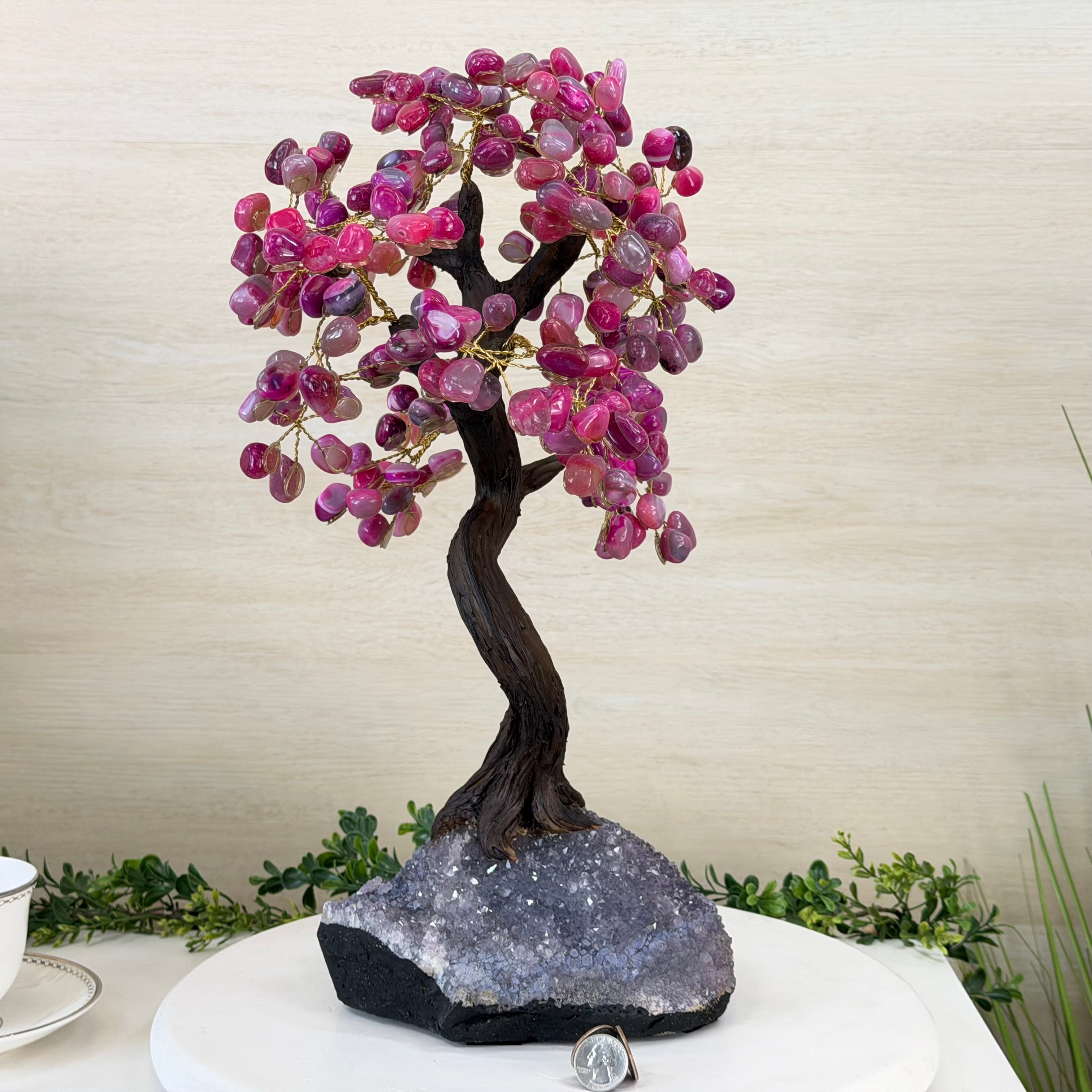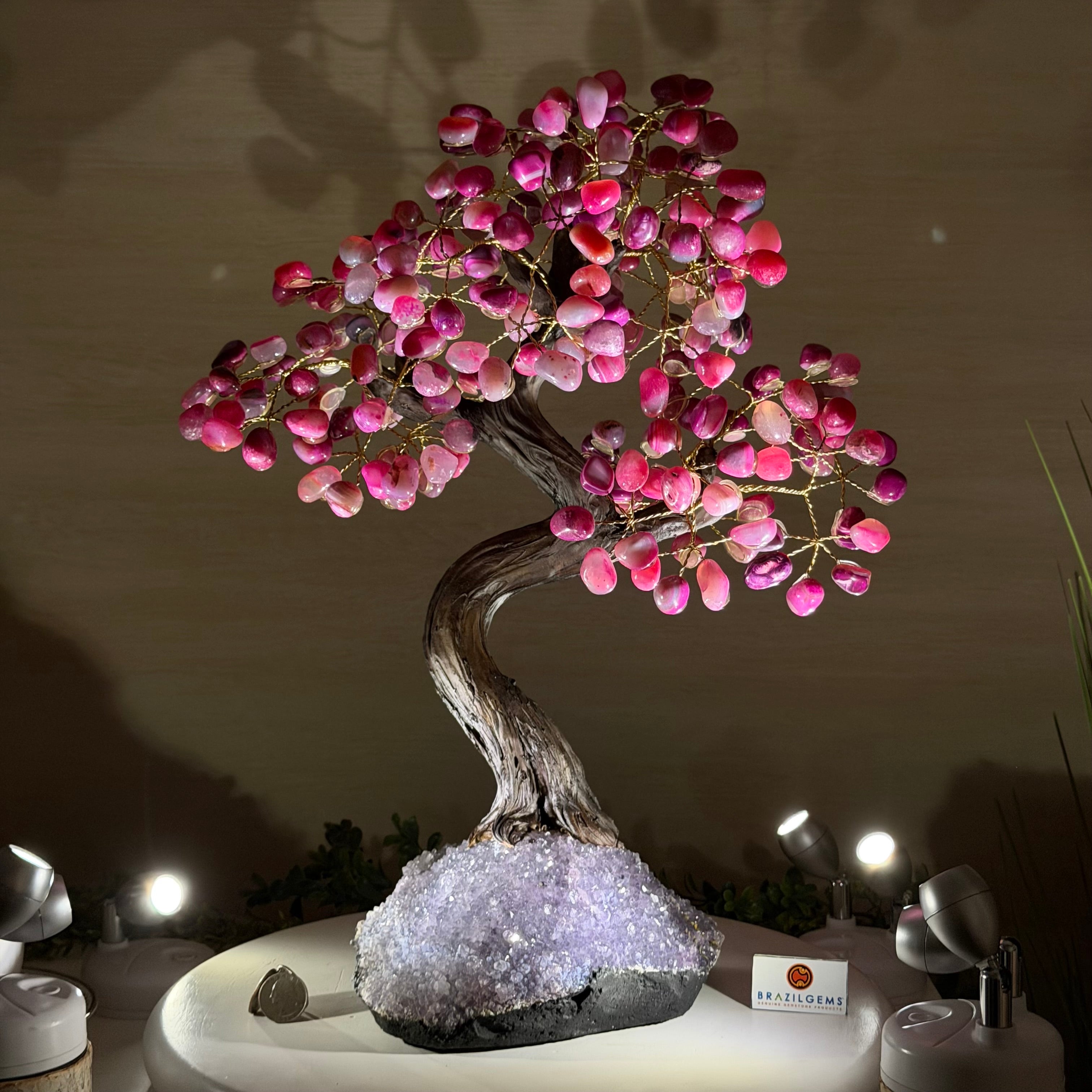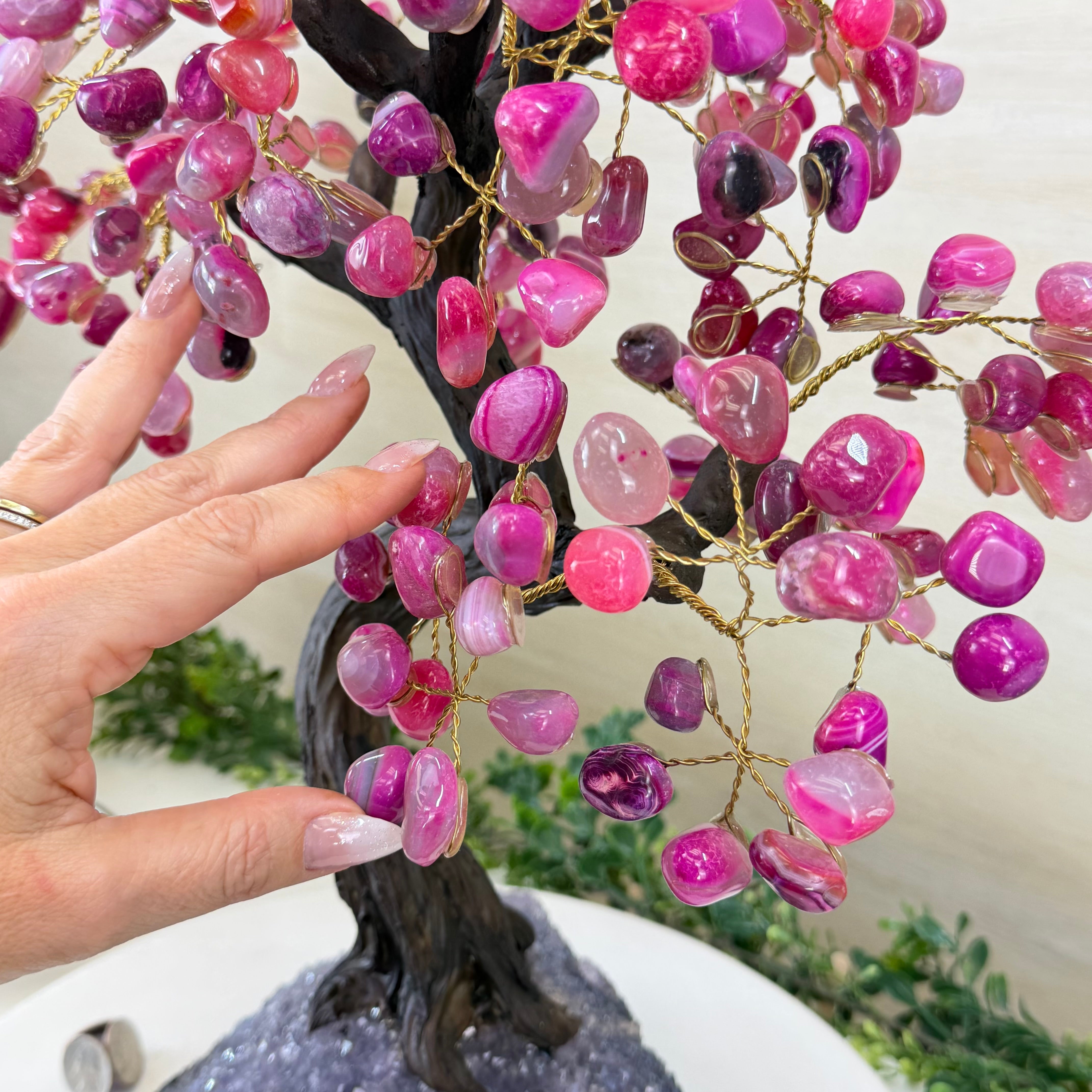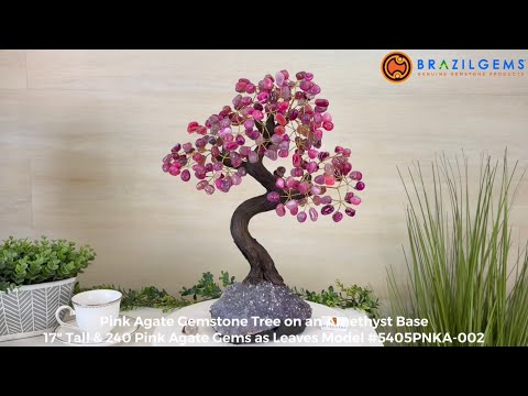 Pink Agate Bonsai Gemstone Tree on an Amethyst Cluster Base Handcrafted in Brazil, this striking gemstone tree stands approximately 17" tall and features a sturdy bonsai style trunk and branches adorned with 240 tumbled Pink Agate gemstones as leaves.