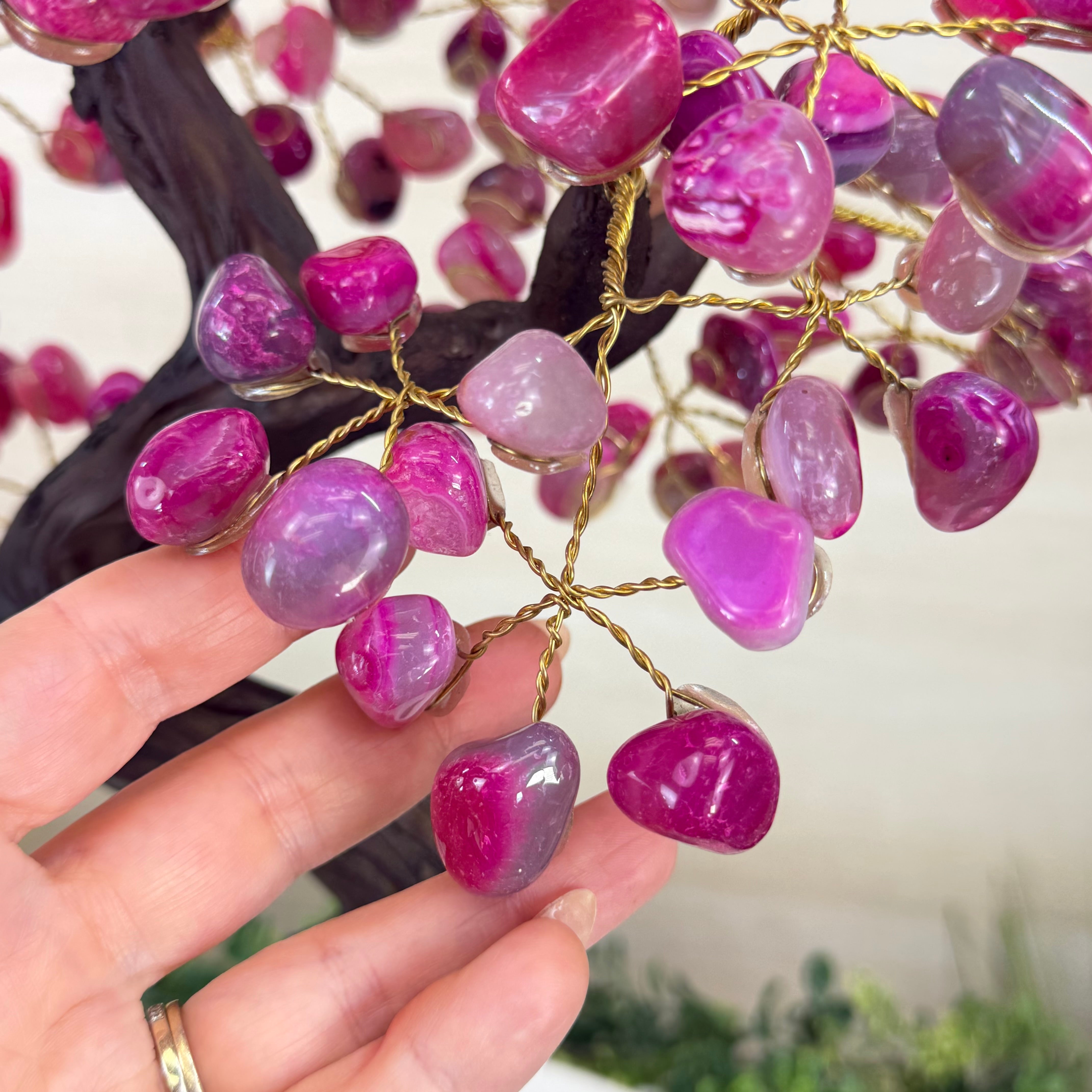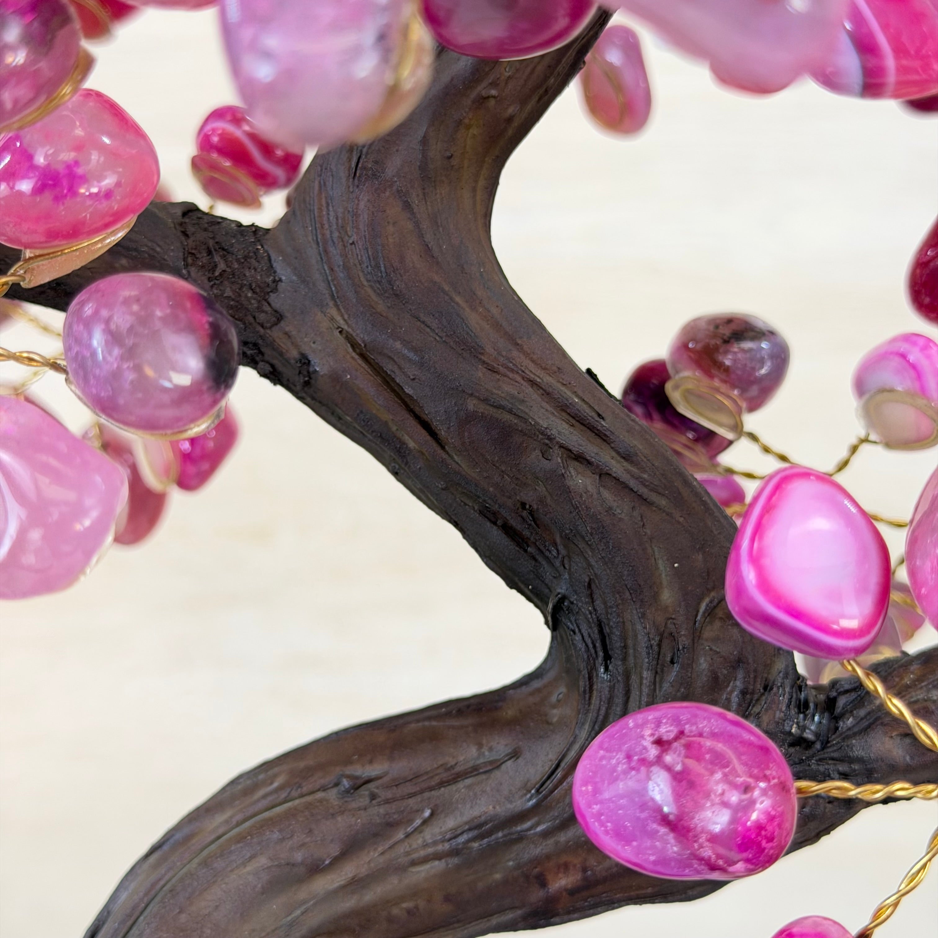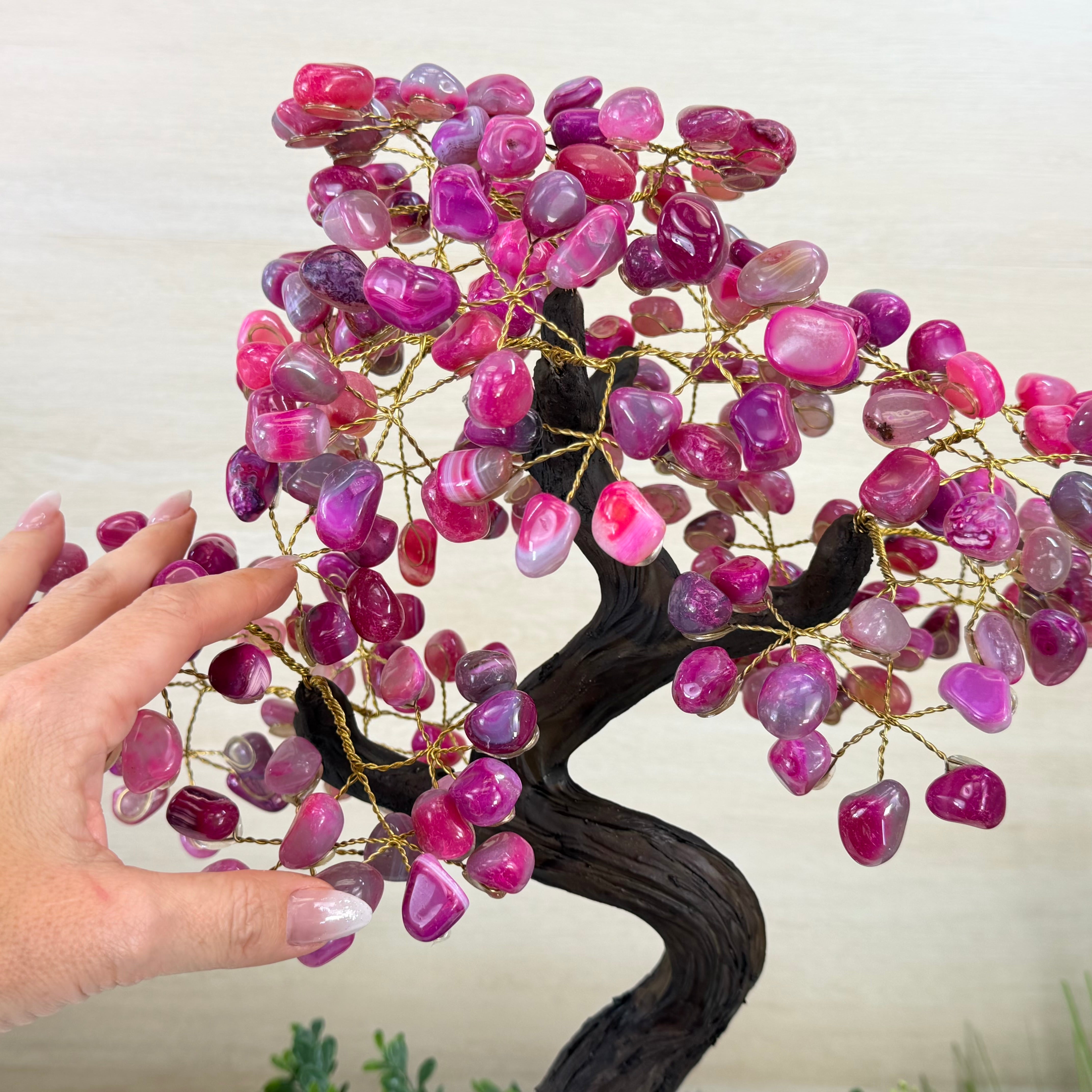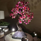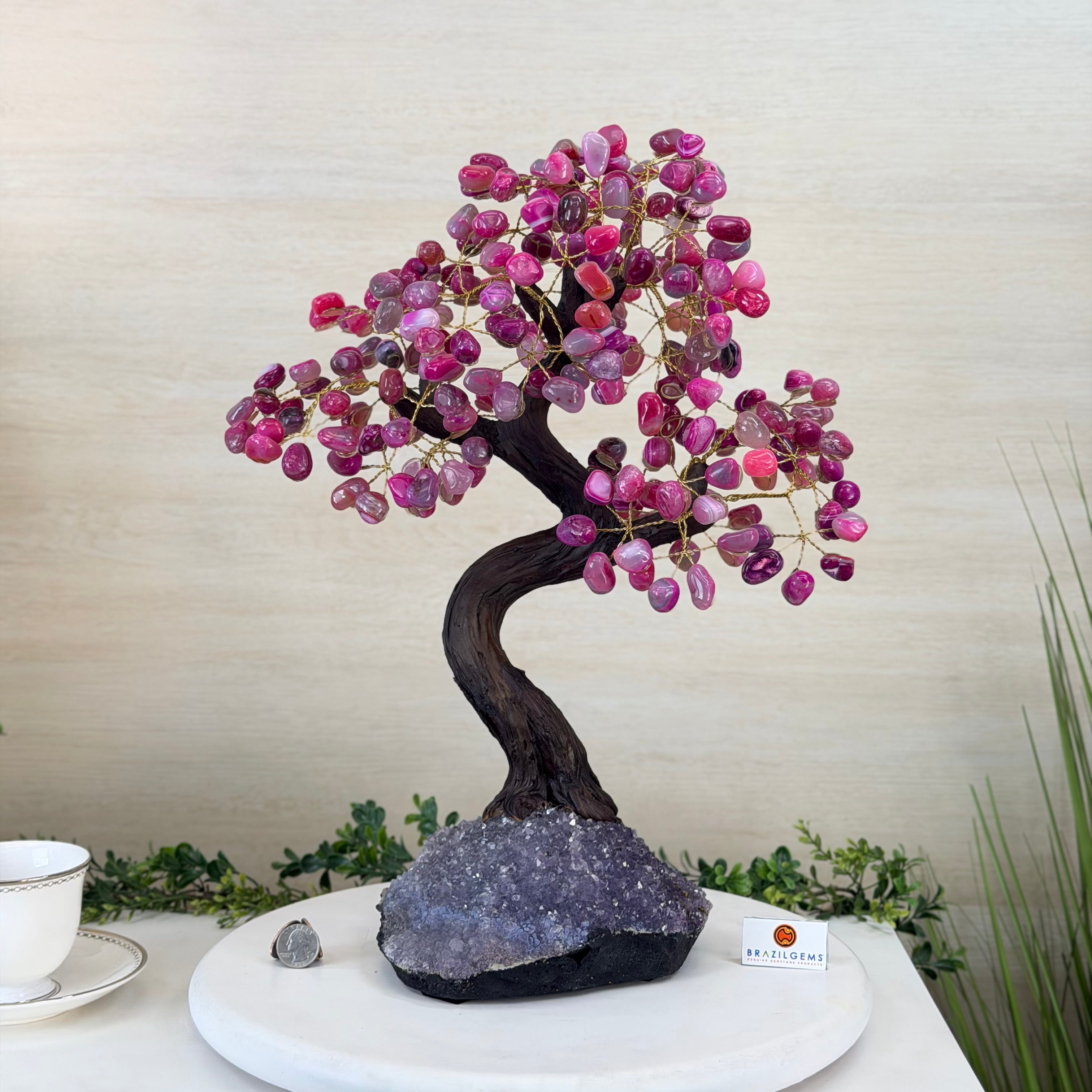 Pink Agate Bonsai Gemstone Tree on an Amethyst Cluster Base Handcrafted in Brazil, this striking gemstone tree stands approximately 17" tall and features a sturdy bonsai style trunk and branches adorned with 240 tumbled Pink Agate gemstones as leaves.