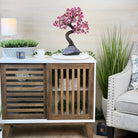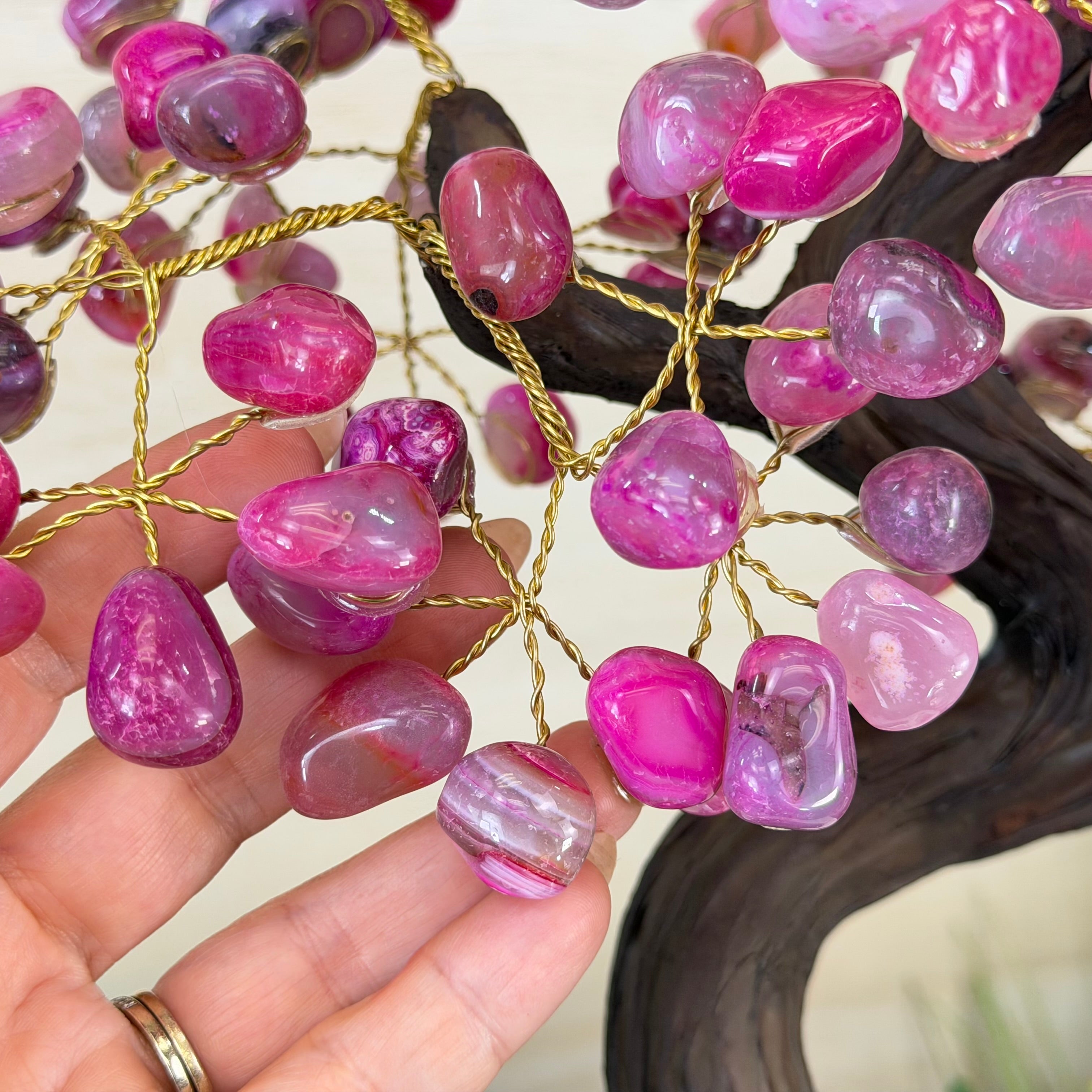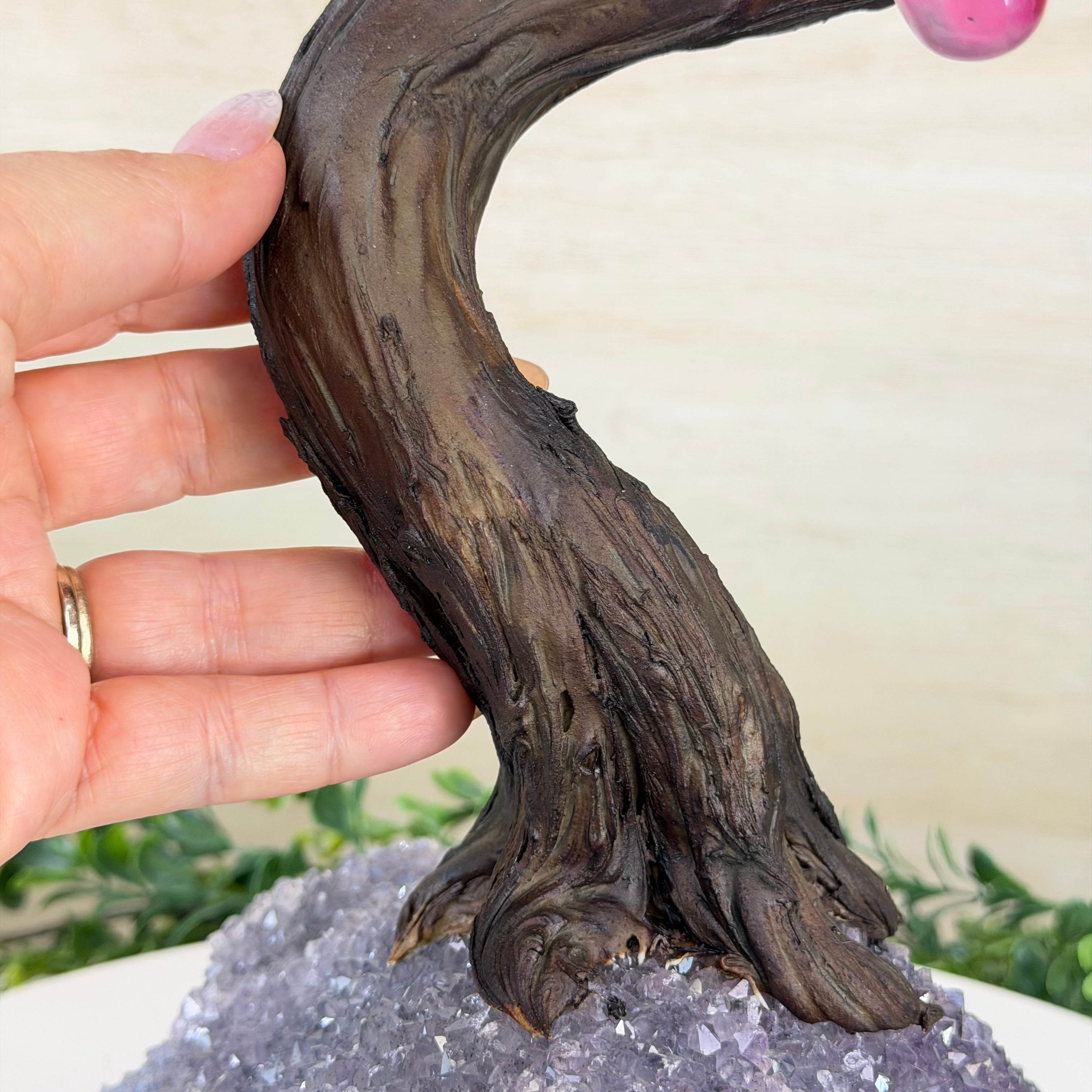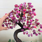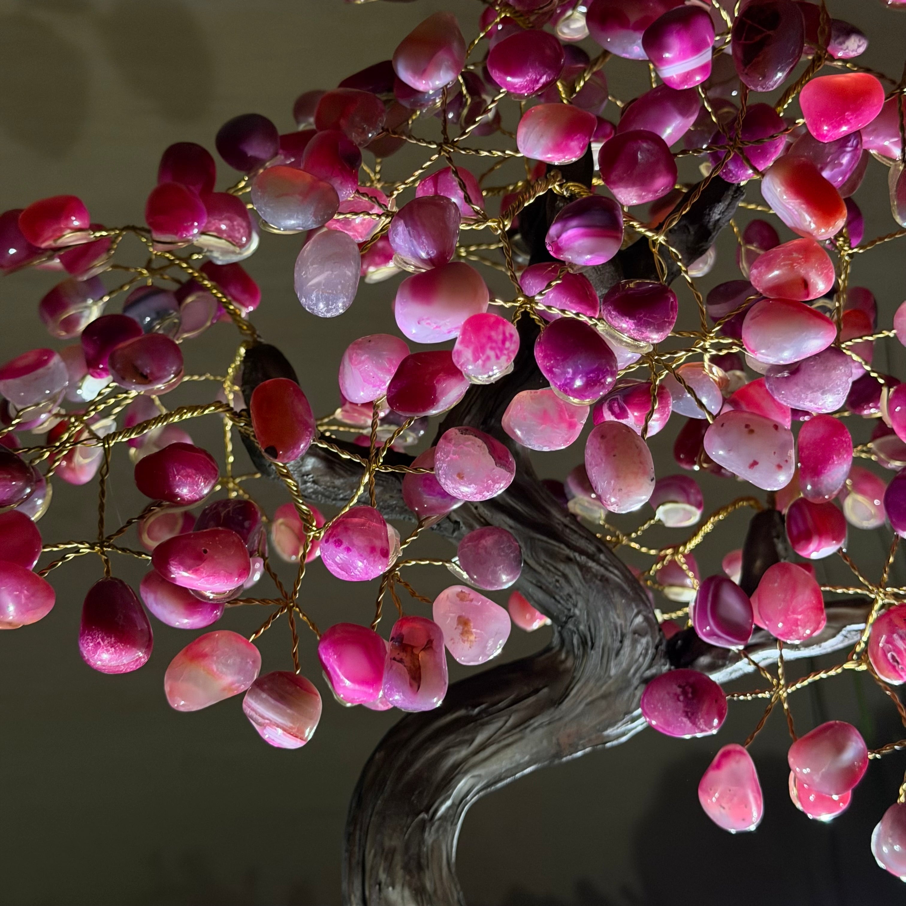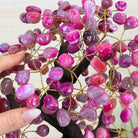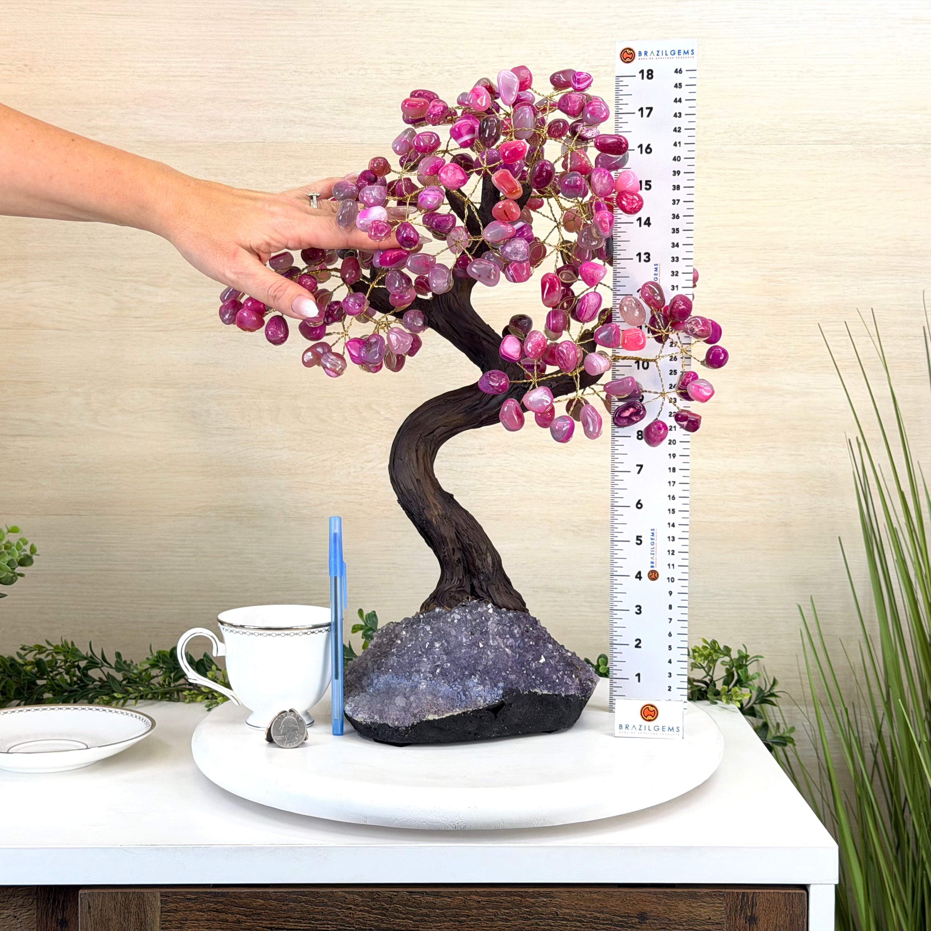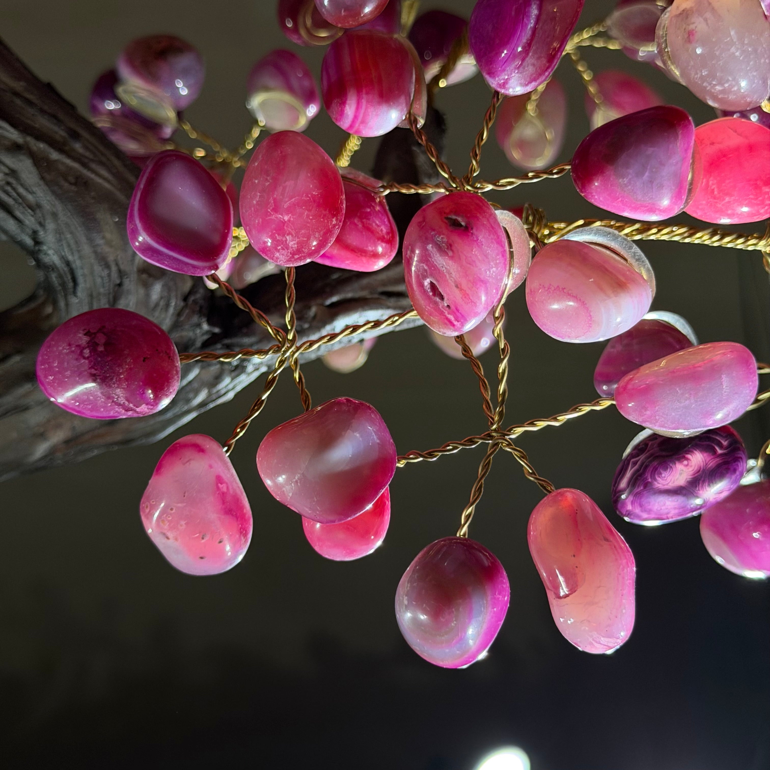 Pink Agate Bonsai Gemstone Tree on an Amethyst Cluster Base Handcrafted in Brazil, this striking gemstone tree stands approximately 17" tall and features a sturdy bonsai style trunk and branches adorned with 240 tumbled Pink Agate gemstones as leaves.