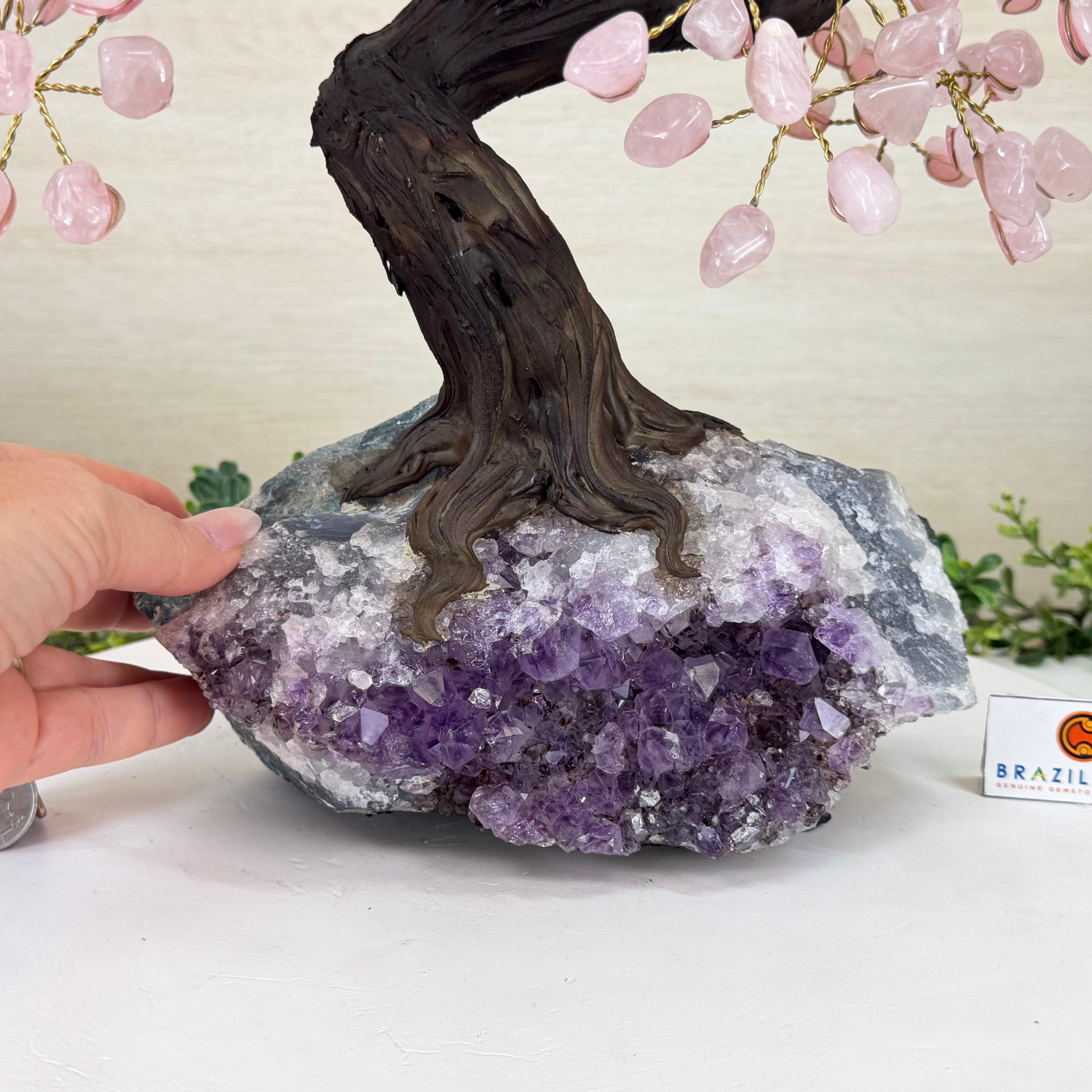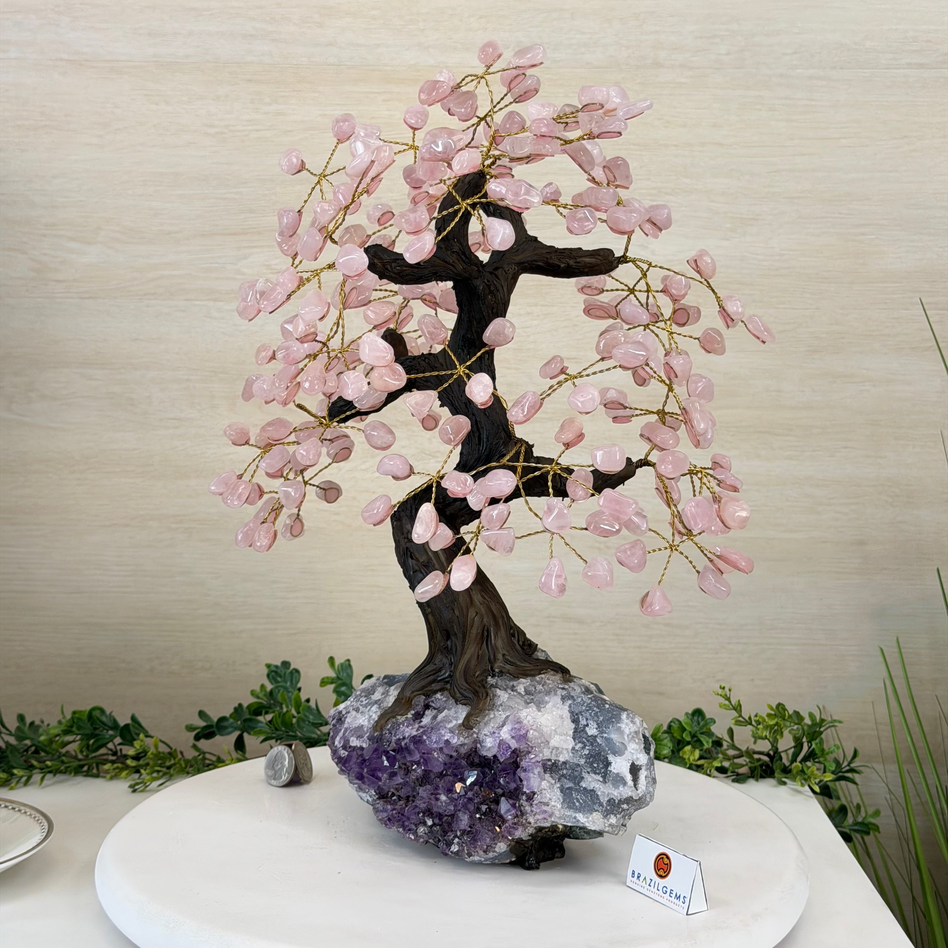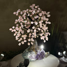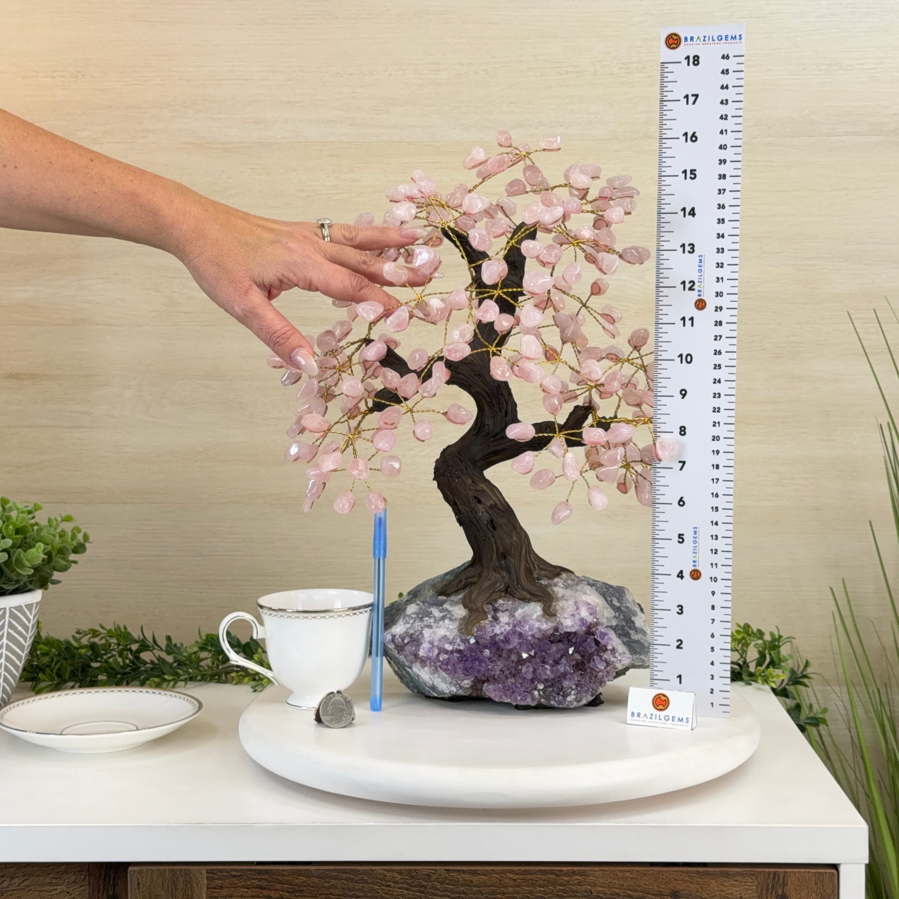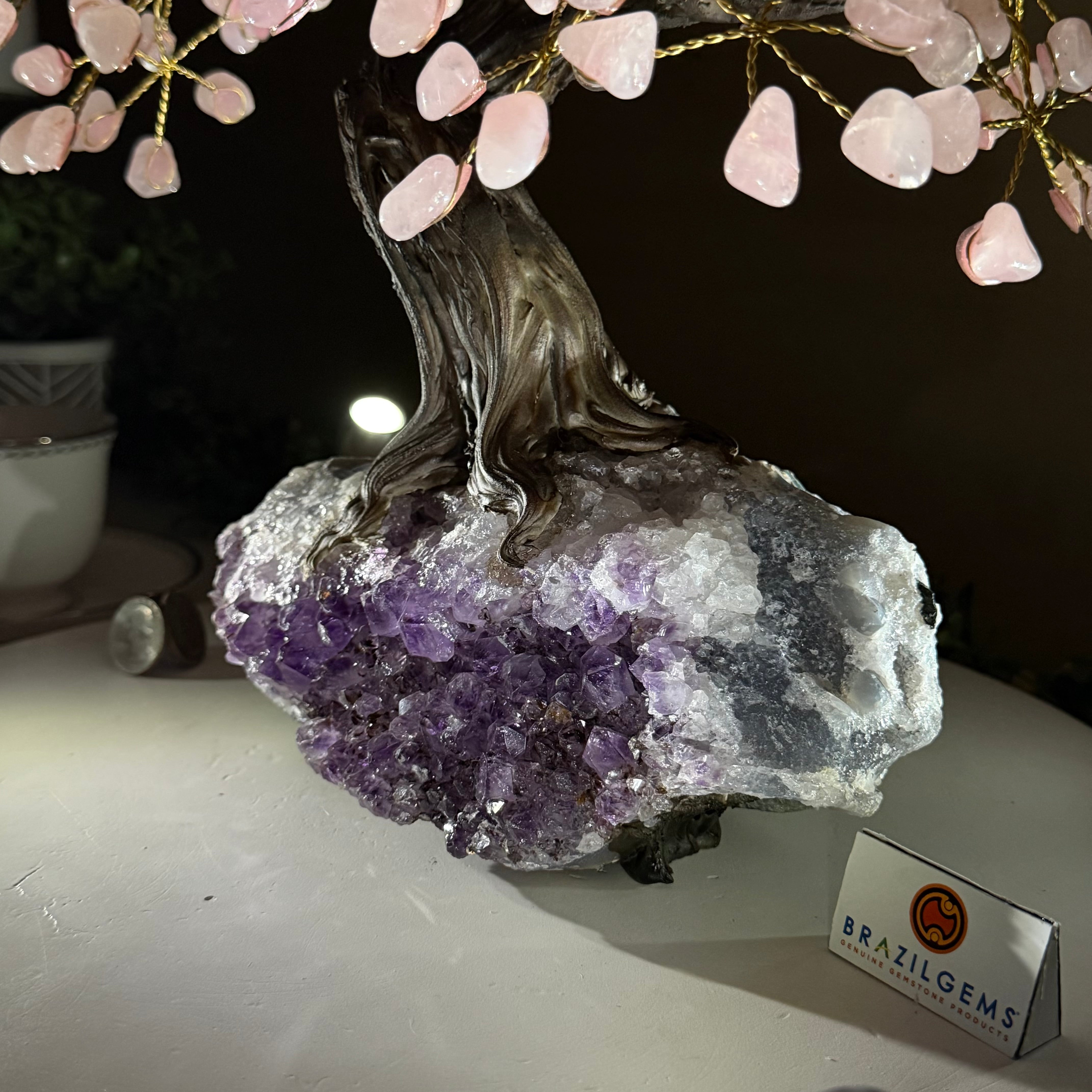 Rose Quartz Bonsai Gemstone Tree on an Amethyst Cluster Base Handcrafted in Brazil, this striking gemstone tree stands approximately 17" tall and features a sturdy bonsai-style trunk and branches adorned with 240 tumbled Rose Quartz gemstones as its leaves.